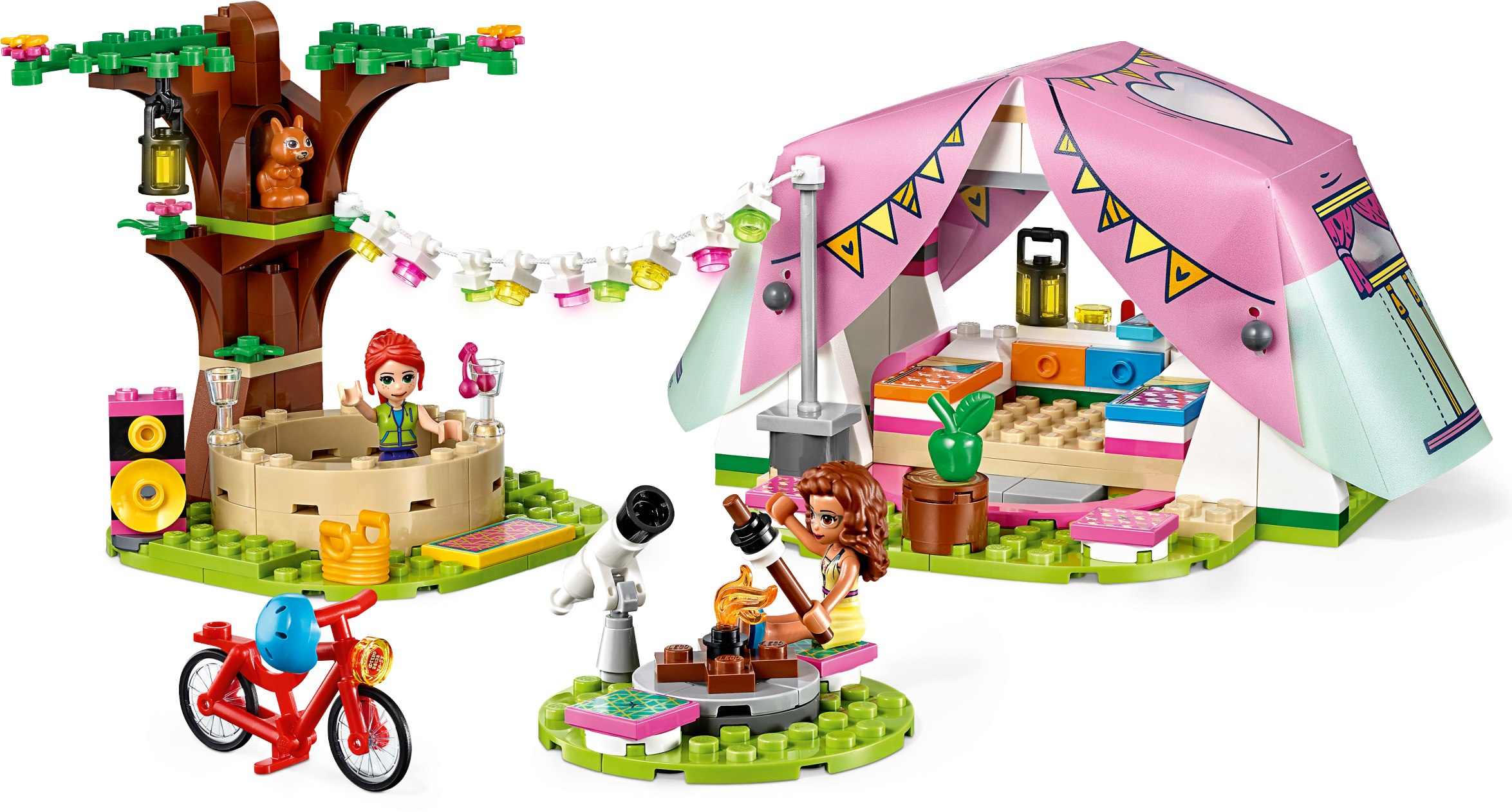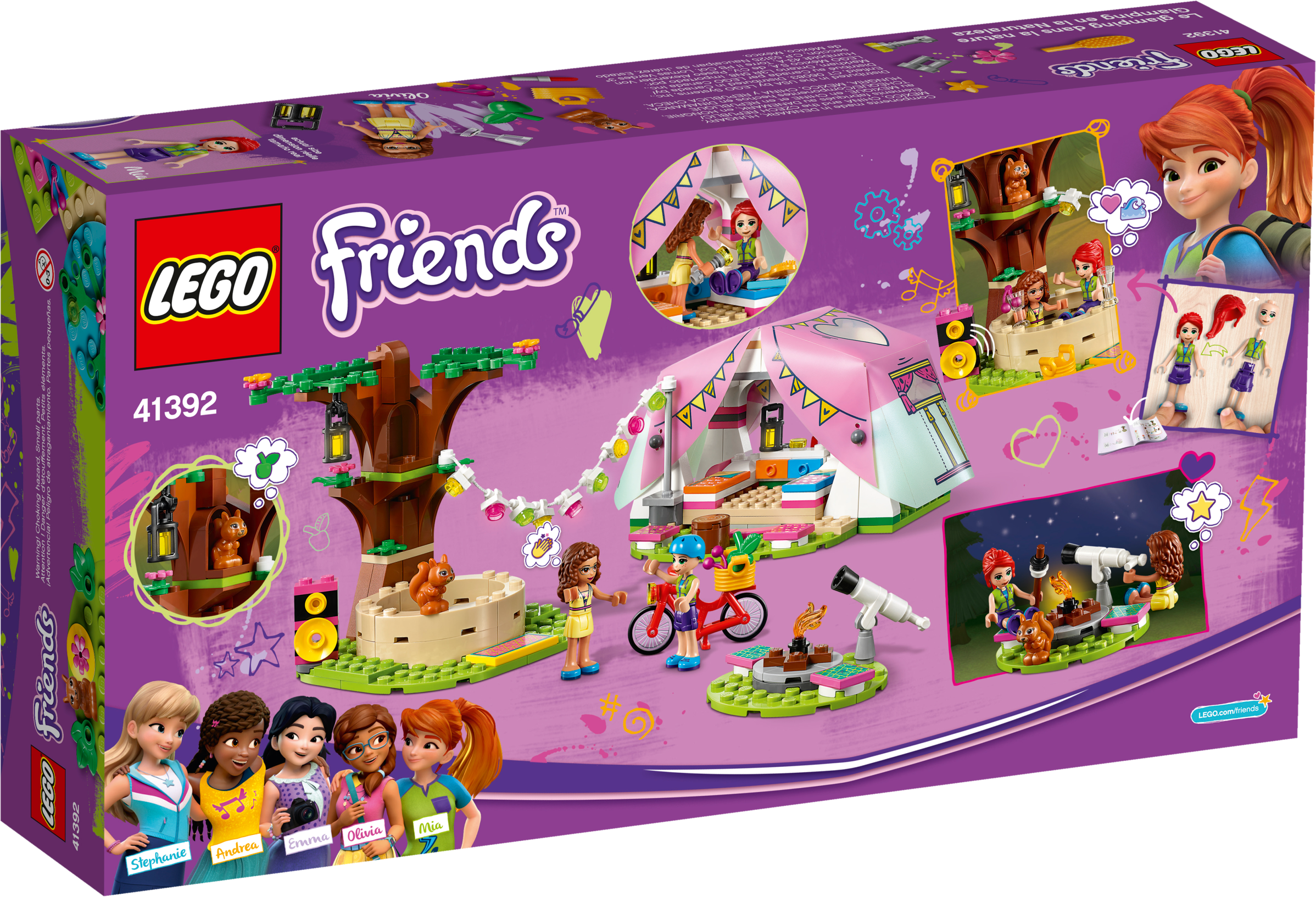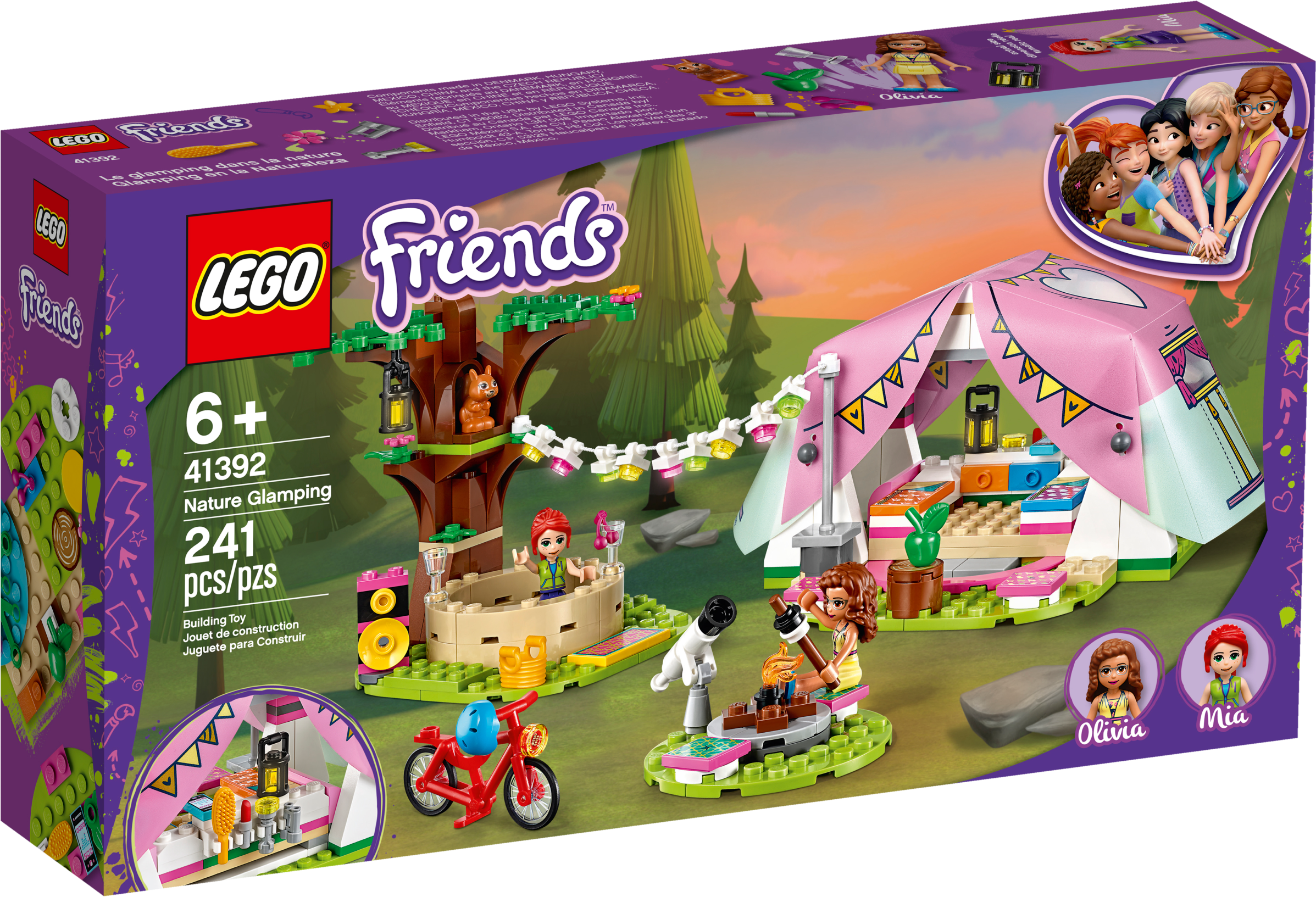 Encourage kids’ zest for the outdoors with this LEGO® Friends Nature Glamping (41392) toy camping set. There are loads of features to keep kids playing for hours. Let them imagine cycling through the woods with LEGO Friends Olivia and Mia mini-dolls. Or they can play with the toy squirrel or pretend to stargaze with a telescope.Camping in styleThis is no back-to-basics camping toy. In the LEGO tent are beds and even a smartphone so the girls can send pics back to Heartlake City. Kids willlove pitching the mini-doll tent with its pretty soft plastic roof, then decorating the camp with a garland of lights. And once the toy camp is set up, they can imagine relaxing in the hot tub.Instructions de luxeIt’s not just the camping in this nature gift for kids that's state-of-the-art, but the instructions too! Download the LEGO Life app to access Instructions Plus so your kid can watch their toy camp take shape in rotate, zoom and ‘ghost' modes. It's building for the digital age! Help your child develop a love of the outdoors with this cute LEGO® Friends Glamping toy for nature-lovers. They’ll have hours of fun pretending to make camp, explore nature and relax with their friends. This pretend camping toy includes a LEGO® tent with a soft plastic roof, 2 mini-dolls, a toy squirrel, a pretend campfire, a telescope and even a hot tub – everything a kid needs for an immersive play camp experience. Kids will love building the tent, with its tactile, soft plastic roof, and making it cozy by laying out the beds and dressing table. Wheeling the mini-dolls around on the LEGO® bicycle adds a dynamic aspect to play. With 241 pieces, Nature Glamping (41392) makes a fun birthday gift, holiday gift or a surprise toy for kids aged 6+ with a little building skill. Make a nature lover's day with an impromptu treat of this camping toy. Measuring over 3” (9cm) high and 5” (15cm) wide, the tent makes a neat desk display. Kids can further brighten up their room by separating the toy tree and fire or by customizing them using bricks from other LEGO® sets. No batteries are needed to power this pretend camping toy. The lights twinkle thanks to clear, colored plastic bricks – and children’s imaginations! Is your little builder ready for an awesome play experience? Download the LEGO® Life app and help them use Instructions PLUS to see their camping toy in zoom, rotate and ‘ghost' modes. It's building for the digital age! Even on a camping trip beyond the boundaries of Heartlake City, kids can still explore a world of interests and activities, with their best friends by their side. LEGO® sets meet the highest industry standards plus The LEGO Group’s own quality criteria. They’re consistent, compatible and connect and pull apart easily every time – it's been that way since 1958. The LEGO Group tests its bricks and accessories to the max to ensure that every one of its toy playsets meets the highest global safety and quality standards.