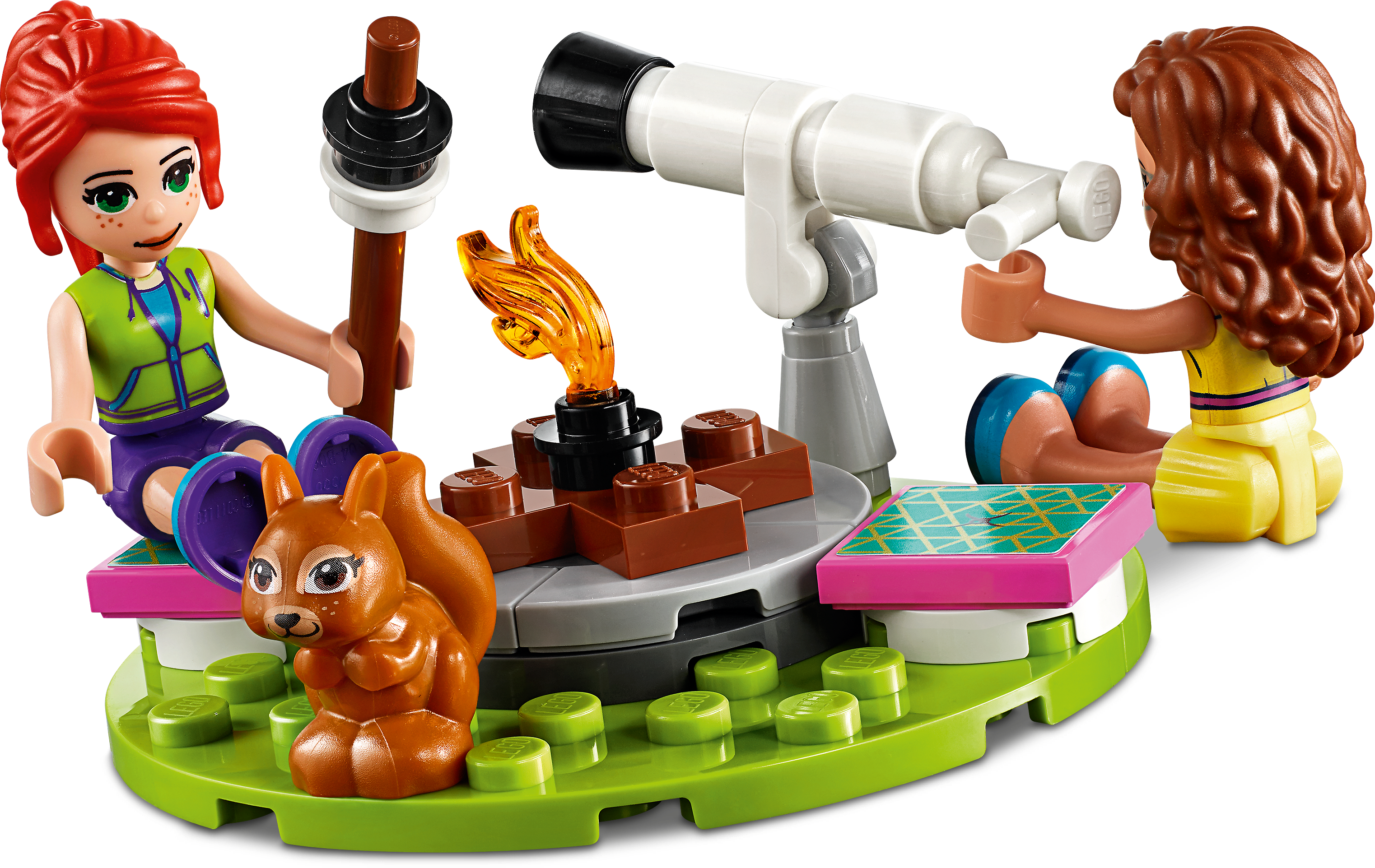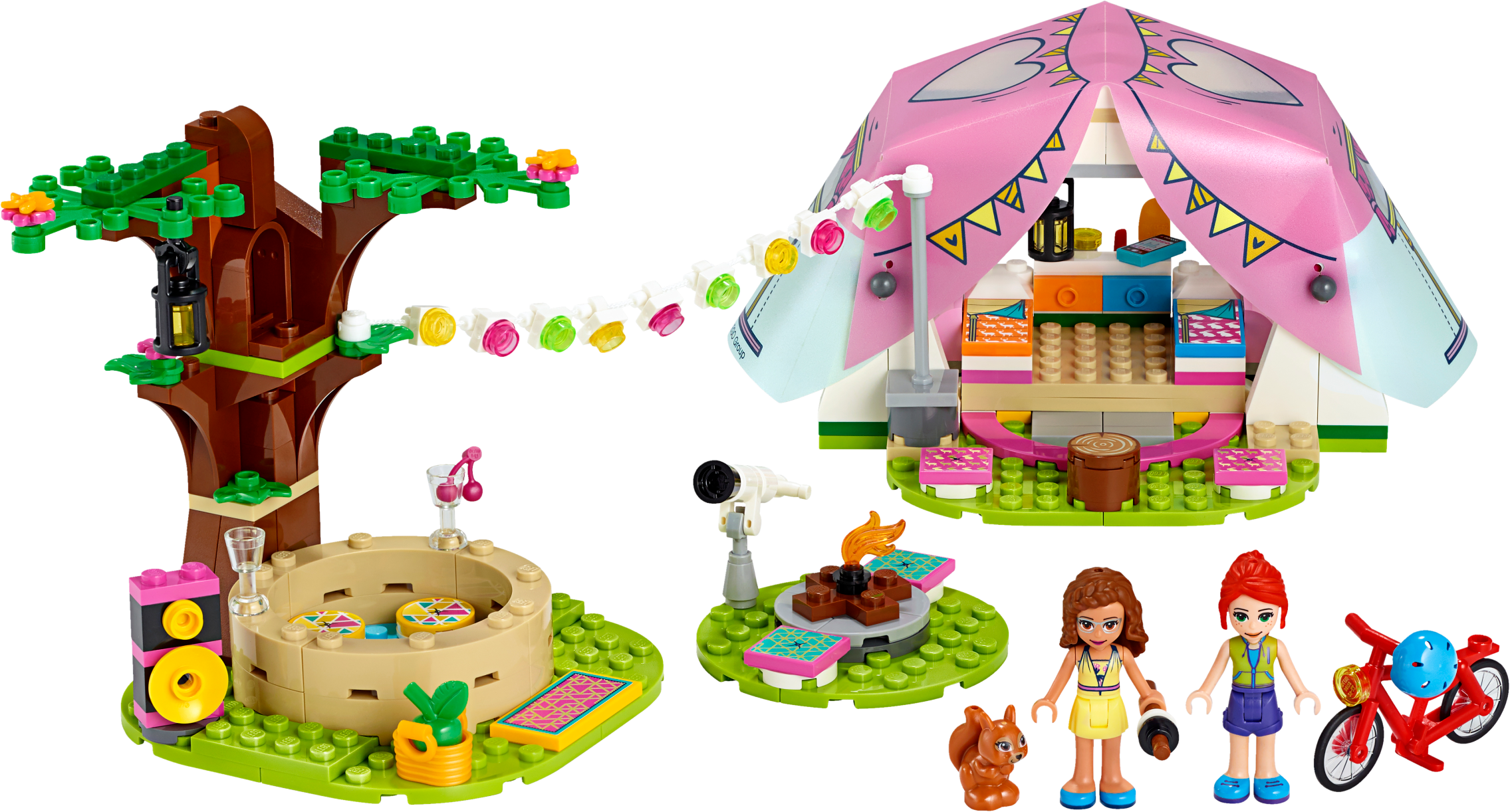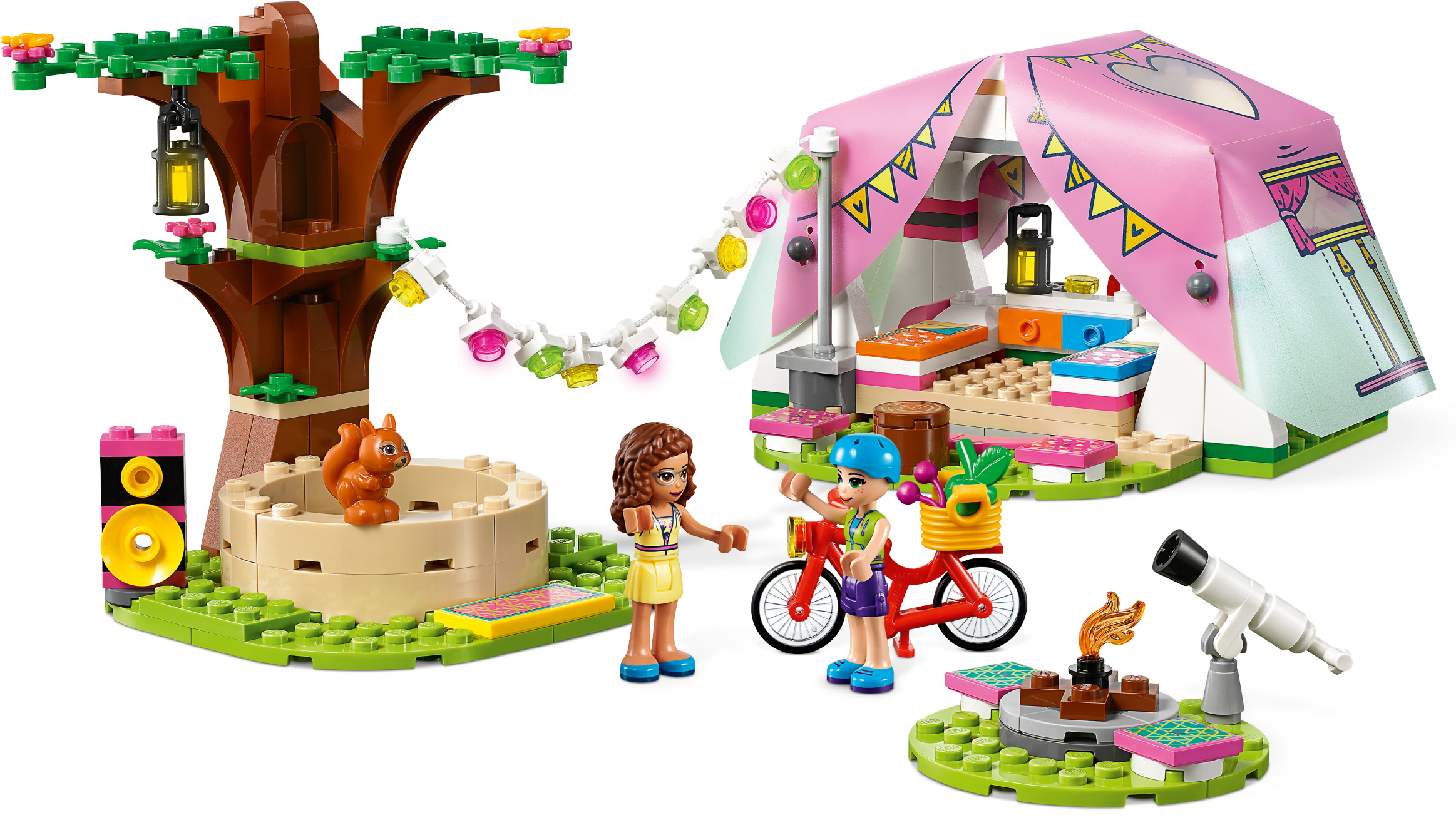 Encourage kids’ zest for the outdoors with this LEGO® Friends Nature Glamping (41392) toy camping set. There are loads of features to keep kids playing for hours. Let them imagine cycling through the woods with LEGO Friends Olivia and Mia mini-dolls. Or they can play with the toy squirrel or pretend to stargaze with a telescope.Camping in styleThis is no back-to-basics camping toy. In the LEGO tent are beds and even a smartphone so the girls can send pics back to Heartlake City. Kids willlove pitching the mini-doll tent with its pretty soft plastic roof, then decorating the camp with a garland of lights. And once the toy camp is set up, they can imagine relaxing in the hot tub.Instructions de luxeIt’s not just the camping in this nature gift for kids that's state-of-the-art, but the instructions too! Download the LEGO Life app to access Instructions Plus so your kid can watch their toy camp take shape in rotate, zoom and ‘ghost' modes. It's building for the digital age! Help your child develop a love of the outdoors with this cute LEGO® Friends Glamping toy for nature-lovers. They’ll have hours of fun pretending to make camp, explore nature and relax with their friends. This pretend camping toy includes a LEGO® tent with a soft plastic roof, 2 mini-dolls, a toy squirrel, a pretend campfire, a telescope and even a hot tub – everything a kid needs for an immersive play camp experience. Kids will love building the tent, with its tactile, soft plastic roof, and making it cozy by laying out the beds and dressing table. Wheeling the mini-dolls around on the LEGO® bicycle adds a dynamic aspect to play. With 241 pieces, Nature Glamping (41392) makes a fun birthday gift, holiday gift or a surprise toy for kids aged 6+ with a little building skill. Make a nature lover's day with an impromptu treat of this camping toy. Measuring over 3” (9cm) high and 5” (15cm) wide, the tent makes a neat desk display. Kids can further brighten up their room by separating the toy tree and fire or by customizing them using bricks from other LEGO® sets. No batteries are needed to power this pretend camping toy. The lights twinkle thanks to clear, colored plastic bricks – and children’s imaginations! Is your little builder ready for an awesome play experience? Download the LEGO® Life app and help them use Instructions PLUS to see their camping toy in zoom, rotate and ‘ghost' modes. It's building for the digital age! Even on a camping trip beyond the boundaries of Heartlake City, kids can still explore a world of interests and activities, with their best friends by their side. LEGO® sets meet the highest industry standards plus The LEGO Group’s own quality criteria. They’re consistent, compatible and connect and pull apart easily every time – it's been that way since 1958. The LEGO Group tests its bricks and accessories to the max to ensure that every one of its toy playsets meets the highest global safety and quality standards.