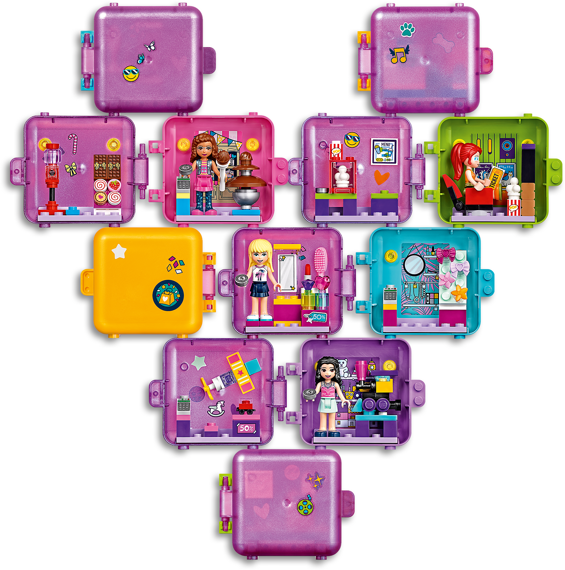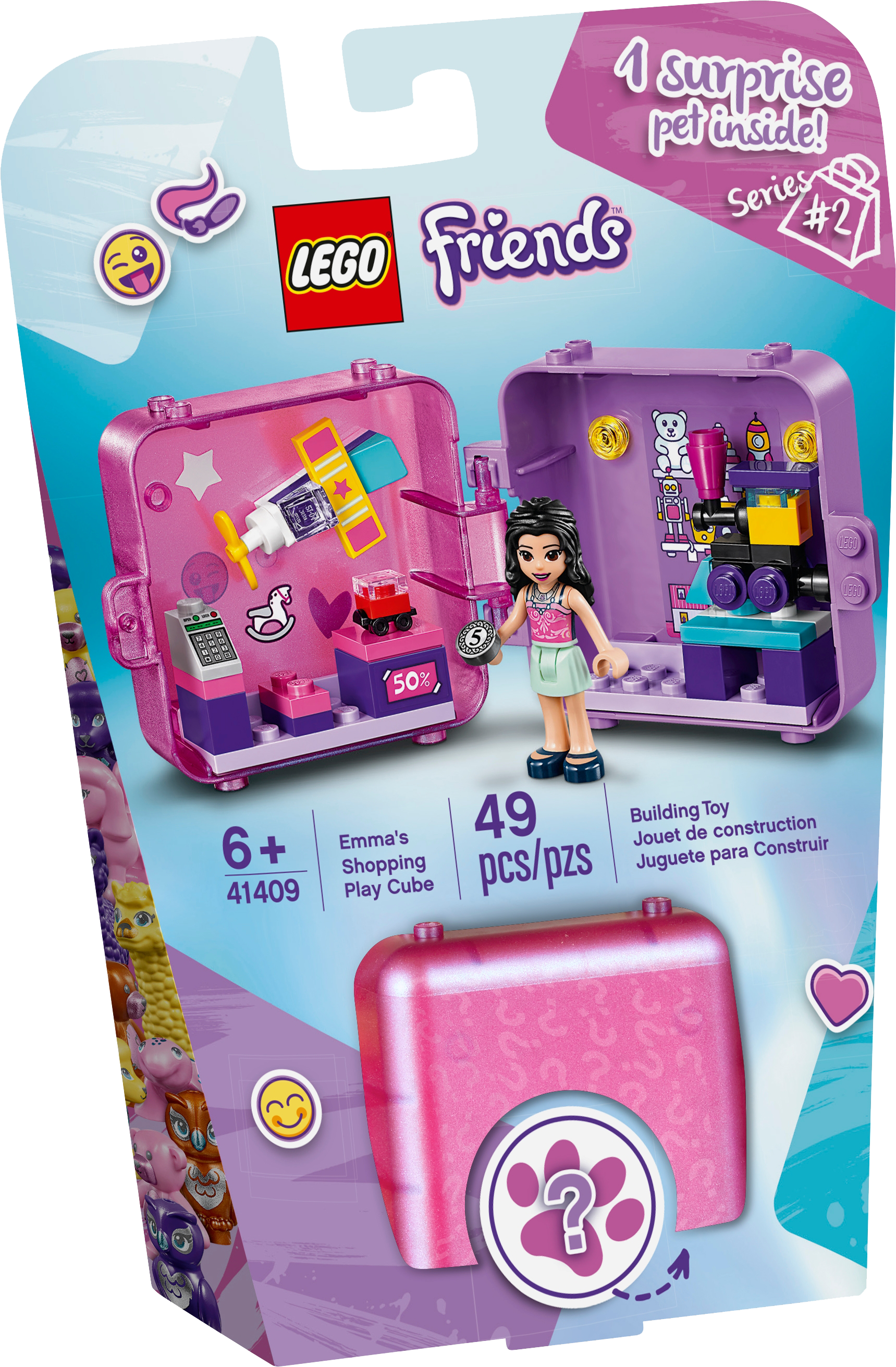 Make flexible fun your focus when you give the gift of LEGO® Friends Emma’s Shopping Play Cube (41409). Tucked inside the shell of this compact toy is a miniature toy store. It’s a top gift for kids who love portable toys. Inspire creative play with LEGO® Friends Emma’s Shopping Play Cube. Inside the cool playset is a miniature world of toy store fun. Watch kids open the case and delight as they discover the cute mystery pet inside. There’s so much inside this portable toy to make for the best journeys. Included is 1 collectible mini-doll and a toy pet, along with a buildable toy car, plane and train. The sticker sheet lets kids customize the cube. There are lots of ways to play with this top gift. Kids can stack or connect their cubes to display them in creative ways or split them to share the fun. They can take the bricks out or use them inside the cube. This building set is an ideal travel toy. And those new to the LEGO® world should breeze through the easy build. This collectible mini-doll set makes a great impulse reward, birthday or holiday gift for kids aged 6+. The cube measures just over 3” (8cm) wide and 2” (6cm) high making it the ideal little treat to keep kids entertained on long journeys. It will add a pop of color to any desk, without taking up too much space. Because no batteries are needed, the creative play starts right away and never ends. Toy store fun is guaranteed wherever kids find themselves: in the car, on a plane, or in the playground at school! LEGO® Friends toy playsets let boys and girls lose themselves in a welcoming world of adventure and friendship, where they can have fun reliving the scenes from the TV series or create new stories of their own. LEGO® fun toys meet the highest industry standards plus The LEGO Group’s own stringent quality criteria. Kids building this toy playset will find the bricks connect strongly and pull apart easily every time. At The LEGO Group we drop, heat, bite, scratch and test LEGO® bricks and pieces in every way imaginable to guarantee that every LEGO Friends set meets the highest global safety and quality standards.