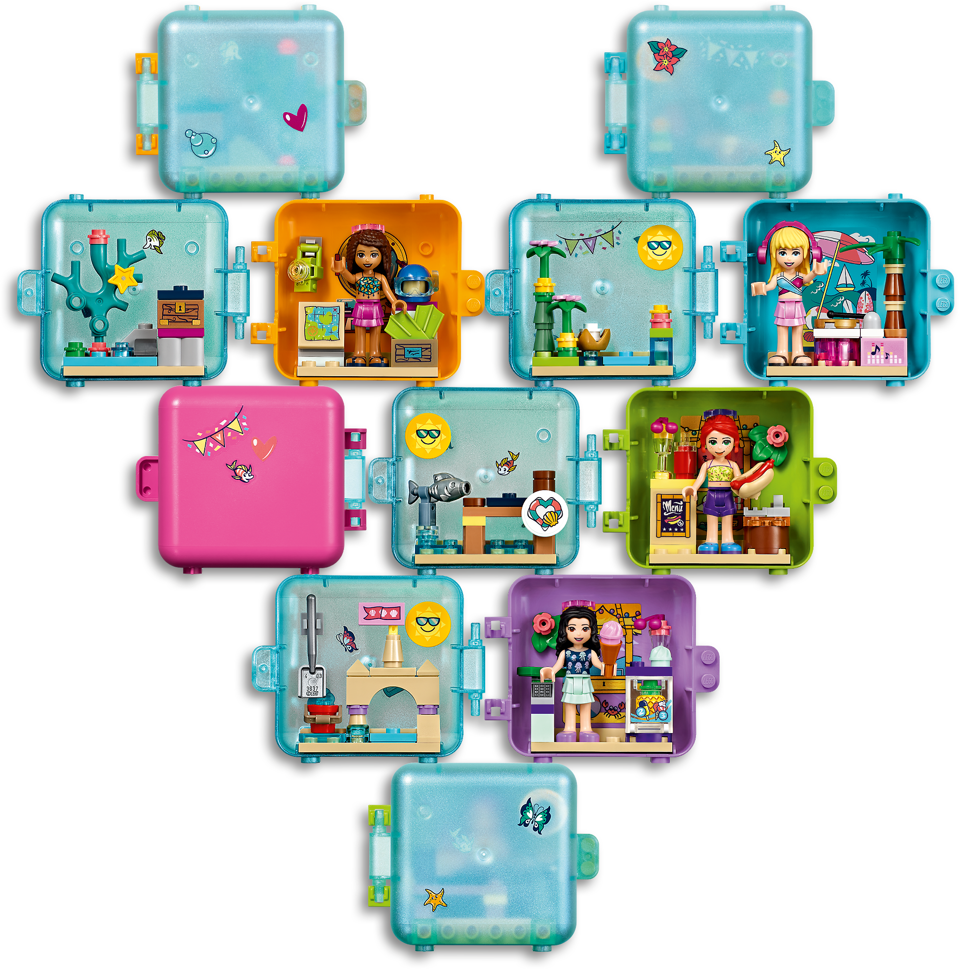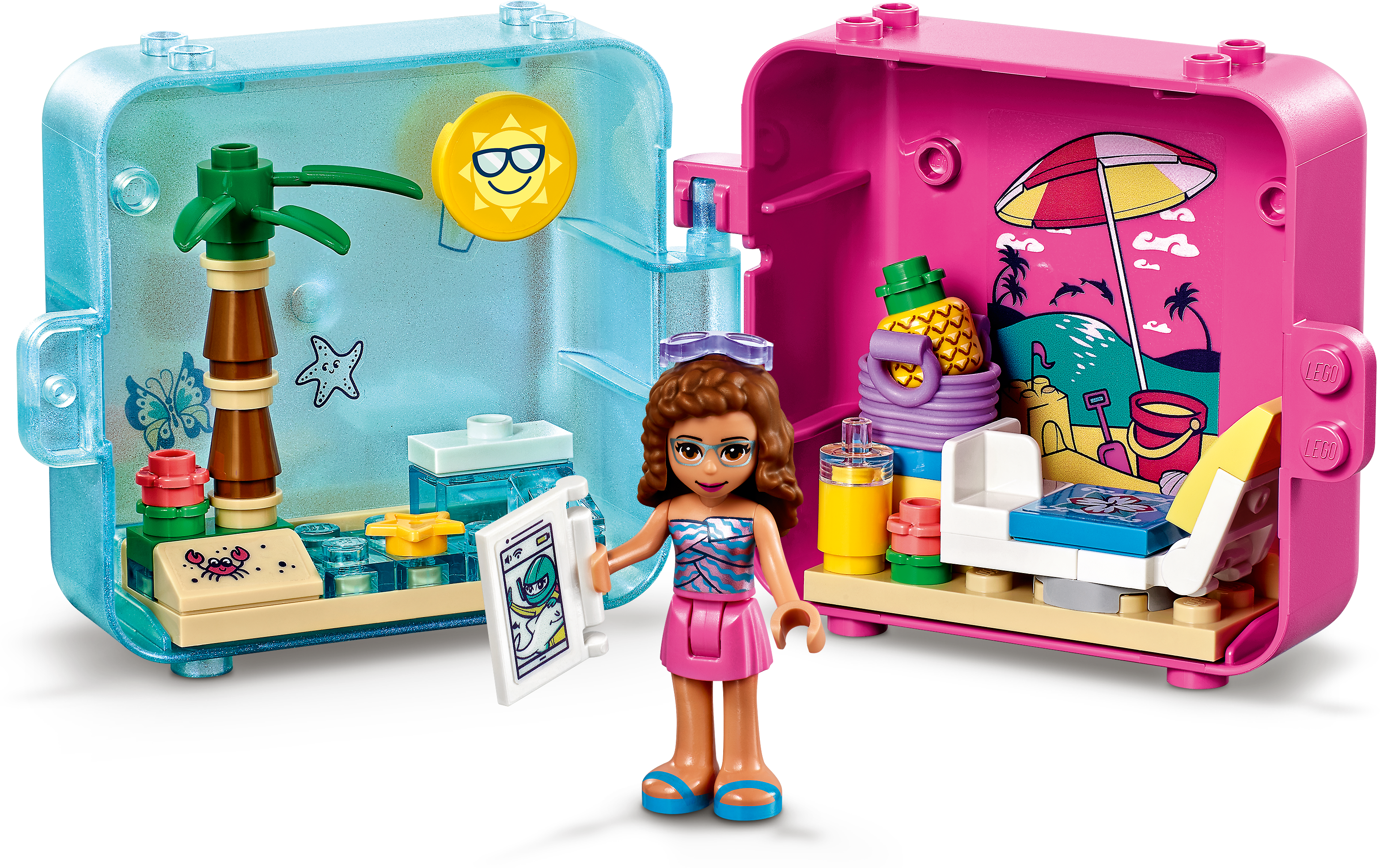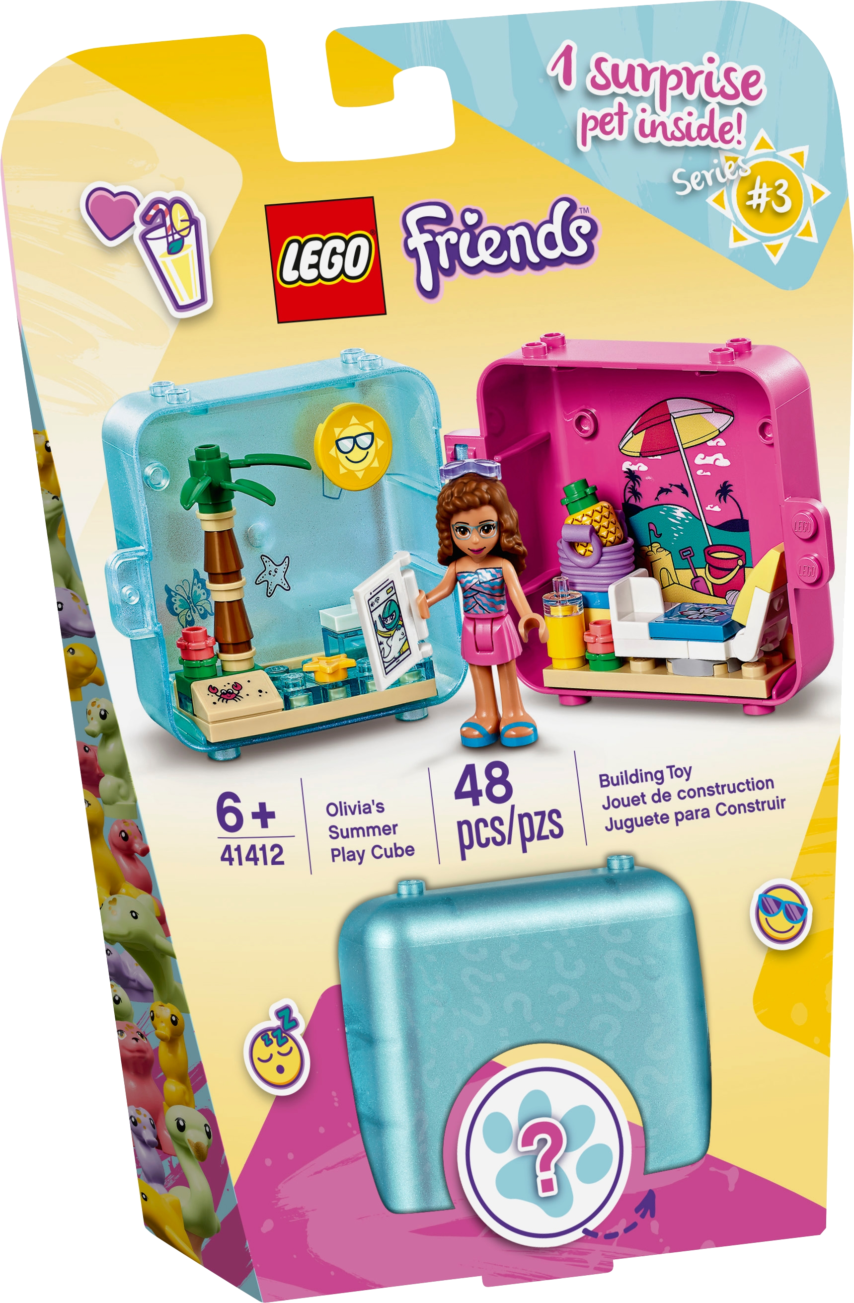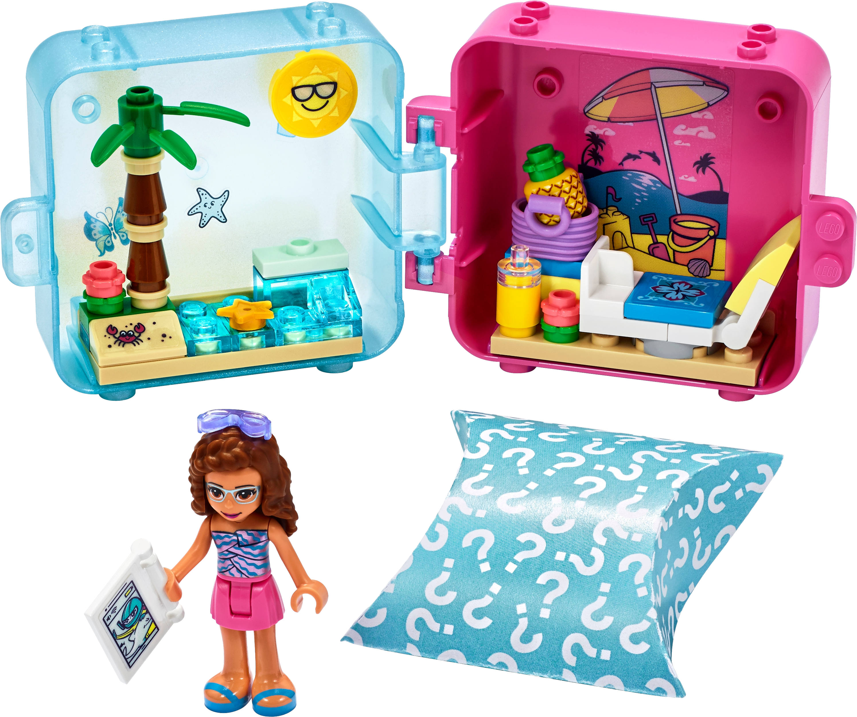 Light up long trips with this LEGO Friends Olivia s Summer Play Cube beach set (41412). Inside this portable toy kids will discover a collectible mini-doll, all the kit needed to make creative seaside elements, and a range of cool accessories to inspire creative play. It also comes with a mystery pet watch as kids delight in their animal discovery! Flexible fun: The elements in this LEGO Friends set are removable, so kids can play with them outside of the cube. They also fix to the cube's base for storage and fun on the go. Everything packs up into the pretty blue opalescent cube case. Far from squareThese stackable toys give kids a taste of the LEGO Friends world. To explore more, they can collect all 5 beach-themed mini-doll sets, which stack or connect so kids can display them in fun arrangements. Introduce children to Heartlake City, where they can learn that life is sweet when it's spent in the company of good friends.