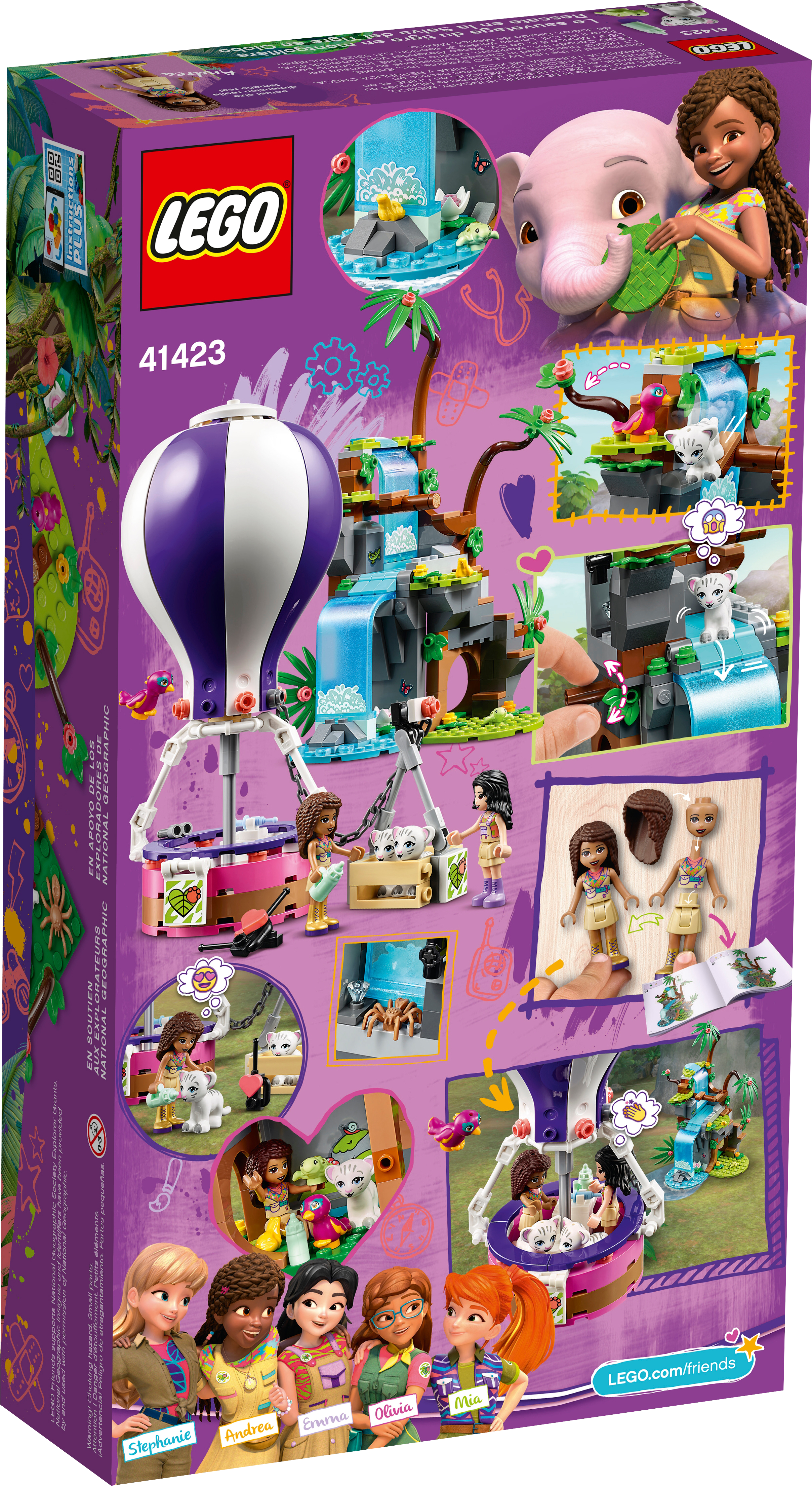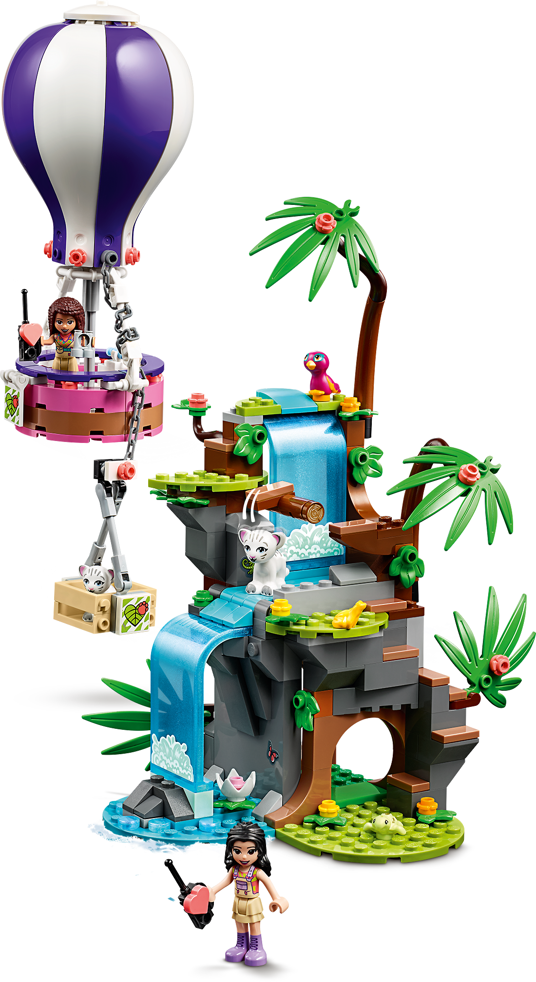 Let children set sail on a LEGO Friends adventure with the Tiger Hot Air Balloon Jungle Rescue (41423). Kids can pretend to take to the skies to rescue a toy tiger cub from a waterfall. This set comes with 2 tiger cubs, plus a toy parrot and baby turtle toy. LEGO Friends is proud to support the work of National Geographic Explorers. Many ways to playIn this jungle rescue animal playset are a wealth of wildlife adventure play starters. Kids can observe the toy baby tigers in their cave home or explore the rocky waterfall and discover diamonds. If they want to up the drama, they can use the tilting function to upend characters into the bubbling waters and kickstart a daring hot air balloon rescue. Action stationsThese rescue playsets let youngsters feel the thrill of embarking on an exciting mission! Even the build will be a blast this set comes with Instructions PLUS on the LEGO Building Instructions app. Using the zoom, rotate and visualize modes, kids will feel like master builders!