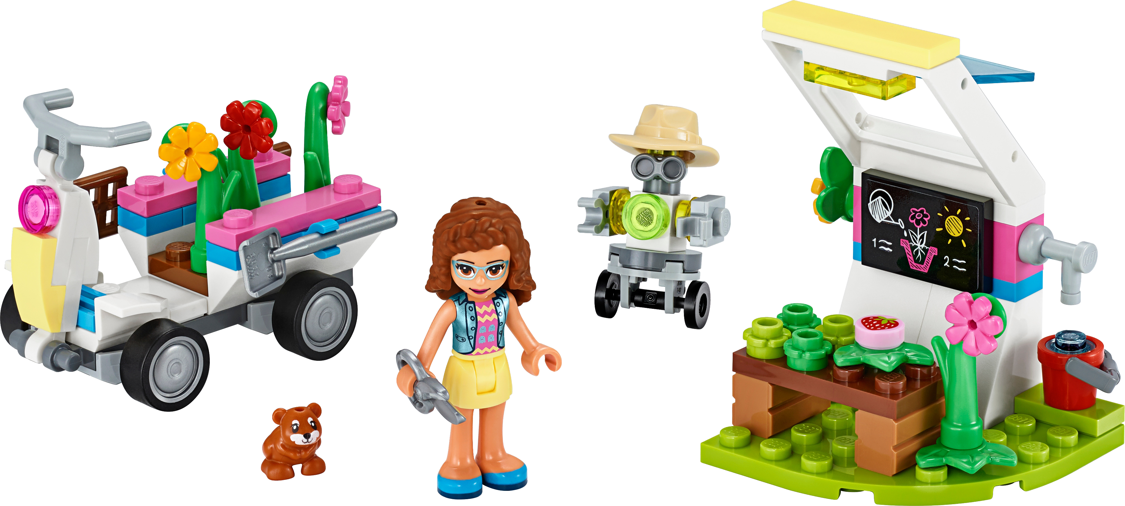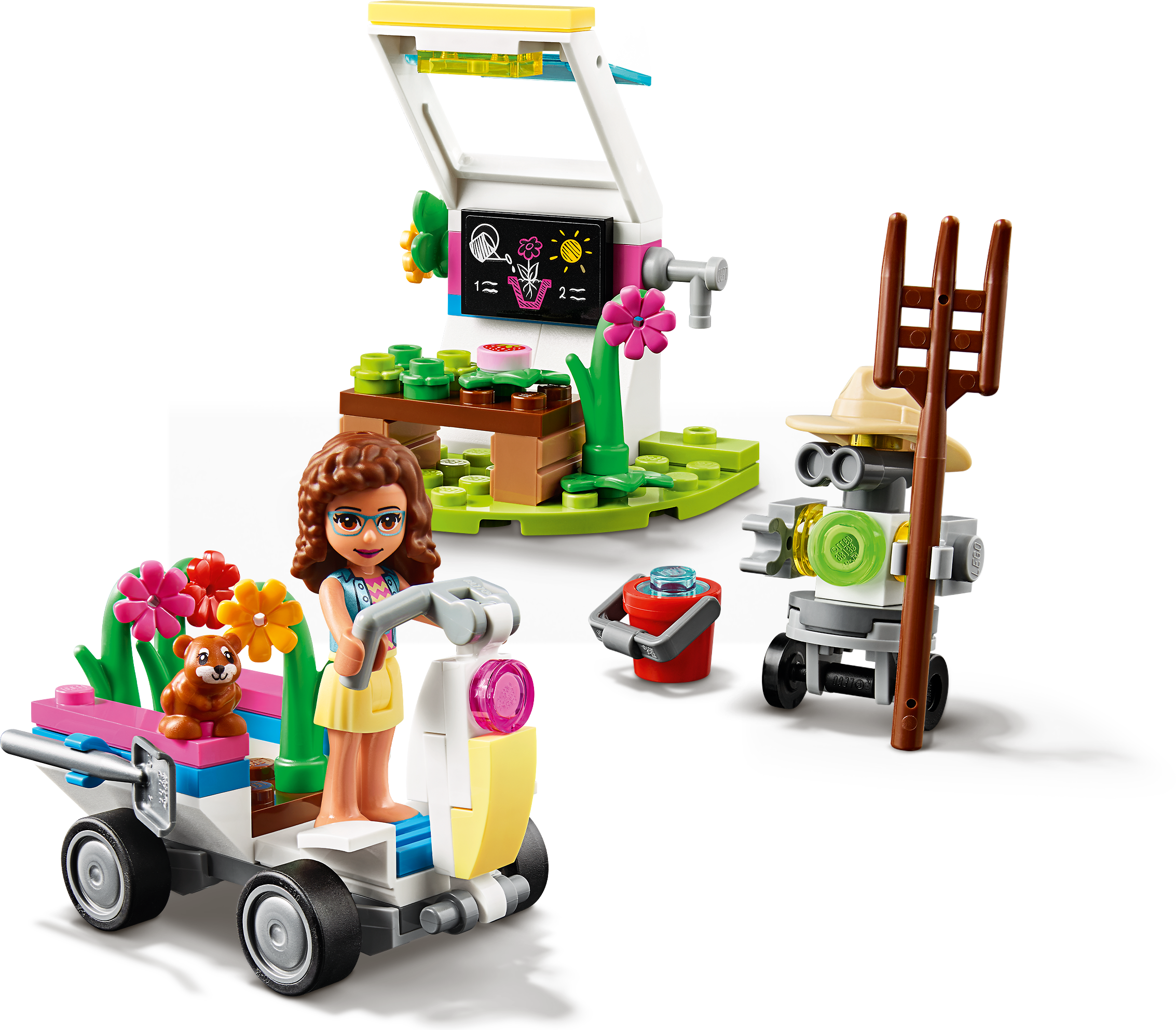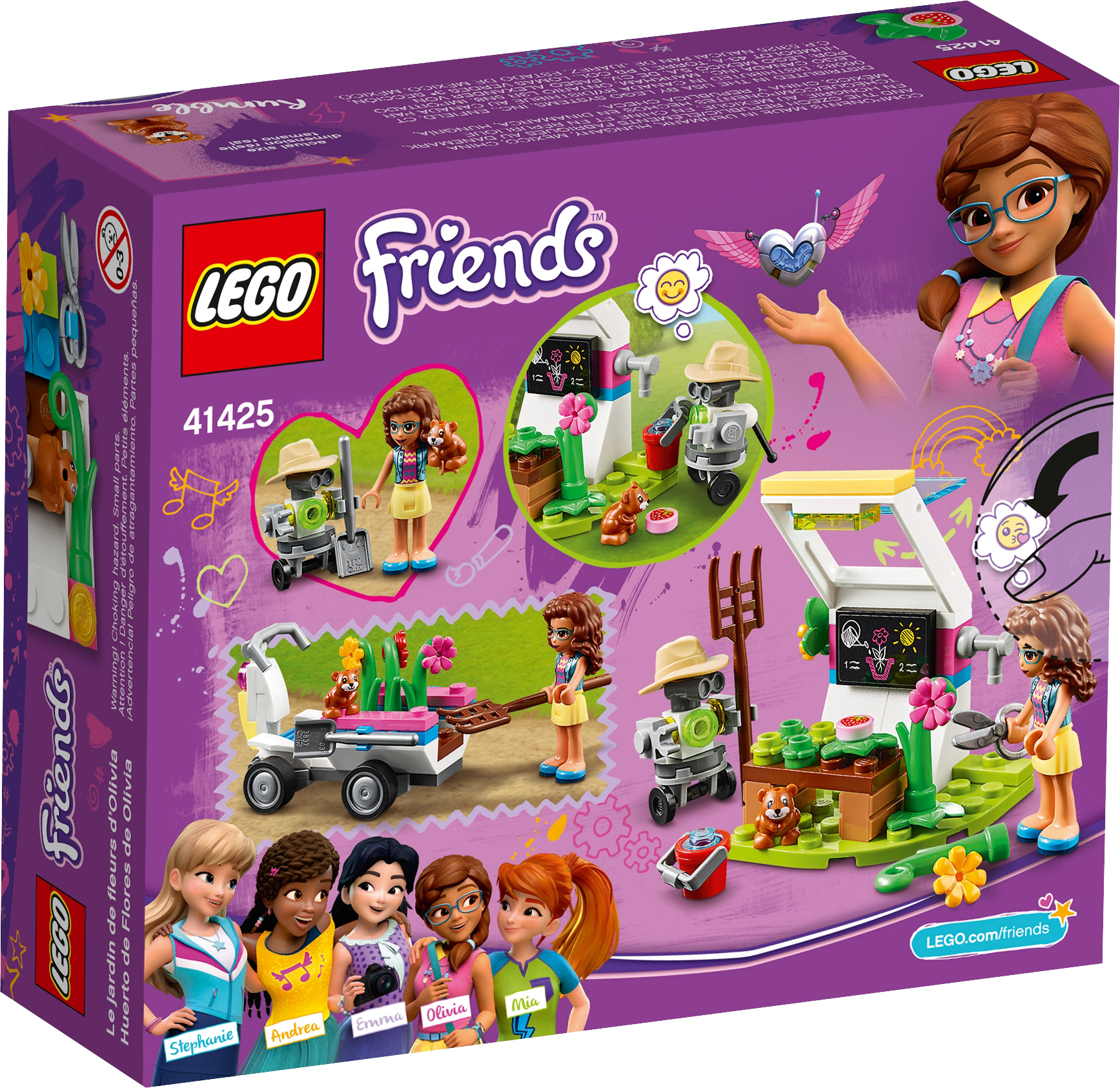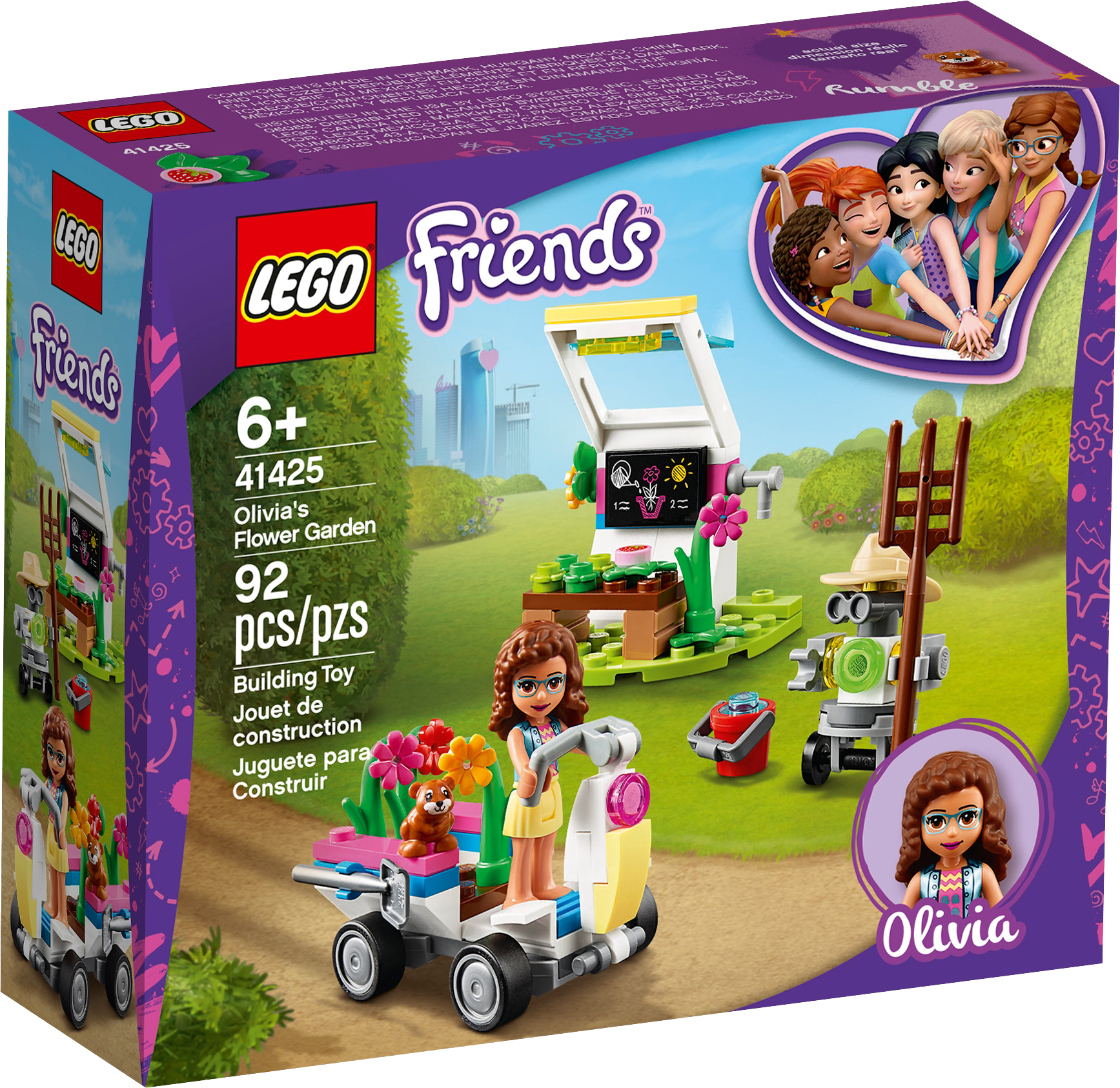 Nurture youngsters’ love of nature with LEGO® Friends Olivia’s Flower Garden (41425). Let kids imagine they’re exploring the countryside in search of rare flowers for Olivia to study. They’ll have fun driving the vehicle round, while back at Olivia's greenhouse they can pretend to help LEGO Friends Zobo the robot care for the blooms using the garden accessories.Bring a pop of color to playtimeComprising 92 pieces this pretend play garden is a cinch to construct, even for kids with little brick-building experience, making this a great birthday present for those new to LEGO toys. The beautiful toy plants will brighten up any desk, while the set’s neat size means it takes up little room on display.Say hello to the girls from LEGO FriendsWelcome to the world of Heartlake City a place where little ones can embark on exciting missions, explore their interests or just enjoy hanging out with five fabulous girls – Mia, Olivia, Emma, Stephanie and Andrea – and all their animal friends.Know a kid with a green thumb? Bring their love of the outdoors indoors with this colorful LEGO® flower garden fun toy. Let them embark on a plant hunt with Olivia, then tend their finds in her greenhouse.Olivia’s Flower Garden (41425) includes a buildable mini-doll figure, a farmer robot figure, a cute hamster figure, a plant-collecting toy vehicle and a greenhouse where kids can pretend to grow blooms and fruit.Let kids get lost in creative play as they imagine driving round in the cool vehicle collecting toy plants and using the cute gardening kit to look after and study them back at Olivia’s greenhouse.Comprising 92 pieces, this starter building kit is quick to construct so imaginative role play gets underway in minutes, making it a great birthday or Christmas present, or an anytime gift for budding botanists aged 6+.The toy vehicle measures over 1” (4cm) high, and 2” (6cm) long and the greenhouse just over 2” (7cm) high and 1” (4cm) wide, so this set pops easilyinto a backpack for quick plant-play at recess or at a friend’s house.No batteries are needed to power this fun toy, so there’s no delay to the creative play. Just add kids’ imaginations and watch the plant-hunting mission come to life.Introduce kids to the fun-filled world of LEGO® Friends. Through small, quick-to-build sets, or larger feature-packed products, children can act out scenes from the TV series or create their own stories.LEGO® building toys for kids meet the highest industry standards and quality criteria to ensure that all LEGO bricks and pieces are consistent, compatible and connect and pull apart easily every time.The LEGO Group drops, heats, crushes, twists and analyzes its building bricks and pieces to make sure that every playset meets the highest global safety and quality standards.