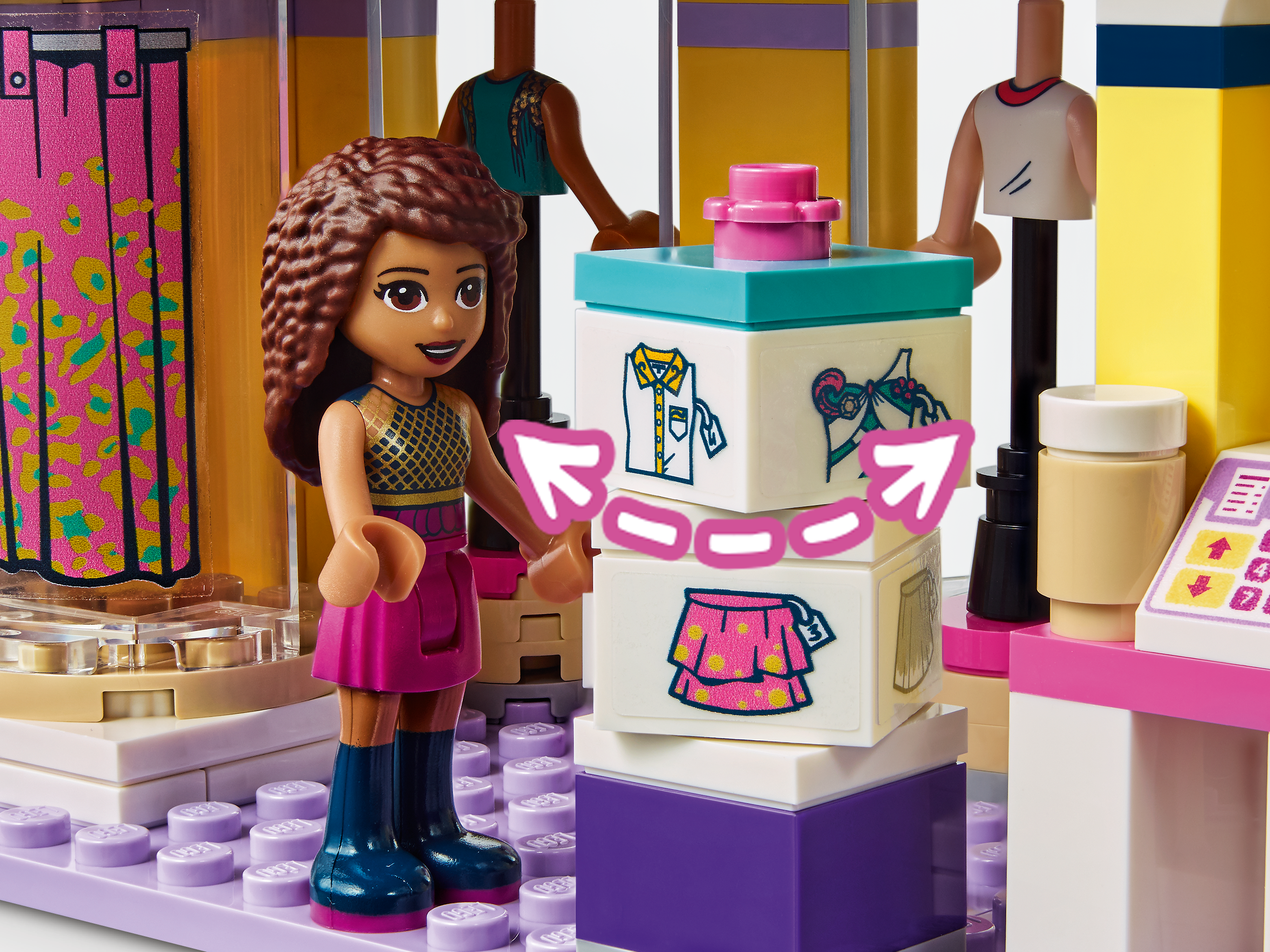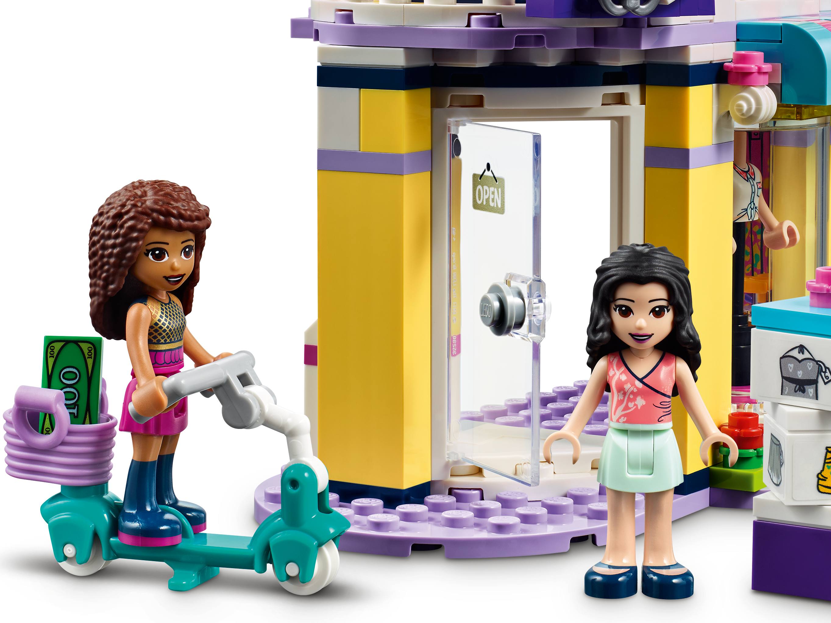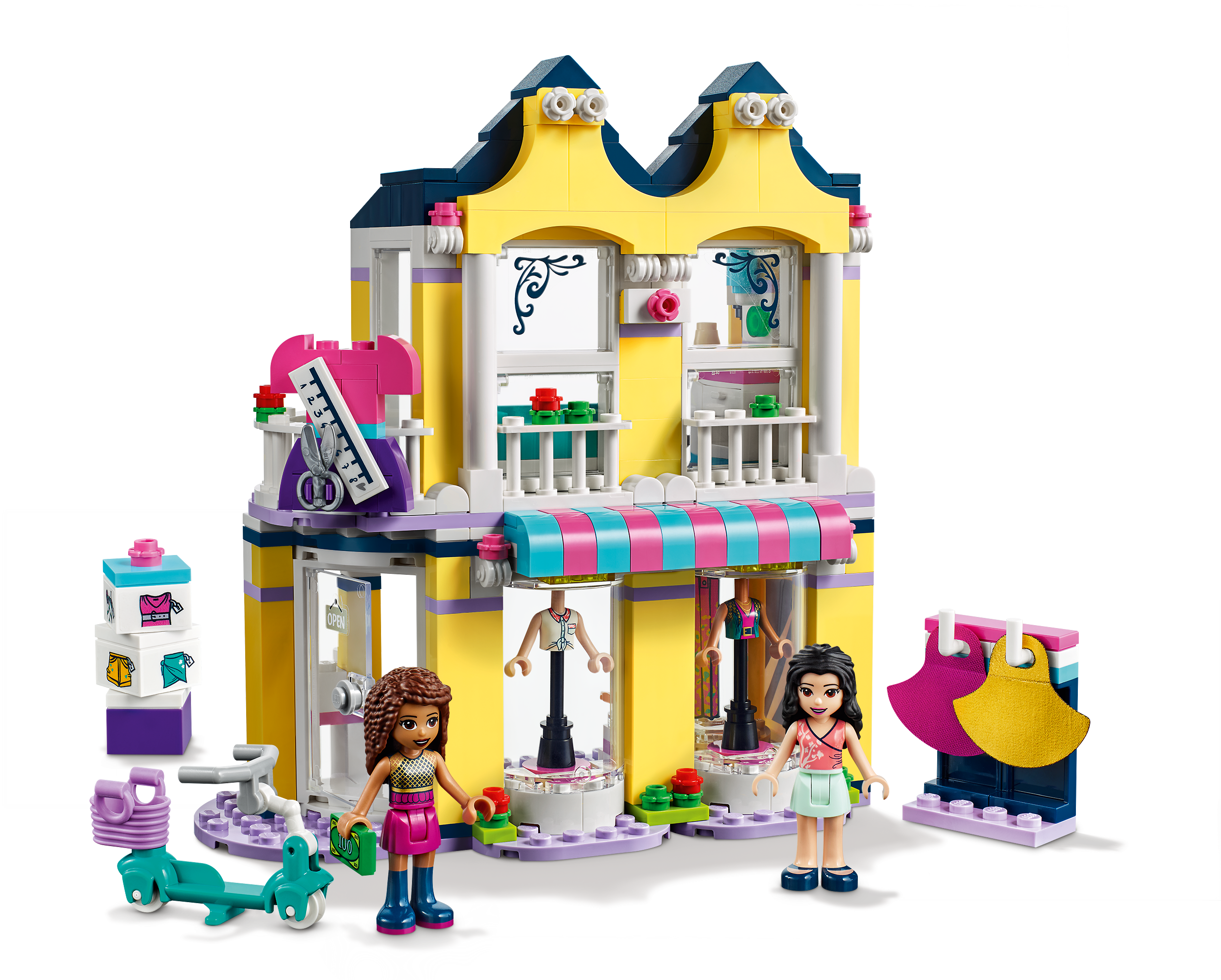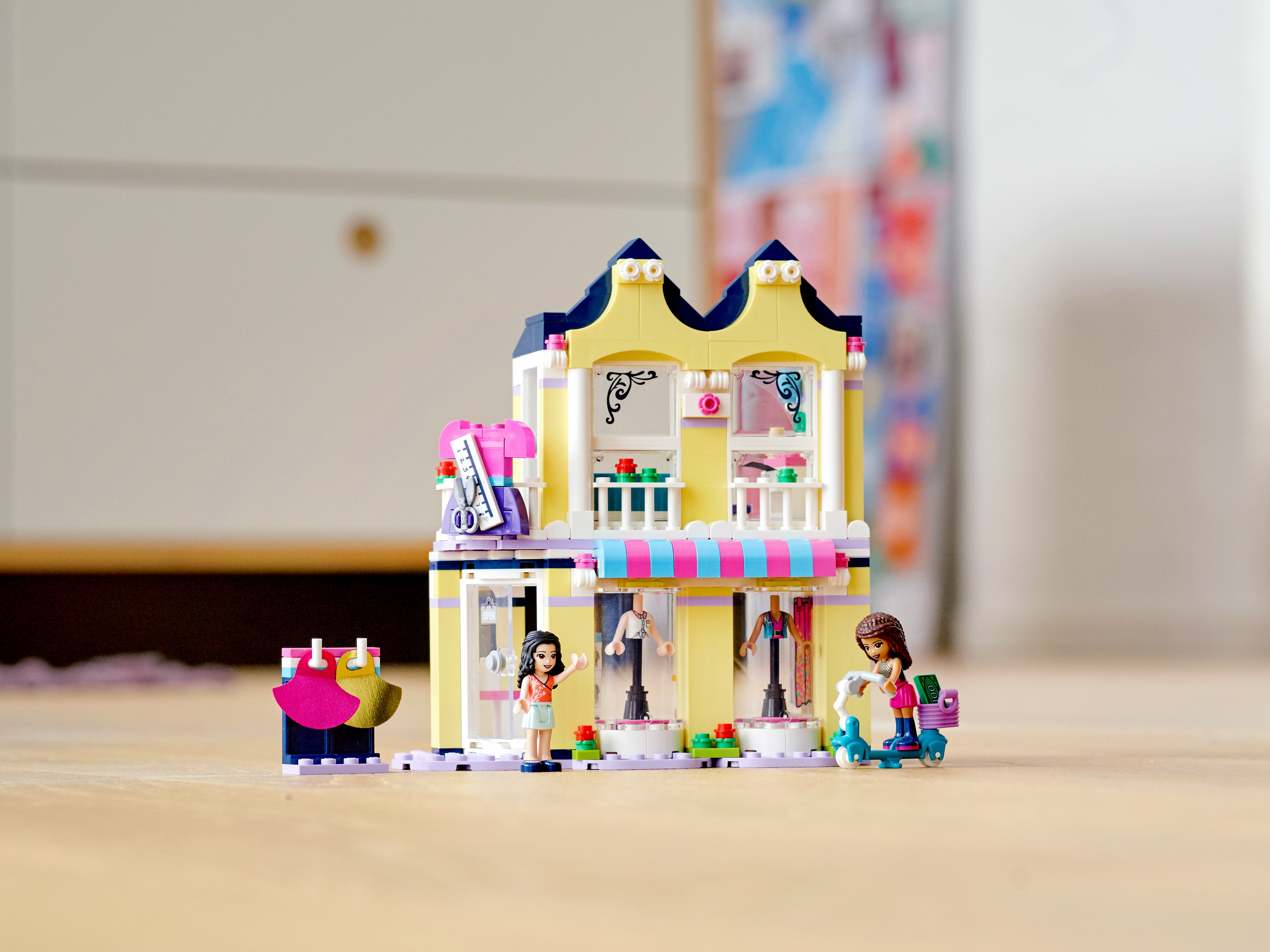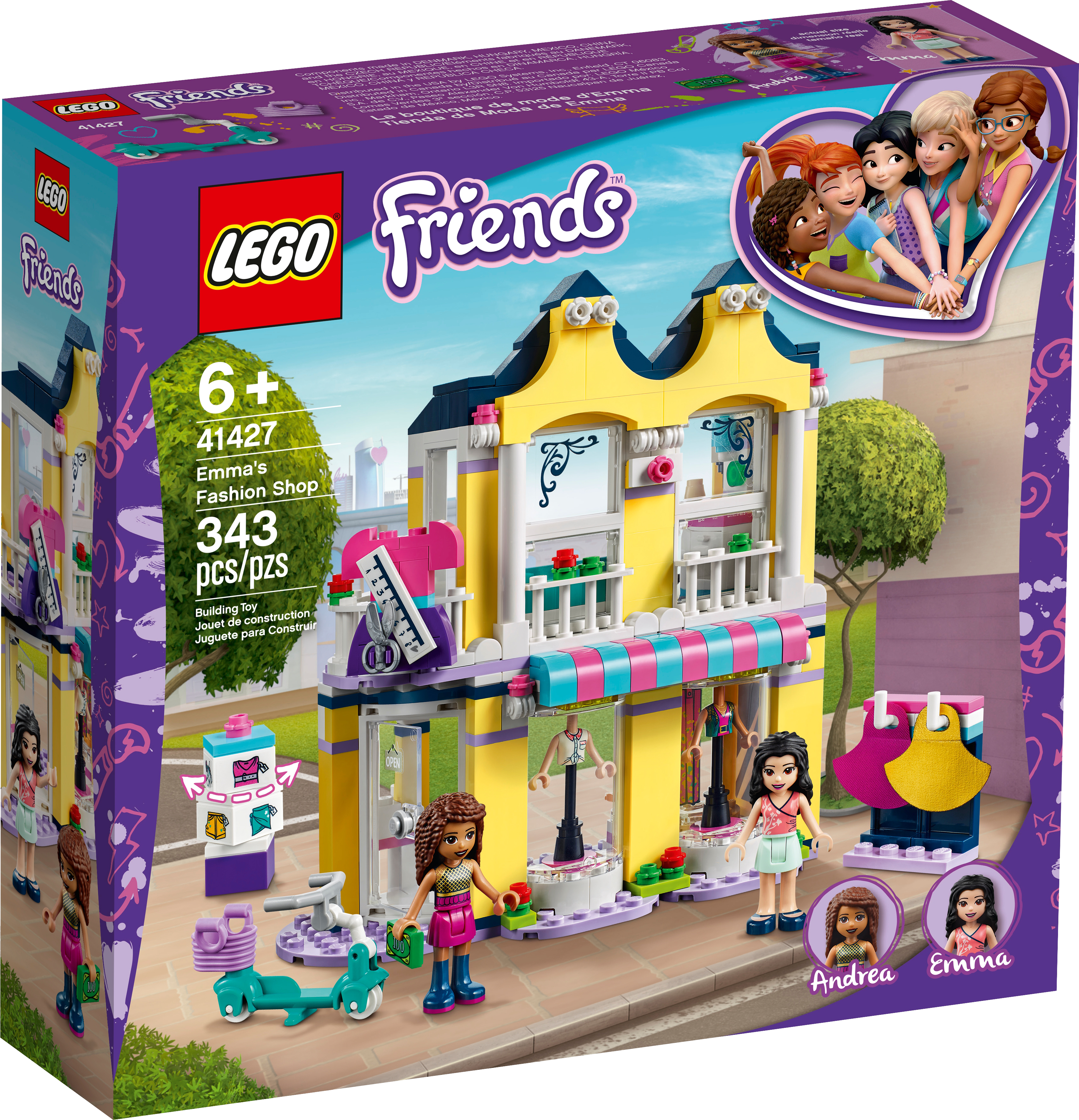Kids with a passion for fashion and dressing up are going to love Emma’s Fashion Shop (41427). Set over 2 floors, this feature-packed playset houses a fashion store where kids can help the mini-dolls choose a new look courtesy of a cool style spinner that lets them mix and match outfits. Kids can then dress them in the neat rotating changing room, complete with reflective mirror.Designed for fun!Budding fashionistas can play out their designer dreams in the Emma's studio where there's a sofa area where the clothing creations are dreamt up over a cup of coffee. The studio also has a sewing area and a balcony. Kids can also remove the studio for easy access to the shop below. Or two friends can play in the 2 areas at the same time!Realistic role-play adventuresHeartlake City sets offer youngsters an exciting build-and-play experience. Introduce your little builder to the world of LEGO® Friends, where Stephanie, Mia, Emma, Olivia and Andrea are waiting to welcome any child to the fun.Let kids play in style with Emma’s Fashion Shop (41427). There’s a store downstairs where youngsters can make-believe shopping for clothes and a tailor’s studio upstairs for designing and making pretend outfits.This build kit comes with a studio and a tailor's shop, 2 buildable mini-doll figures, and fashion accessories, such as the new-for-June 2020 shiny textile skirts, scissors and fabric, sparking hours of creative play.Kids can remove the top floor to play with the store and studio areas separately. This also gives better access to the store’s fun features, such as the spinning style selector and the revolving changing room.Looking for fun toy for kids aged 6+? This 343-piece set makes a great holiday gift or birthday present for boys and girls who love fashion role play, or those who love to get immersed in a rewarding building project.This 2-story fashion store measures over 6” (17cm) high and 6” (16cm) wide makes an awesome toy display in any bedroom. Kids can also combine it with other LEGO® toys for even more creative playtimes.With so many awesome features this shopping toy playset for kids will provide hours of entertainment, and as it needs no batteries, the fun goes on and on.As with all LEGO® building kits, this fashion playset comes with clear instructions designed so kids aged 6+ can follow them and complete their build without adult help, encouraging independence and boosting confidence.Introduce kids to the world of LEGO® Heartlake City, a place of exciting missions, cute pets, happy hang-outs and fabulous friendships.Ever since 1958, LEGO® building kits have met the highest industry standards plus the LEGO Group’s own quality criteria, which ensures that little fingers can connect and pull them apart easily every time.LEGO® bricks and pieces are stringently tested so you can be sure that this building toy for kids meets the highest global safety and quality standards.