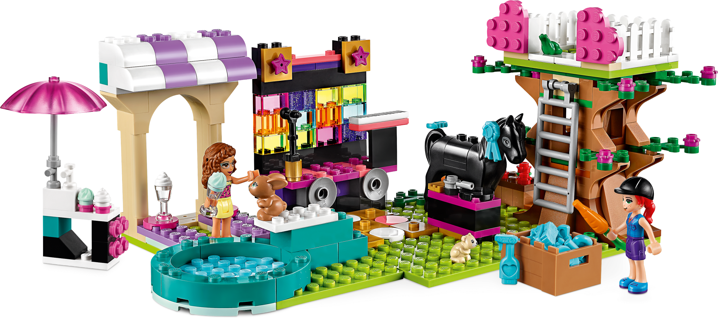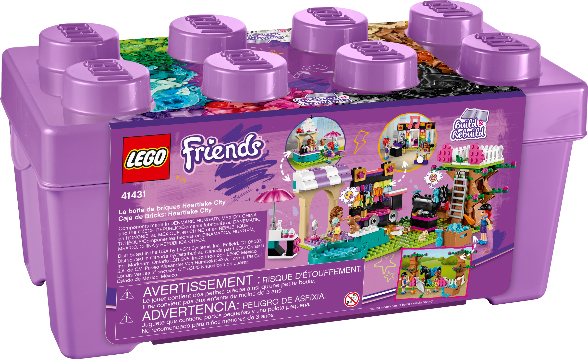 Give a gift that keeps on giving with this LEGO® Heartlake City Friends Brick Box (41431). Inside the pretty purple brick box are all the elements to build 6 sets from Heartlake City. Each scene transforms into a different scene, giving hours of imaginative play as kids create, play and build again.Flexible fun x 6!There are a trio of fun scenes to build and then transform: the café playset becomes a wading pool, the colorful music shop turns into a DJ booth and performance stage, and the horse park transforms into a treehouse playset. These scenes all fit together to make the ultimate place to hang out, where the Friends girls and their small toy animals can watch a performance from their treehouse or wading pool!Discovering the world with friendsIntroduce your child to Heartlake City where they can explore their interests – from science and nature to music and sports – accompanied by the girls from LEGO® Friends. Inspire hours of imaginative play with this LEGO® Creative box containing all the bricks needed to construct 3 scenes, each of which can be built into a second, different scene, then combined to form one cool composite Heartlake City hangout. This 321-piece set becomes a toy café, a horse park and a toy music shop with fun accessories and 2 mini-dolls to encourage imaginative play. Kids can rebuild each element into a new scene or join them together. Kids can explore a range of passions when playing with this toy playset’s 6 scenes, from animal care to performing on stage. And by adding extra LEGO® bricks from other sets they can expand their creative, imaginative play. This Heartlake City Brick Box (41431) is a great birthday, holiday or anytime-surprise gift for kids aged 5+ who love toys that create open-ended play. It makes a top gift for children who have a range of interests. The creative brick box measures just over 7” (18cm) high and 13” (35cm) wide, making it a convenient way to enjoy LEGO® fun away from the home. And by adding bricks from other sets, kids can get lost in a world of creative play! No batteries are needed for these rebuildable toys, so the fun never ends. Kids can enjoy the feeling of independent play and being a ‘self-starter' without needing to ask grown-ups for batteries. This LEGO® playset comes with clear, easy-to-follow instructions for all 6 scenes, meaning even those with little LEGO building experience will be off the blocks and playing with their fun toy in no time at all. Introduce kids to Heartlake City, a world of endless possibilities where children will be immersed in open-ended play in the company of their best LEGO® Friends Olivia, Andrea, Mia, Stephanie and Emma. LEGO® Friends toy playsets meet the highest industry standards, which ensures they are easy for little fingers to pick up, place and pull apart – it's been that way since 1958. At The LEGO Group, we drop, squash, twist, heat, bite, scratch and stretch the bricks in this and all our playsets to ensure they meet the highest global safety and quality standards.