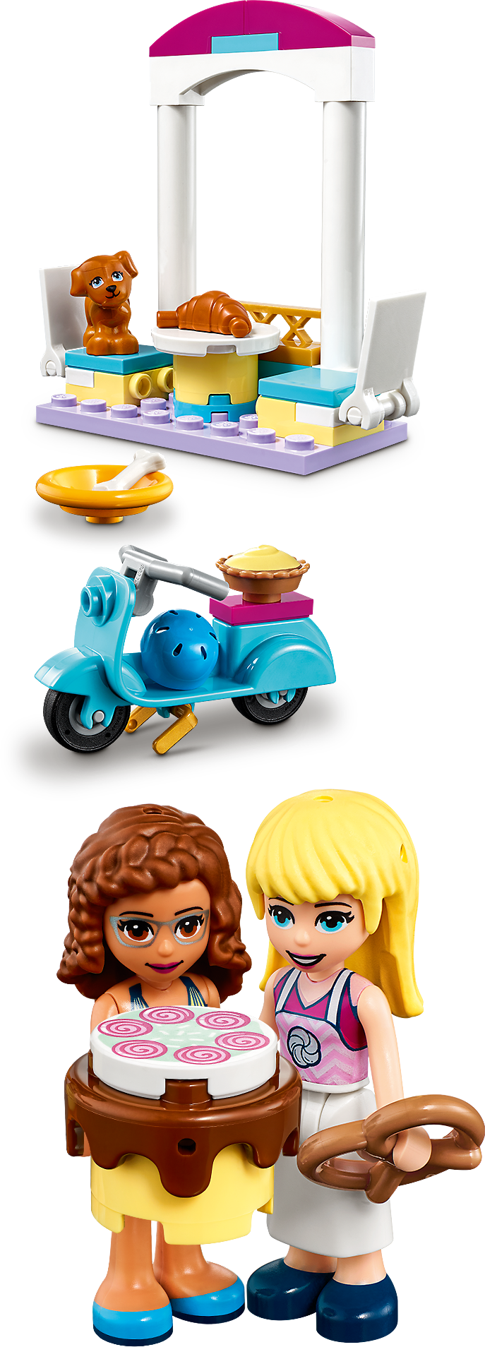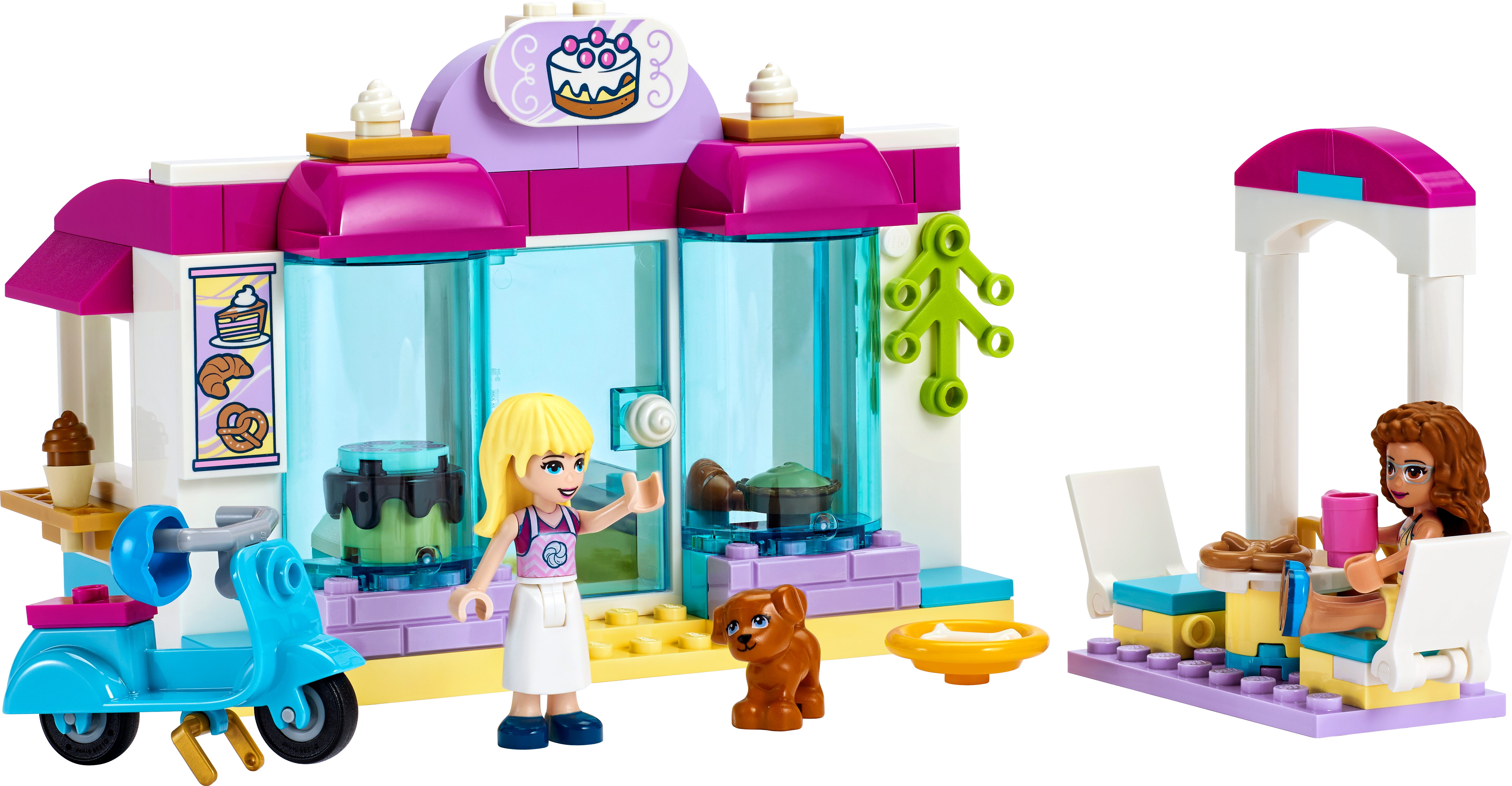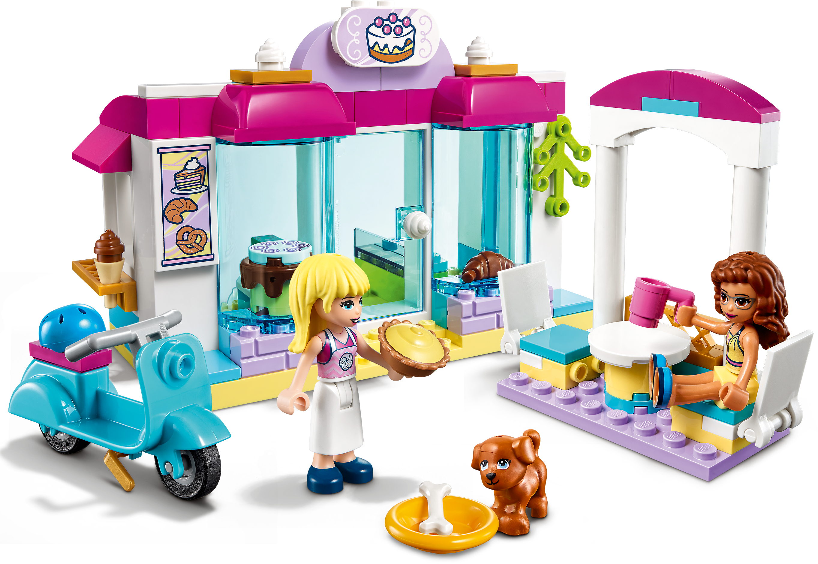 This LEGO® Friends set is packed with cute bakery toy accessories, including a pretzel, dish, helmet, mug, ice-cream scoop,croissant, cake, pie and a bone for the dog.