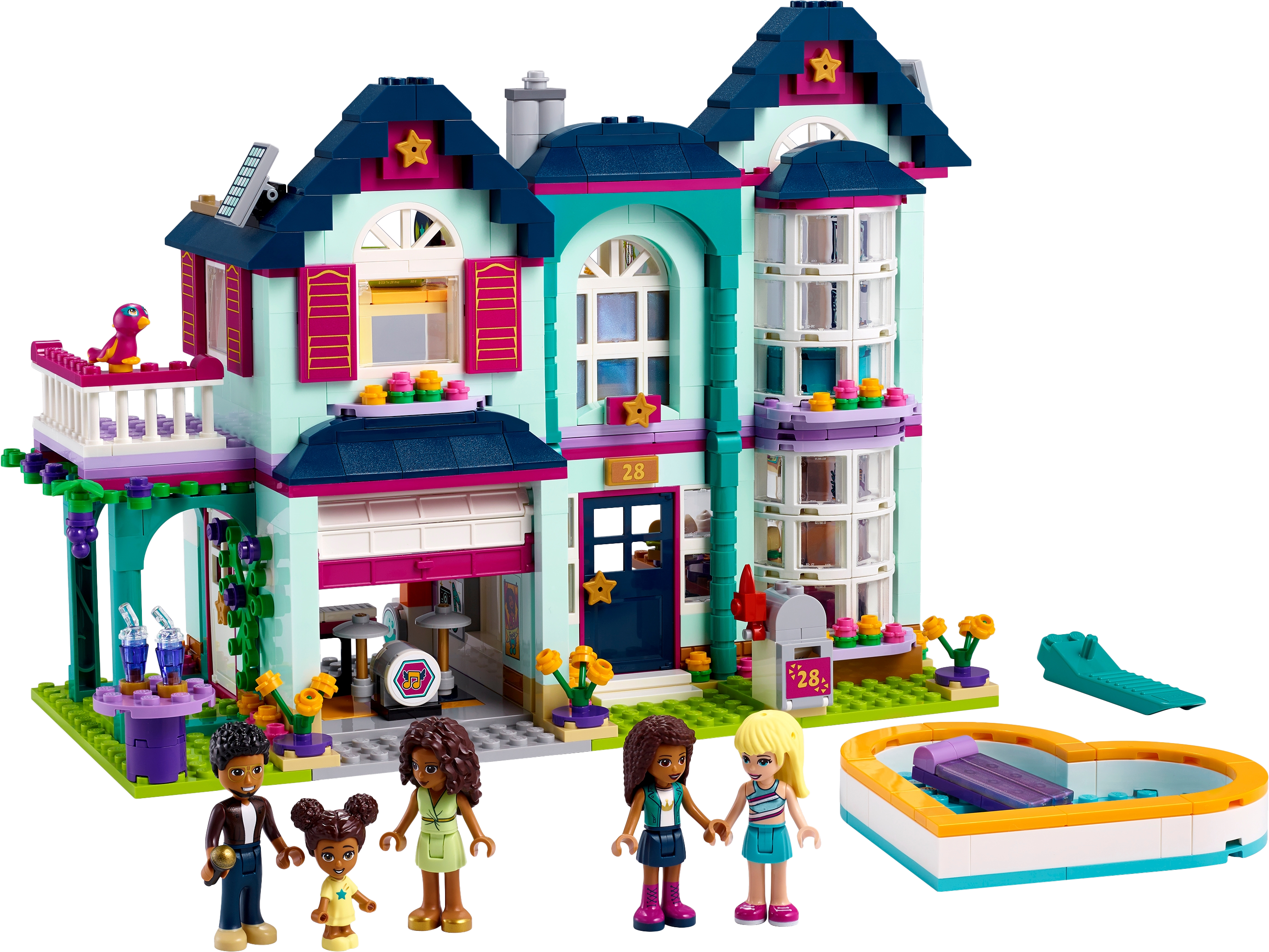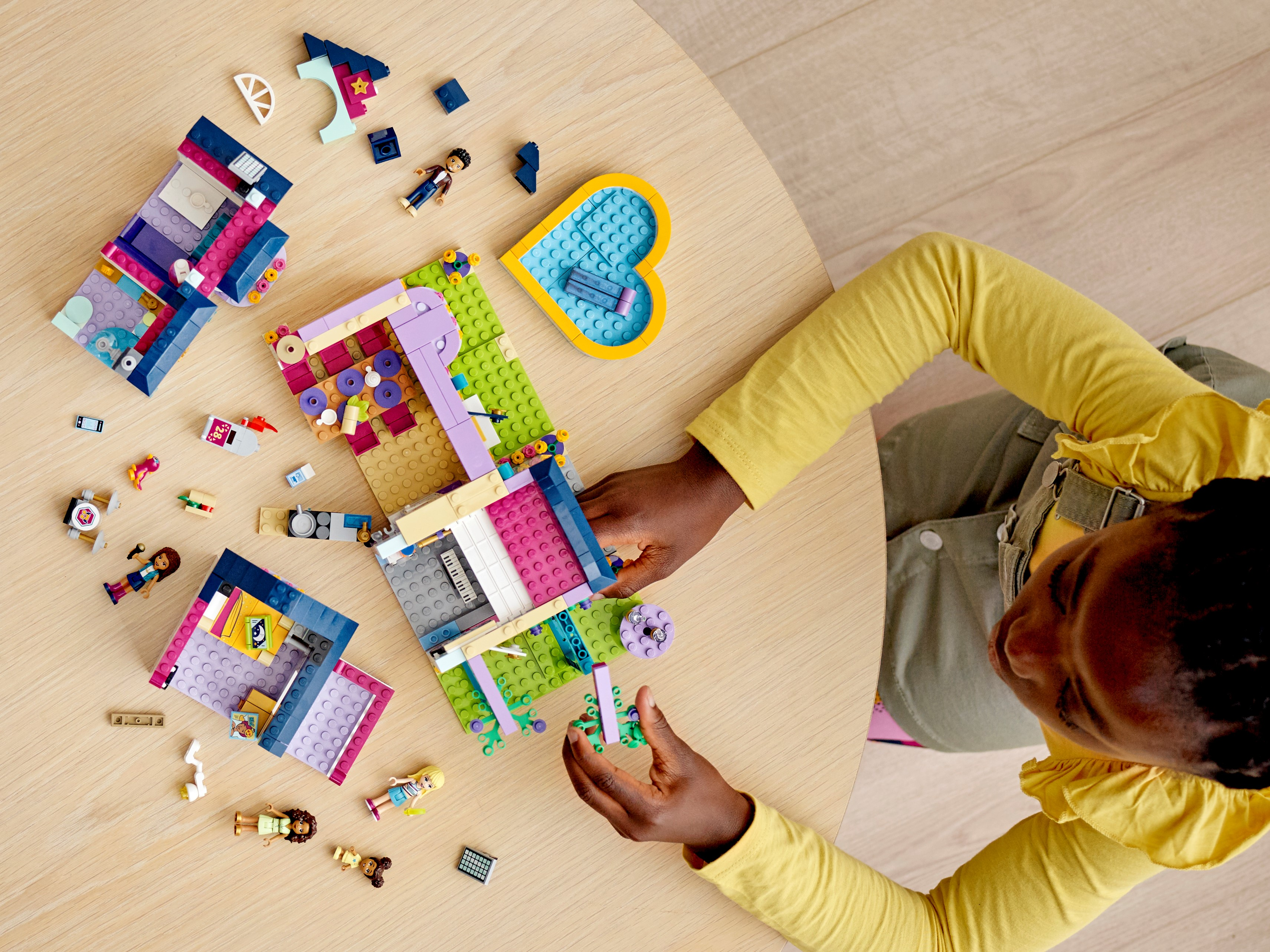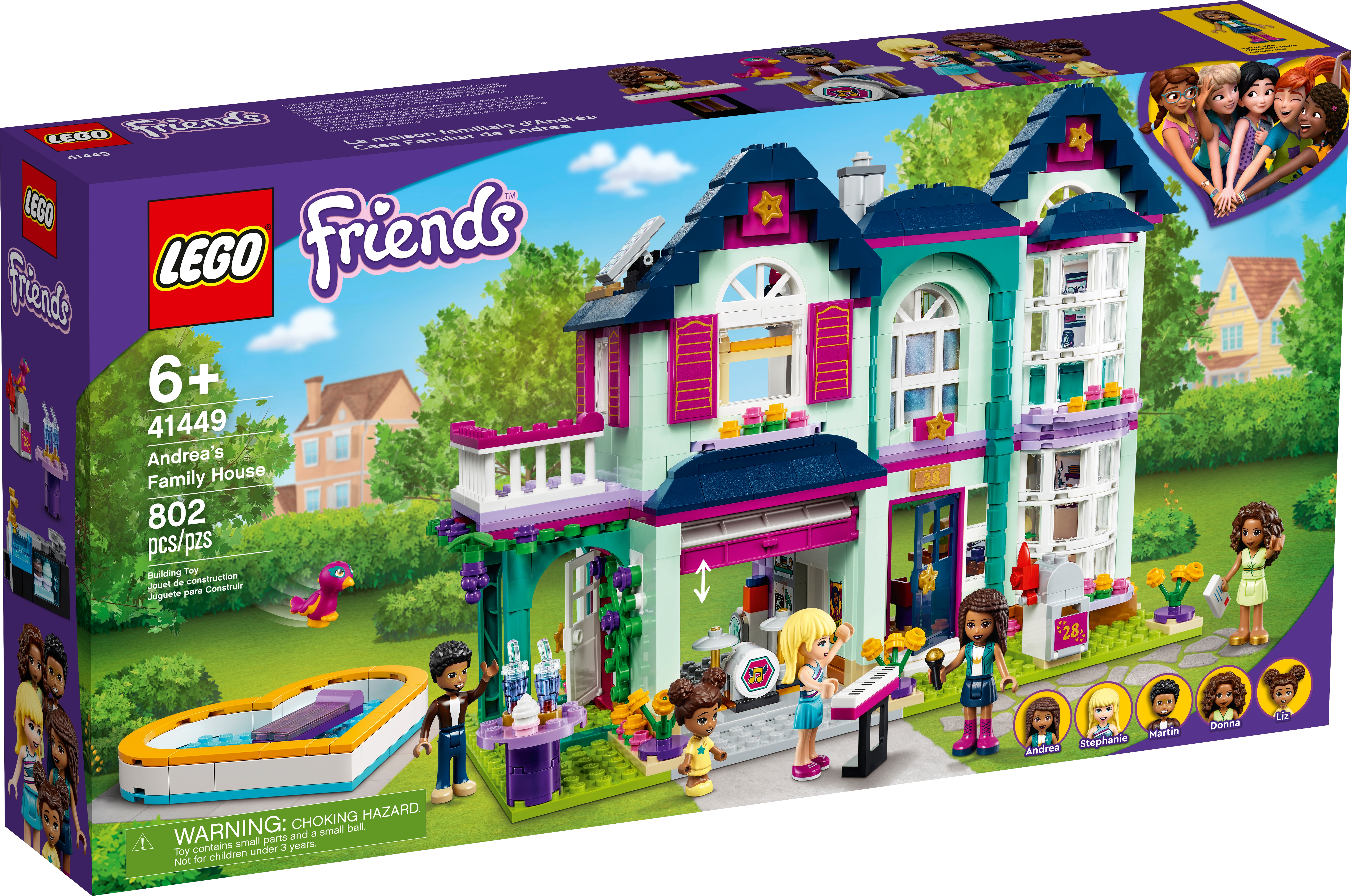 For a gift with real impact, try LEGO Friends Andrea s Family House (41449). Fantastically detailed, from the solar panels on the roof to the mini keyboard in the garage studio, this premium playset will delight LEGO Friends fans and wow buddies who come to play. Rooms galore to exploreKids can hang out in Andrea's bedroom or make cupcakes in the kitchen with the cute cooking accessories. There's a heart-shaped pool and a cool garage studio with musical toys where Andrea and her friends can put on a show for the neighborhood! The roof features solar panels, helping the family live in a modern way, and the top floor is removable, making it easy for little fingers to explore the features. So many parts to play! The set comes with 5 LEGO Friends mini-dolls including Liz, Andrea's little sister, a new-for-January-2021 micro-doll so there are limitless ways for kids to play out LEGO family life. Introduce kids to Heartlake City where kids will find a best friend who's just like them! Wow little builders with the 3-story LEGO® Friends Andrea’s Family Home (41449). Kids can explore the cool features and act out family life within the walls of this premium-quality playset. With 5 LEGO® Friends mini-dolls, this beautifully styled set includes a whole family of characters, including a new-for-January-2021 micro-doll, to inspire limitless family role-play fun. Kids can put on a music show for the neighbors from the garage studio, hang out in Andrea's bedroom, pretend to take a dip in the pool or make a meal in the modern kitchen diner. Environmentally conscious kids will love how this house is fit for the future, thanks to its solar panels on the roof. Like all LEGO® Friends house sets it comes packed with cool accessories. Cleverly designed to make play easier, the playset's top floor is removable so the downstairs level is accessible. In the kitchen the work bench swings out to let little fingers in. Looking for a birthday gift to impress a kid who's into dolls’ houses? Boys and girls aged 6+ will love to unwrap this premium toy and share the playing-house fun with their friends. Measuring over 7 in. (20 cm) high, 10 in. (26 cm) wide and 4 in. (12 cm) deep, this creative gift makes an eye-catching display without taking up too much room. Introduce trend-setting kids to the welcoming world of LEGO® Friends, where everyone's included and every face fits. This LEGO® house playset meets stringent industry standards to ensure its bricks are compatible and connect and pull apart consistently every time – it’s been that way since 1958. The bricks and components of this mini-dolls’ house are tested to the max to ensure they meet stringent global safety and quality standards.