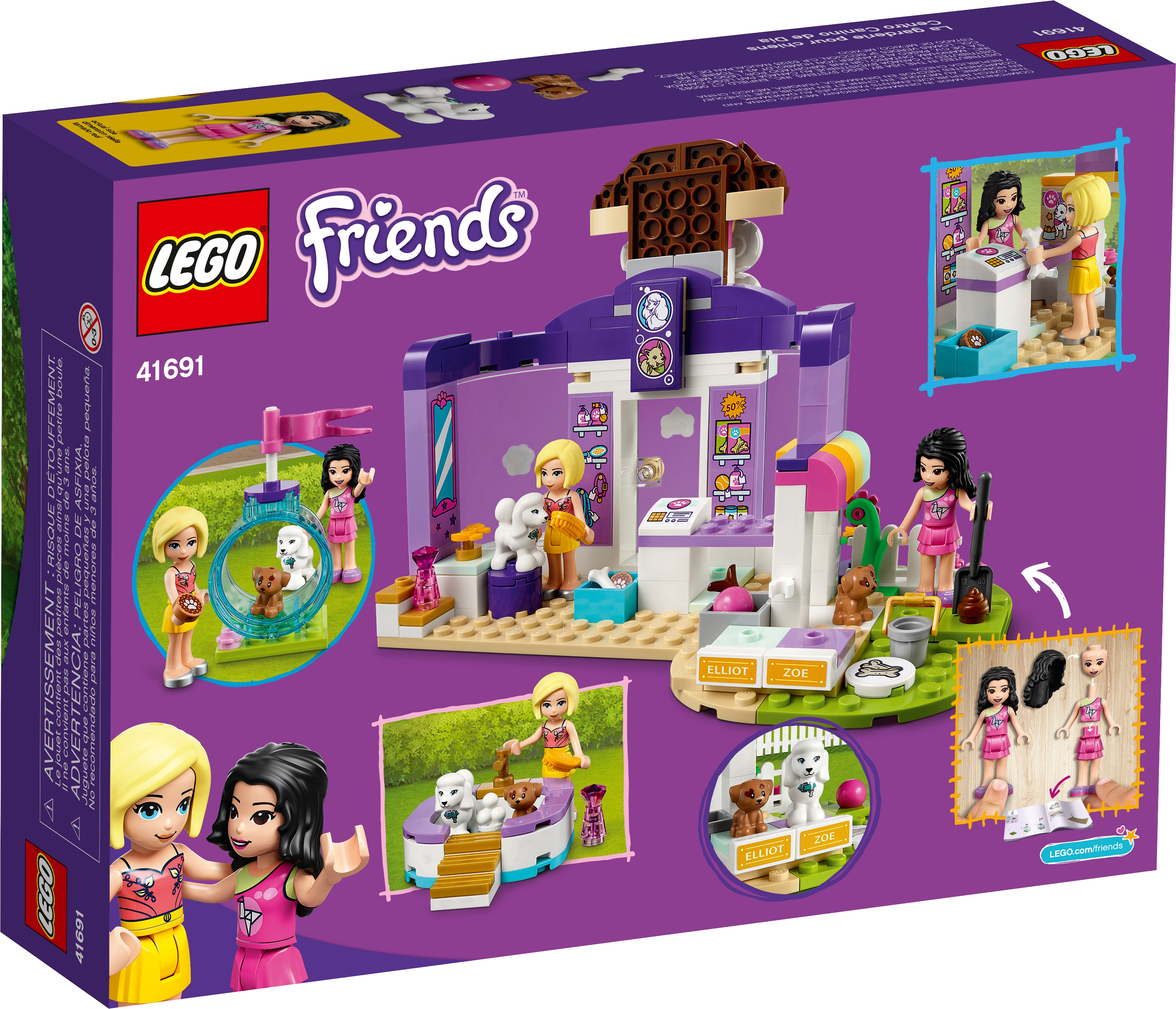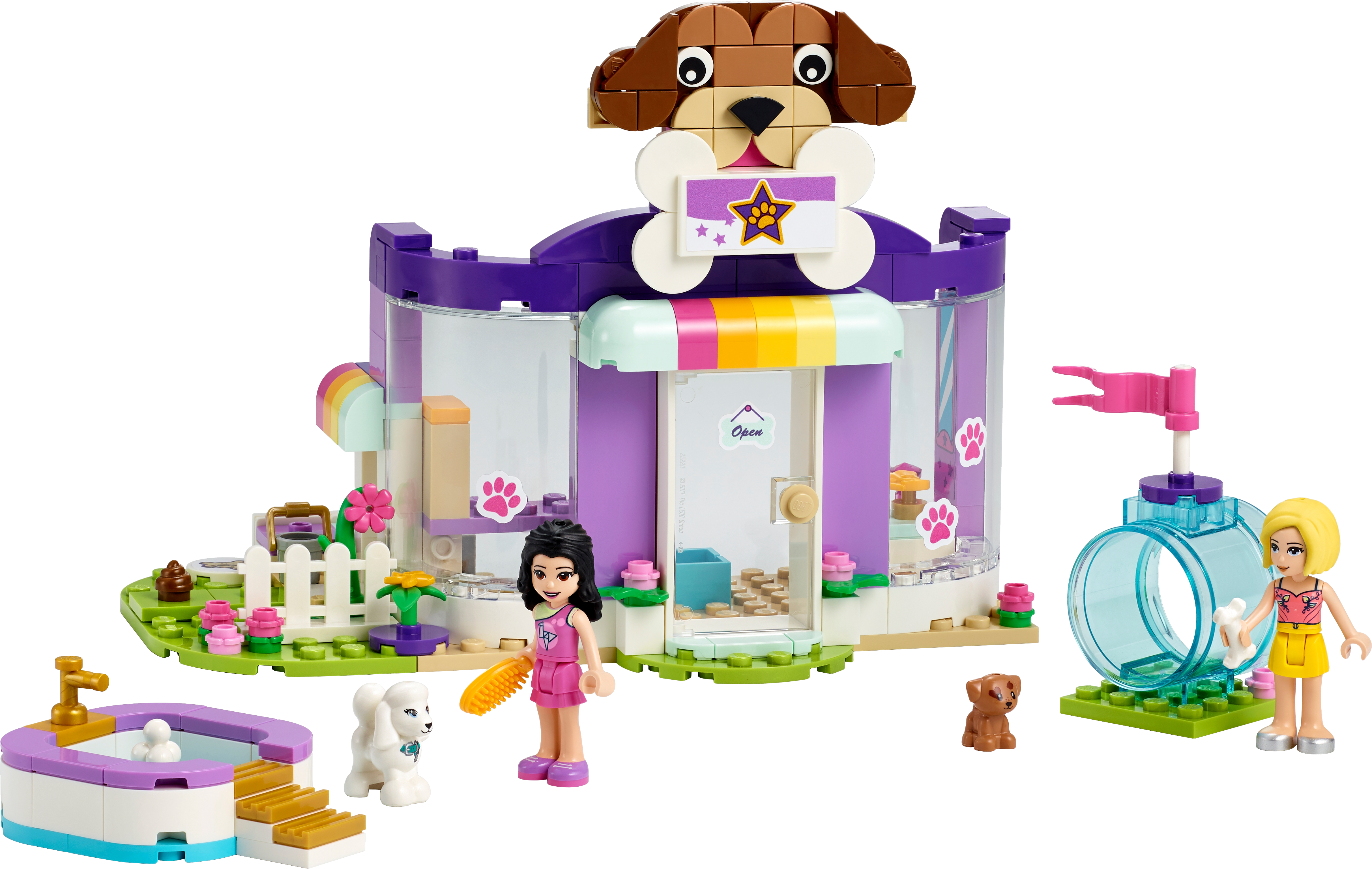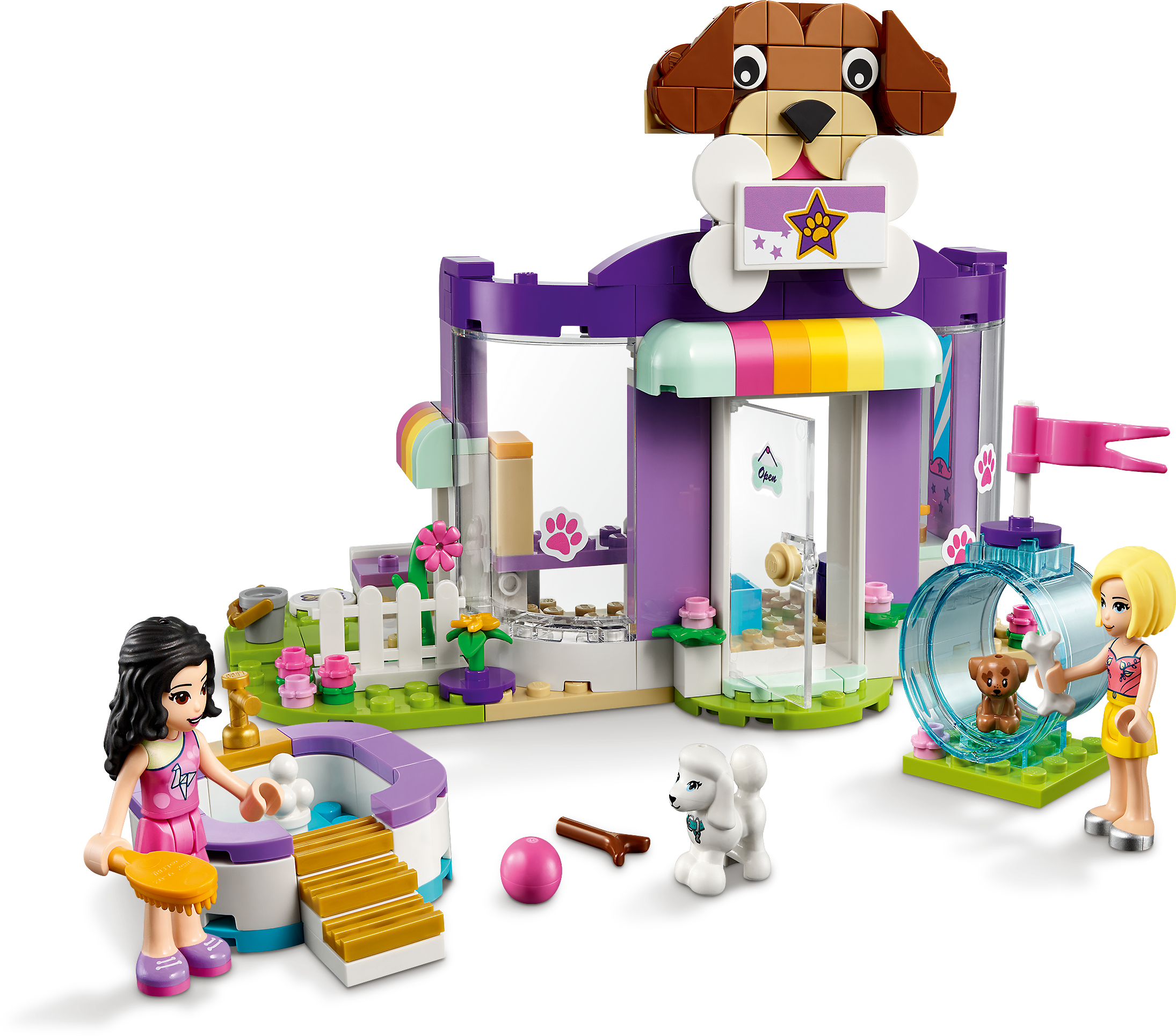 Includes LEGO® Friends Emma and Roxy mini-dolls, a dog figure and a new-for-January-2021 puppy figure. Also comes with a grooming area, cash register, separate bathing pool and agility tunnel.