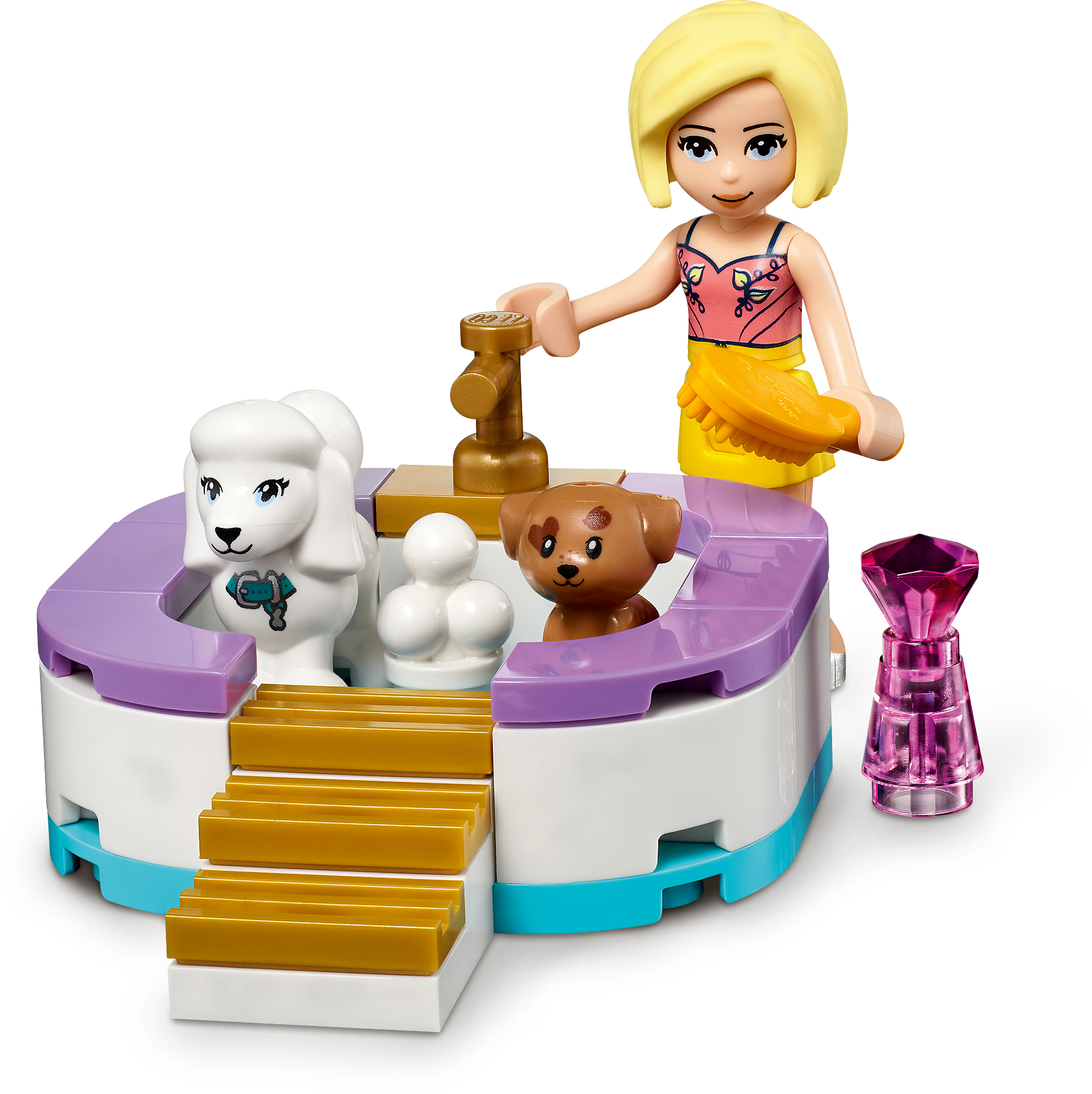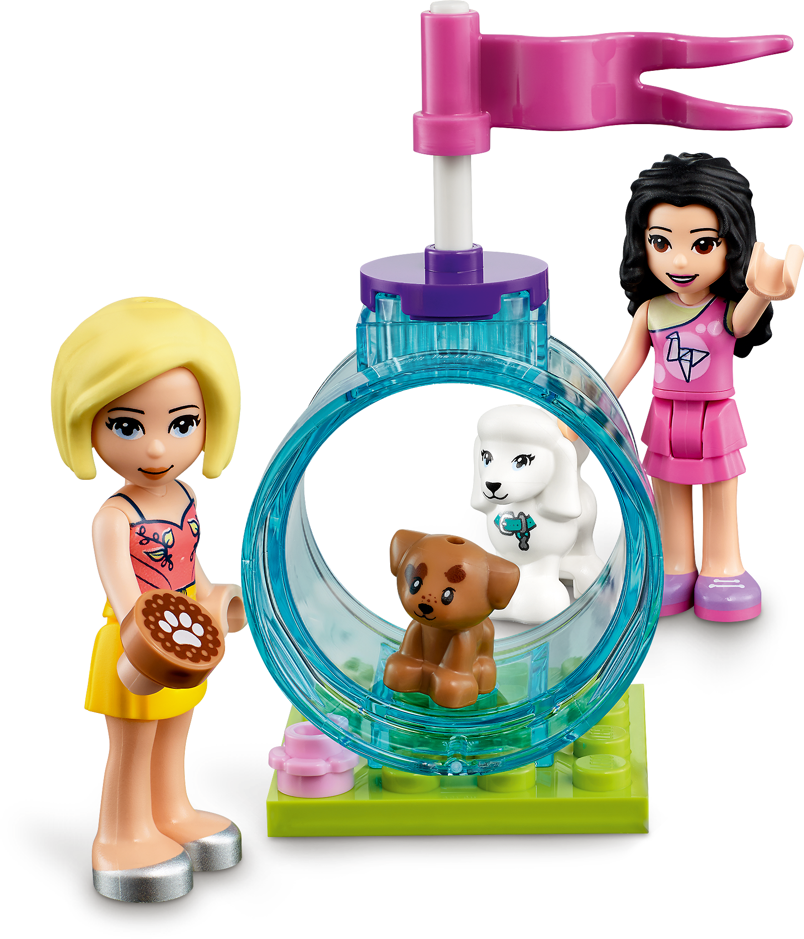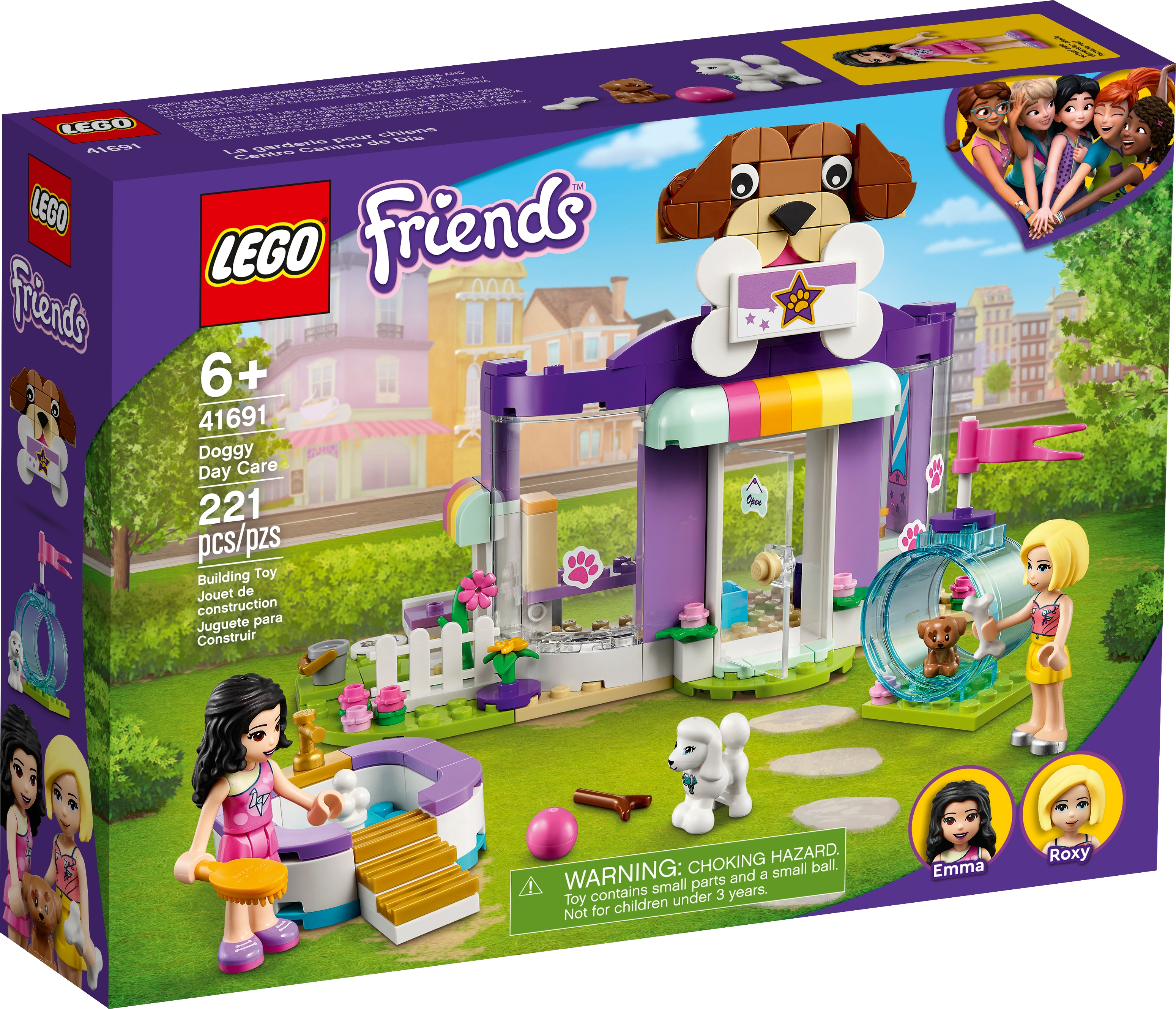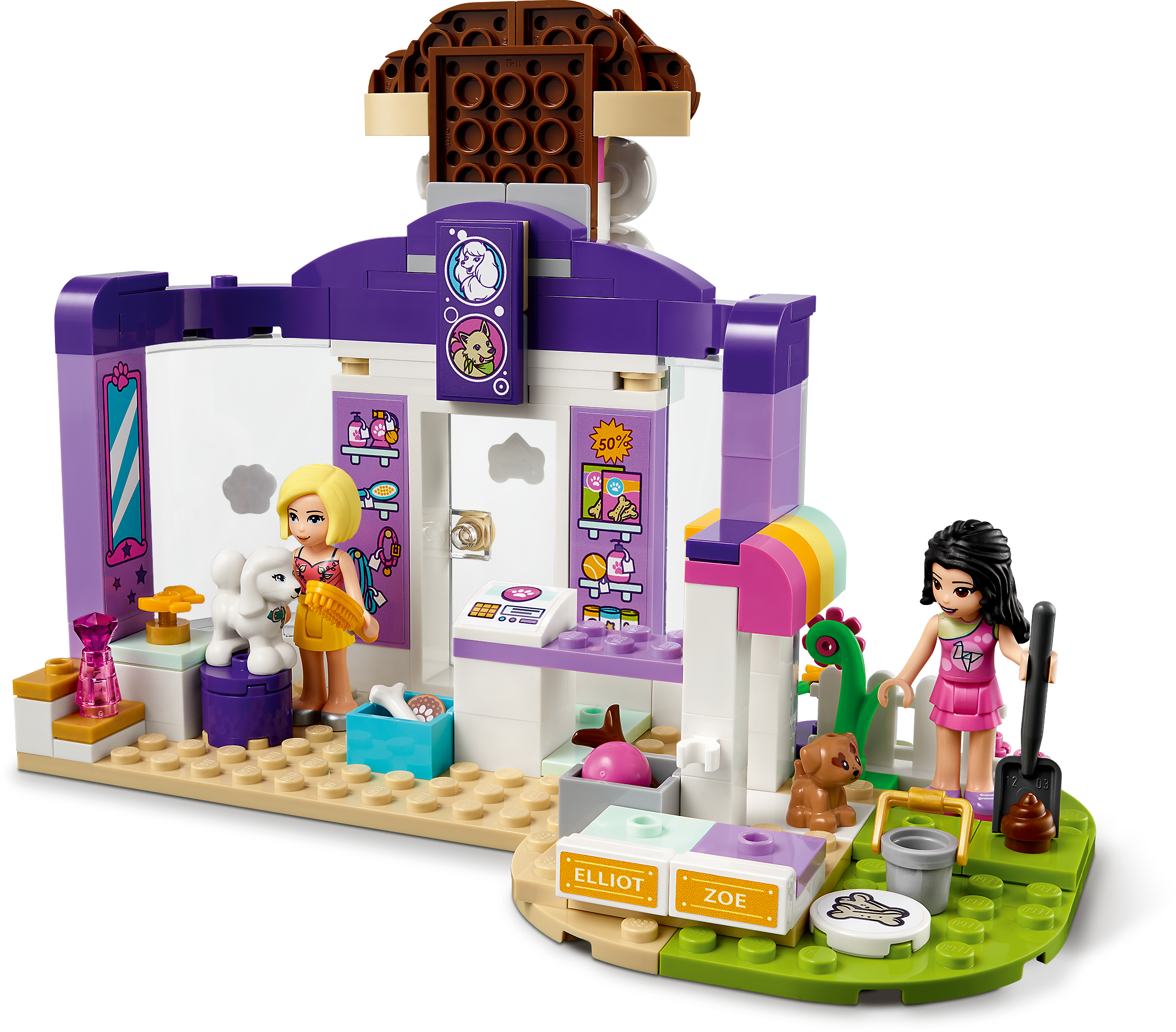 Includes LEGO® Friends Emma and Roxy mini-dolls, a dog figure and a new-for-January-2021 puppy figure. Also comes with a grooming area, cash register, separate bathing pool and agility tunnel.