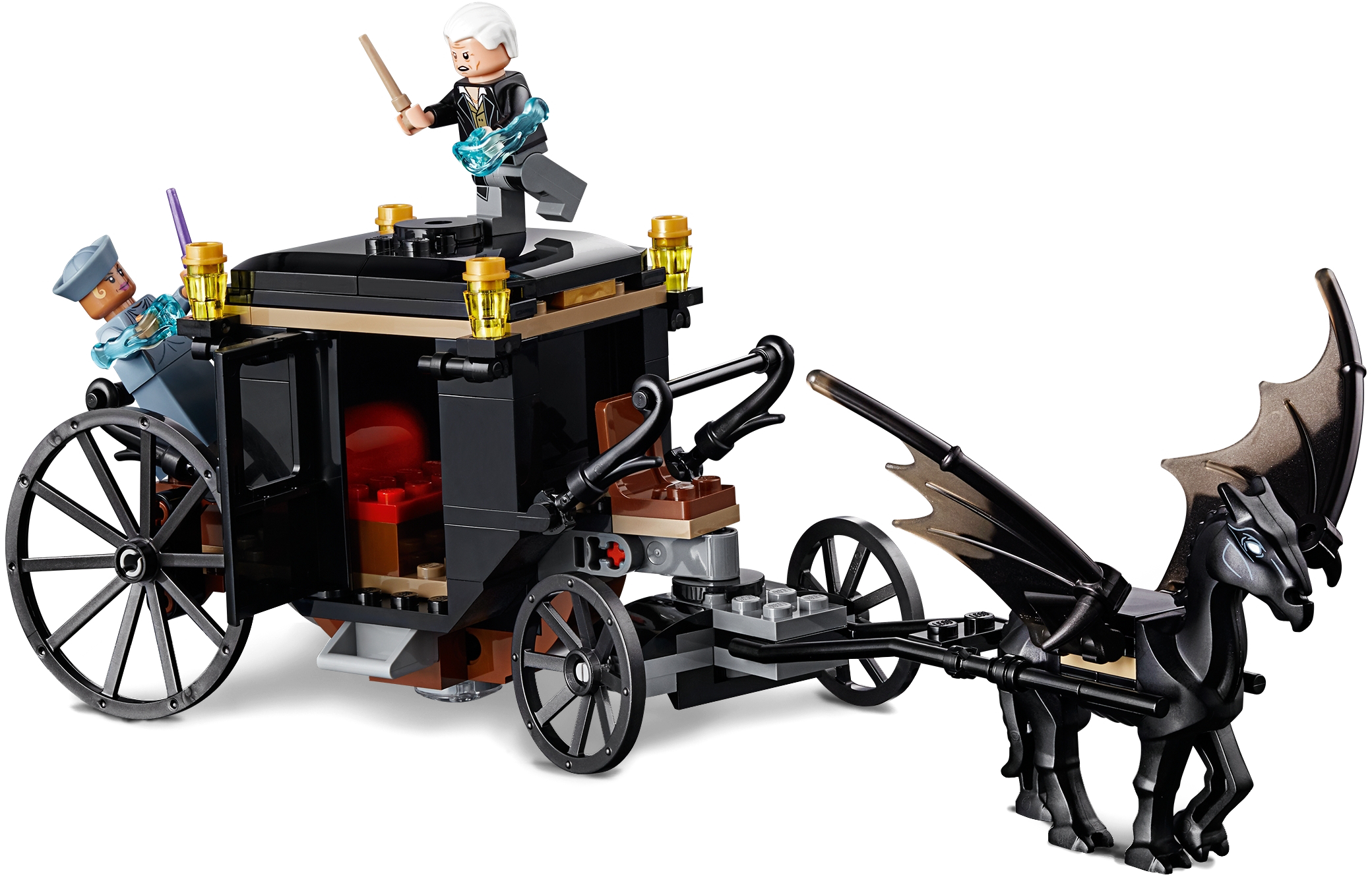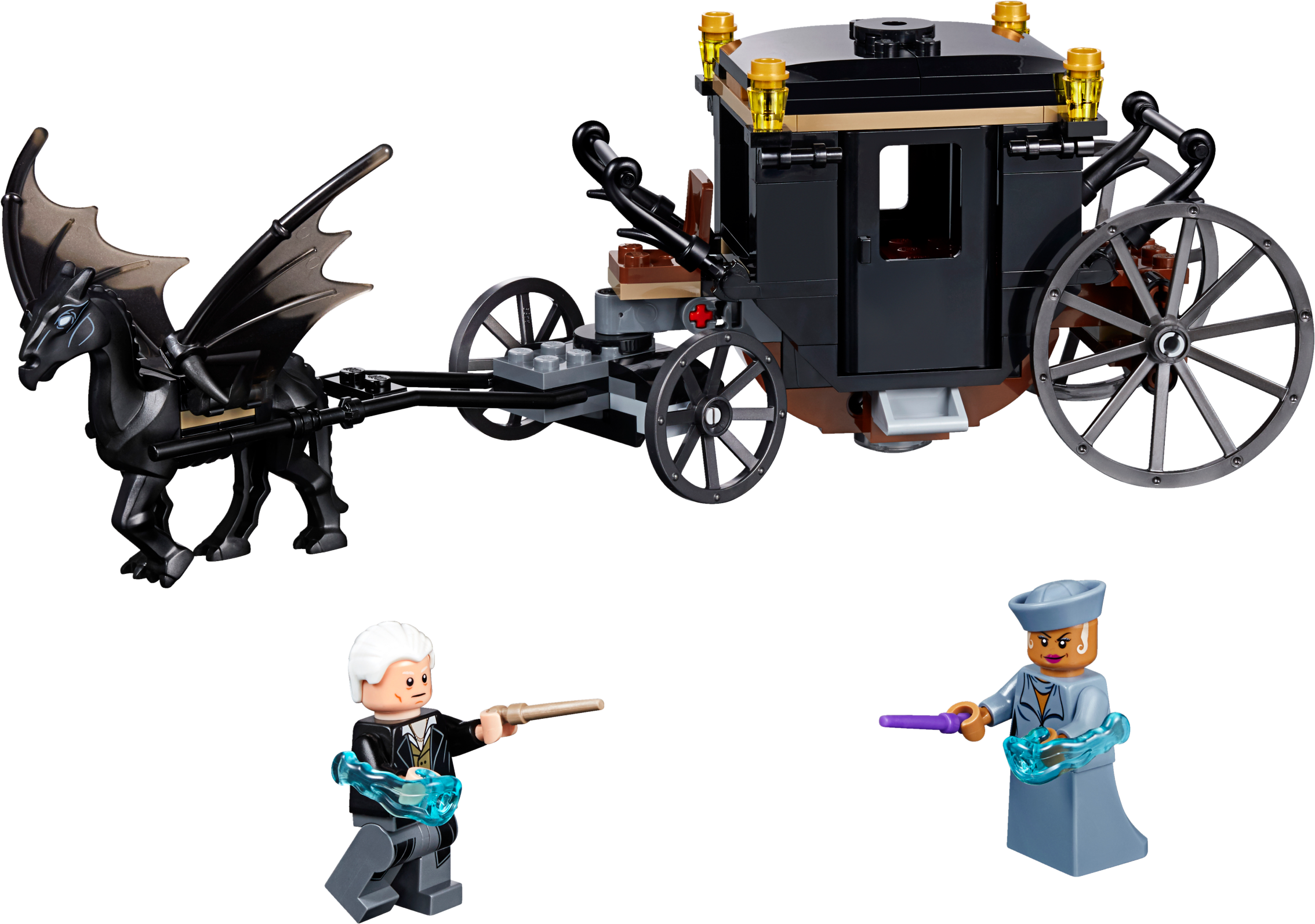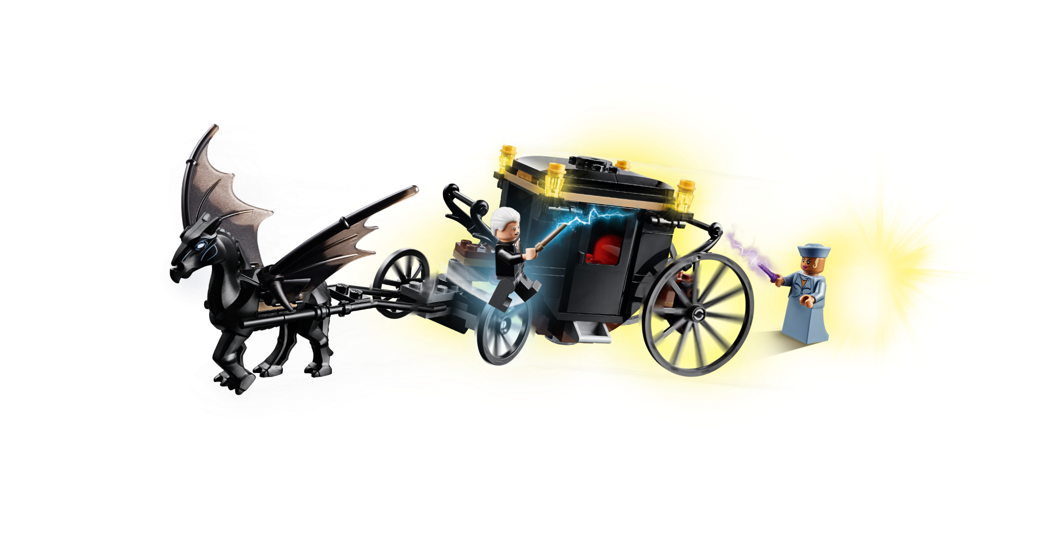 Enter a fantasy realm with LEGO® Fantastic Beasts™ 75951 Grindelwald’s Escape magical showdown between Seraphina Picquery™ and Grindelwald, featuring an articulated carriage with opening doors and removable roof attached to the Thestral figure with hinged wings. Use the shooting spell accessories to make the Fantastic Beasts: The Crimes of Grindelwald magic come alive and role-play a mighty battle. Includes 2 minifigures.
