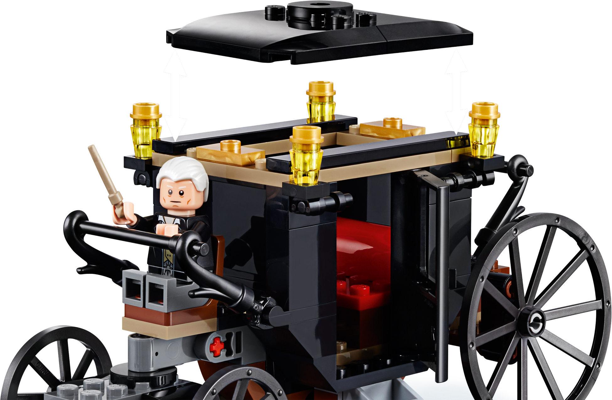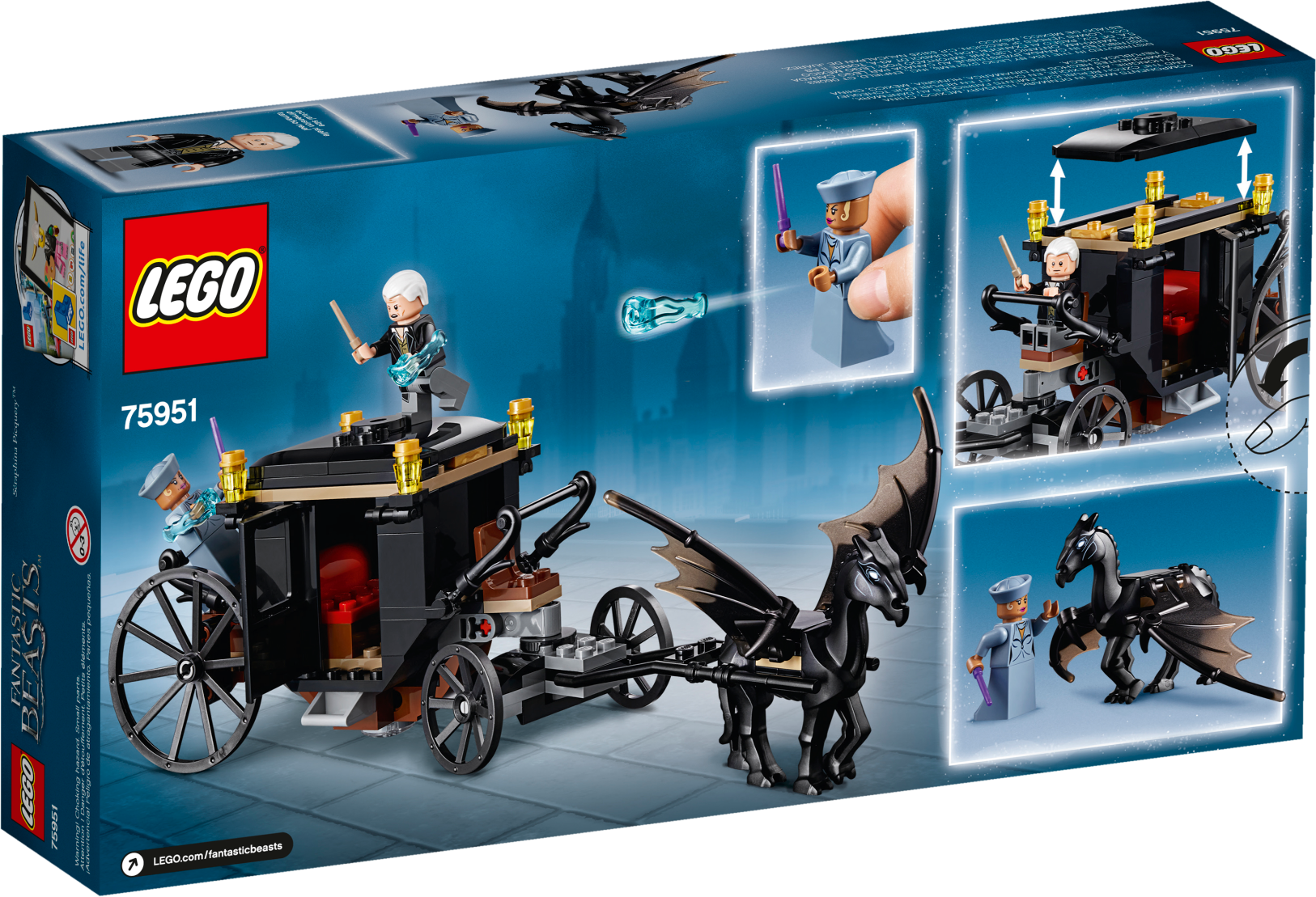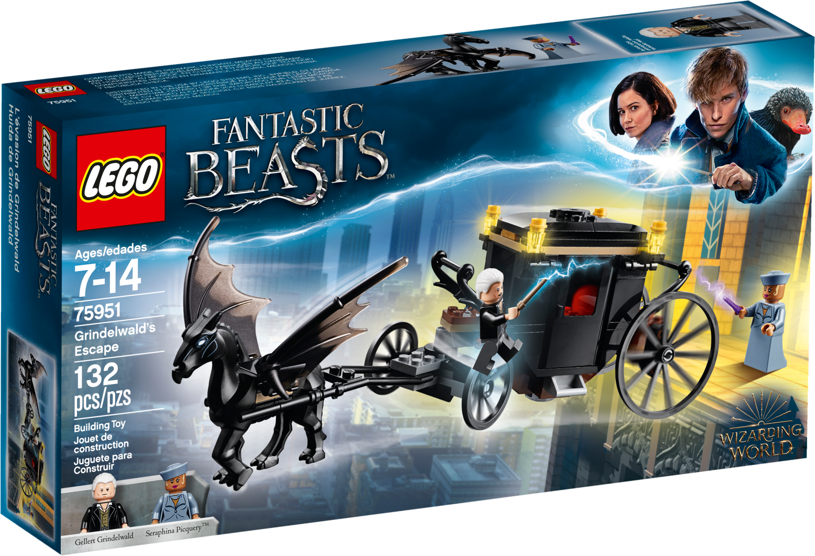 Enter a fantasy realm with LEGO® Fantastic Beasts™ 75951 Grindelwald’s Escape magical showdown between Seraphina Picquery™ and Grindelwald, featuring an articulated carriage with opening doors and removable roof attached to the Thestral figure with hinged wings. Use the shooting spell accessories to make the Fantastic Beasts: The Crimes of Grindelwald magic come alive and role-play a mighty battle. Includes 2 minifigures.