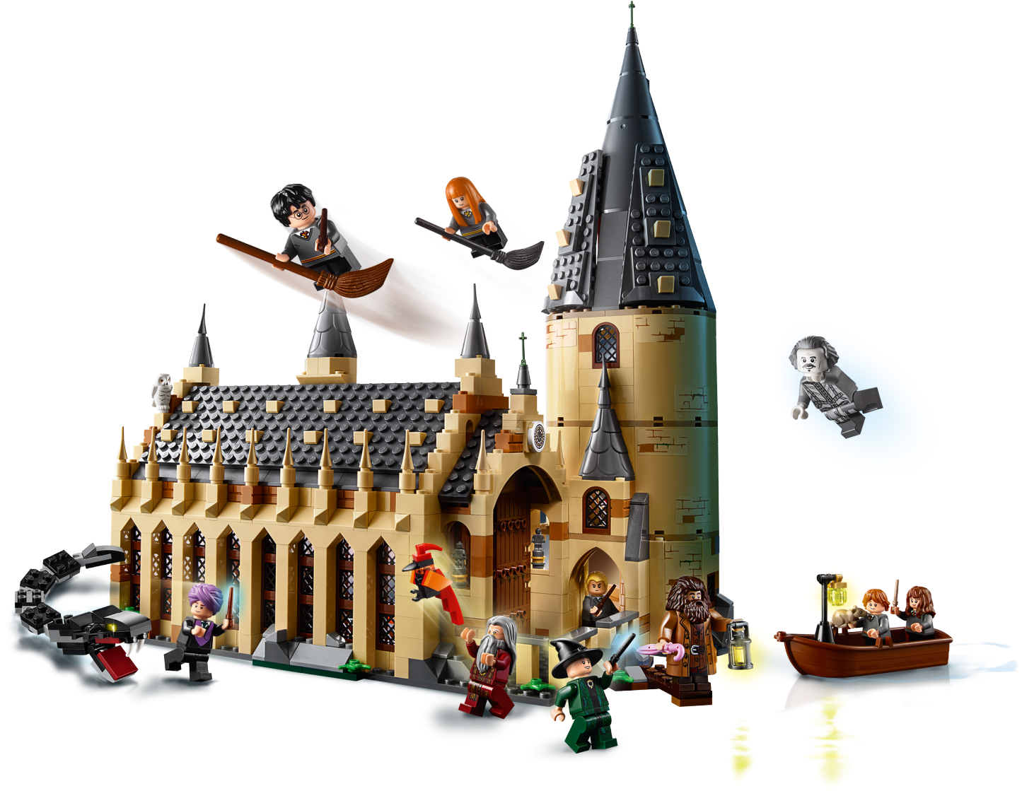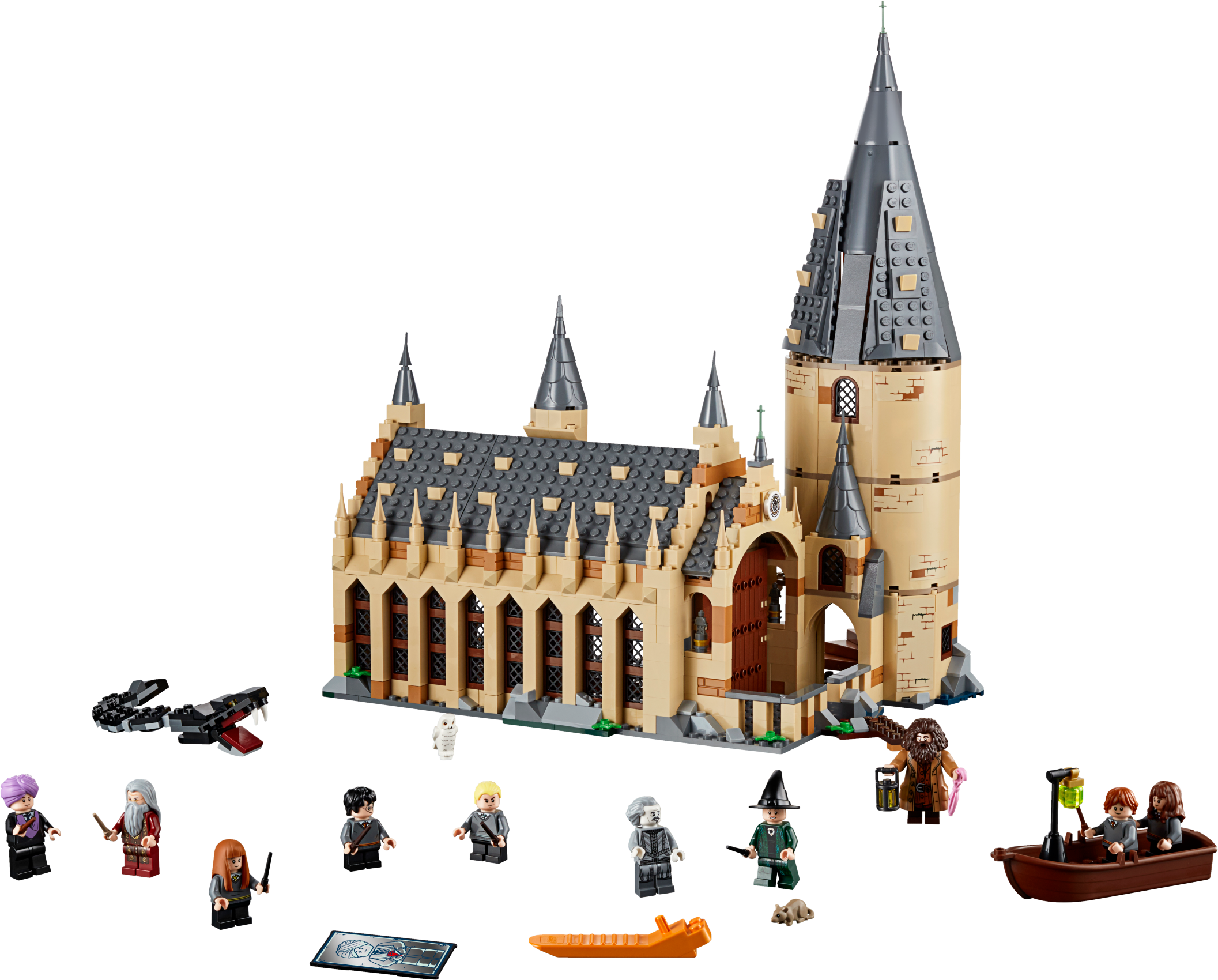 Includes 10 minifigures: Harry Potter™, Ron Weasley™, Hermione Granger™, Draco Malfoy™, Susan Bones, Professor McGonagall™, Professor Quirrell with dual Lord Voldemort™ face, Hagrid™, Albus Dumbledore™ and Nearly Headless Nick, plus buildable Basilisk and Fawkes™ creatures, and Hedwig™ and Scabbers™ figures.