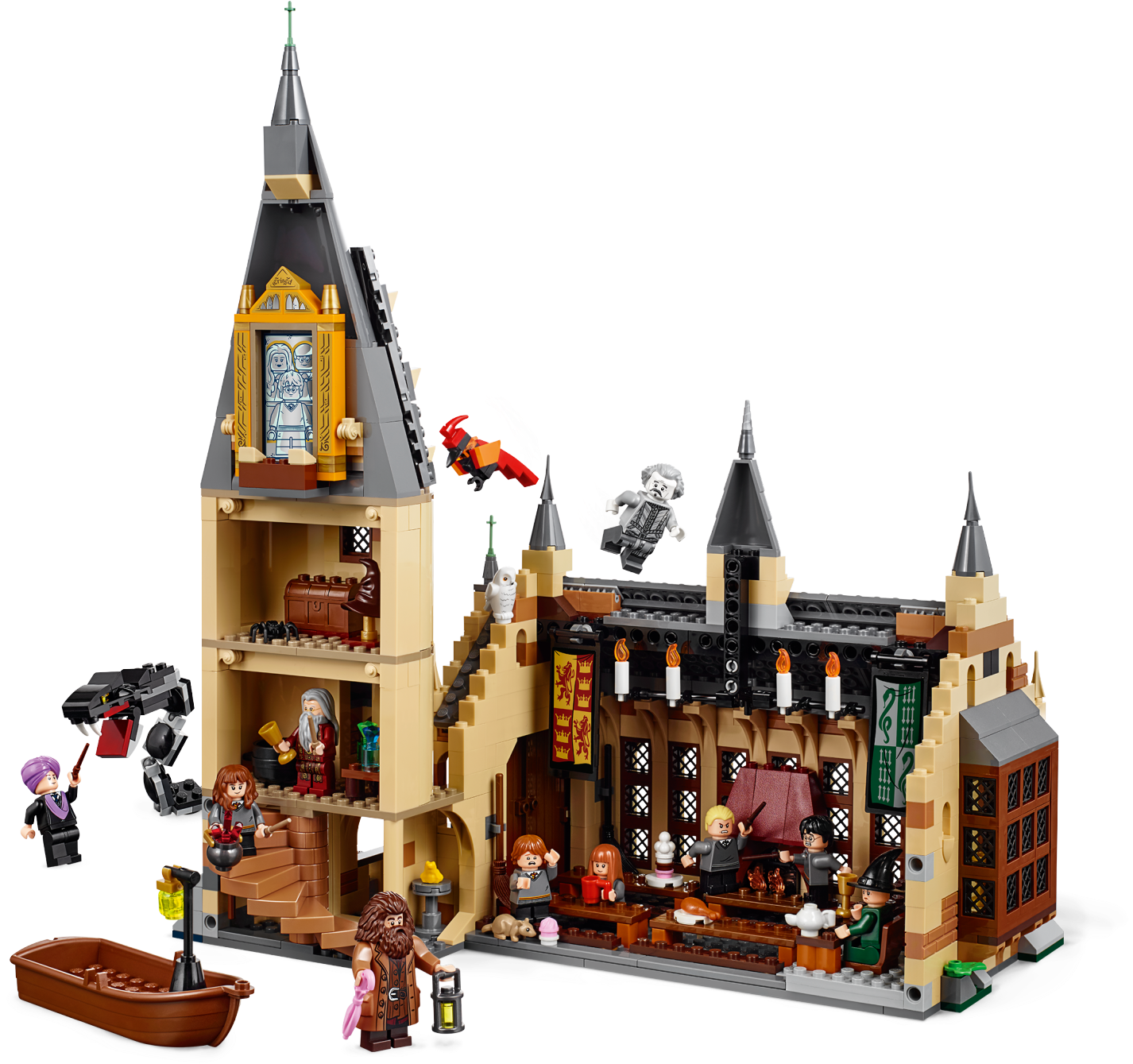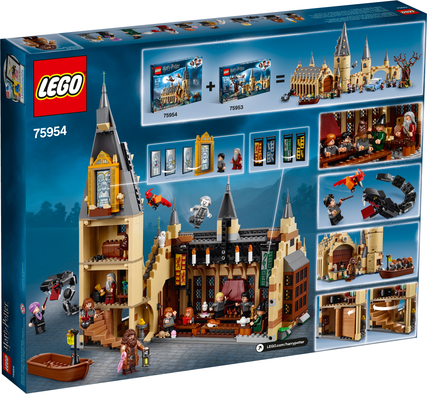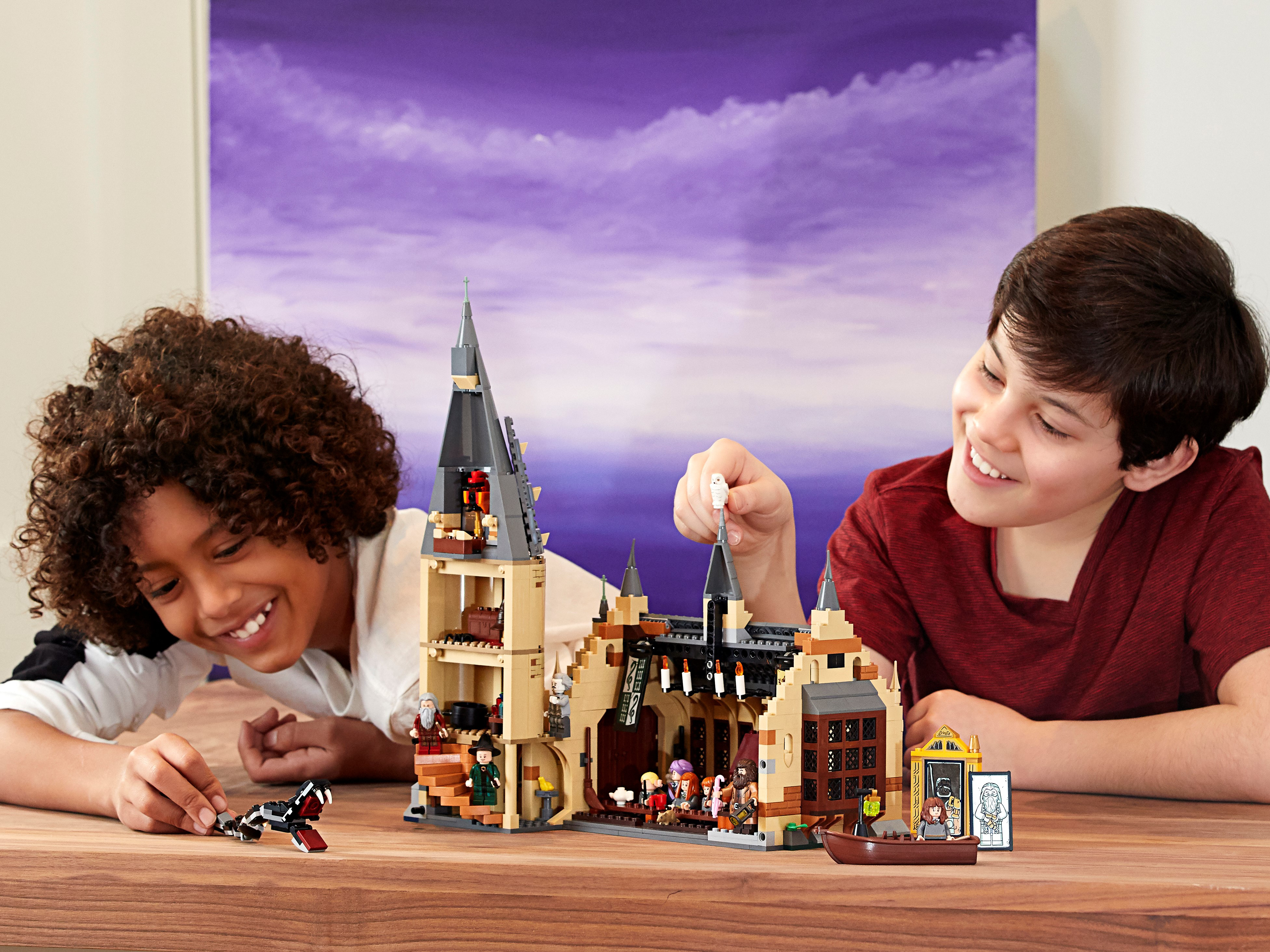 Build and recreate a magical fantasy realm from the Harry Potter™ movies with this detailed 4-level LEGO® 75954 Hogwarts™ Great Hall Harry Potter building kit, featuring a fireplace, benches, tables and reversible house banners, plus the Grand Staircase tower with a spiral staircase, potions room, treasure room, sorting hat, Mirror of Erised™ and lots of magical artifact accessory elements. This fantasy role-playing castle toy includes 10 minifigures and buildable Basilisk and Fawkes™ creatures, plus Hedwig™ and Scabbers™ figures.