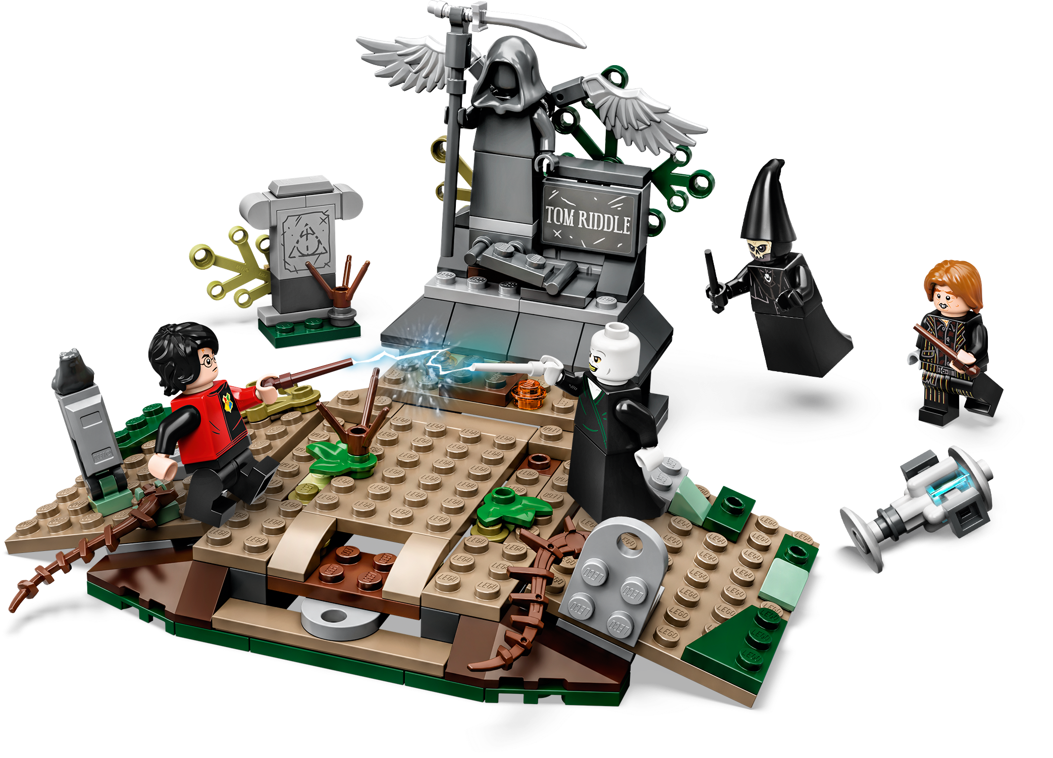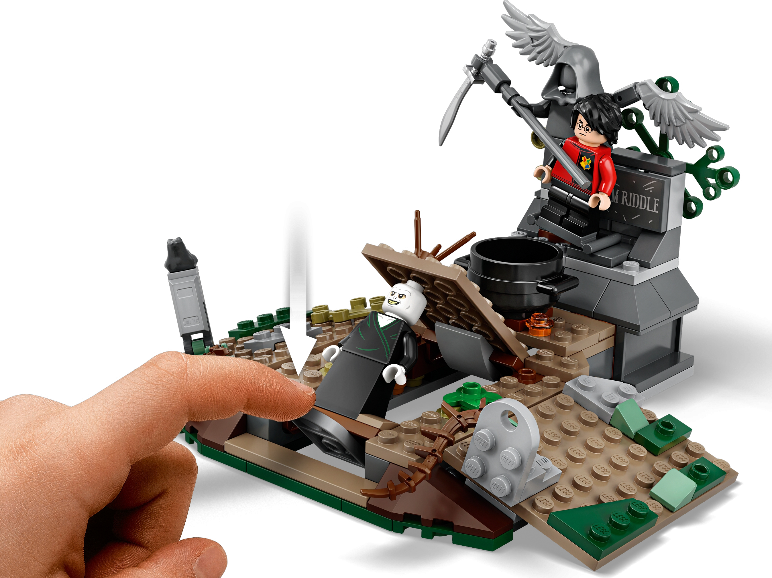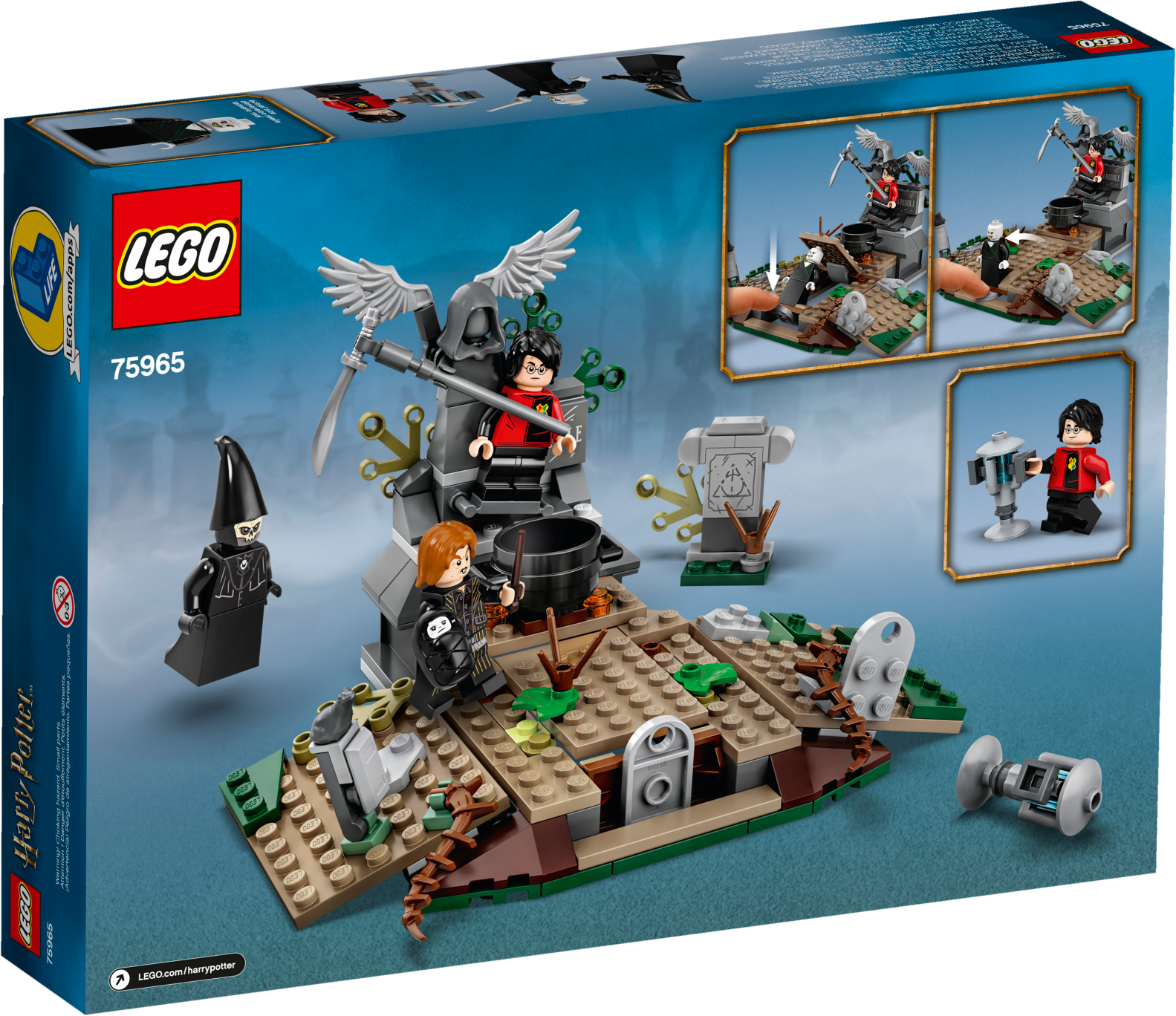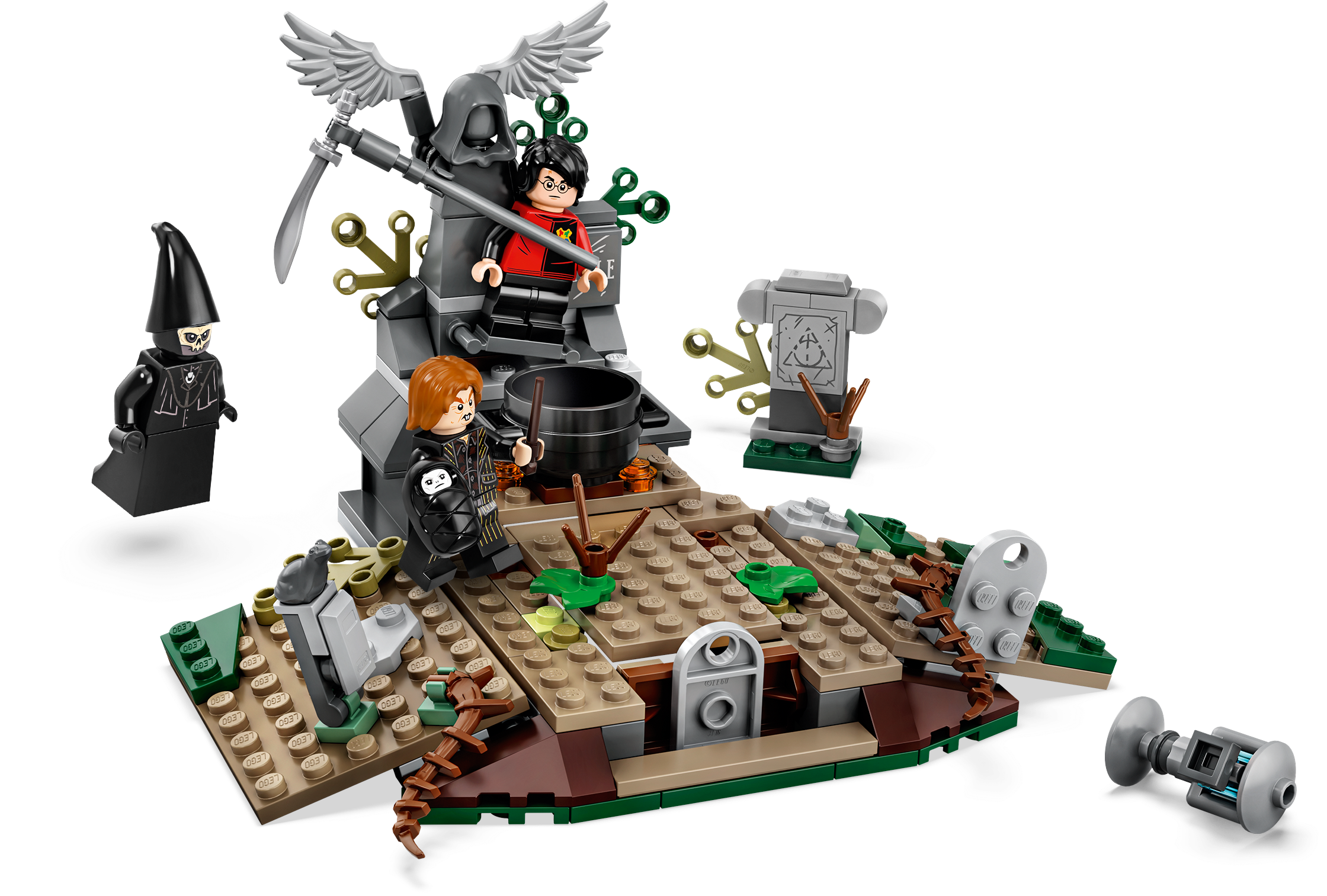 There’s magic, adventure and action with LEGO® Harry Potter™ 75965 The Rise of Voldemort™. In this iconic scene from Harry Potter and the Goblet of Fire™, Harry is trapped on Tom Riddle’s tombstone in a spooky graveyard while the deceitful Peter Pettigrew mixes a potion. Voldemort magically appears with the pull of a brick lever and summons a Death Eater™. After releasing Harry from the tombstone, they start to duel. This awesome gift for kids is full of spells, surprises and spectacular battles—so young witches and wizards will need all their Defense Against the Dark Arts skills to help Harry escape! Includes 4 minifigures: Harry Potter™ with wand and Triwizard Challenge outfit, Lord Voldemort™ with wand, Peter Pettigrew with wand and a Death Eater™. This building set for kids features the Little Hangleton graveyard from Harry Potter™ and the Goblet of Fire™ with tombstones and vegetation. Pull the brick lever to raise the Voldemort™ figure from a hidden compartment beneath the ground into an upright position. Accessories include a cauldron, bone, dagger and the Triwizard Cup. This LEGO® Harry Potter ™ set measures over 3” (10cm) high, 6” (17cm) wide and 5” (14cm) deep.