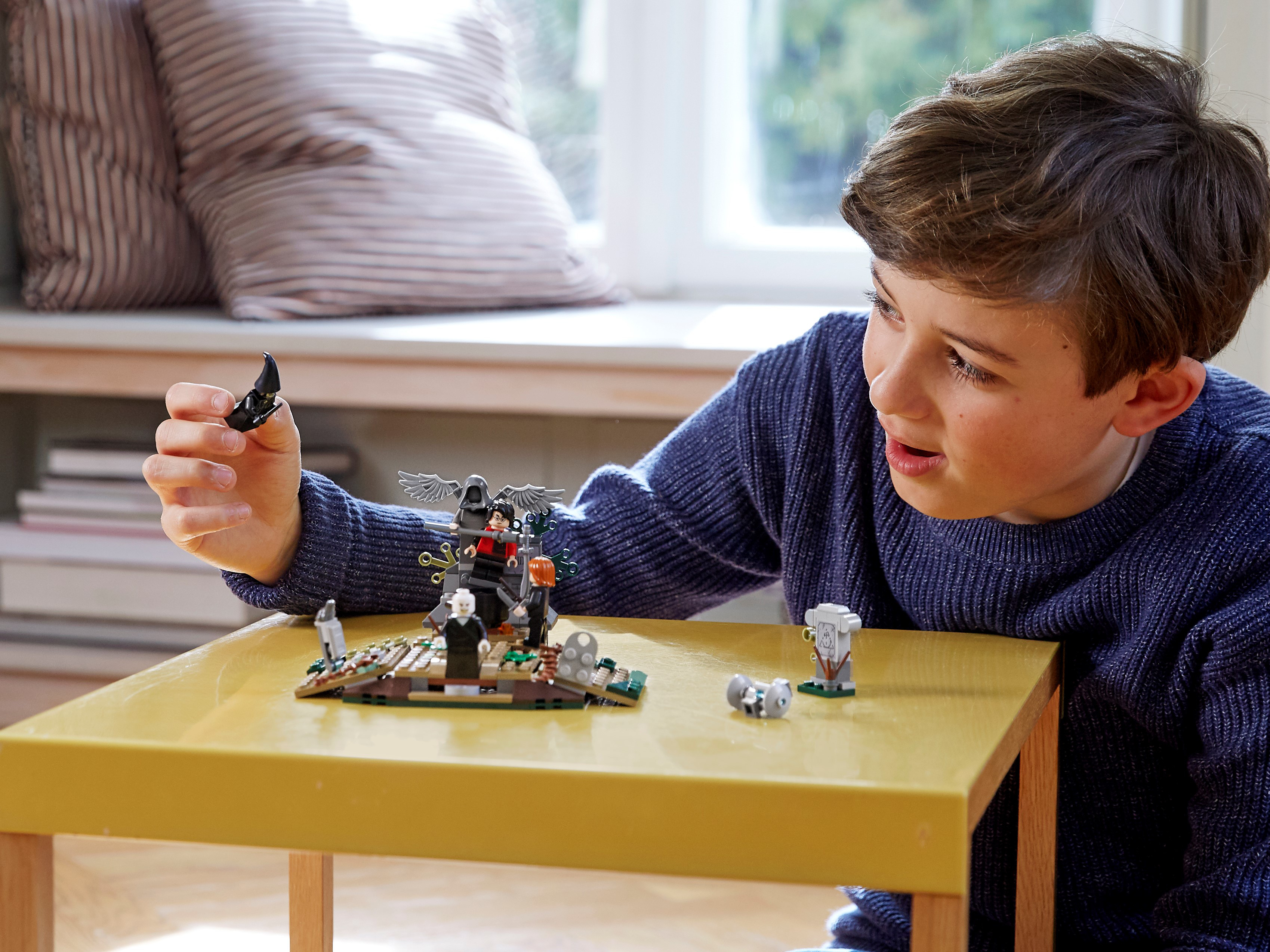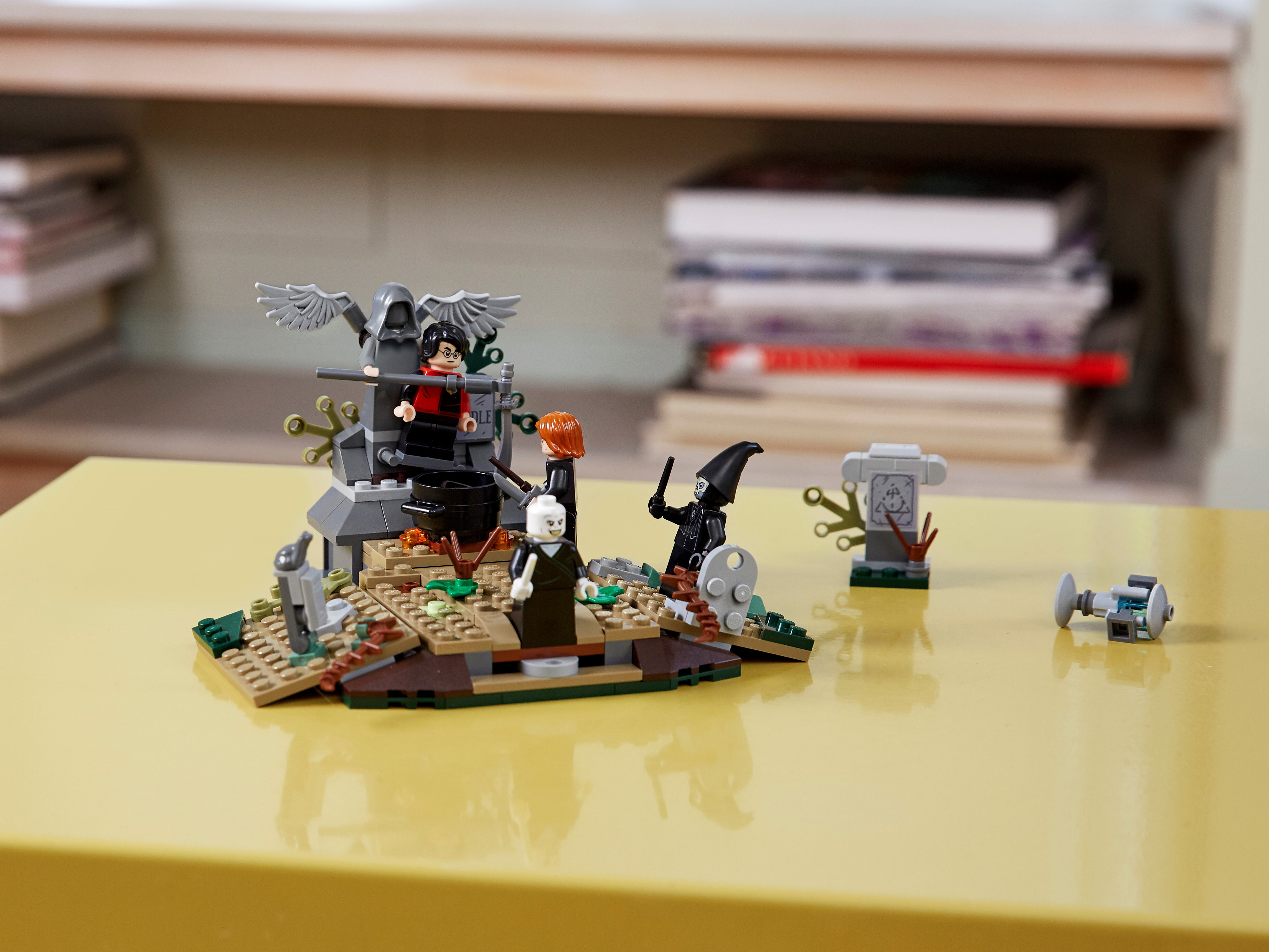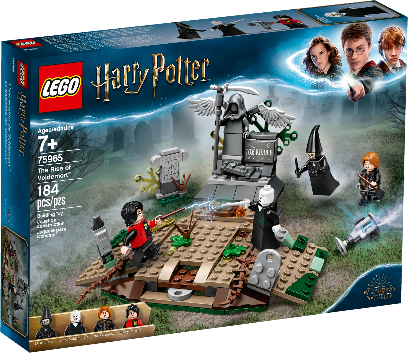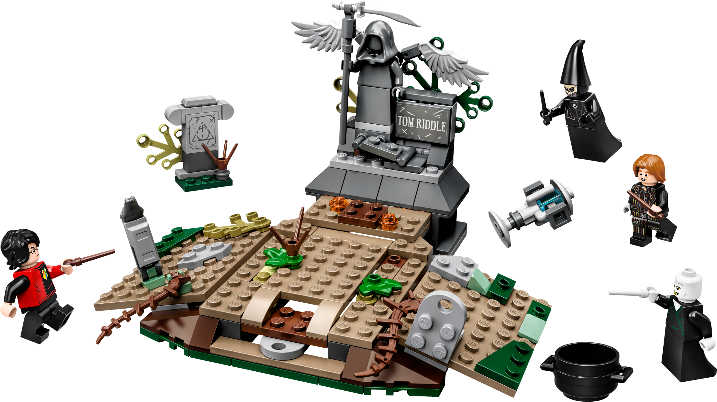 There’s magic, adventure and action with LEGO® Harry Potter™ 75965 The Rise of Voldemort™. In this iconic scene from Harry Potter and the Goblet of Fire™, Harry is trapped on Tom Riddle’s tombstone in a spooky graveyard while the deceitful Peter Pettigrew mixes a potion. Voldemort magically appears with the pull of a brick lever and summons a Death Eater™. After releasing Harry from the tombstone, they start to duel. This awesome gift for kids is full of spells, surprises and spectacular battles—so young witches and wizards will need all their Defense Against the Dark Arts skills to help Harry escape! Includes 4 minifigures: Harry Potter™ with wand and Triwizard Challenge outfit, Lord Voldemort™ with wand, Peter Pettigrew with wand and a Death Eater™. This building set for kids features the Little Hangleton graveyard from Harry Potter™ and the Goblet of Fire™ with tombstones and vegetation. Pull the brick lever to raise the Voldemort™ figure from a hidden compartment beneath the ground into an upright position. Accessories include a cauldron, bone, dagger and the Triwizard Cup. This LEGO® Harry Potter ™ set measures over 3” (10cm) high, 6” (17cm) wide and 5” (14cm) deep.