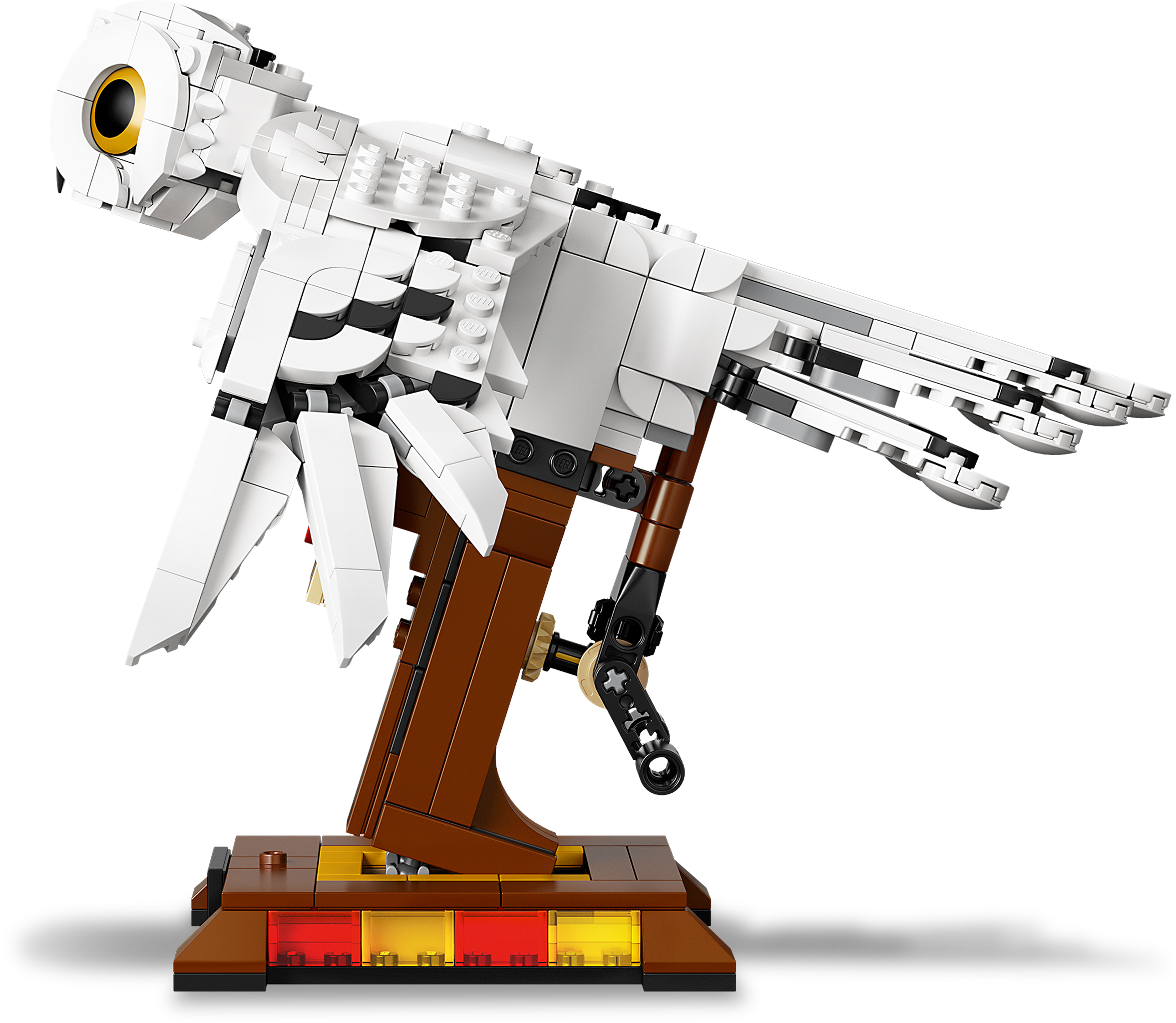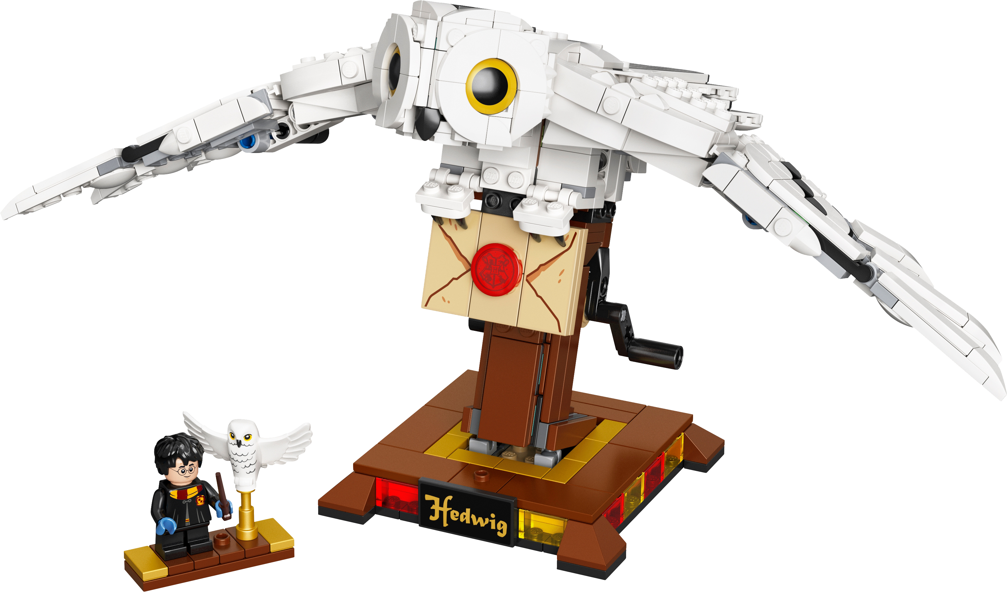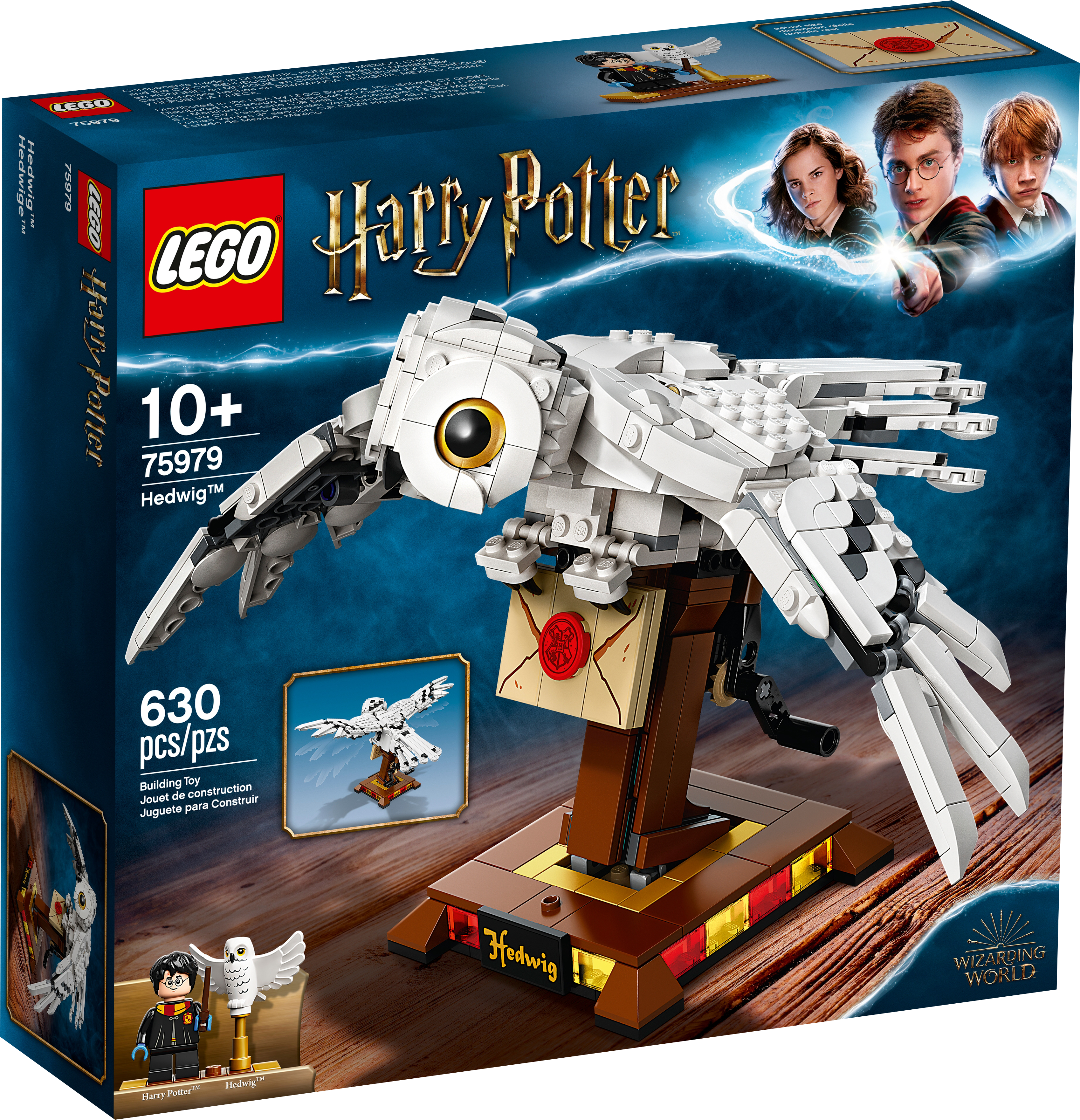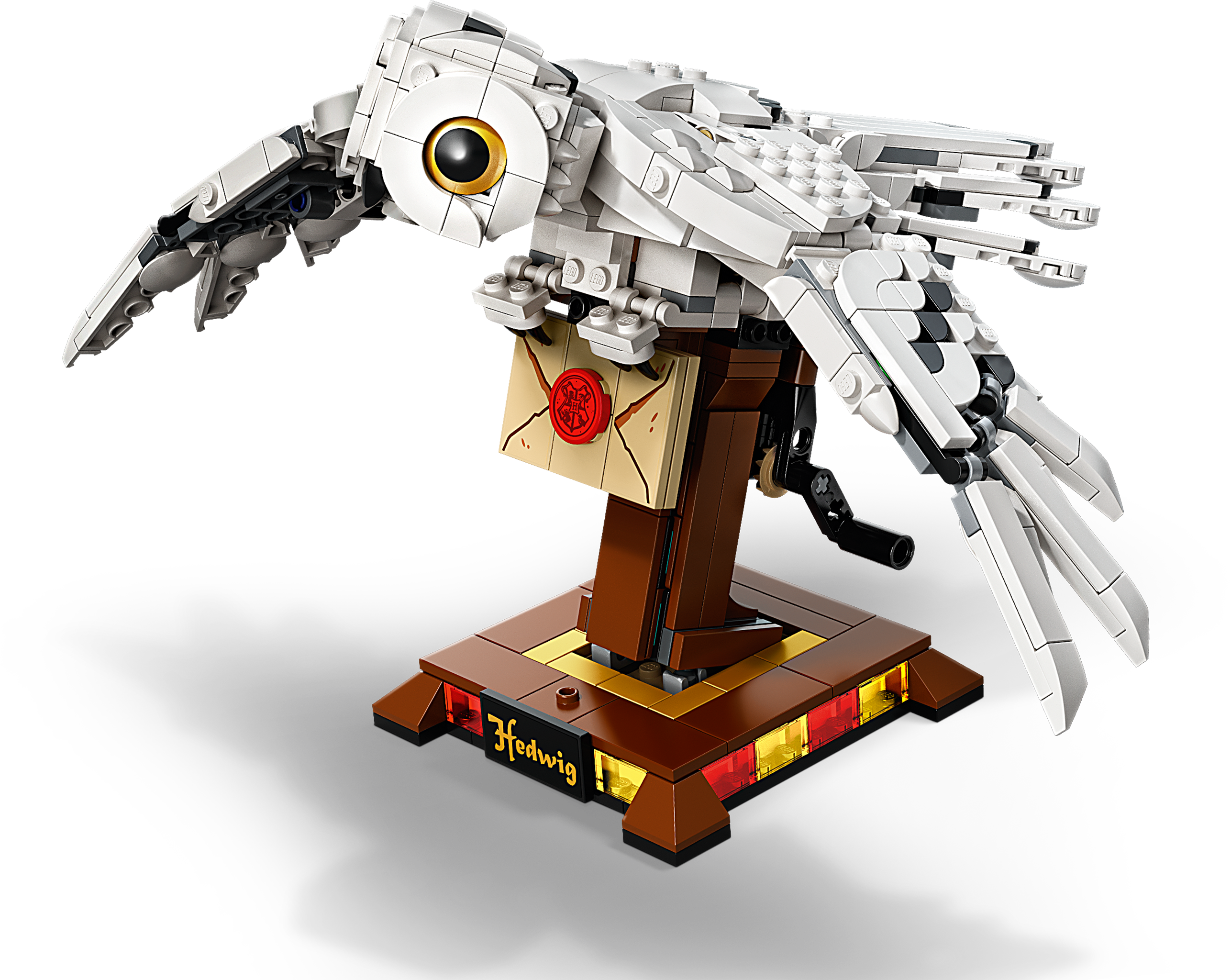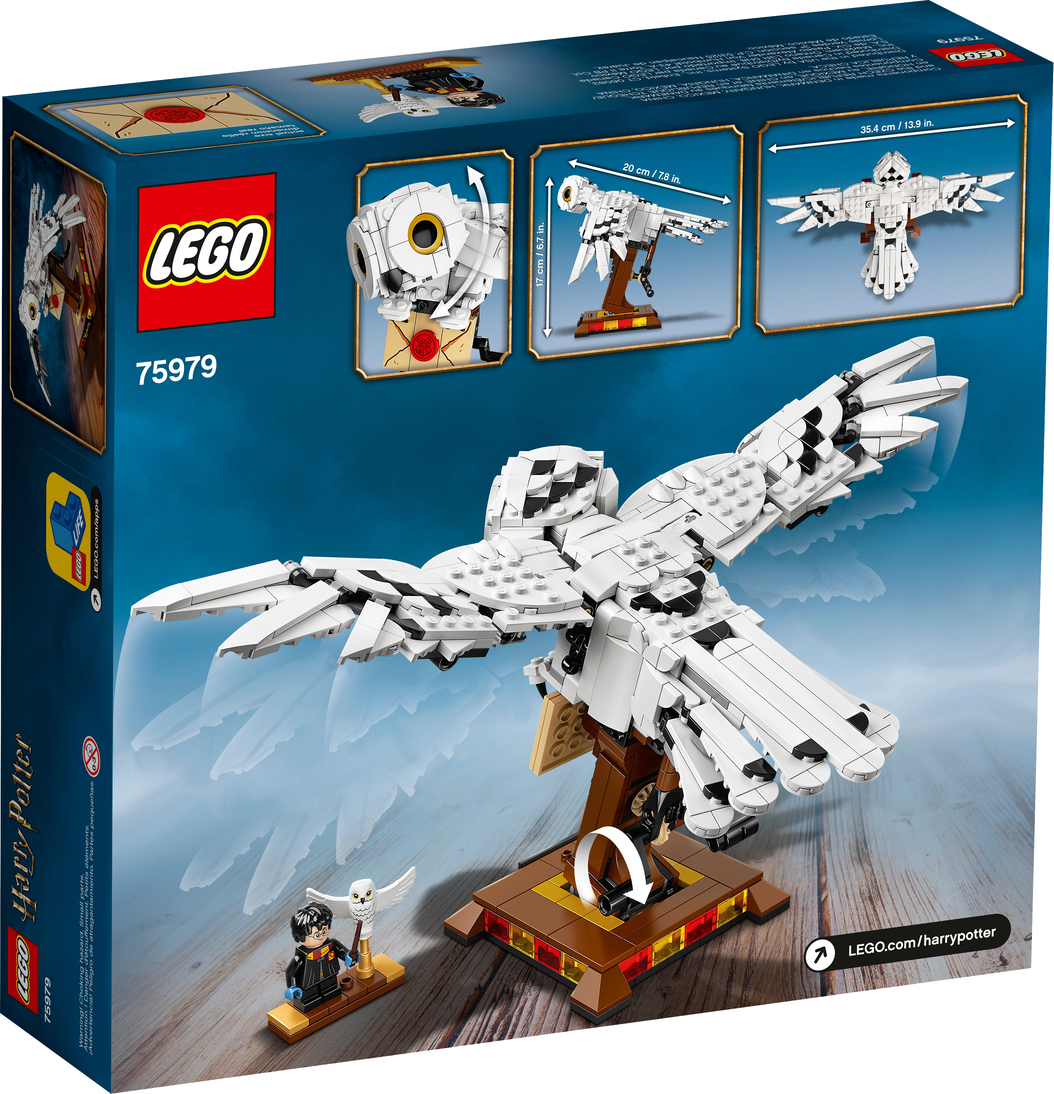 Bring the magical personality and elegant movement of Hedwig™, the celebrated snowy owl from the Harry Potter™ movies, to life. The collectible LEGO® Harry Potter Hedwig (75979) display toy offers a rewarding building experience and looks magnificent on show.Harry Potter™ fans will be captivated by the collectible LEGO® Hedwig™ (75979) toy. The model includes impressive detail and a mechanism that makes the jointed wings move gracefully up and down.This authentic toy shows Hedwig™ the snowy owl delivering an important letter from Hogwarts™. Also included is a detachable LEGO® Harry Potter™ minifigure and a mini Hedwig toy.The detailed model is displayed in flight. Turning the handle at the rear operates a mechanism that drives the toy's wings up and down, with the cleverly designed joints producing a realistic beating appearance.If you’re looking for a cool Harry Potter™ gift for kids or a building challenge that will appeal to LEGO® fans of any age, this Hedwig the owl toy is an ideal Christmas or birthday present for anyone aged 10 and up.With a wingspan of over 13” (34cm) and a beak-to-tail measurement of over 7” (20cm), this mechanical Hedwig™ collectible LEGO® set makes an impressive display that is sure to be the center of attention.This LEGO® Harry Potter™ set doesn’t need any batteries. The moving wings are powered purely by a hand-turned mechanism at the rear of the toy.Clear instructions ensure the construction process is problem-free, delivering a rewarding building experience and a feeling of great satisfaction on seeing the result.For a perfect gift for any fan of the movies, the range of LEGO® Harry Potter™ building sets bring memorable scenes to life as cool, collectible, popular toysthat put the magic in kids’ hands.All LEGO® buildable toys meet the highest global industry standards, ensuring all components are consistent, compatible and connect and pull apart easily every time – no magic required!LEGO® bricks and pieces are dropped, heated, crushed, twisted and analyzed to ensure every building set meets the world's foremost safety standards.