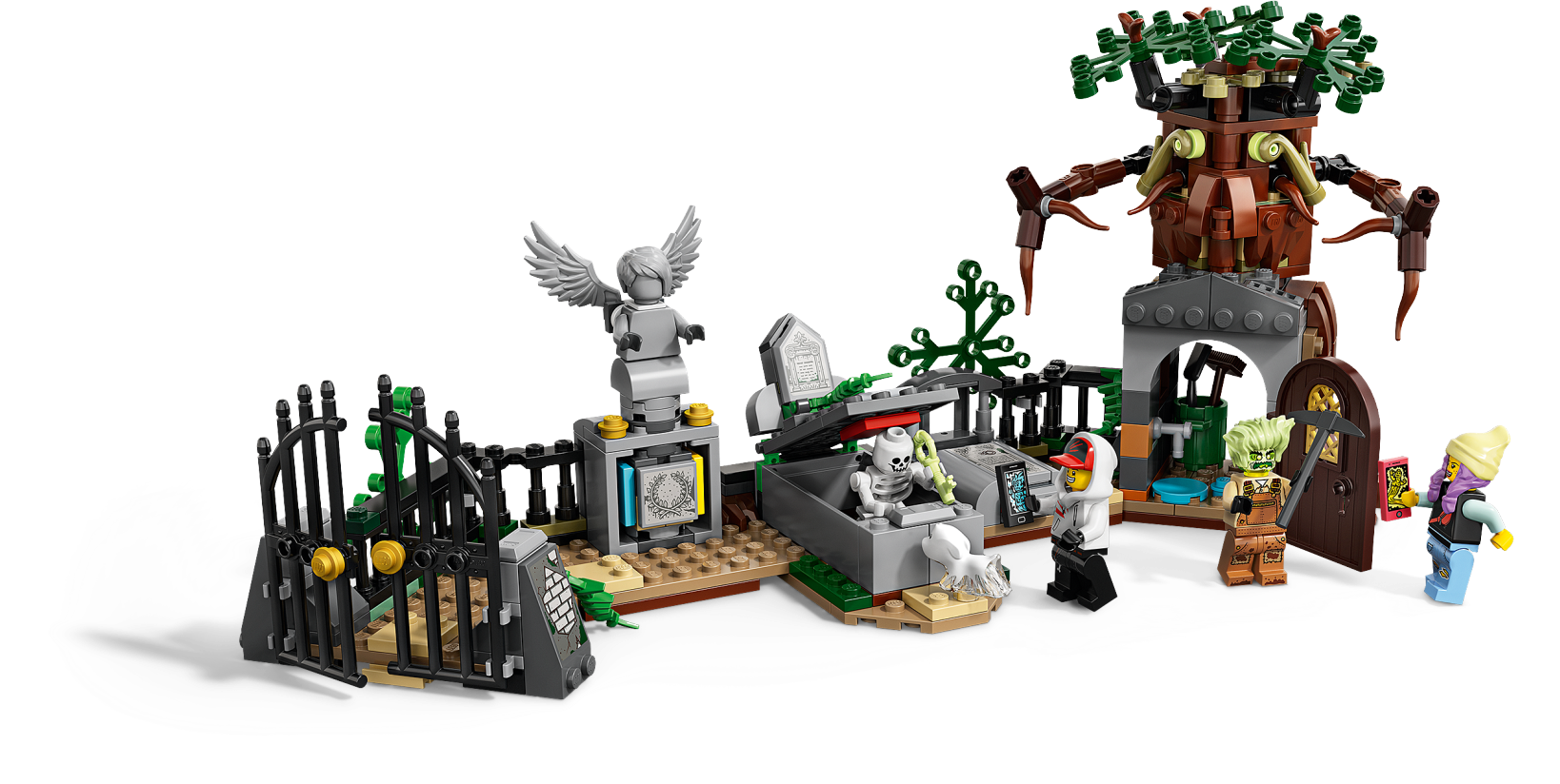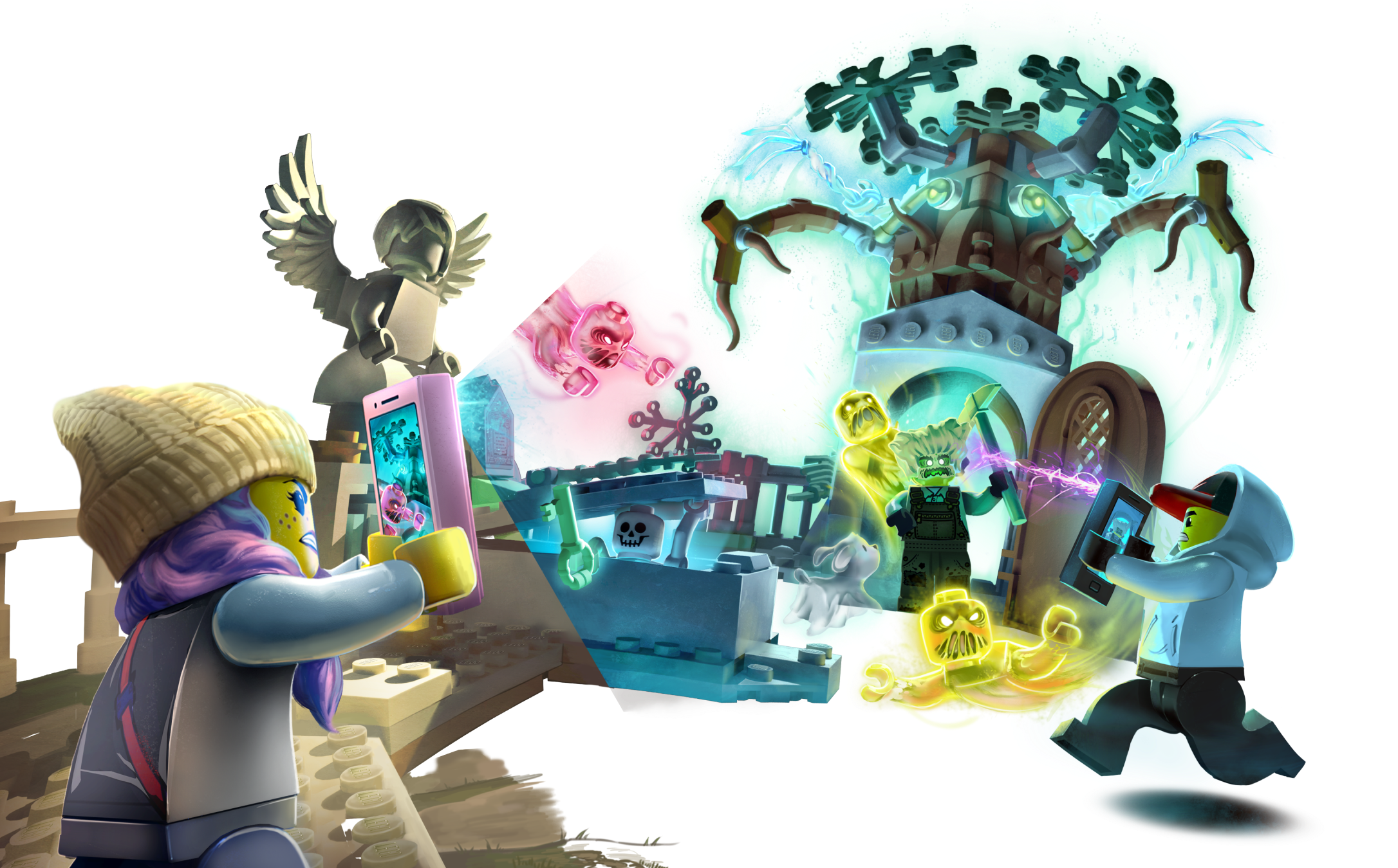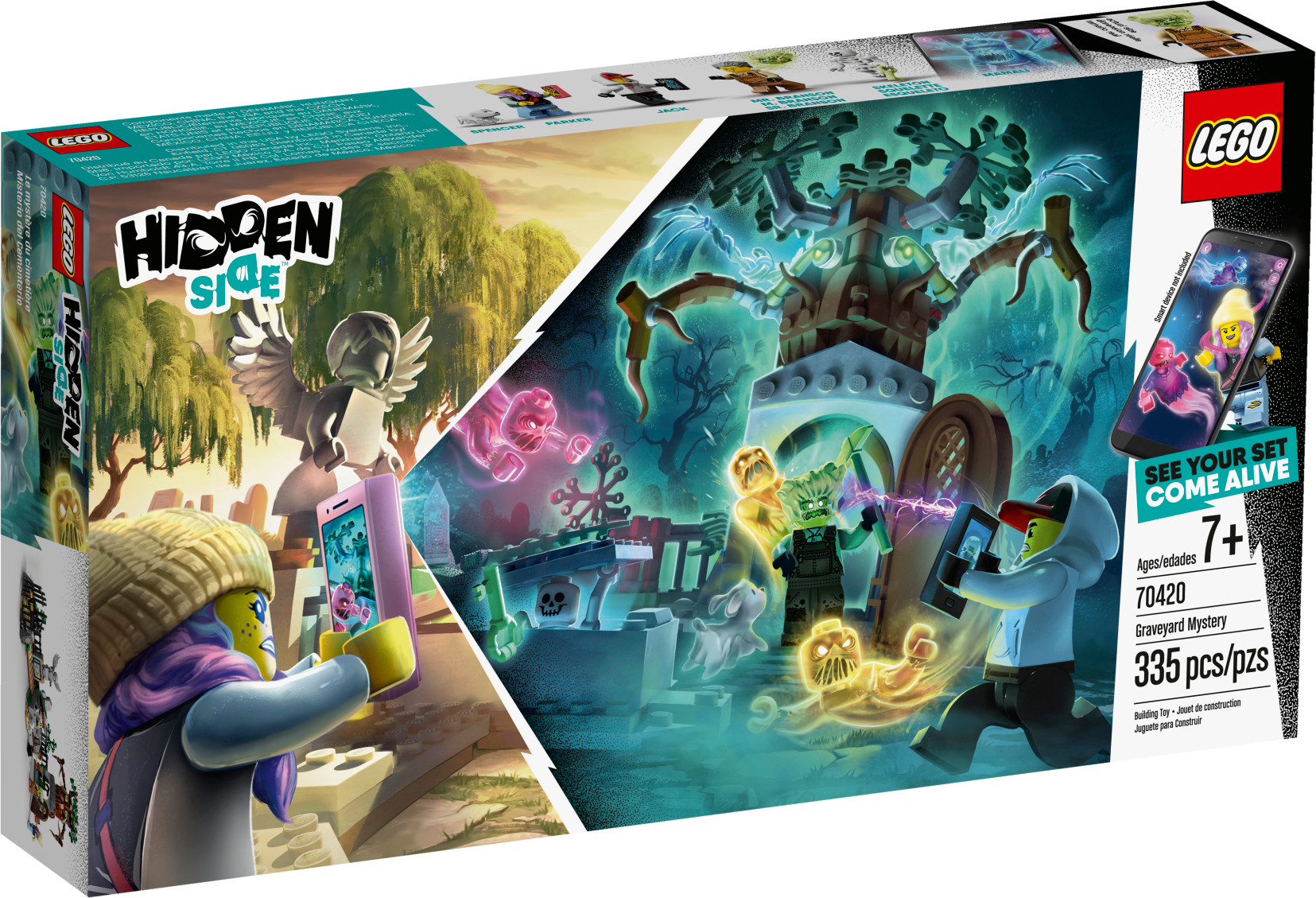 Kids can experience fun ghost-catching adventures combining an augmented reality play experience with this LEGO® Hidden Side™ 70420 Graveyard Mystery playset. This awesome app toy combines a buildable LEGO model with augmented reality for kids to deliver a fully interactive play experience. Download the Hidden Side app and scan the model with a phone to make it come alive. With continuous updates, a unique boss ghost to battle in each set, new mysteries to solve, cool items to find, games to play and ghosts to collect, this LEGO Hidden Side set gives kids a whole new way to play and interact with building bricks! Packed with cool graveyard details, this toy construction set features a dog figure, gardener figure, girl and boy minifigures, a twistable statue, grave that opens and a haunted tree with posable arms for lots of fun ghost-hunting adventures. Download the LEGO® Hidden Side™ app and point your phone at the Graveyard Mystery playset to make this building set for kids come alive and reveal the Hidden Side. Move the phone around to discover an ever-changing environment hidden around the model. This augmented reality toy includes 4 minifigures: heroes Jack Davids and Parker L. Jackson, a skeleton figure and Mr. Branson, plus Davids's ghost dog figure, Spencer, to pretend play the ghost-catching play in this graveyard toy and in the AR app. This Graveyard Mystery unique toy features a tombstone statue that twists, grave that open and a haunted toy tree with posable arms. Set in the fictional town of Newbury, where ghosts haunt people and buildings, LEGO® Hidden Side™ playsets let kids play out exciting ghost-hunting adventures that combine physical LEGO models with fully-interactive augmented reality. Build and play with the physical set and then bring it to life as you interact with the set while viewing it through the app. Using the LEGO® Hidden Side™ app is like looking through a window to a cool and spooky Hidden Side filled with challenging mysteries to solve, ghosts to defeat and unique ghost bosses, like Mamali, to overcome in each set. To get the full augmented reality experience, a tablet or mobile phone is required, but not included. Compatible with selected iOS and Android devices. Check compatibility at www.LEGO.com/devicecheck. Children should ask permission before going online. Graveyard measures over 5” (14cm) high, 12” (32cm) wide and 3” (10cm) deep