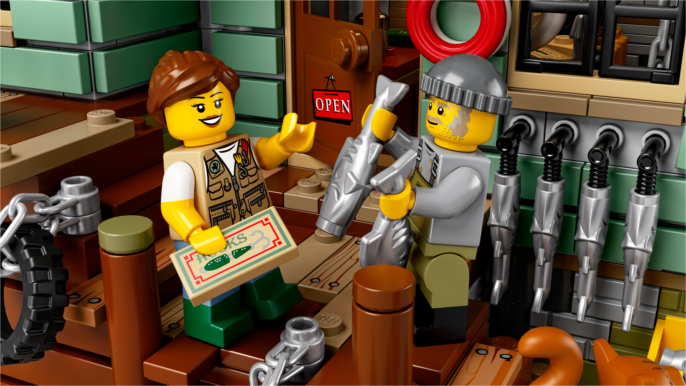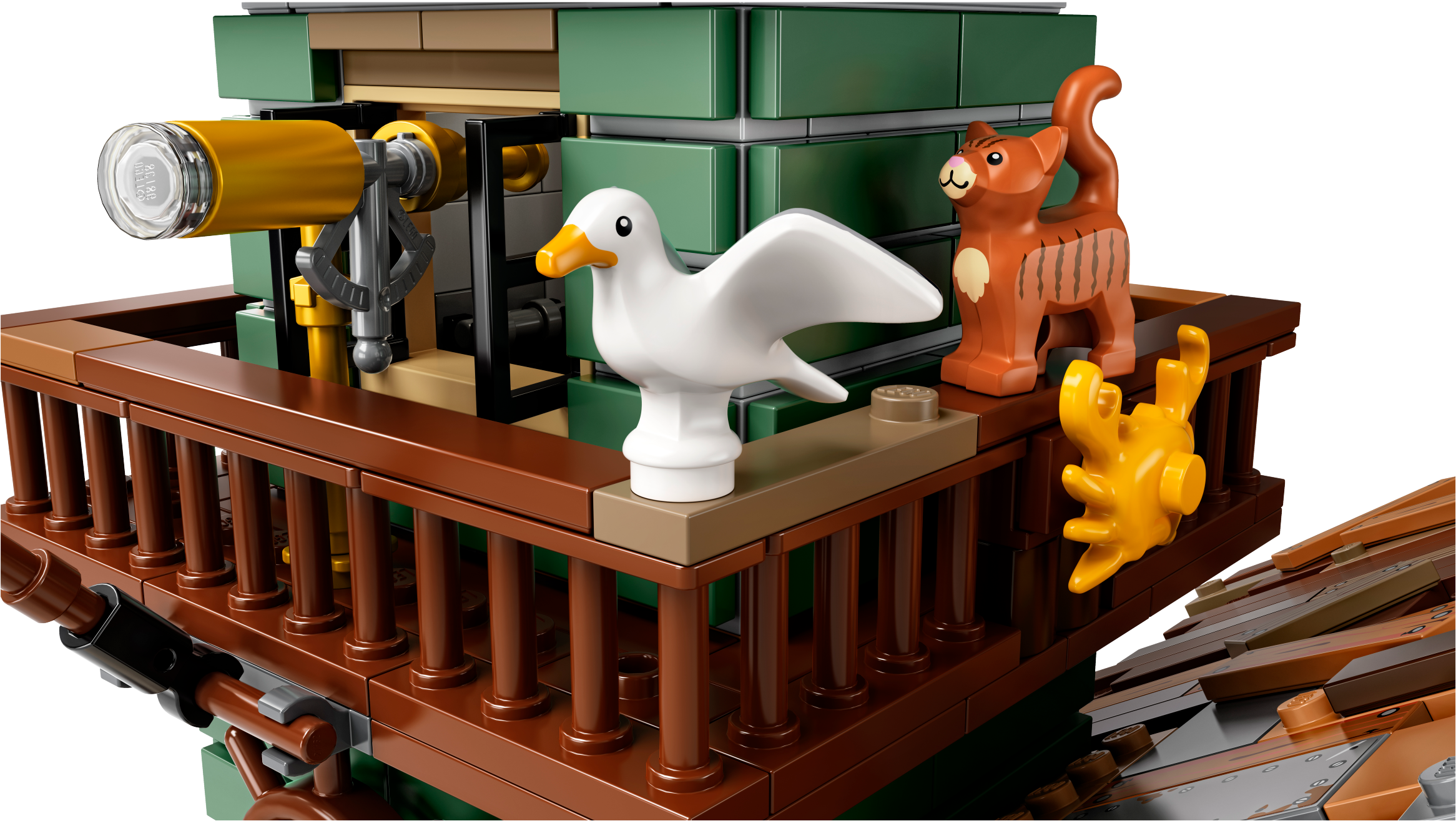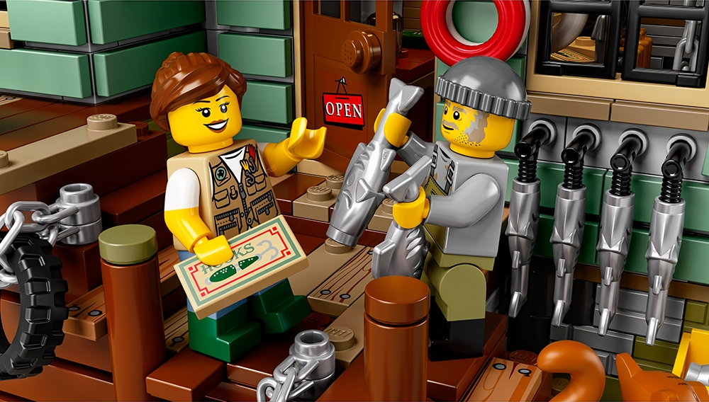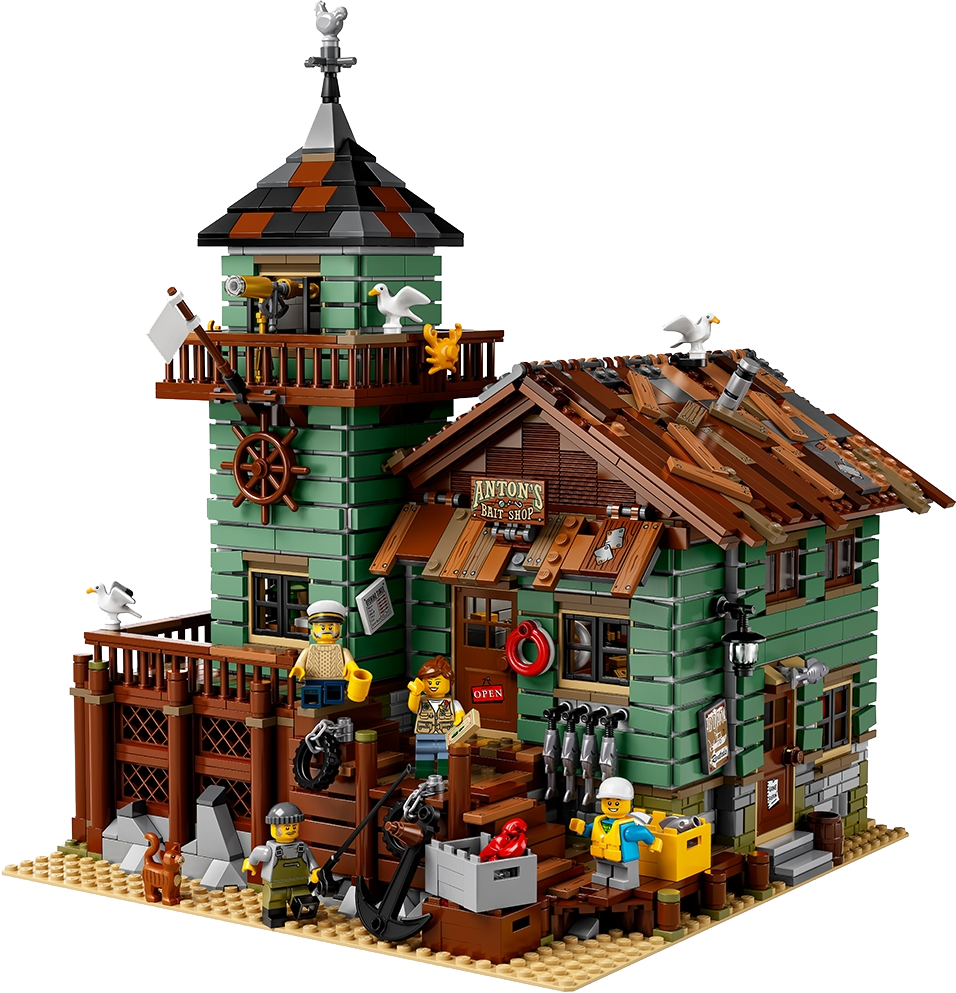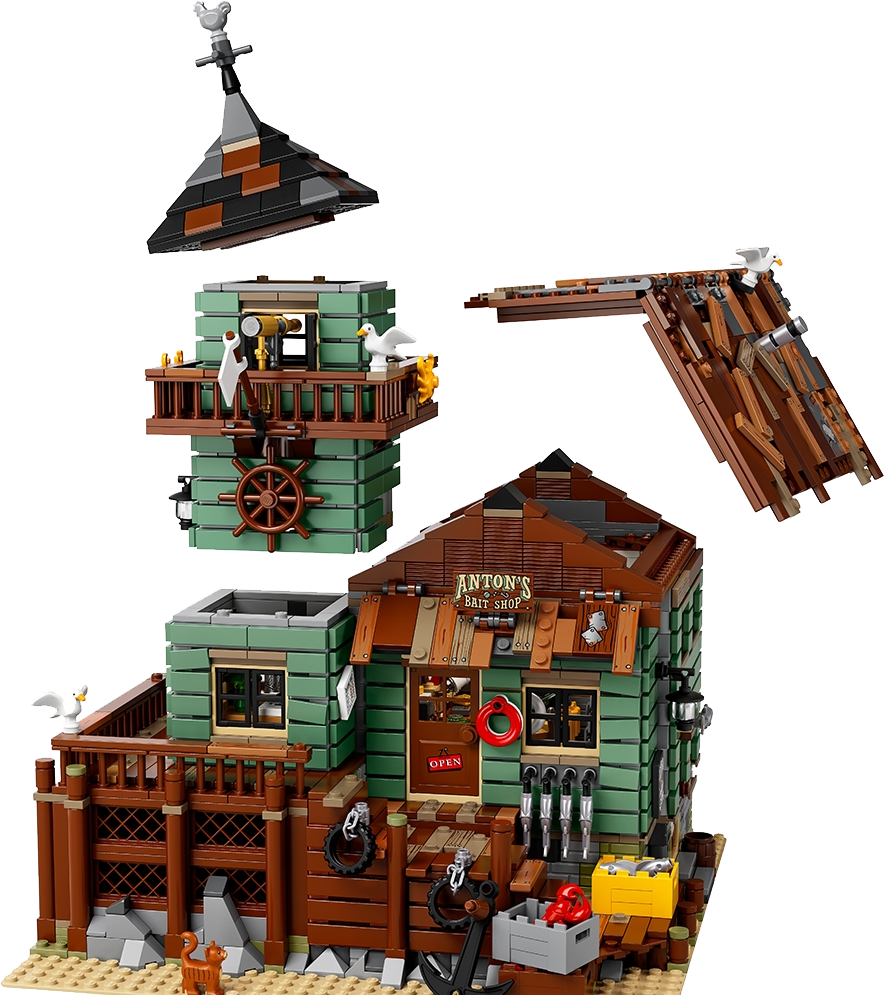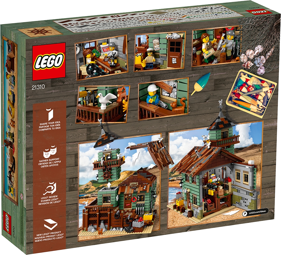 Visit the beachside Old Fishing Store, featuring a shop packed with fishing-themed elements, and a connected watchtower with a 360-degree viewing balcony and office on the lower level. Ideal for display and role-play, this model has 2 removable roofs, an opening back wall in the shop for easy access, 4 minifigures, cat and 3 seagull figures, as well as loads of other cool details and elements to fire up the imagination.