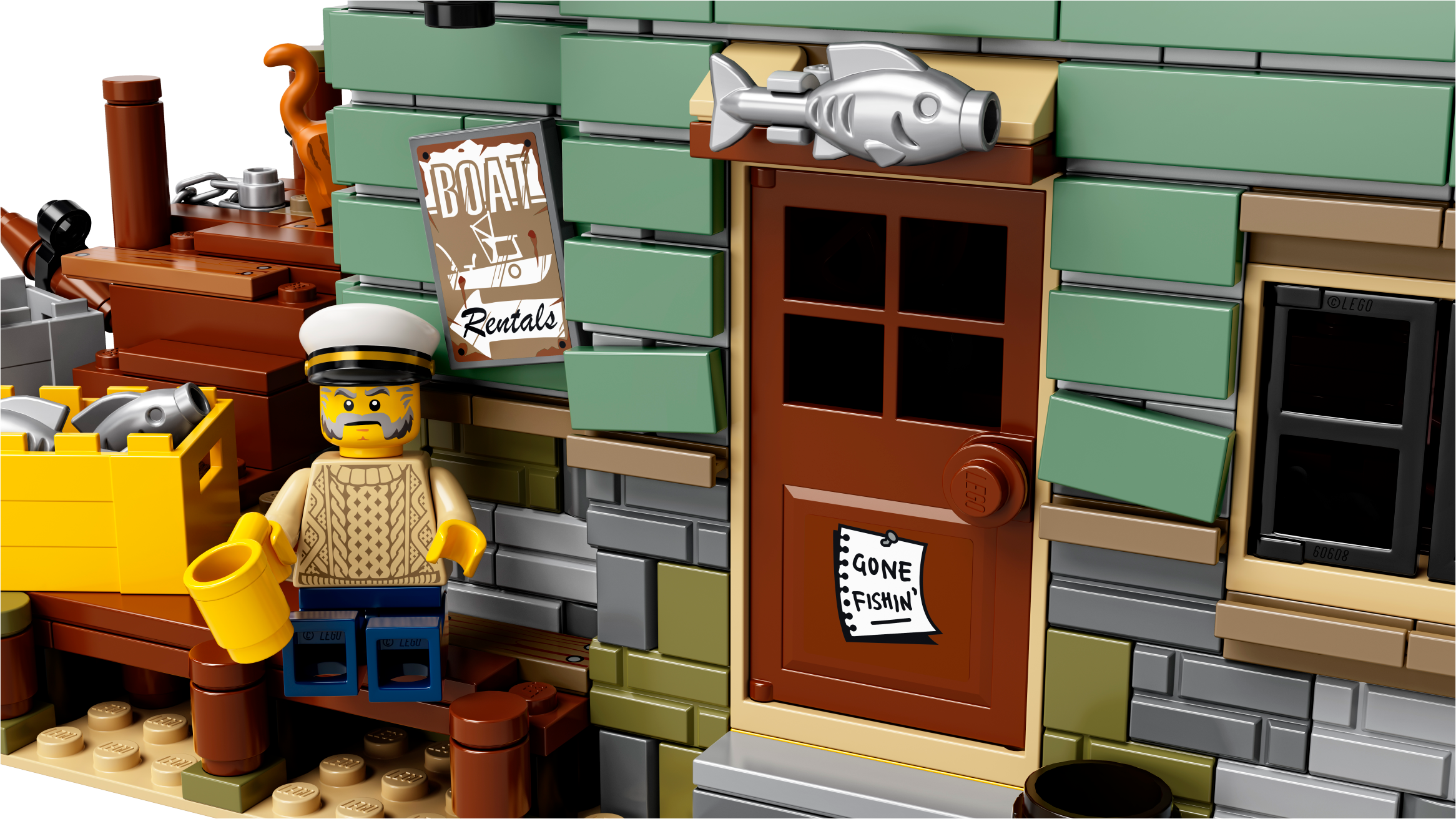 Includes 4 minifigures: a captain, fisherman, fisherwoman and a child, plus cat and 3 seagull figures.