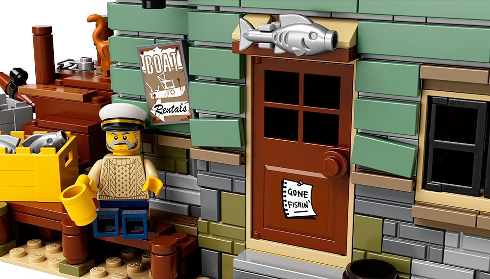 Old Fishing Store features a detailed exterior, shop and connected lookout tower with office, all standing on a sand-colored LEGO® 32x32 baseplate with rock-style elements.