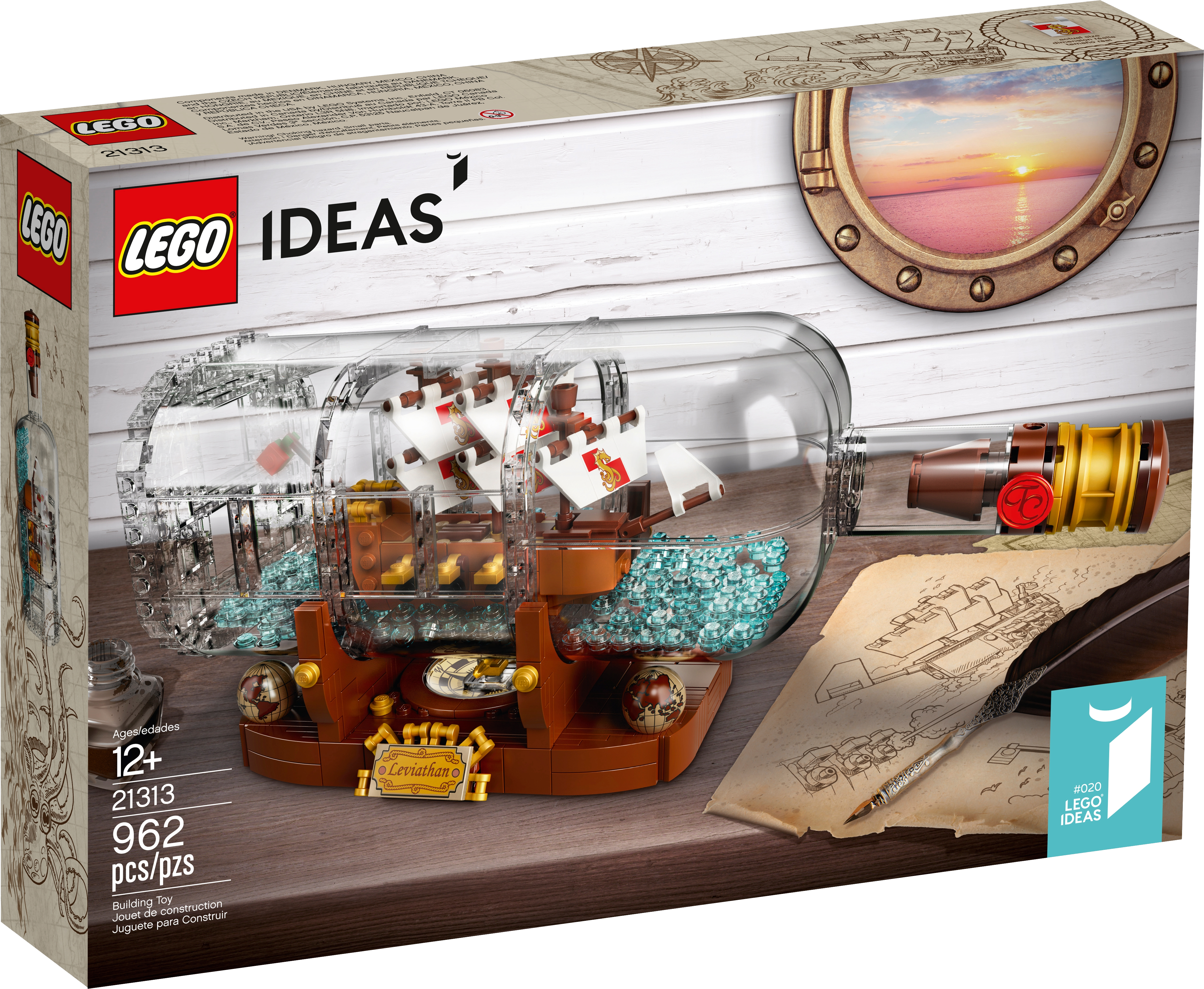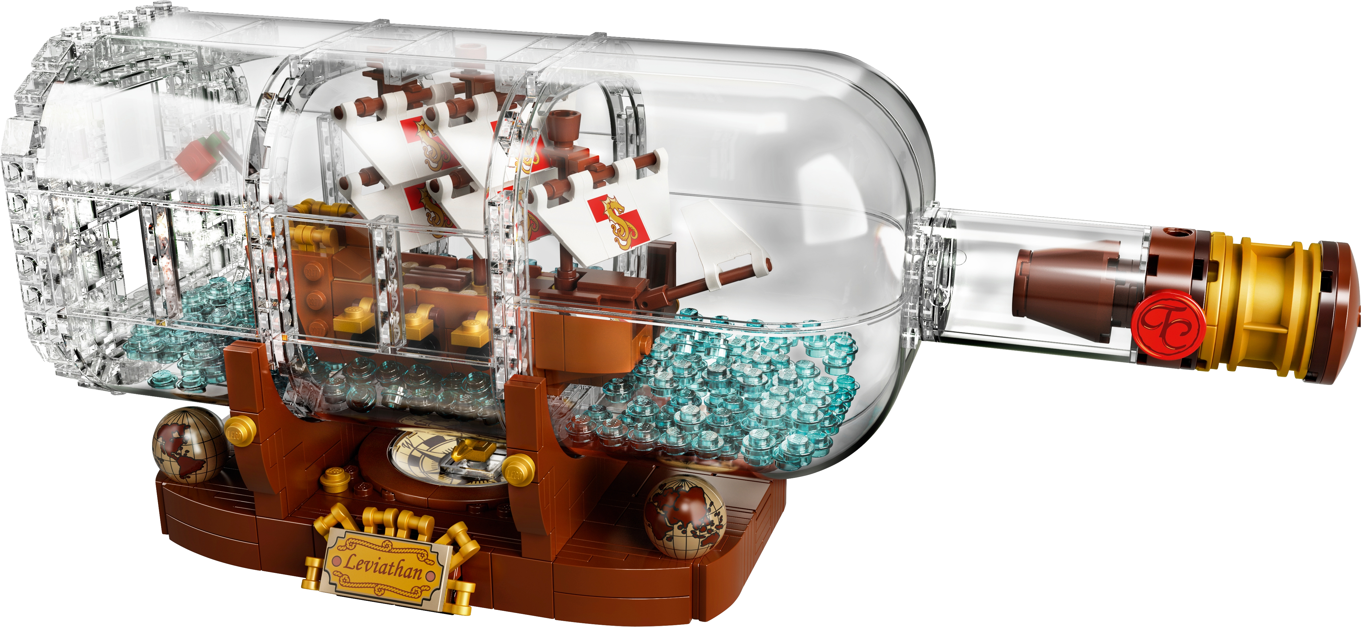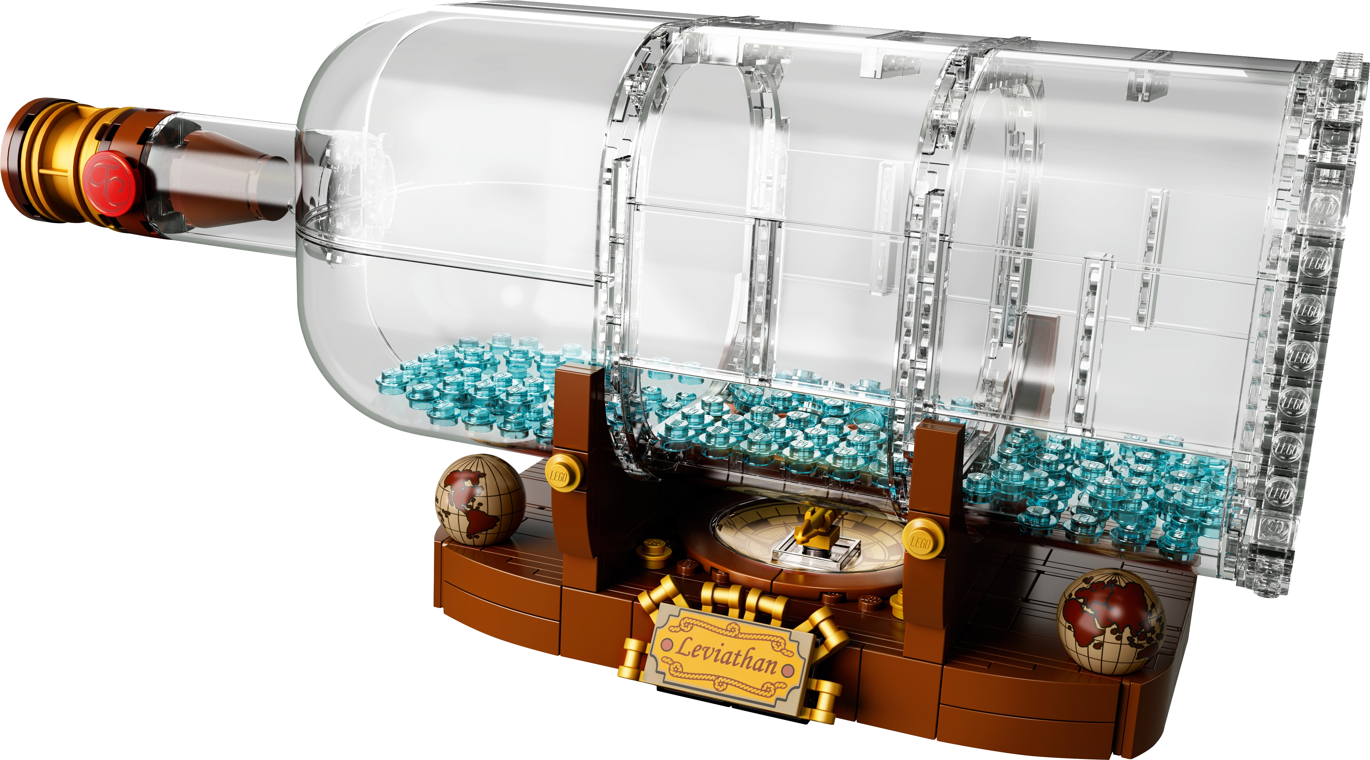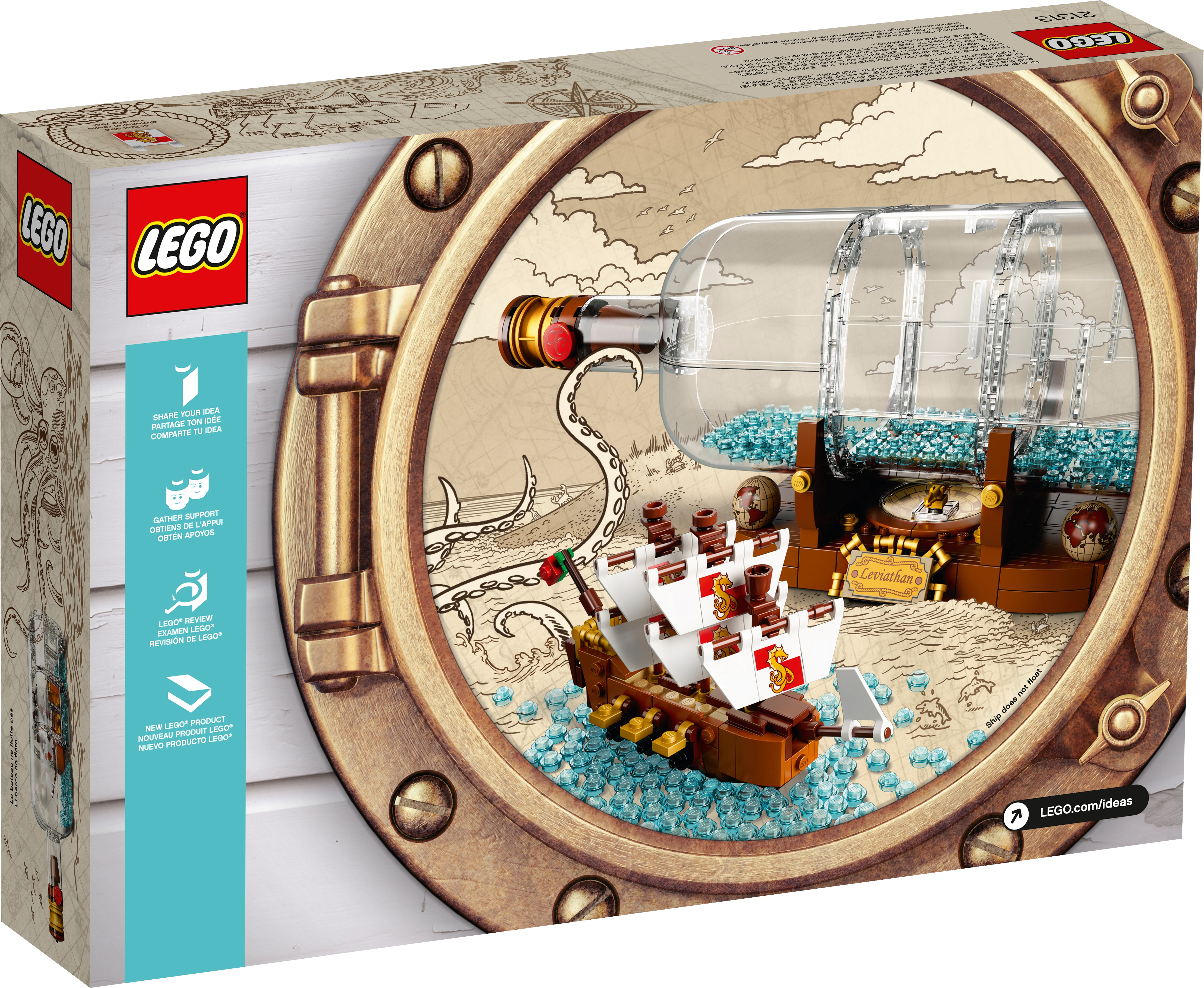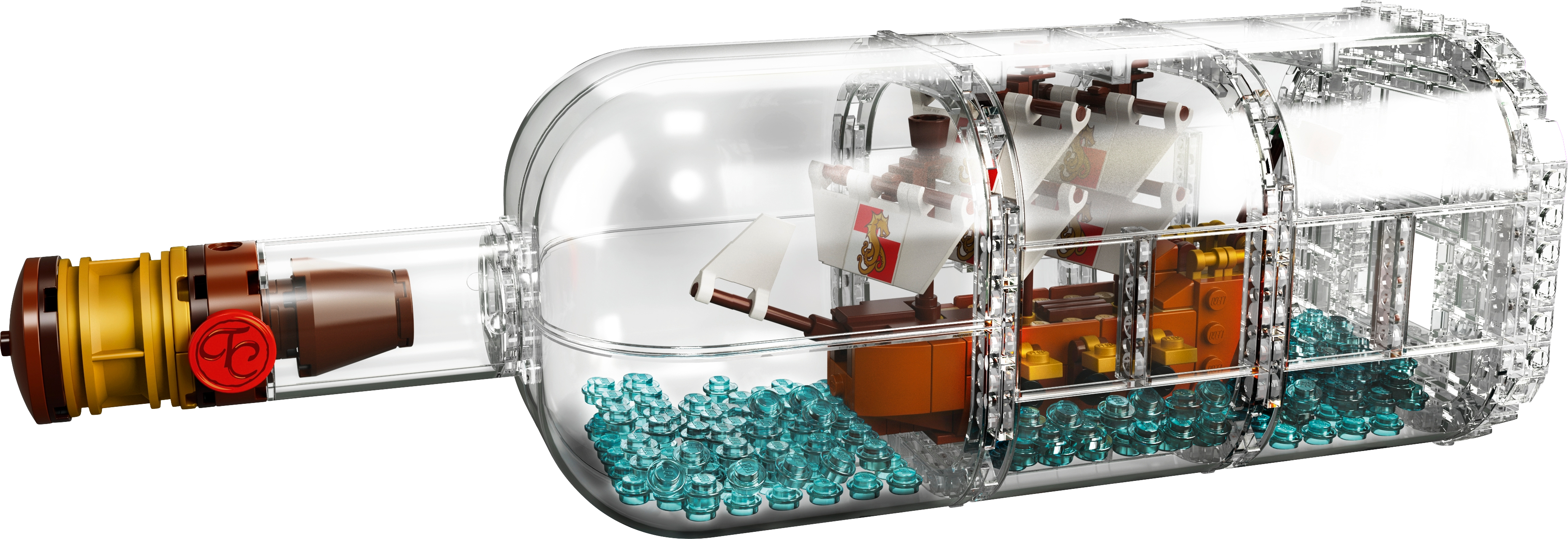 Features a LEGO® brick-built bottle, ship and a display stand.