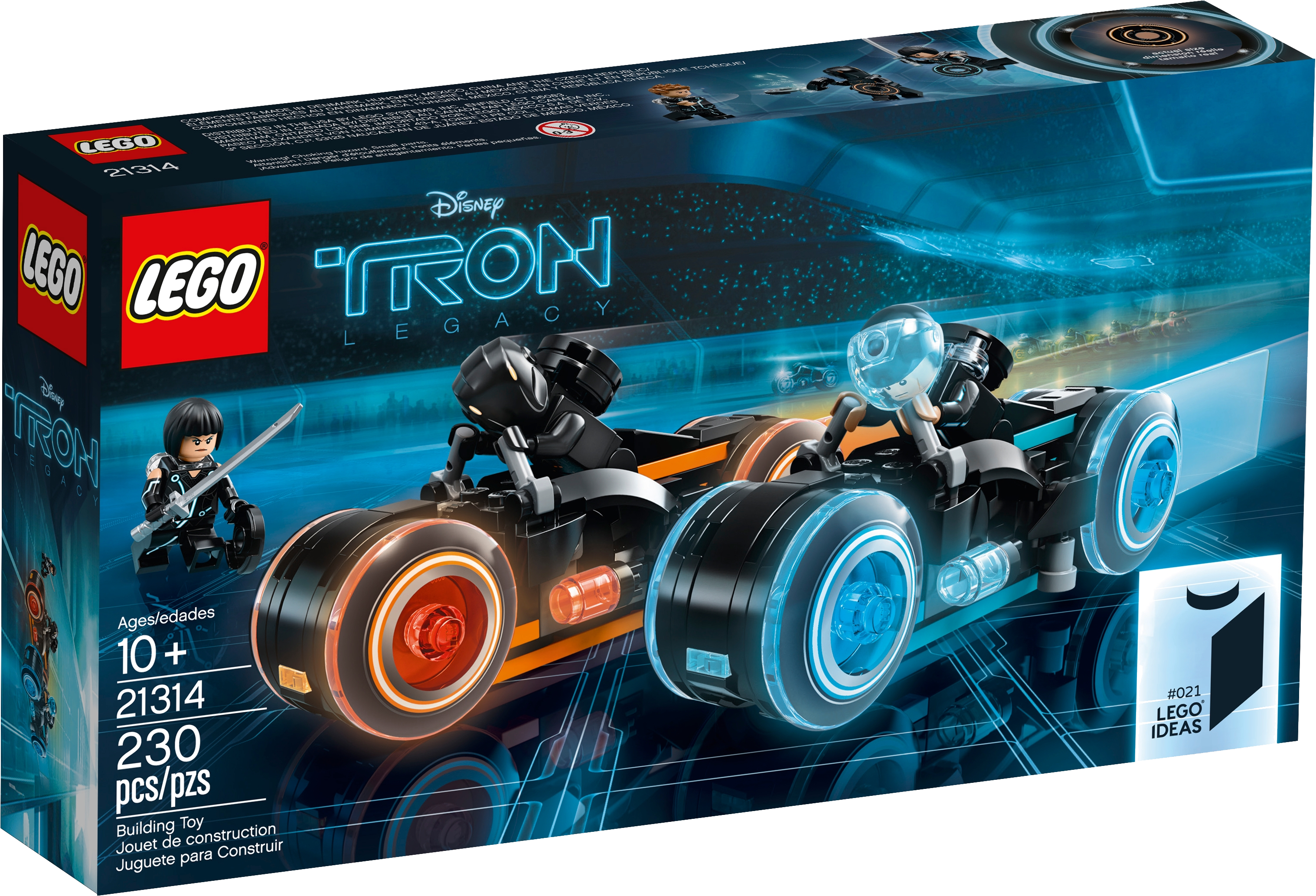 Build, play and display with this futuristic LEGO® Ideas 21314 TRON: Legacy set from Disney, featuring 2 Light Cycles, each with minifigure seats and translucent-colored light-style elements, plus a divisible TRON grid with attachment points for the vehicles. Use the grid as a display base for the Light Cycles or split it in 2 to recreate the chase scene from Disney's TRON: Legacy movie. Alternatively, stage an Identity Disc battle between the 3 included LEGO minifigures—Sam Flynn, Quorra and Rinzler—on the grid. This construction toy includes a booklet with information about its fan creator and LEGO designers, plus the lowdown on Disney’s TRON: Legacy movie and its main characters.