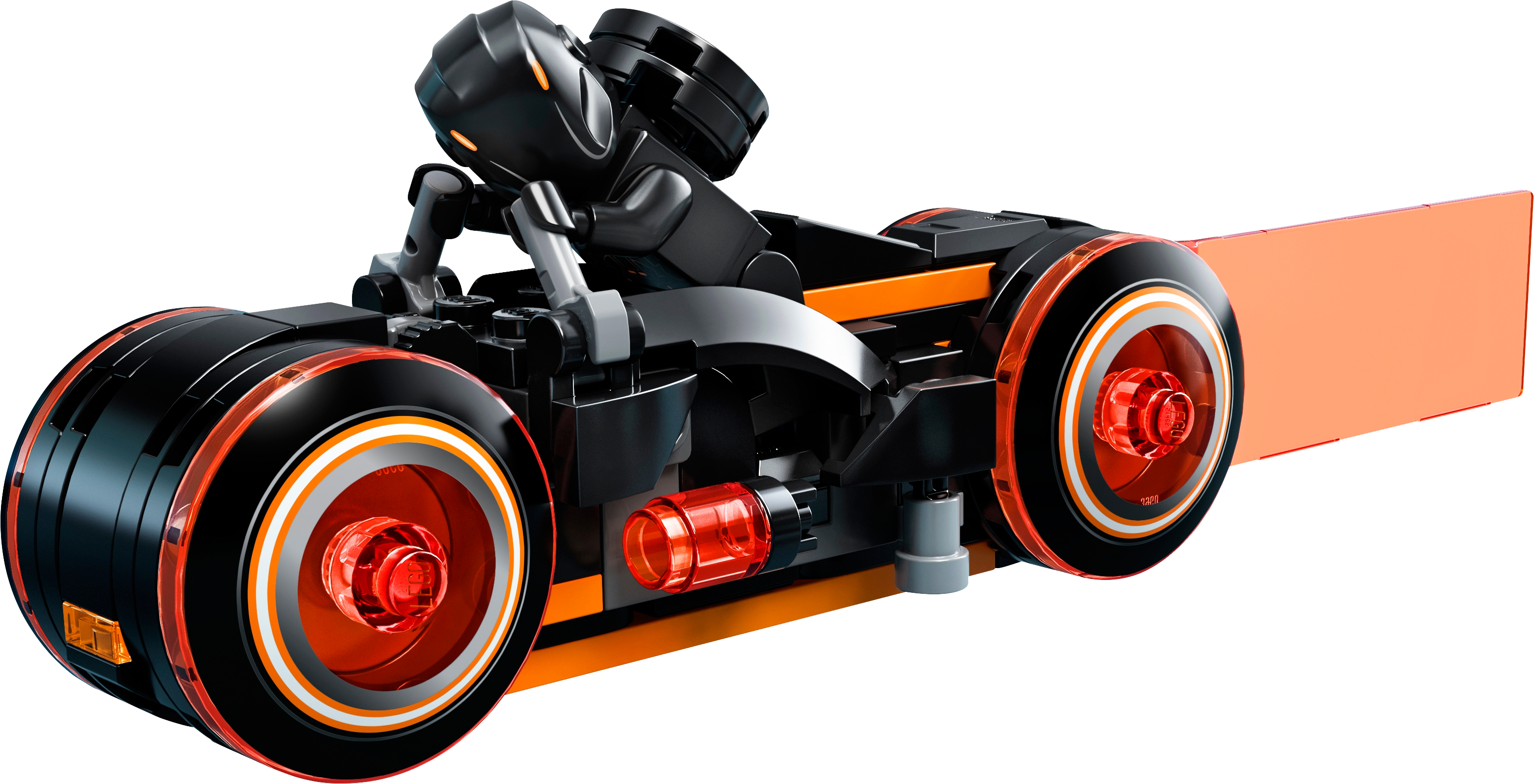 Rinzler's Light Cycle features a minifigure seat, authentic features and assorted translucent-orange light-style elements, including power stream effects.