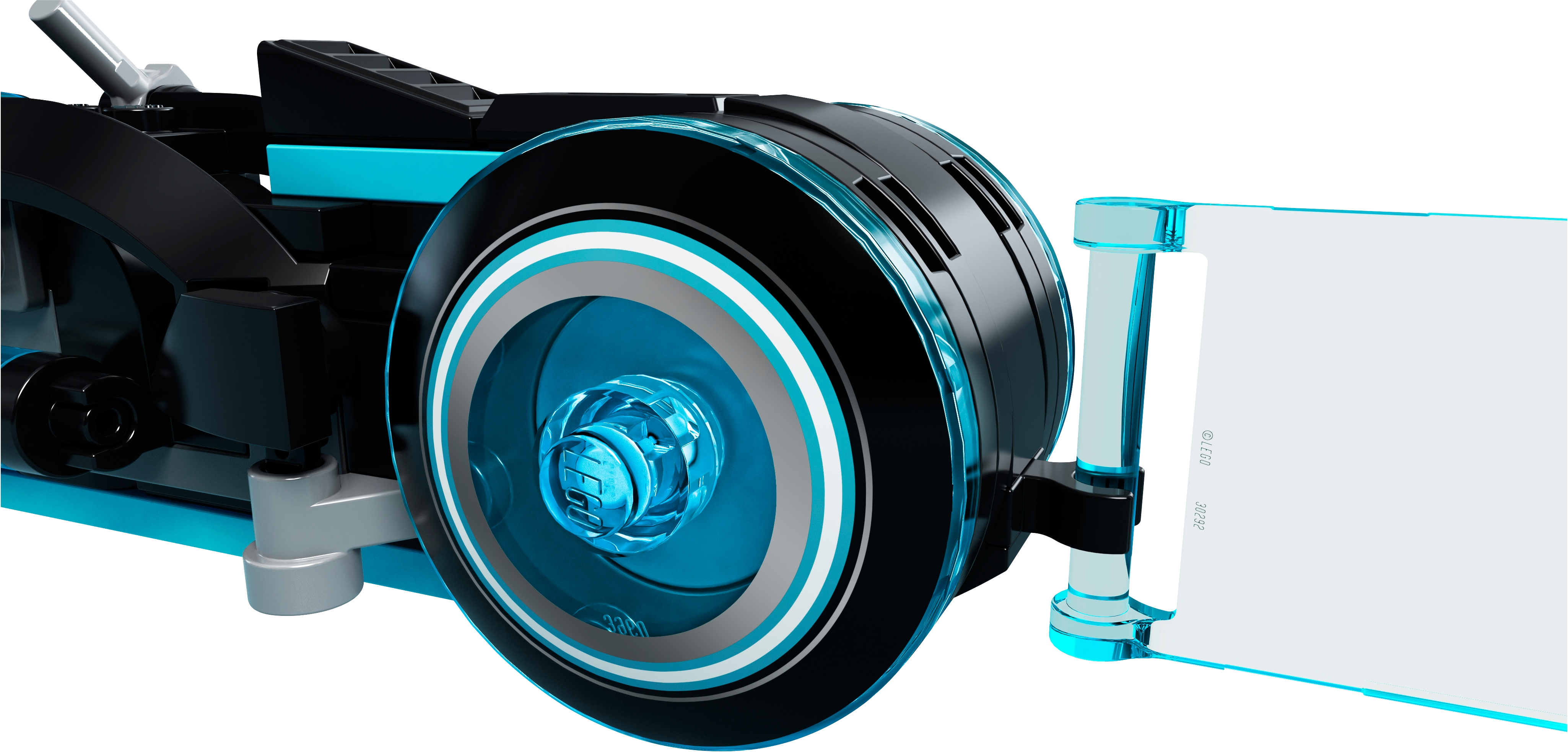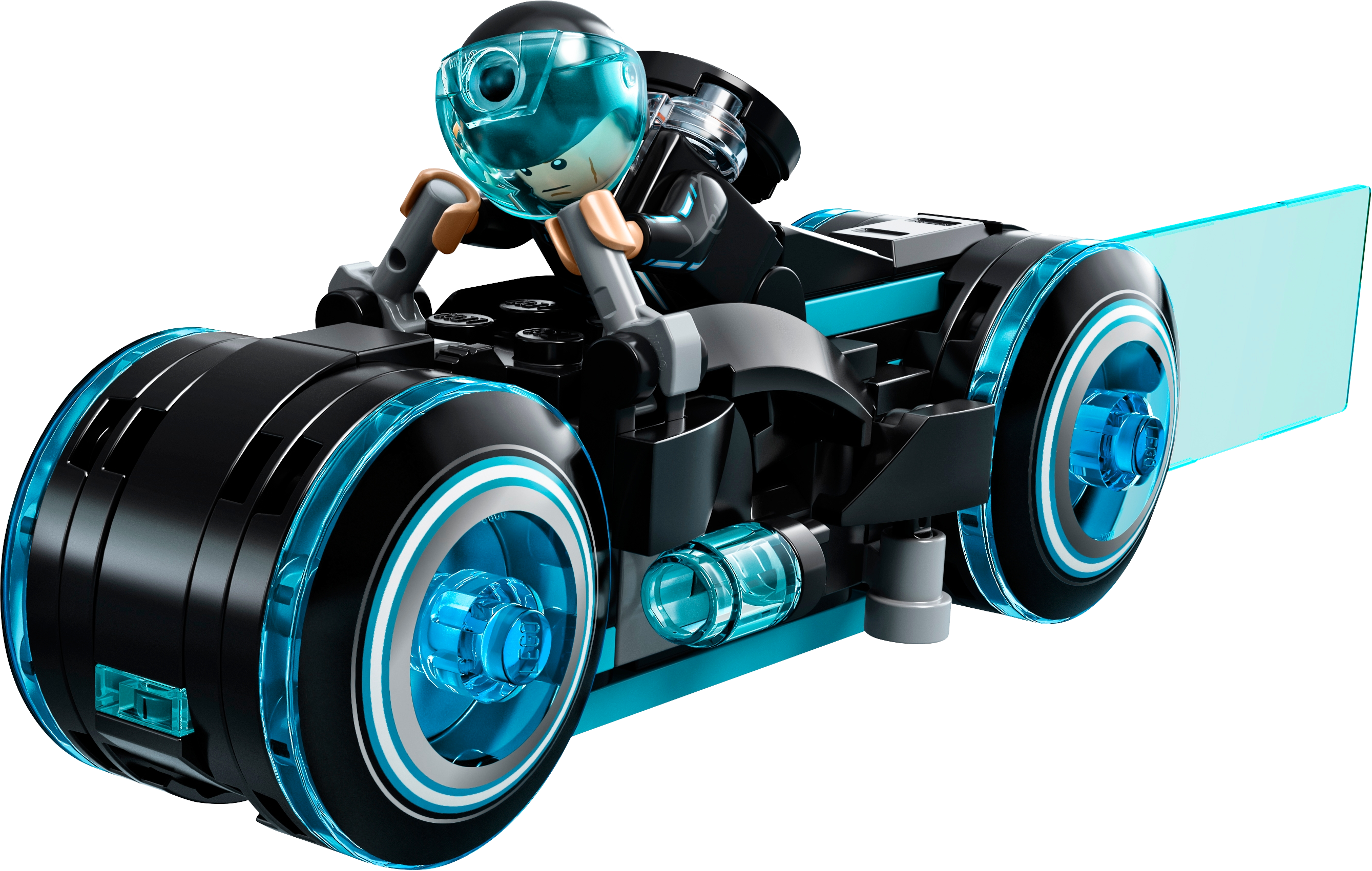 Sam Flynn’s Light Cycle features a minifigure seat, authentic features and assorted translucent-blue light-style elements, including power stream effects.