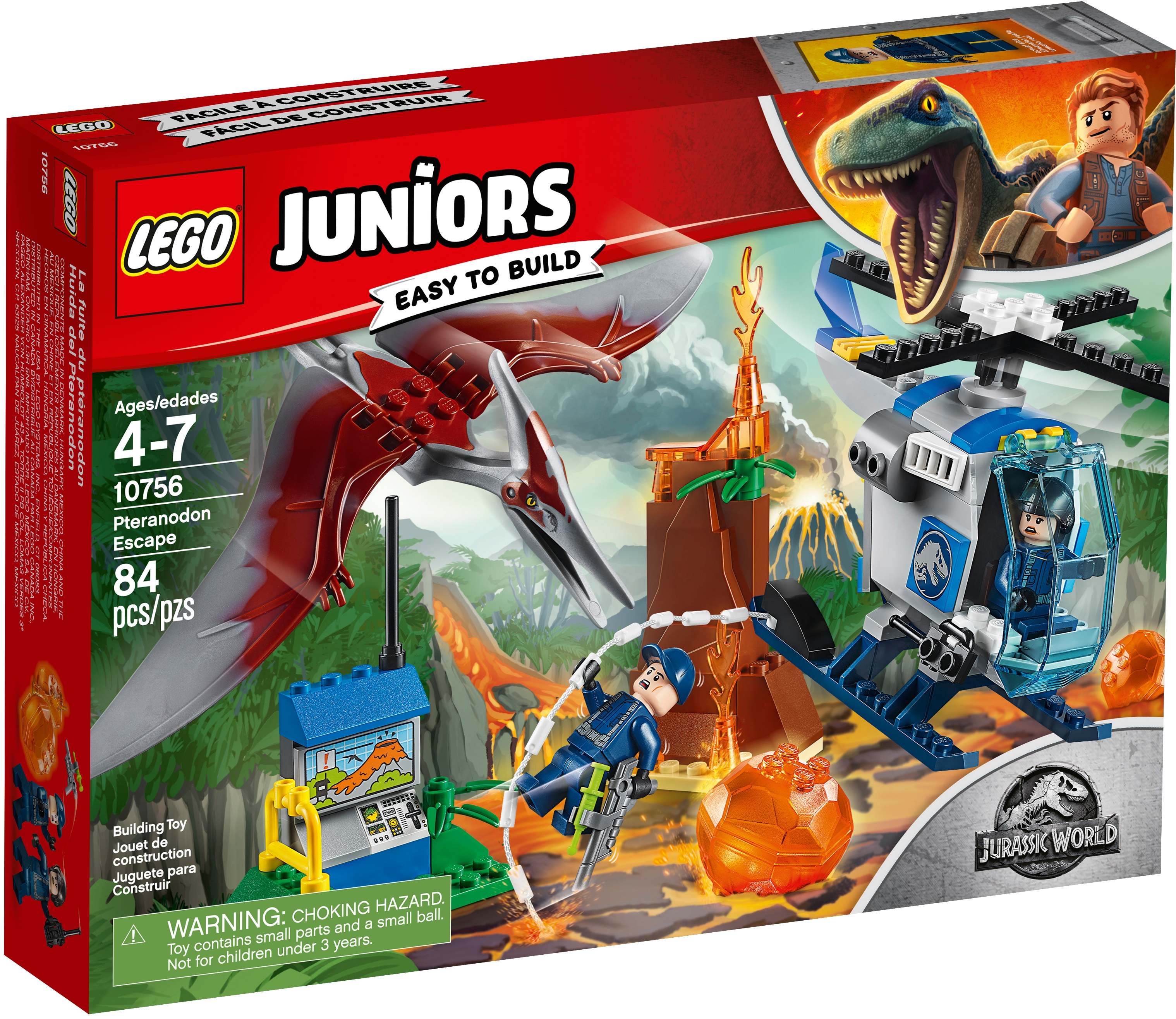 Introduce your child to the excitement of exploring in a LEGO® Juniors Jurassic World adventure with this Pteranadon Escape set, featuring an Easy to Build helicopter with a Quick Start chassis and spinning rotor, small volcano with buildable lava balls and a buildable Pteranadon with movable wings and beak. This cool toy for kids also includes a simple guide to build and play to help build confidence in children ages 4-5. Includes 2 minifigures and a Pteranadon figure.