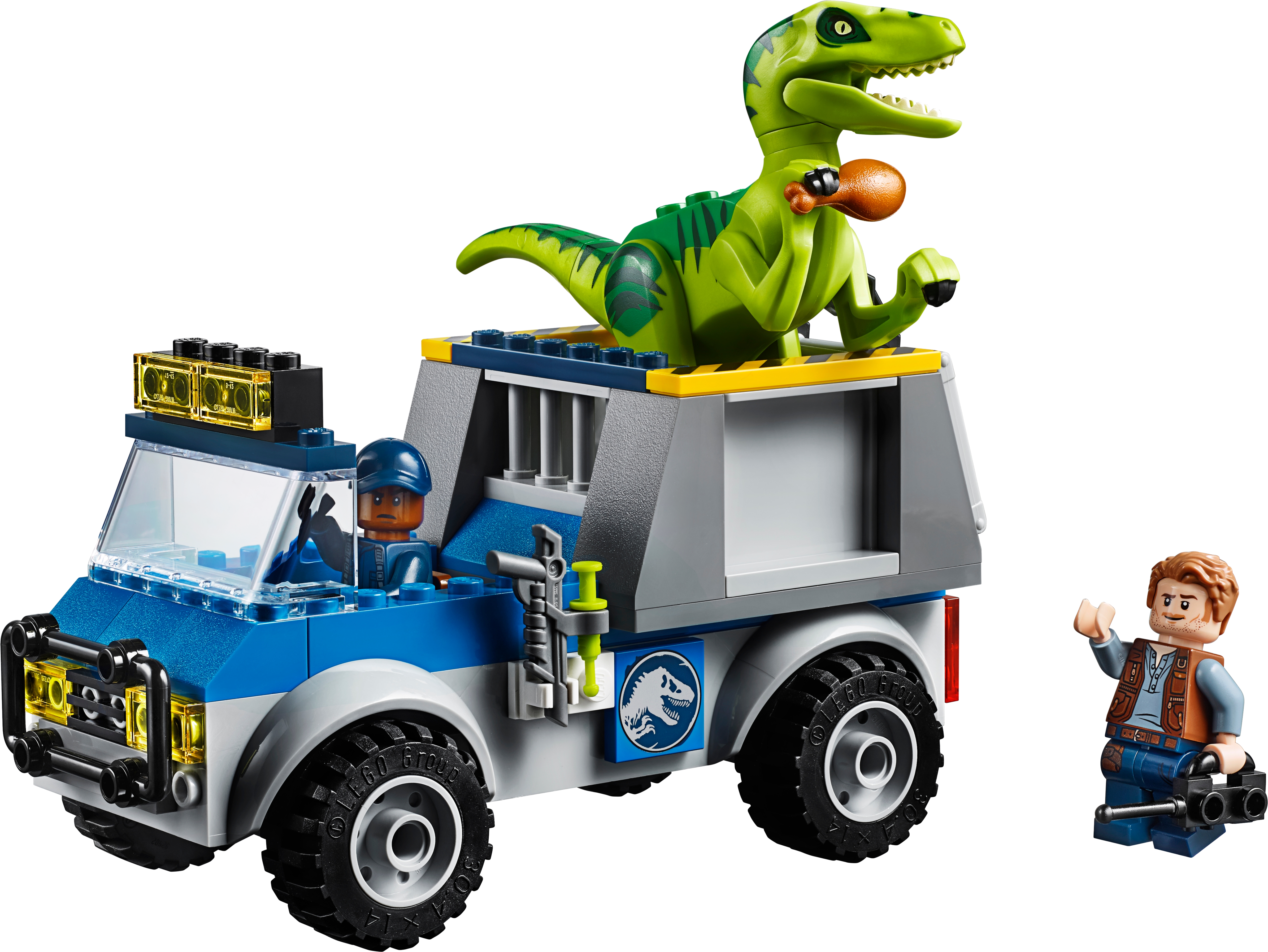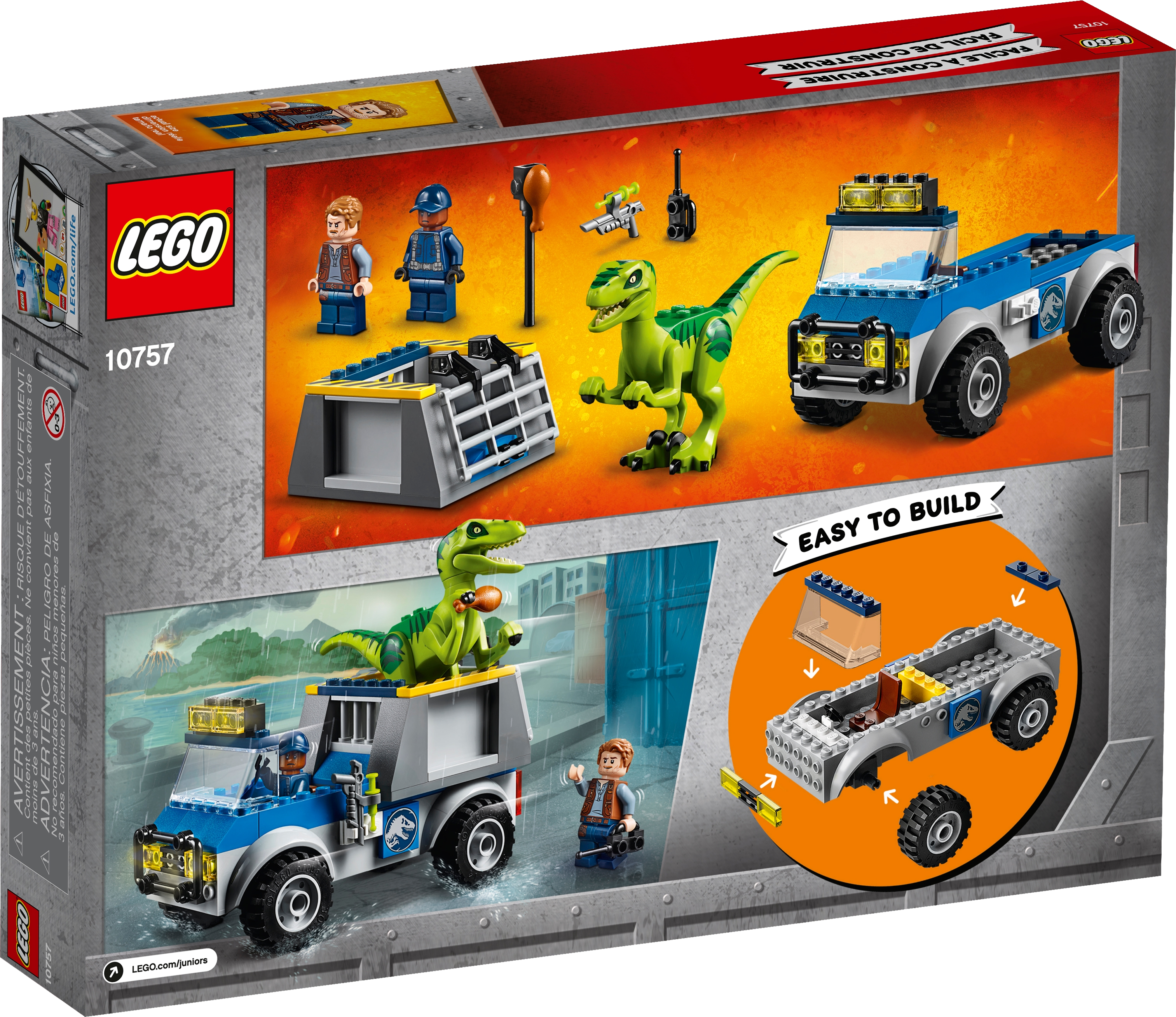 Features an off-road truck with Quick Start chassis and space on the back for the removable cage with opening gate and space for the buildable Raptor.