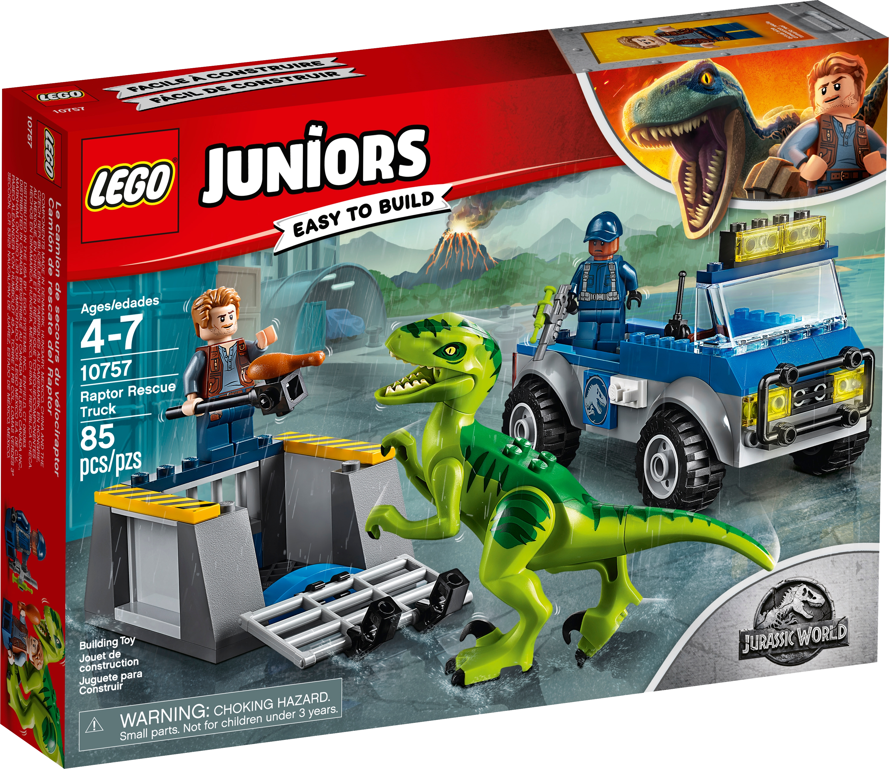 Introduce your child to the thrill of exploration and a LEGO® Juniors Jurassic World adventure, with this exciting Raptor Rescue Truck set, featuring a Quick Start chassis and removable cage with opening gate, plus a posable and buildable Raptor with opening mouth. This fun toy also comes with a simple guide to build and play, to help build confidence in children ages 4-5. Includes Owen and tracker minifigures, plus a Raptor figure.