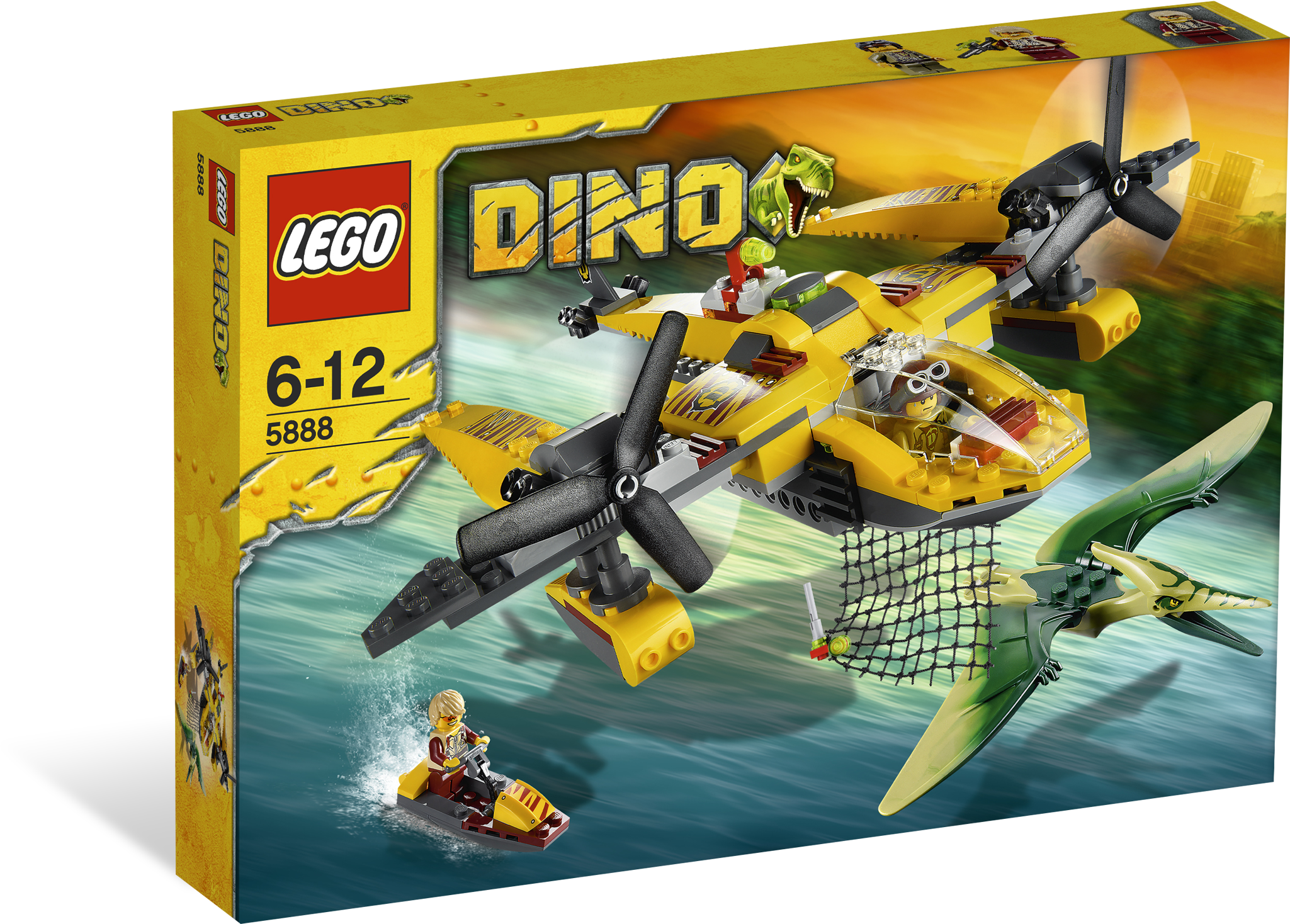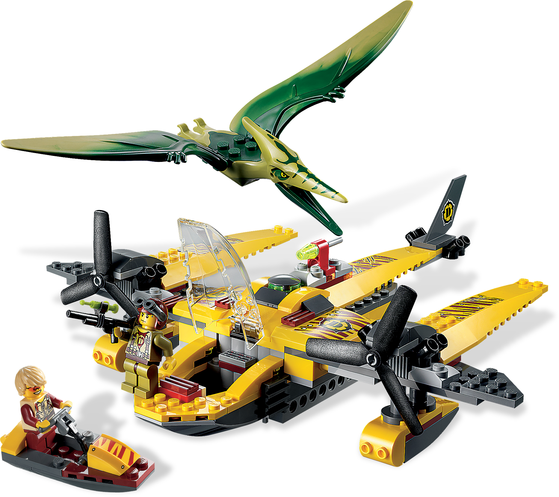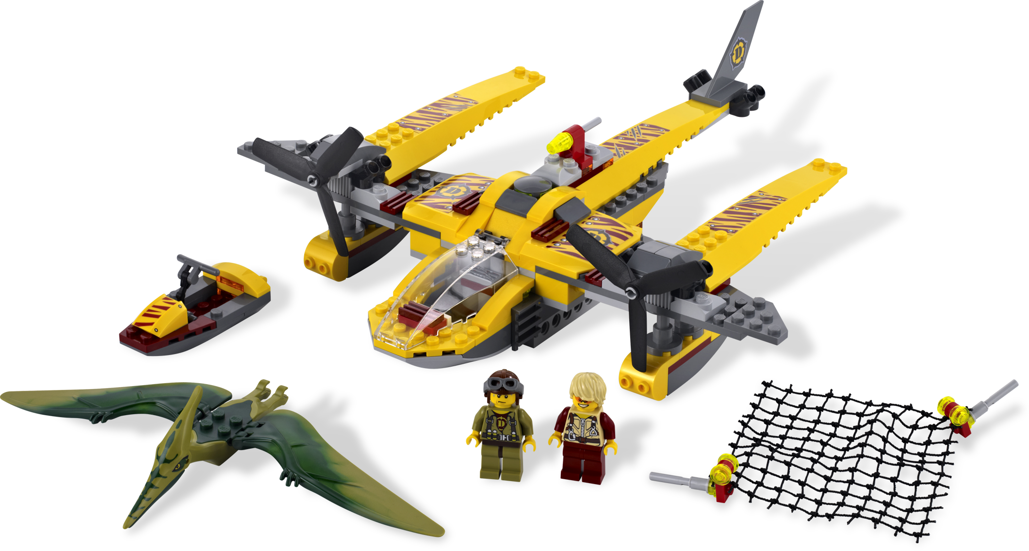 Catch the pteranodon and keep the hero safe! Emergency! A vicious pteranodon is attacking one of our heroes on his jet boat and needs rescuing. Zoom down in the swift Ocean Interceptor, fire the net and capture the flying dino before he grabs his prey. Includes 2 hero minifigures and pteranodon dinosaur.Includes 2 hero minifigures and pteranodon dinosaurVehicles include Ocean Interceptor and jet boatFeatures rotating propellers, opening cockpit, net shooter and flick missileFire the net shooter!Load the jet boat onto the Ocean Interceptor!Measures over 11” (27cm) long and 10” (25cm) widePteranodon measures over 4” (10cm) long and 7” (17cm) wideJet boat measures over 1” (2cm) wide and 2” (5cm) long