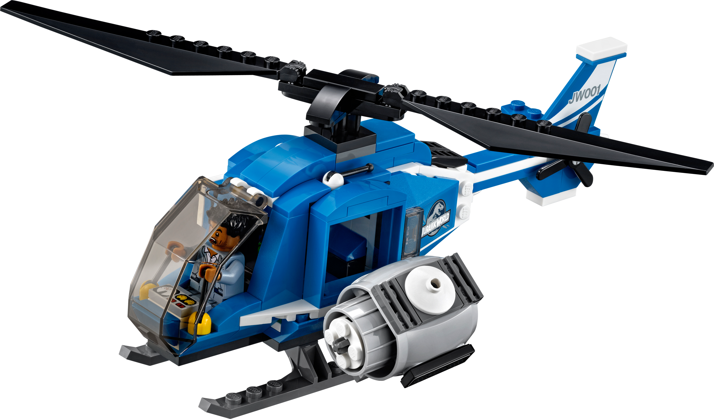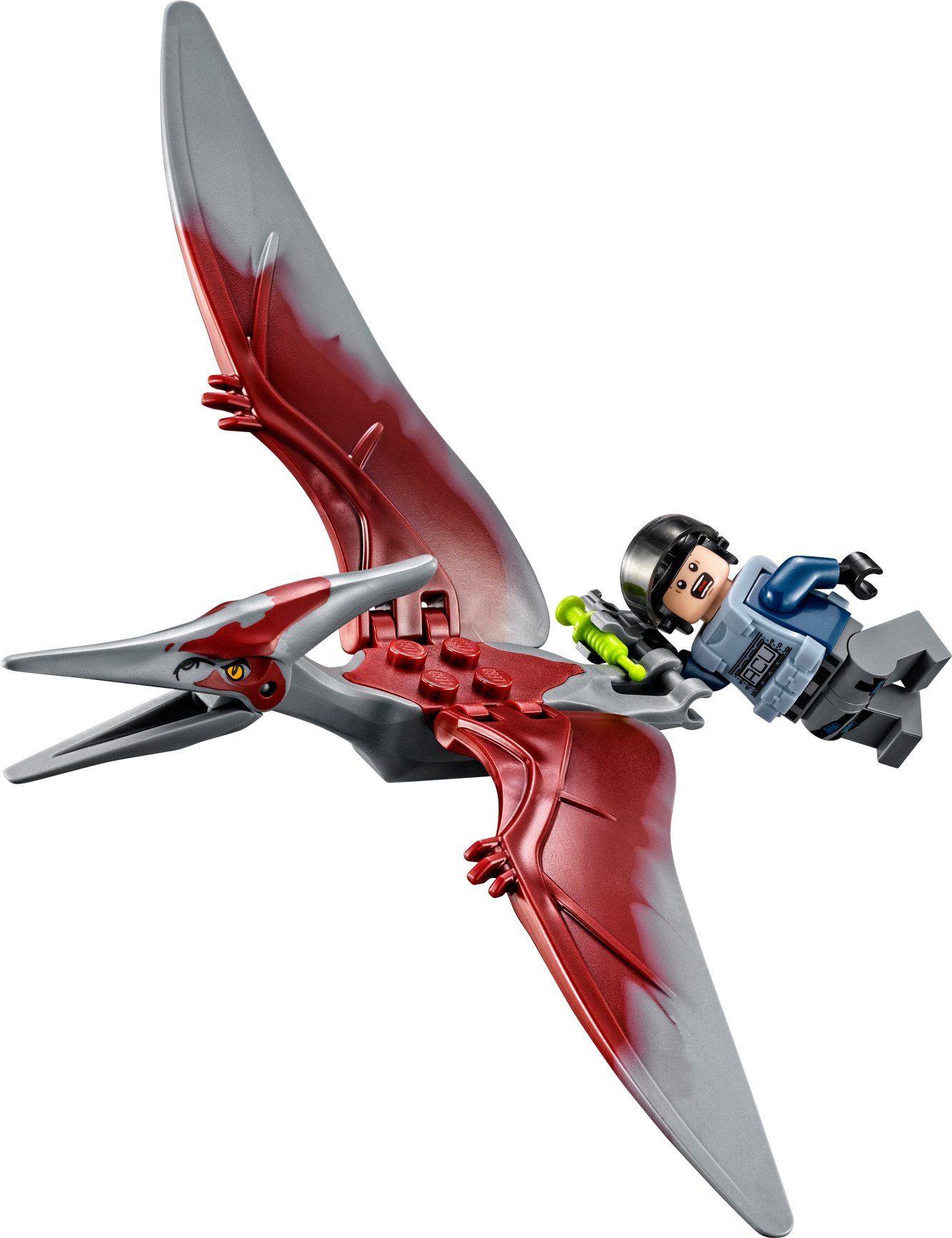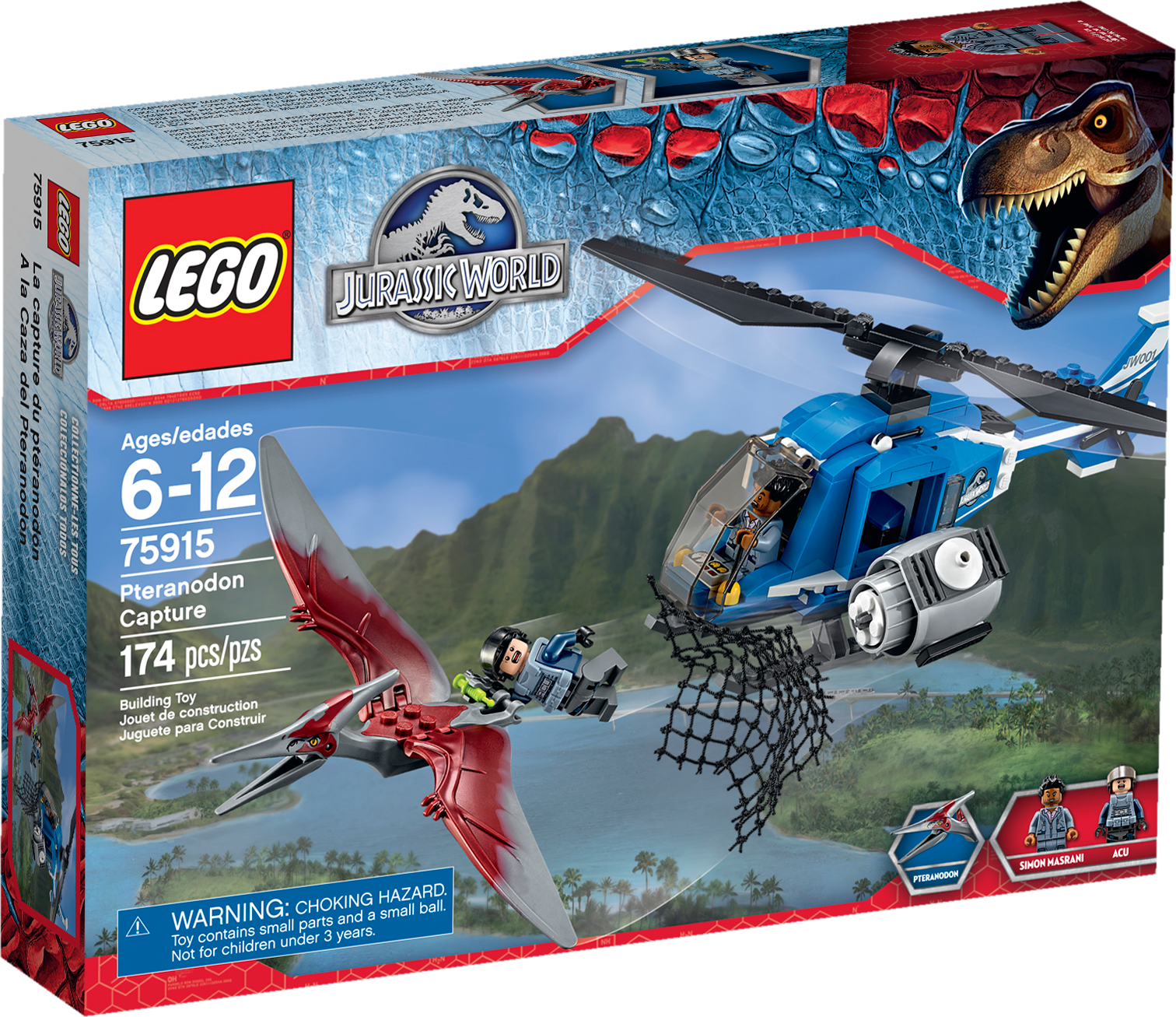 Fire the net shooter to take down the pteranodon! Emergency! A pteranodon has grabbed an ACU trooper and is flying away with him gripped in its claws. Jump into the cockpit of the cool Jurassic One helicopter with Simon Masrani, soar into the sky and speed to the rescue. When you have the pteranodon in your sights, open the side door to hang out on the platform and fire the net shooter to capture the dinosaur before it can escape. Includes 2 minifigures: Simon Masrani and an ACU trooper with a weapon. Includes 2 minifigures: Simon Masrani and an ACU trooper with a weapon Jurassic One helicopter features a cockpit for a minifigure, huge rotor, opening side door with a platform, removable stud blaster and a net shooter Pteranodon features claws and flapping wings Weapons include ACU trooper’s tranquilizer gun with syringe Place a minifigure into the cockpit and soar skywards! Open the side door and hang out on the platform Fire the net shooter to take down the pteranodon!Release the ACU trooper from the dinosaur’s claws Create your own thrilling Jurassic World action scenes Jurassic One helicopter measures over 3” (9cm) high, 7” (18cm) long and 8” (22cm) wide Pteranodon measures over 3” (9cm) long and 7” (20cm) wide