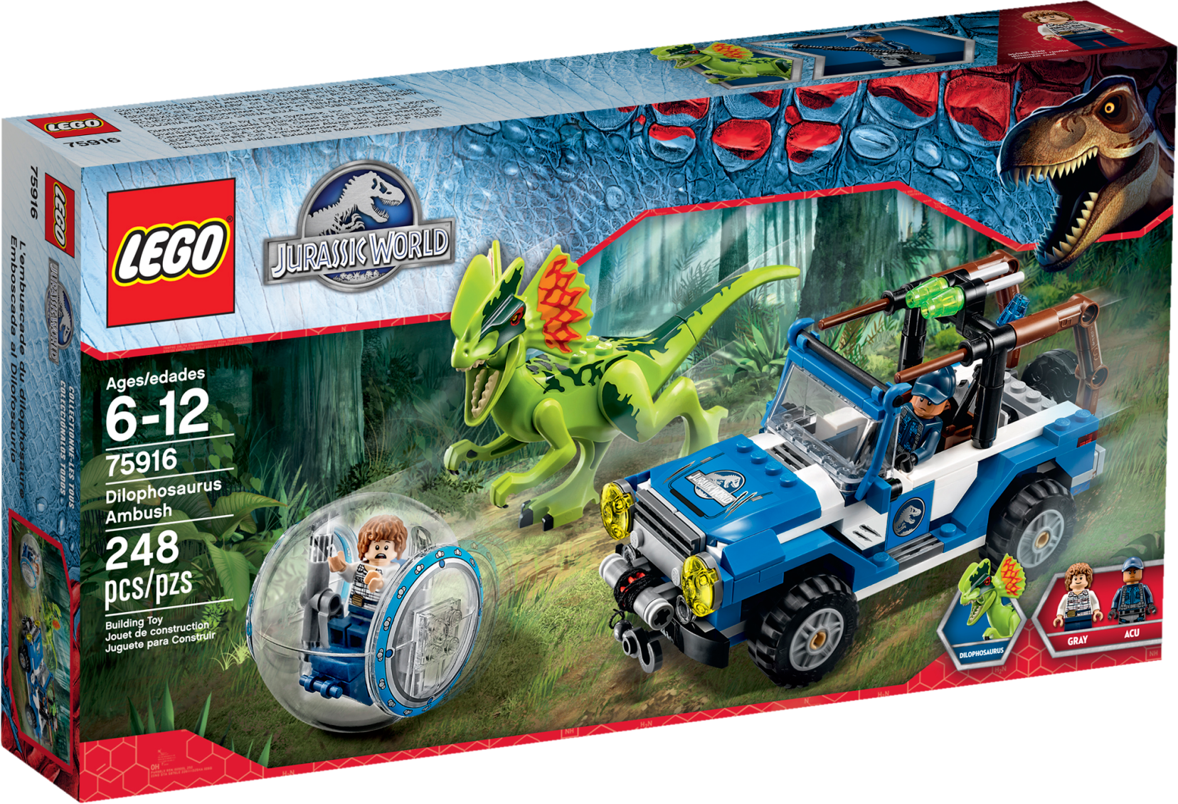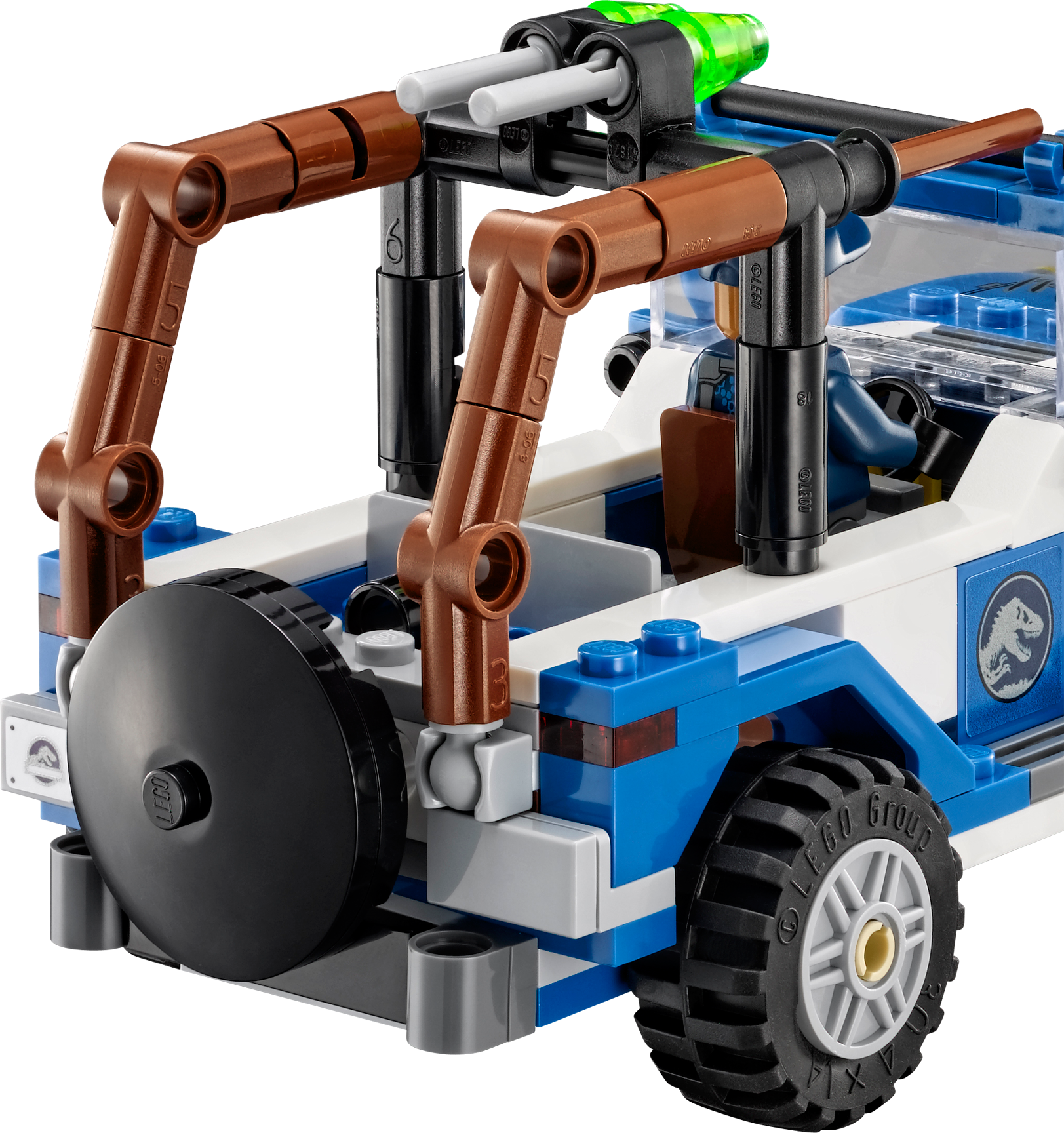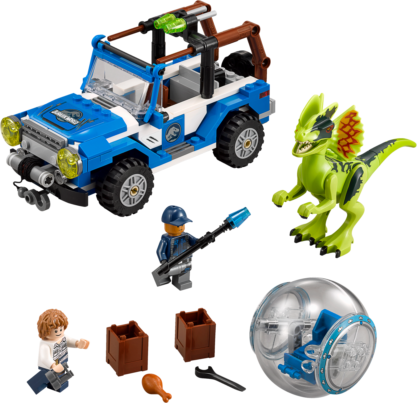 Save Gray from the dilophosaurus with the Jurassic World 4x4! Danger! Gray has got lost in the park and is rolling around in a gyrosphere being chased by a dilophosaurus. Join the ACU trooper as he drives to the rescue in the classic Jurassic World 4x4. Use the binoculars to seek out the ferocious dinosaur and call for back-up on the walkie-talkie. Evade its snapping jaws and use the winch to grab its legs. Take down that dino before it can jump on the back of the 4x4 and activate the explode function! Includes 2 minifigures with a weapon and assorted accessories: Gray and an ACU trooper. Includes 2 minifigures with a weapon and assorted accessories: Gray and an ACU trooper Jurassic World 4x4 features driver’s cockpit, rubber tires, front winch, rear explode function, boxes and Jurassic World decoration Dilophosaurus features posable arms, legs, neck and snapping jaws Rolling gyrosphere and a chicken leg element also included Includes the ACU trooper’s shock rod Accessory elements include binoculars and a wrench Get rolling with Gray in the gyrosphere! Evade the snapping jaws of the ferocious dilophosaurus Use the winch to grab the dino’s legs Stop the dino jumping on the truck and activating the explode function! Create your own thrilling Jurassic World action scenes Truck measures over 3” (8cm) high, 5” (15cm) long and 2” (7cm) wide Dilophosaurus stands over 2” (7cm) tall Gyrosphere measures over 2” (6cm) across
