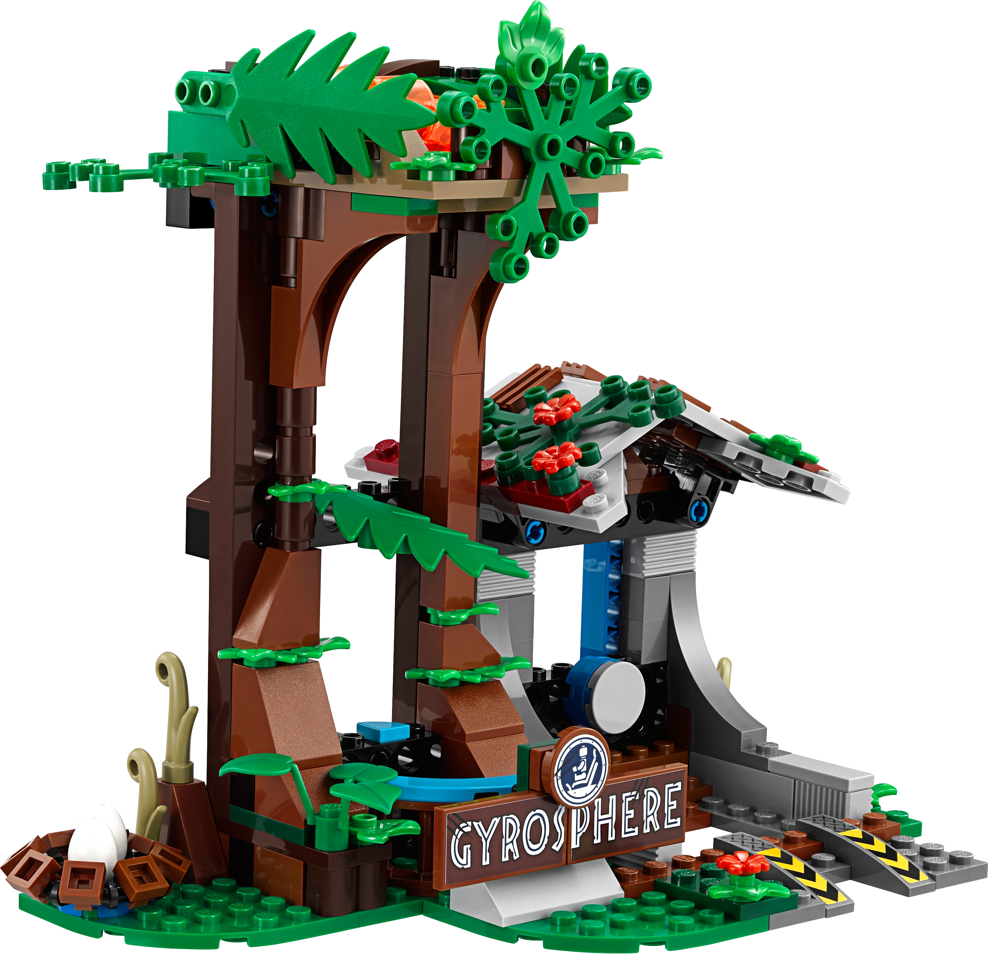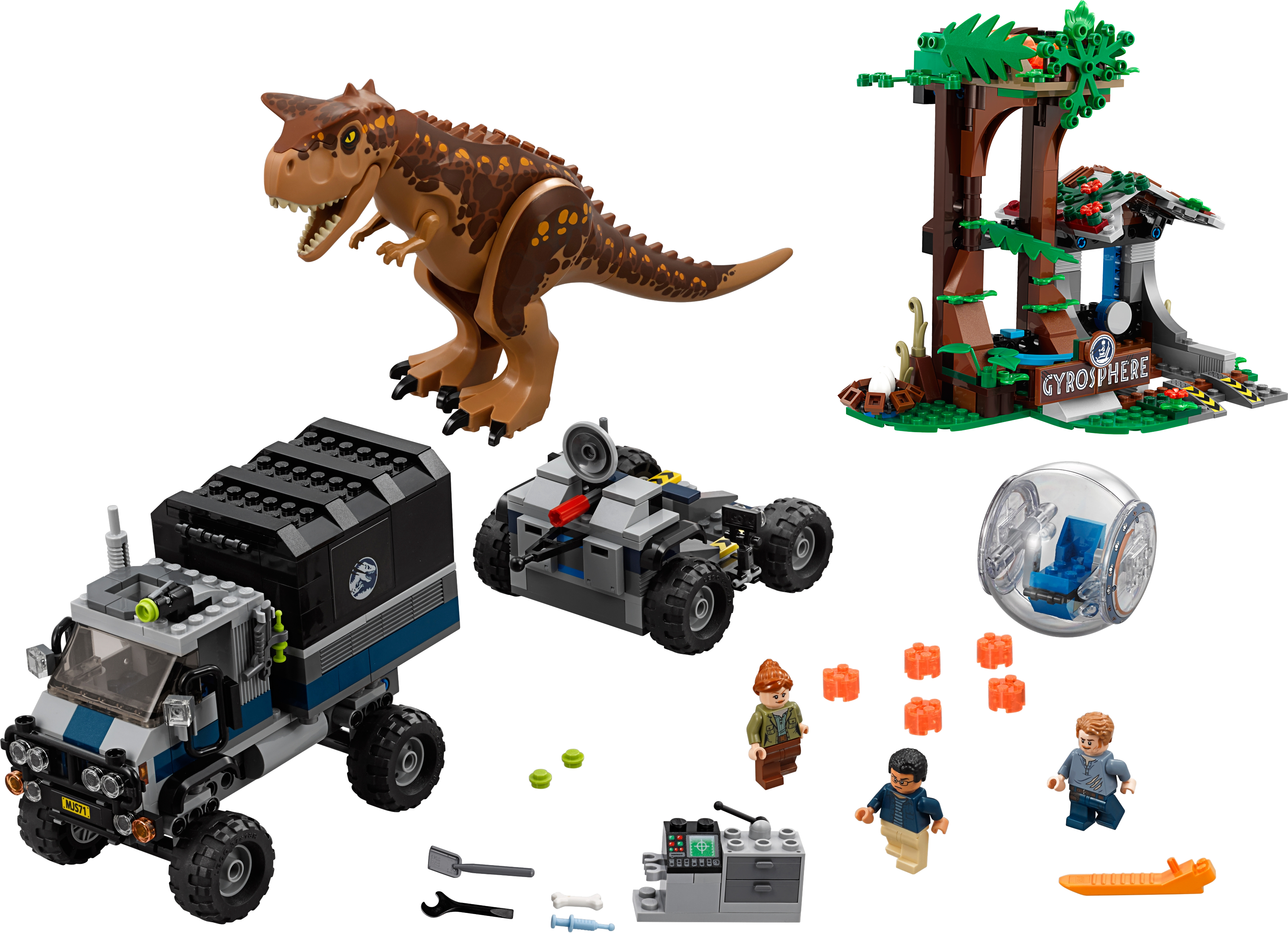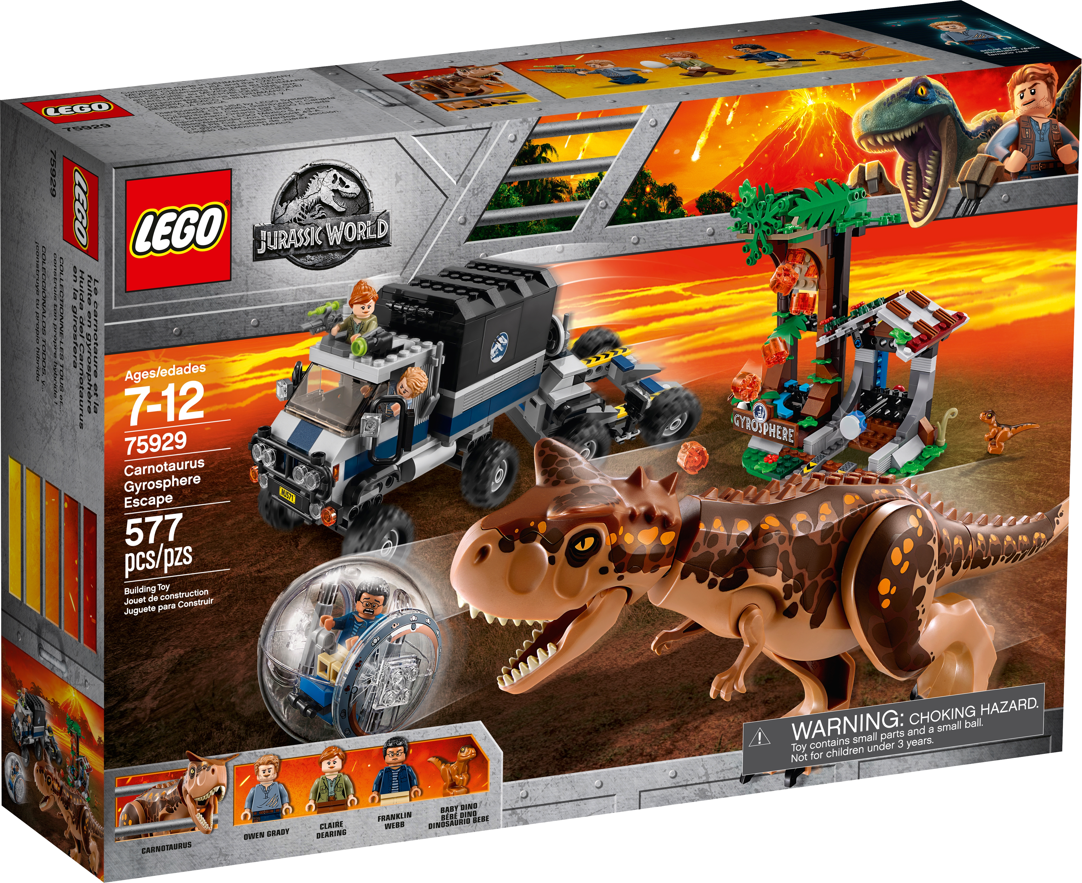 Flee the flying lava rocks and a deadly dinosaur on Isla Nublar, with this dramatic Carnotaurus Gyrosphere Escape play set inspired by Jurassic World™. Help Owen, Claire and Franklin make their escape in the Gyrosphere or truck, featuring a 2-seater cab with sunroof, stud shooter, mobile control center and Gyrosphere trailer with launch function. The overgrown Gyrosphere station has an exploding lava rocks function, Gyrosphere launcher and a dinosaur nest. This fun toy includes 3 minifigures and 2 dinosaur figures. Includes 3 minifigures: Owen, Claire and Franklin, plus 2 dinosaur figures. Features a truck with a trailer and mobile control center, plus an overgrown Gyrosphere station. Truck features a 2-seater cab with sunroof and stud shooter, attached to a mobile control center with computer and cabinets, plus a detachable trailer with Gyrosphere launch function. Overgrown Gyrosphere station features 5 lava rocks, eruption function, dinosaur nest and a Gyrosphere launcher. Carnotaurus features posable limbs and snapping jaws. Activate the erupting lava function and help the heroes dodge the falling rocks! Launch the Gyrosphere from the trailer or overgrown Gyrosphere launcher, and send it racing to escape the chasing Carnotaurus! Also includes a tranquilizer gun. Accessory elements include a shovel and 3 dinosaur eggs. This fun toy is suitable for ages 7-12. Truck measures over 4” (12cm) high, 5” (15cm) long and 3” (8cm) wide. Trailer measures over 3” (9cm) high, 5” (15cm) long and 3” (10cm) wide. Carnotaurus stands over 5” (14cm) tall. Overgrown Gyrosphere station measures over 6” (16cm) high, 4” (12cm) wide and 7” (20cm) deep. Gyrosphere measures over 2” (6cm) across.