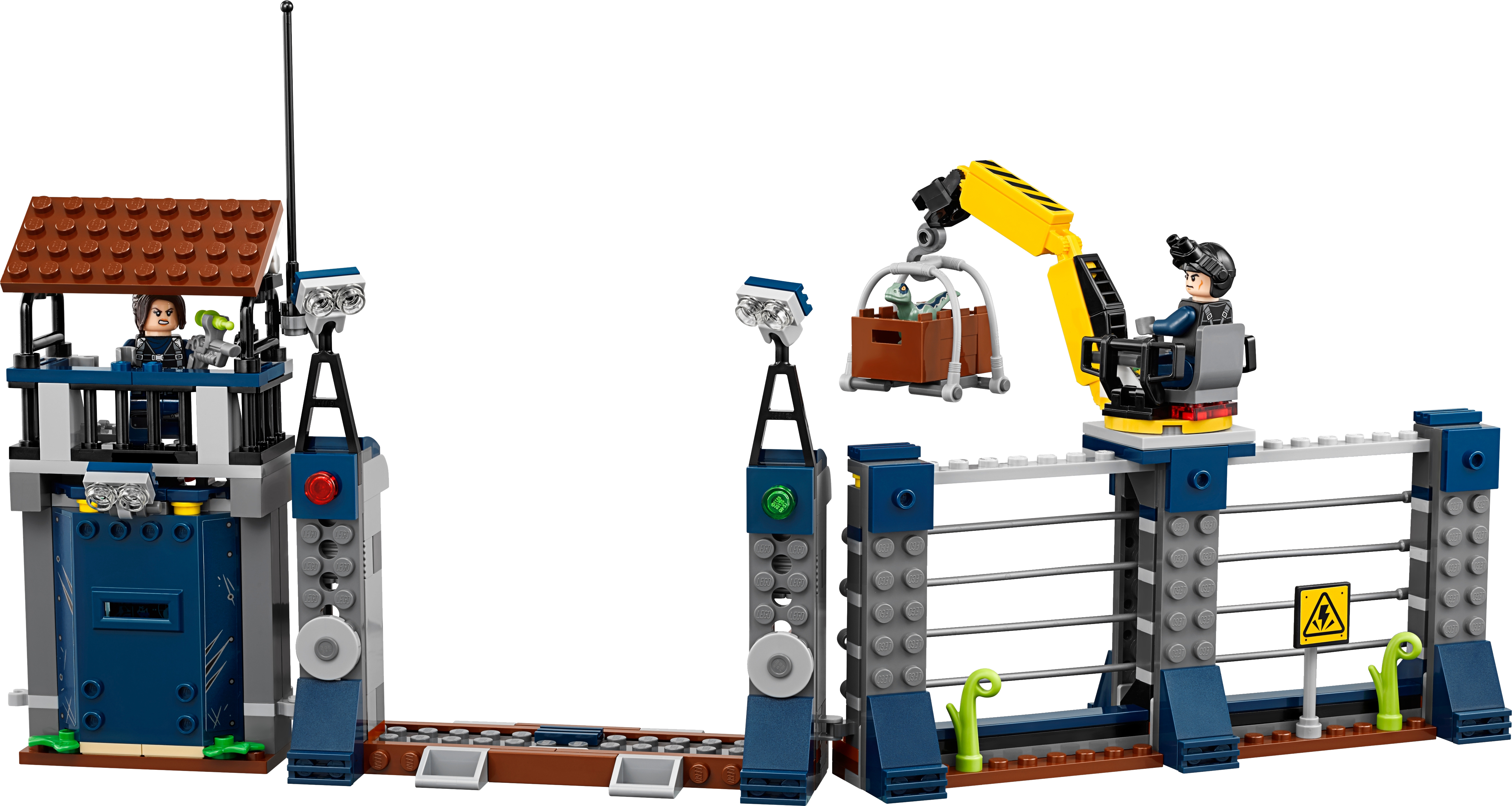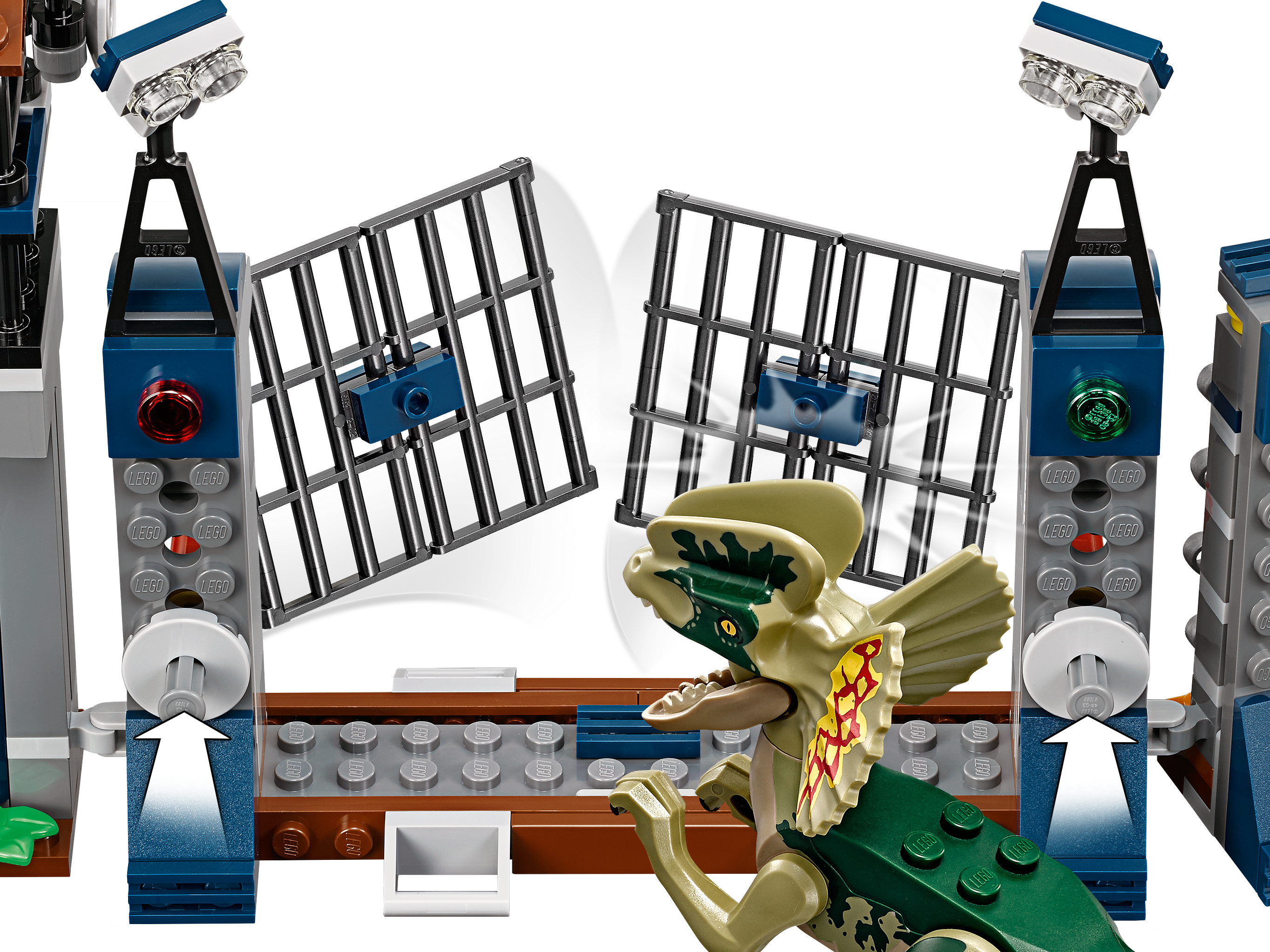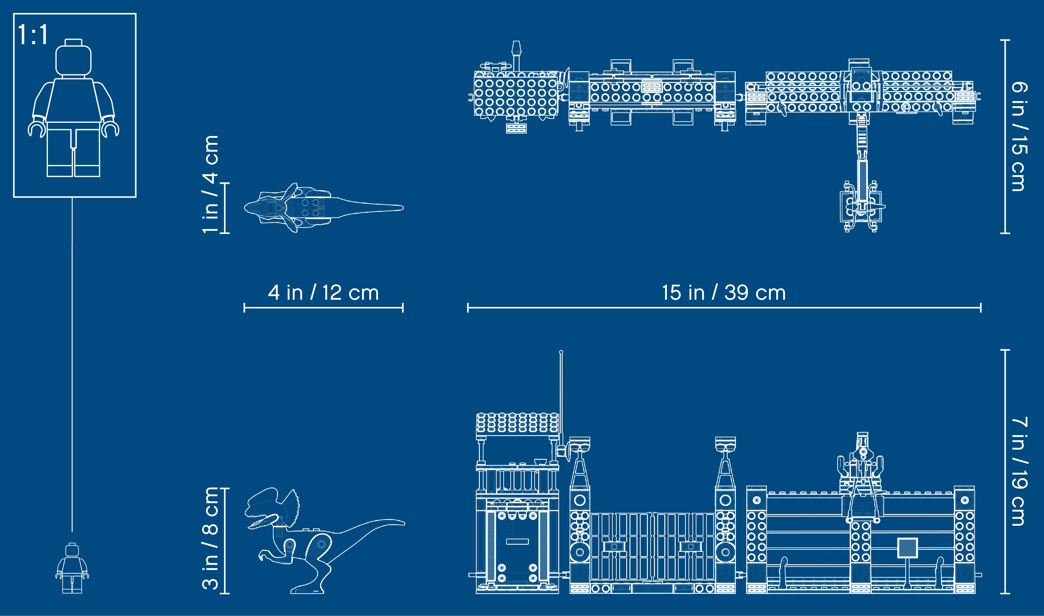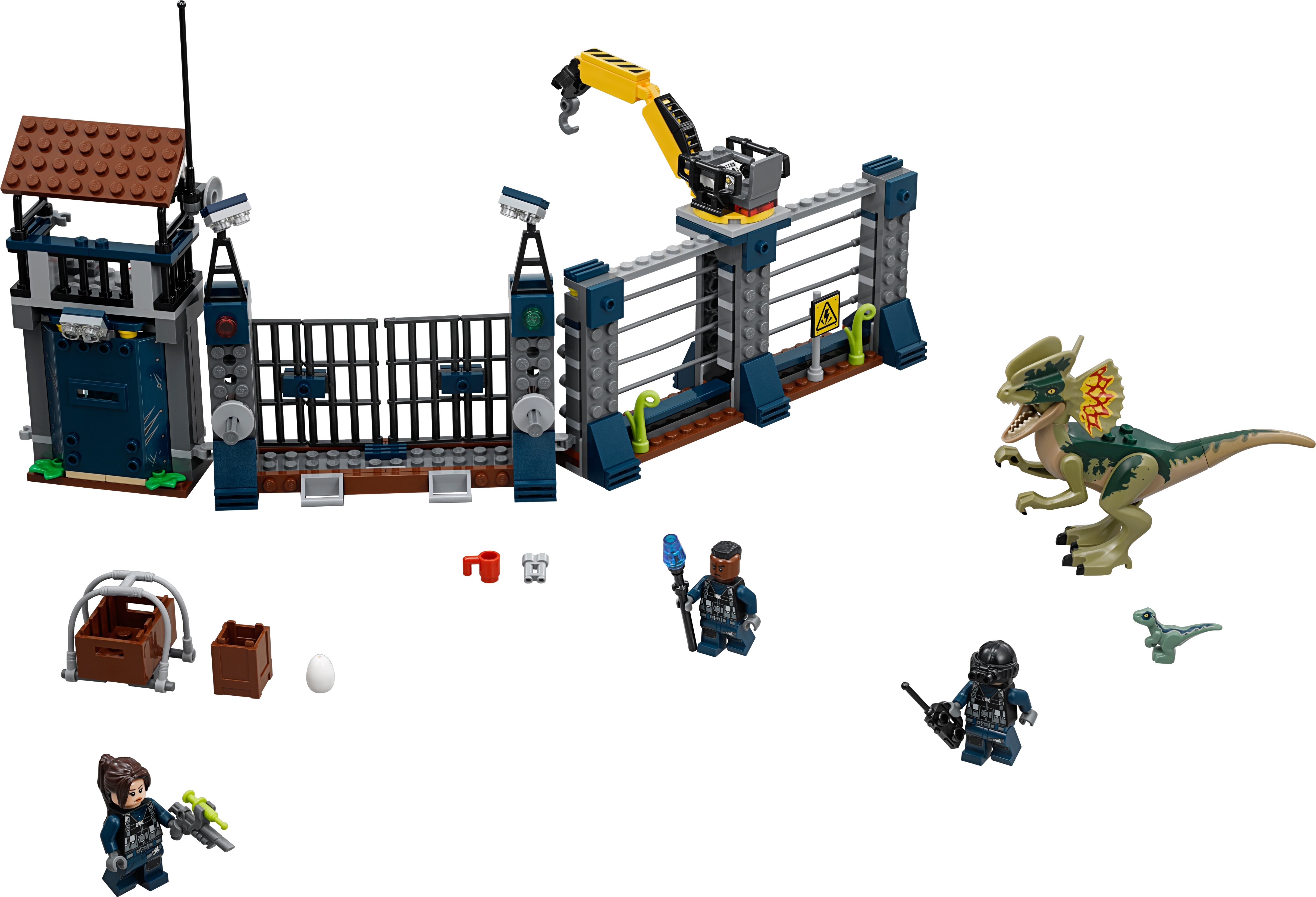 Brace the hunters for a fierce Dilophosaurus Outpost Attack in this fun play set inspired by Jurassic World™. Step down from the lookout tower and crane, featuring exploding gate and wall functions, crate and baby Dilophosaurus, and use the tranquilizer gun to stop the Dilophosaurus breaking through the fences. This dinosaur set includes 3 minifigures and 2 dinosaur figures. Includes 3 minifigures and 2 dinosaur figures. Features an outpost fence with a watchtower, movable crane and exploding gate and wall functions. Dilophosaurus features posable limbs, head and snapping jaws. Activate the exploding gate and wall functions to stage a dinosaur breakthrough! Also includes a tranquilizer gun. Accessory elements include 2 crates, a dinosaur egg and binoculars. This dinosaur set is suitable for ages 7-12. Outpost measures over 5” (14cm) high, 14” (37cm) wide and 2” (6cm) deep. Dilophosaurus stands over 2” (7cm) high.