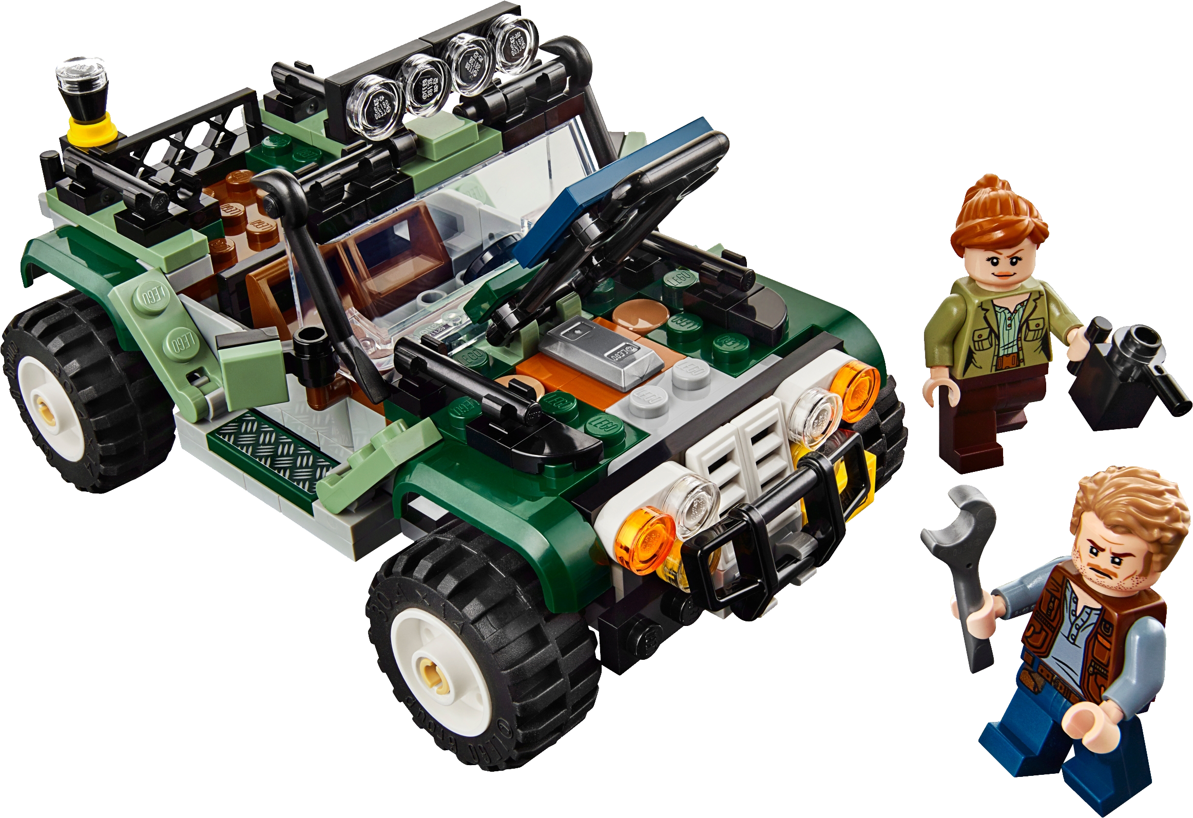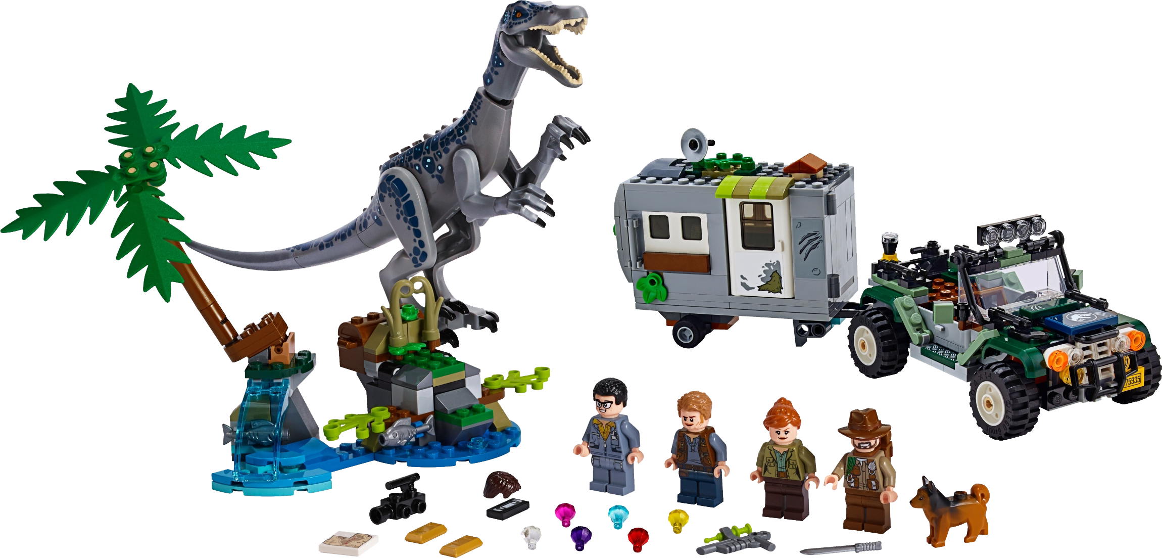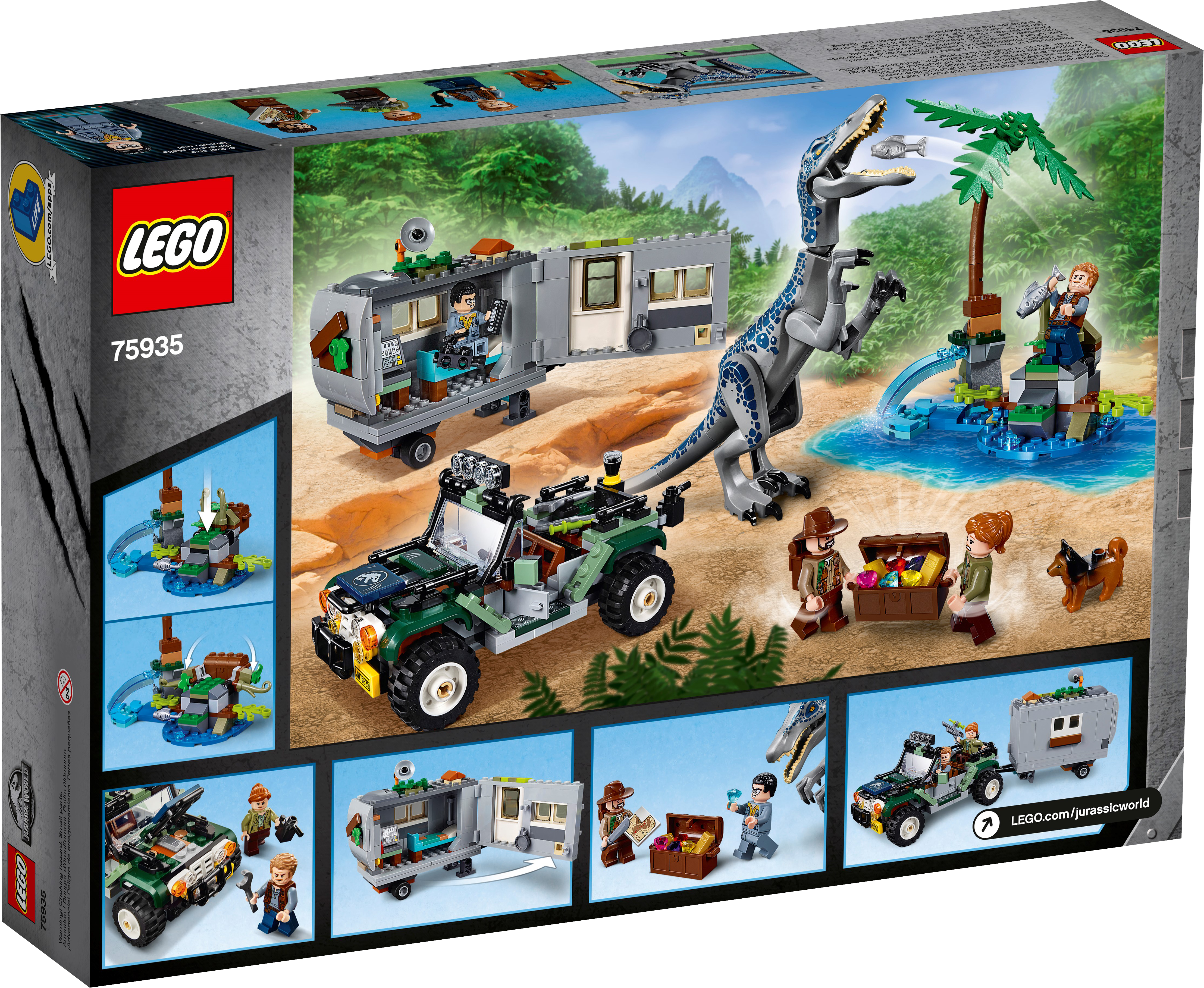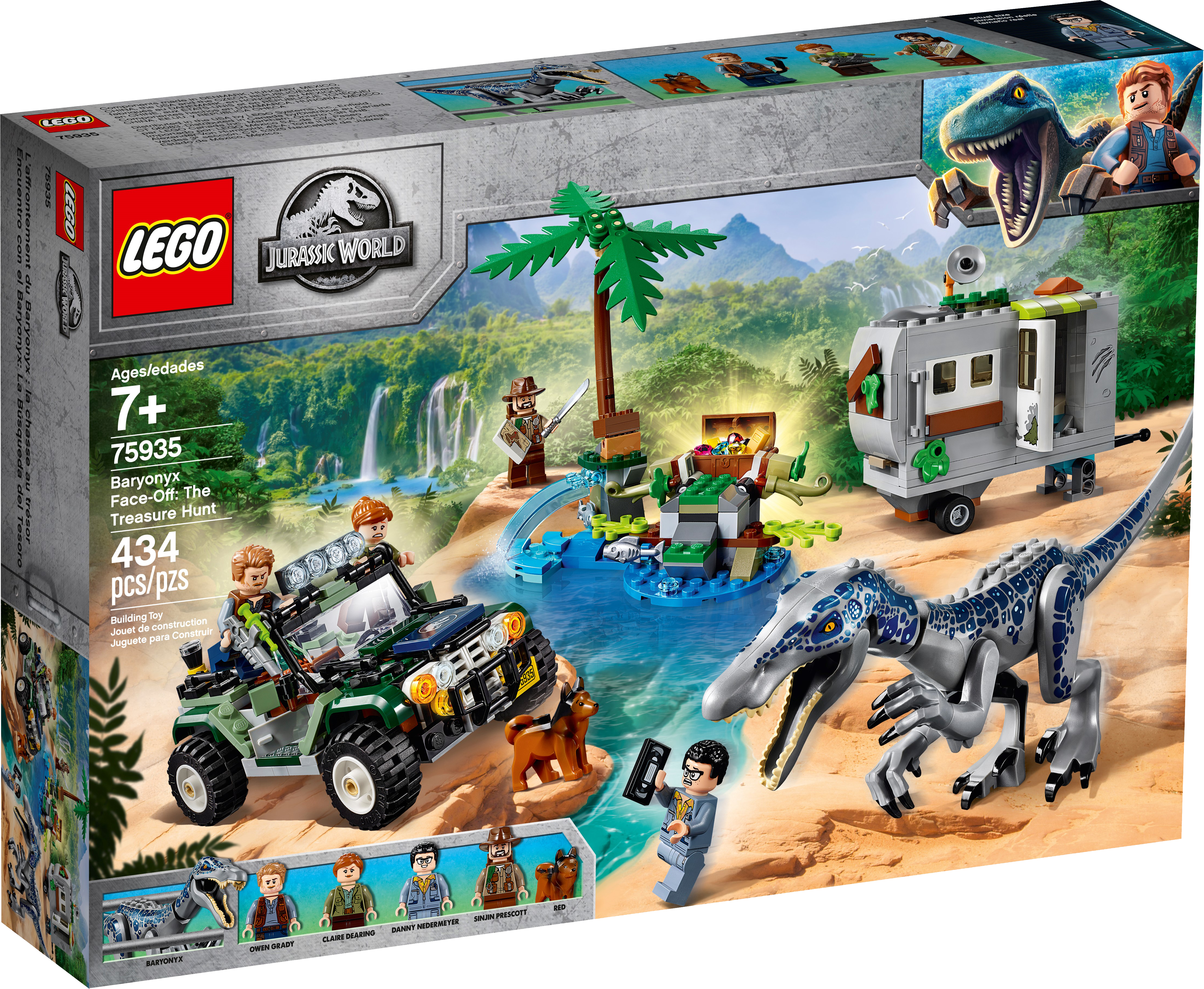 Drama awaits kids as they help Owen Grady and Claire Dearing pursue bad guys through the jungle in LEGO® Jurassic World 75935 Baryonyx Face-Off: The Treasure Hunt. This action-packed dinosaur playset features an offroader with space for 2 minifigures and an attachment point for a trailer which has a buildable rooftop antenna and a detailed interior, plus a buildable jungle scene that has a hidden treasure chest with a reveal function. It also includes a posable Baryonyx dinosaur figure and 4 minifigures with cool weapons and accessories to inspire imaginative play. This LEGO® Jurassic World dinosaur toy playset for kids includes 4 minifigures: Owen Grady, Claire Dearing, Danny Nedermeyer, Sinjin Prescott, plus a Red the dog figure. Offroader features space for 2 minifigures, rear storage space, attachment point for the trailer, brick-built flashlight and fuel container, plus a screwdriver element. Trailer features a buildable antenna and assorted plant elements on the exterior, an opening door and a detailed interior with a buildable computer and bed, plus assorted elements including a coffee cup, movie camera and frying pan. Jungle scene features a buildable palm tree, hidden treasure chest with a reveal function and 6 gem and 2 gold-colored bar elements inside, plus assorted elements including plants and 2 fish. Press the trigger to reveal the hidden treasure chest. Molded, buildable Jurassic World Baryonyx dinosaur toy figure features snapping jaws and a posable head, arms and legs. Weapons include Owen Grady's tranquilizer gun and Sinjin Prescott’s machete. Accessory elements include Sinjin Prescott’s hat, bag, map and videotape. Danny Nedermeyer and Sinjin Prescott minifigures are new for June 2019. Kids can reimagine exciting scenes from the LEGO® Jurassic World animated series with this collectible toy. This LEGO® building set makes a great dinosaur gift for kids. Offroader measures over 2” (7cm) high, 5” (13cm) long and 3” (8cm) wide. Trailer measures over 3” (10cm) high, 5” (14cm) long and 1” (5cm) wide. Jungle scene build measures over 5” (14cm) high, 5” (14cm) wide and 3” (8cm) deep. Baryonyx dinosaur figure measures 4” (12cm) high, 11” (28cm) long and 1” (4cm) wide.