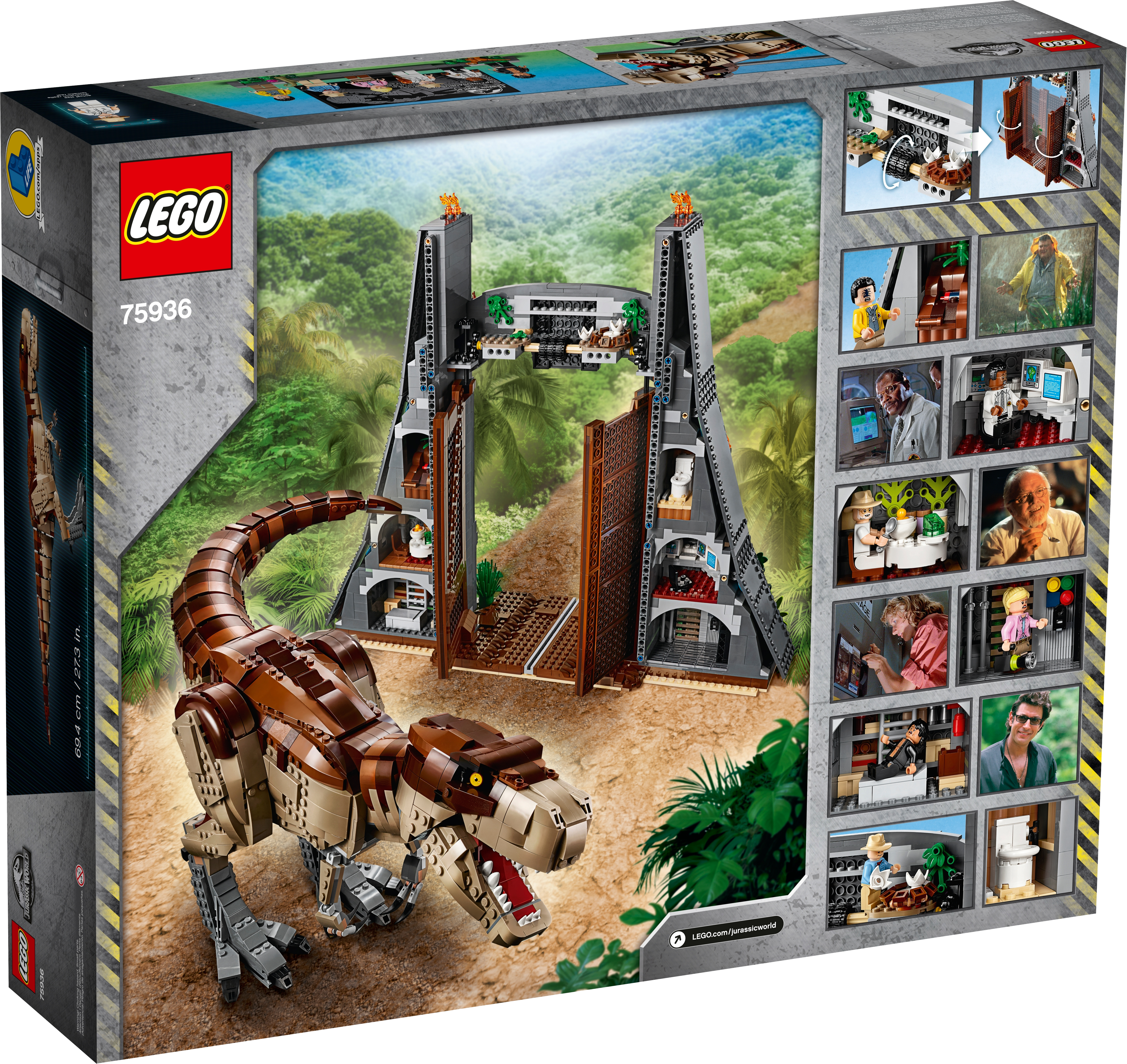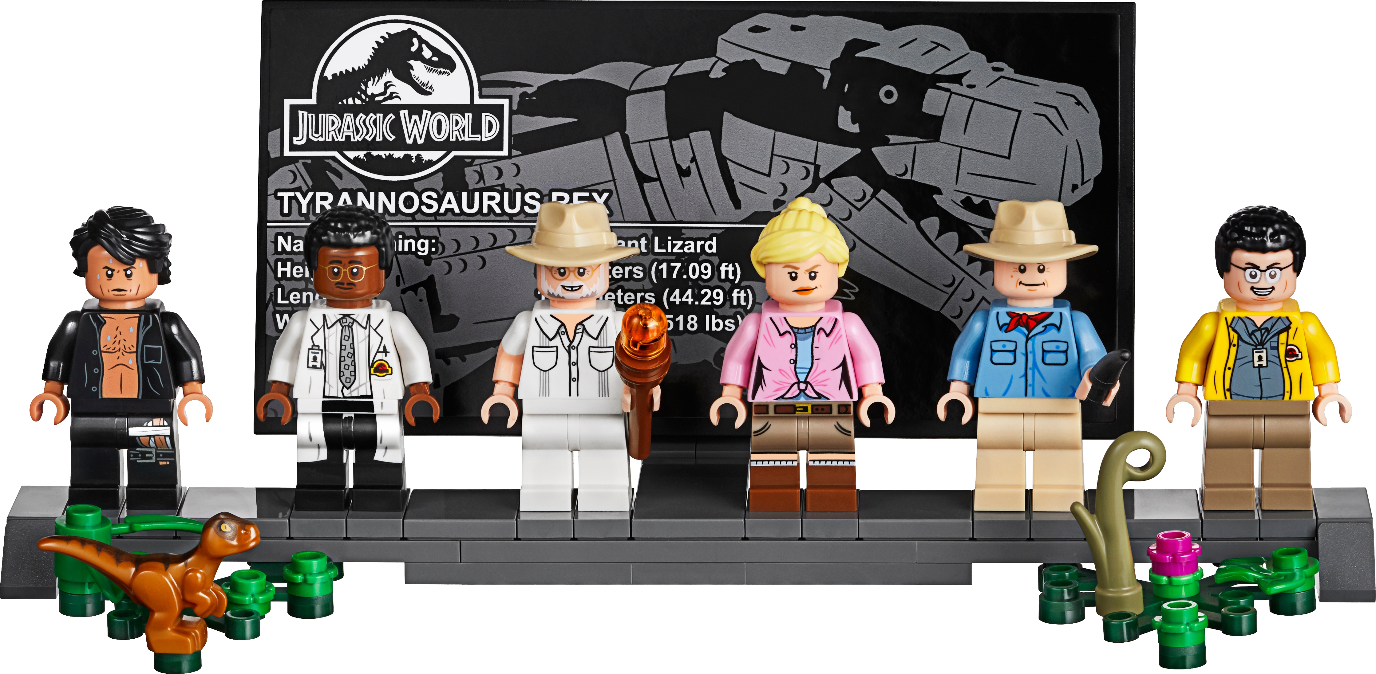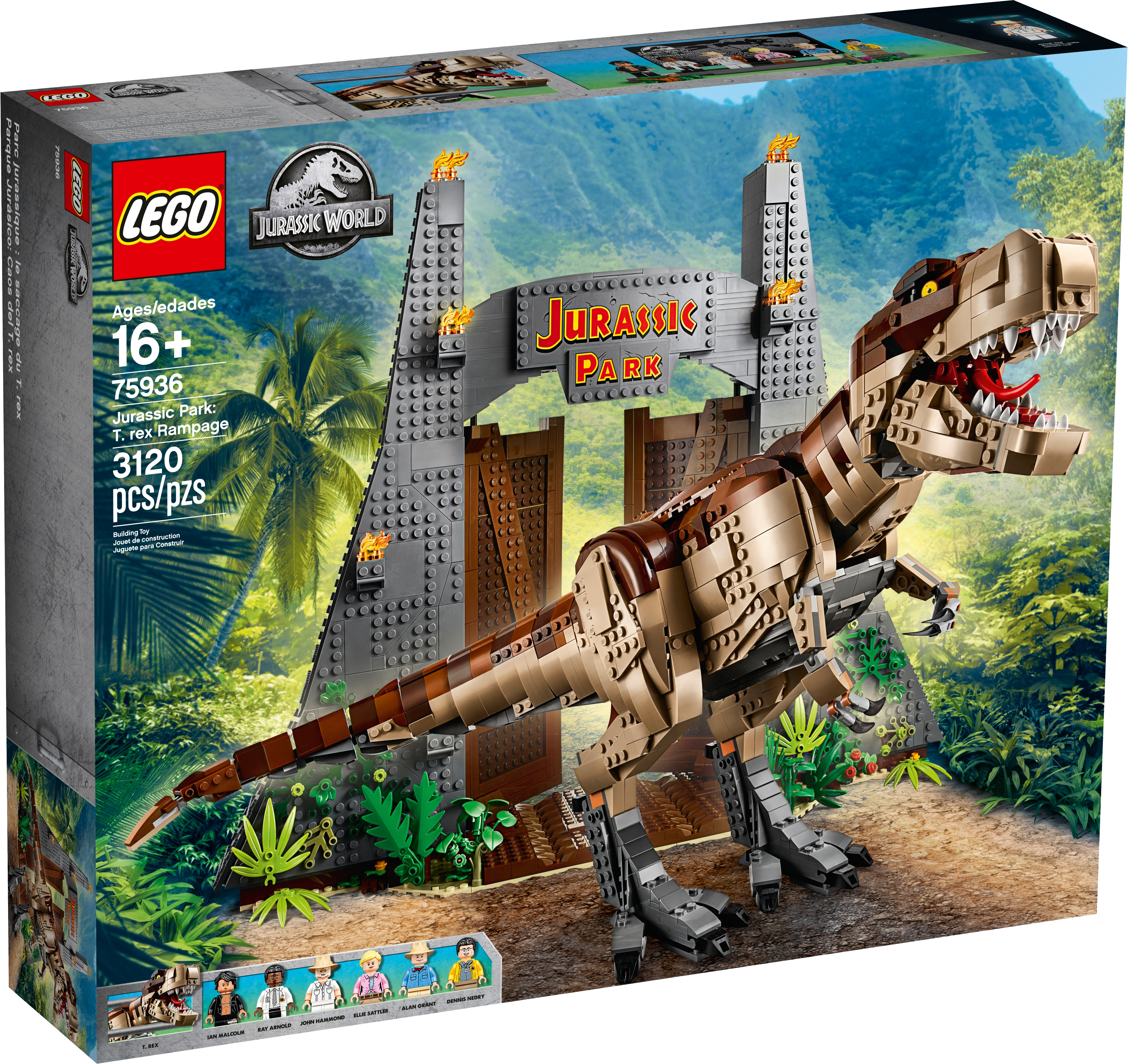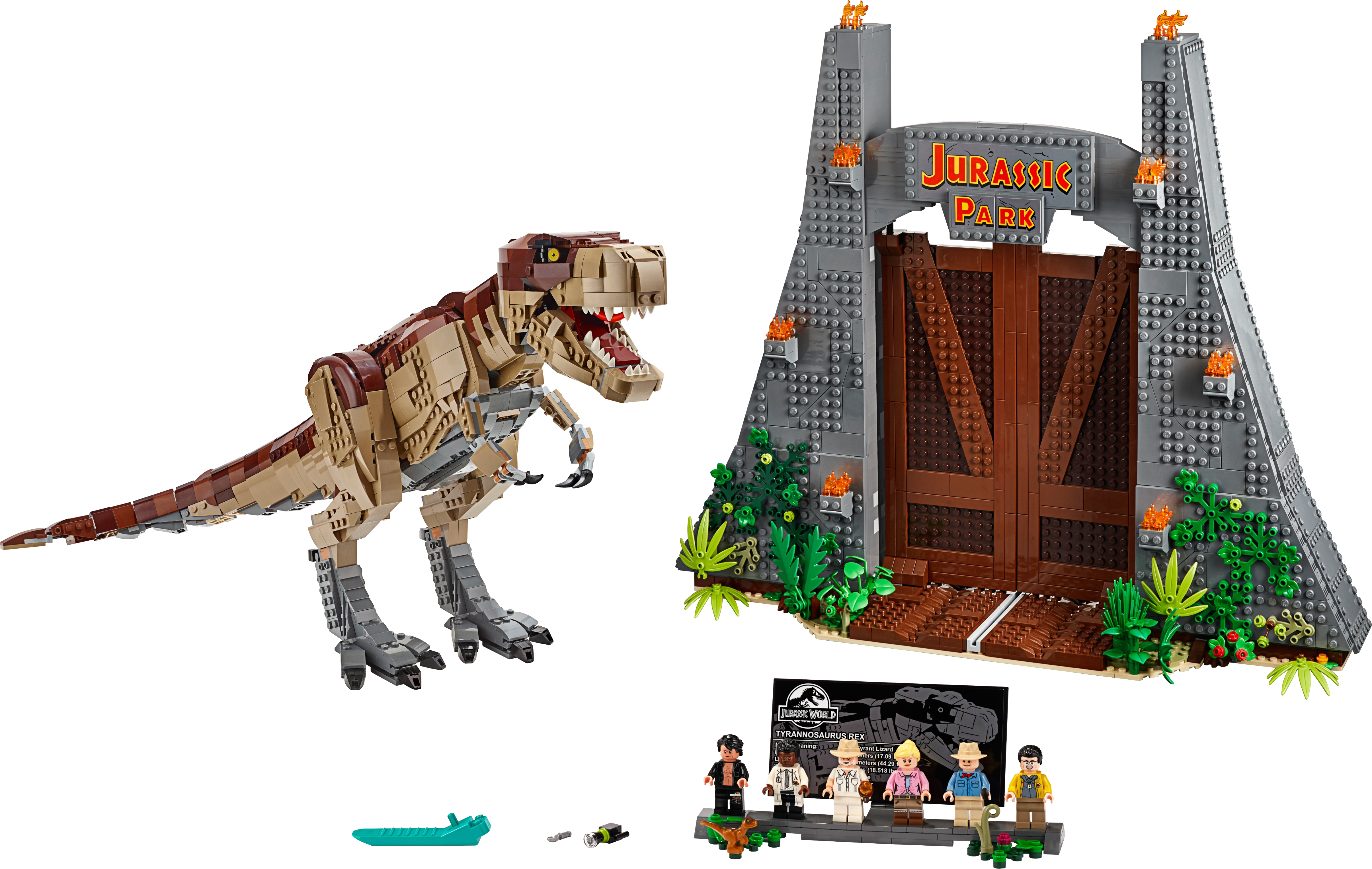 This dinosaur toy set includes 6 minifigures: John Hammond, Ian Malcolm, Ellie Sattler, Alan Grant, Ray Arnold and Dennis Nedry, plus a baby dinosaur figure. Brick-built LEGO® T. rex dinosaur toy features snapping jaws, posable head, arms, legs and tail. The brick-built LEGO® version of the original Jurassic Park's iconic gate has an opening function, jungle leaves and flame elements. The wall framing the gate features a buildable dinosaur nest with 2 cracked egg elements at the top and other brick-built scenes inspired by the movie, including: a bunker with a buildable bed for Ian Malcolm, flashlight and fire extinguisher, plus ladder and display case elements; power shed for scene with Ellie Sattler; John Hammond’s dining room with table and minifigure chair, plus ice cream, spoon and 3 cookie elements; Ray Arnold's control room with a buildable desk, 3 computers and a minifigure chair; scene with a buildable bathroom; scene for Dennis Nedry with a buildable mud slide and shaving cream can. This display toy model also includes a buildable minifigure display stand with T. rex facts plate. Accessory elements include John Hammond’s hat and cane, and Alan Grant’s hat and dinosaur claw. John Hammond, Ray Arnold and Dennis Nedry minifigures are new for June 2019. This collectible toy building set includes over 3,120 pieces and makes a great dinosaur gift for adults. Jurassic Park gate measures over 16” (42cm) high, 18” (48cm) wide and 5” (14cm) deep. T. rex dinosaur measures over 8” (22cm) high, 27” (69cm) long and 6” (17cm) wide.