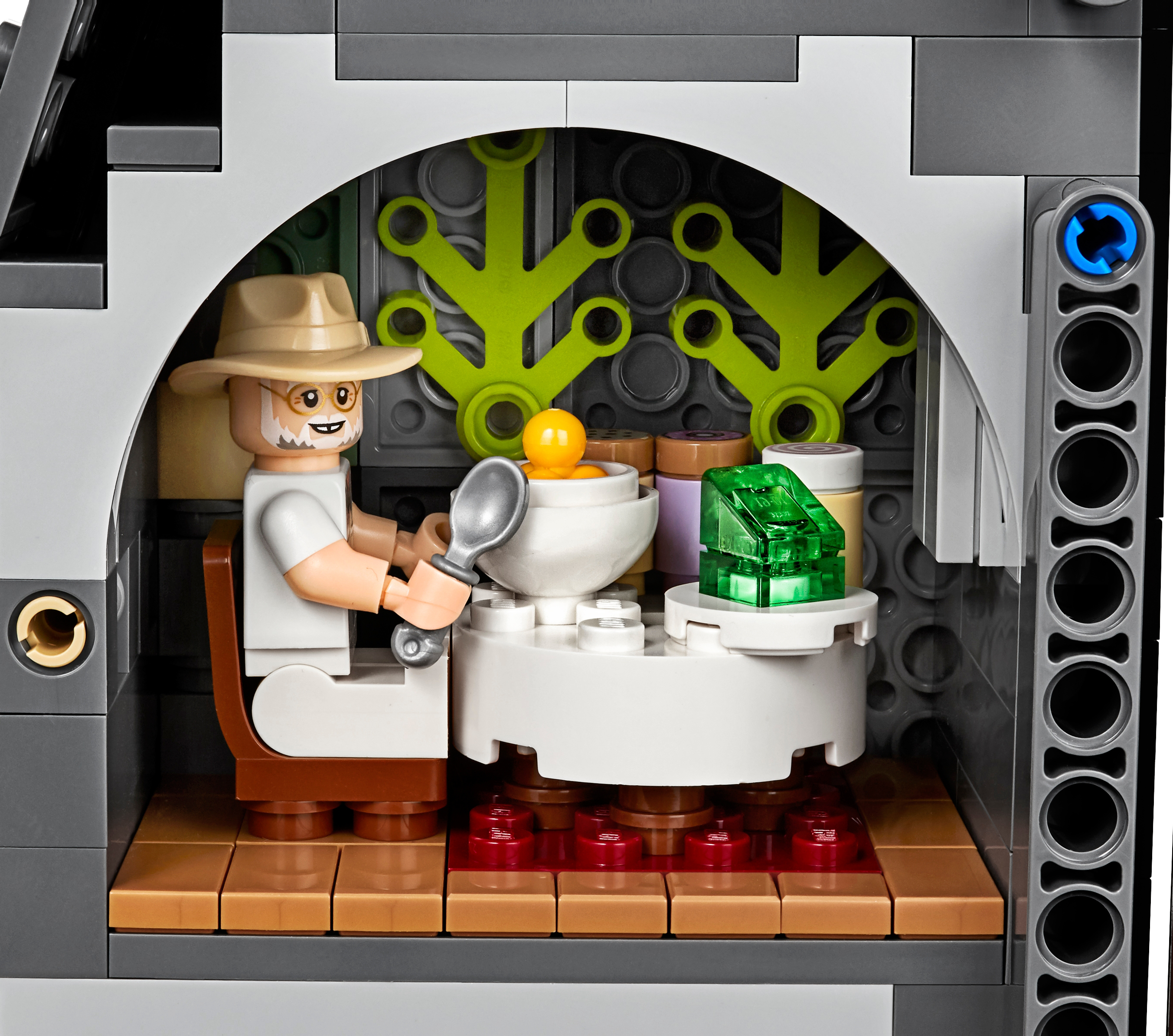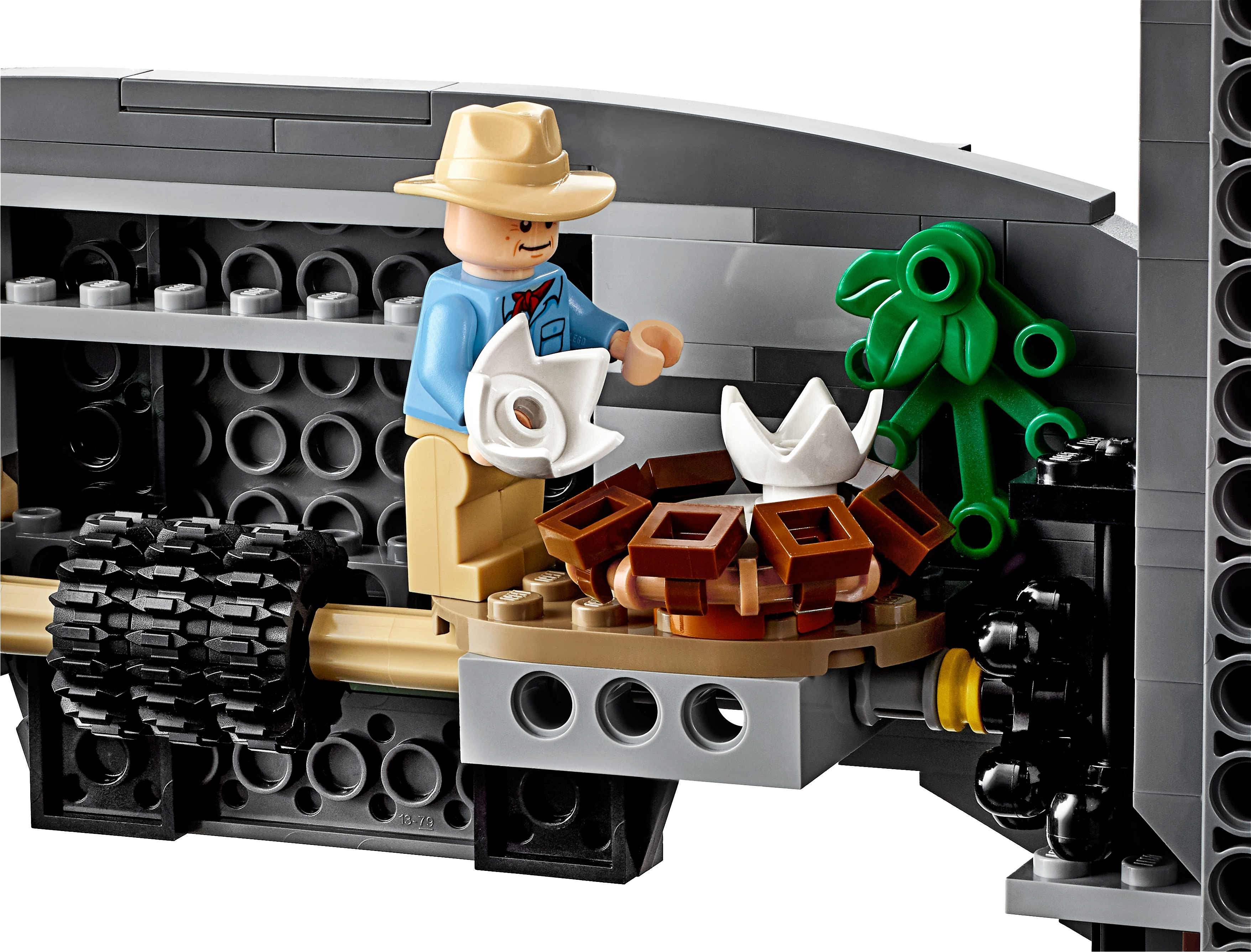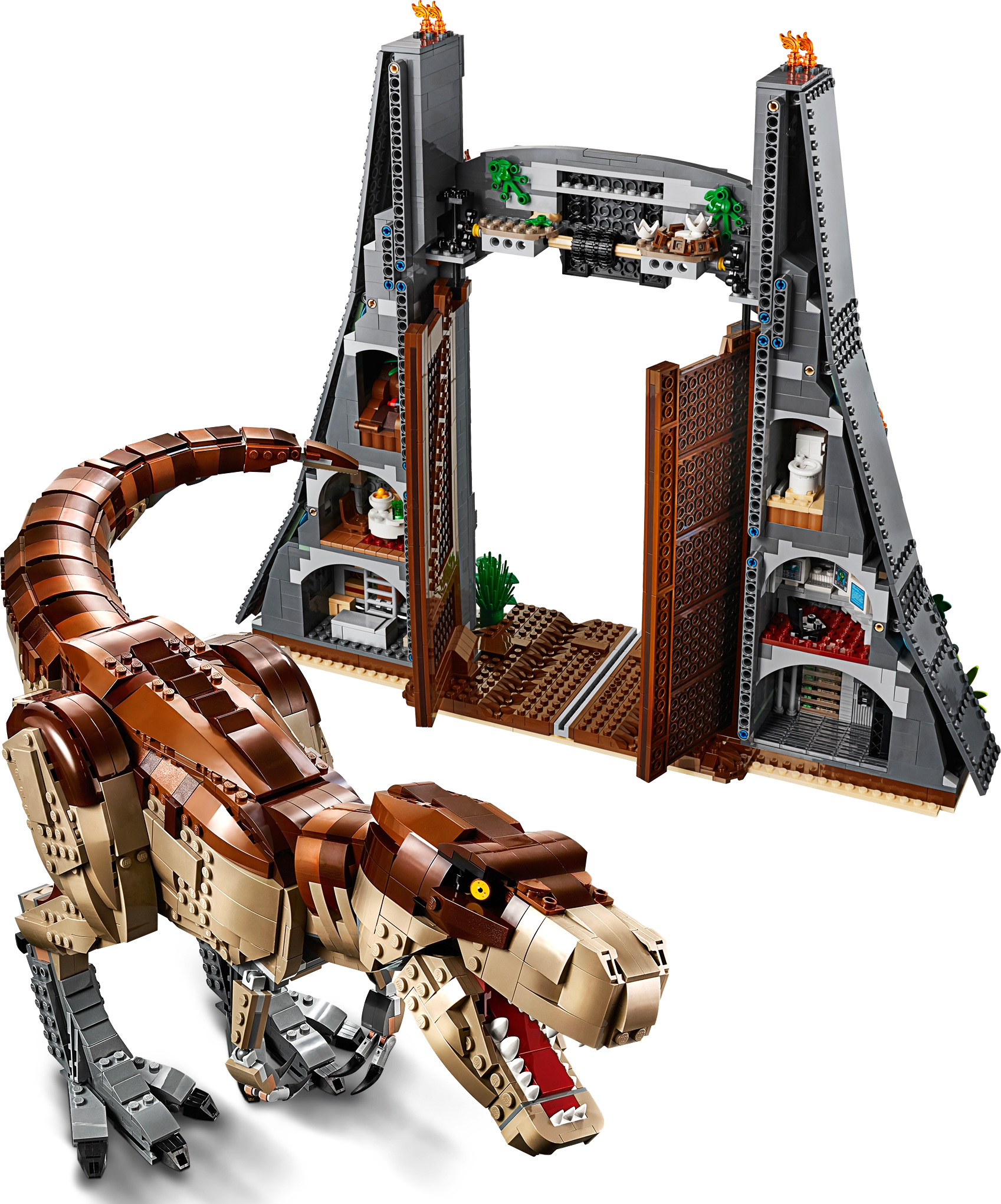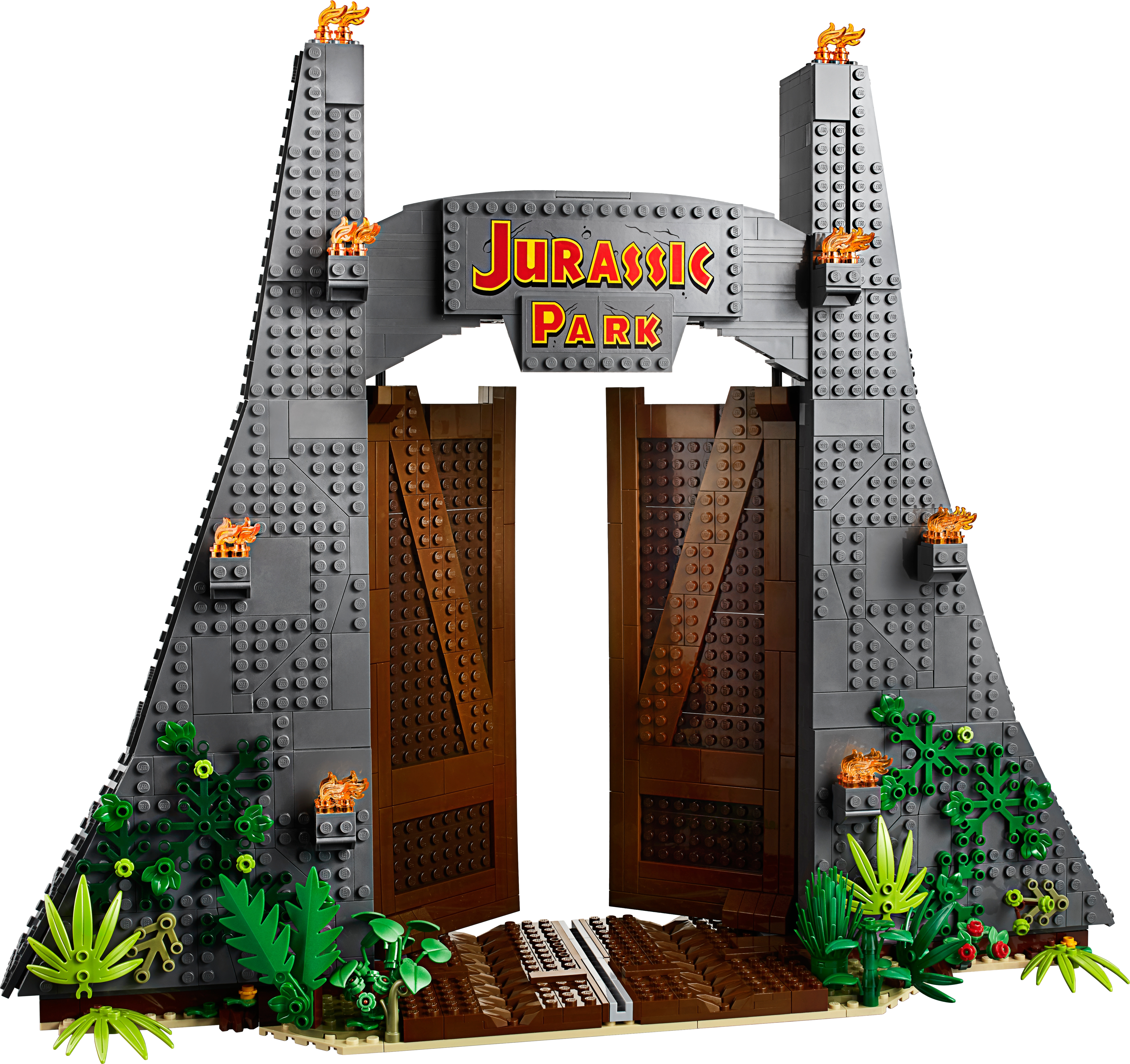 This dinosaur toy set includes 6 minifigures: John Hammond, Ian Malcolm, Ellie Sattler, Alan Grant, Ray Arnold and Dennis Nedry, plus a baby dinosaur figure. Brick-built LEGO® T. rex dinosaur toy features snapping jaws, posable head, arms, legs and tail. The brick-built LEGO® version of the original Jurassic Park's iconic gate has an opening function, jungle leaves and flame elements. The wall framing the gate features a buildable dinosaur nest with 2 cracked egg elements at the top and other brick-built scenes inspired by the movie, including: a bunker with a buildable bed for Ian Malcolm, flashlight and fire extinguisher, plus ladder and display case elements; power shed for scene with Ellie Sattler; John Hammond’s dining room with table and minifigure chair, plus ice cream, spoon and 3 cookie elements; Ray Arnold's control room with a buildable desk, 3 computers and a minifigure chair; scene with a buildable bathroom; scene for Dennis Nedry with a buildable mud slide and shaving cream can. This display toy model also includes a buildable minifigure display stand with T. rex facts plate. Accessory elements include John Hammond’s hat and cane, and Alan Grant’s hat and dinosaur claw. John Hammond, Ray Arnold and Dennis Nedry minifigures are new for June 2019. This collectible toy building set includes over 3,120 pieces and makes a great dinosaur gift for adults. Jurassic Park gate measures over 16” (42cm) high, 18” (48cm) wide and 5” (14cm) deep. T. rex dinosaur measures over 8” (22cm) high, 27” (69cm) long and 6” (17cm) wide.