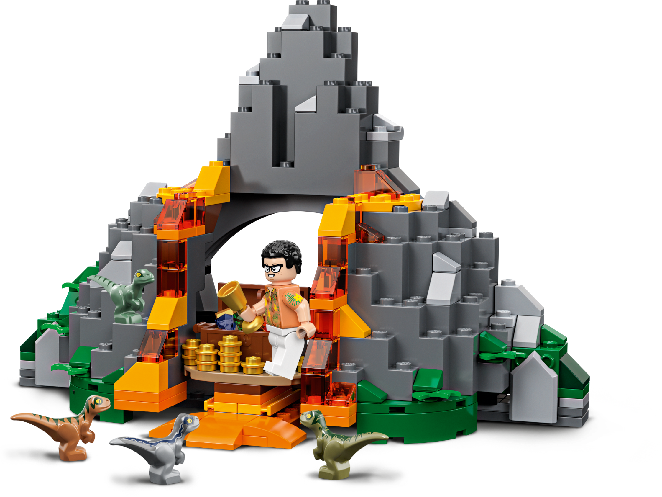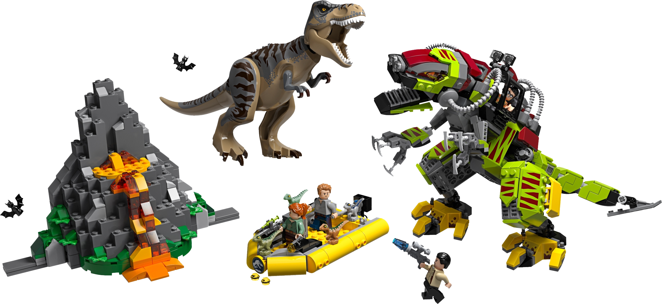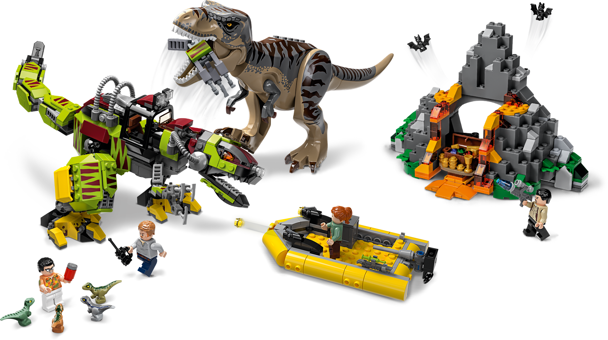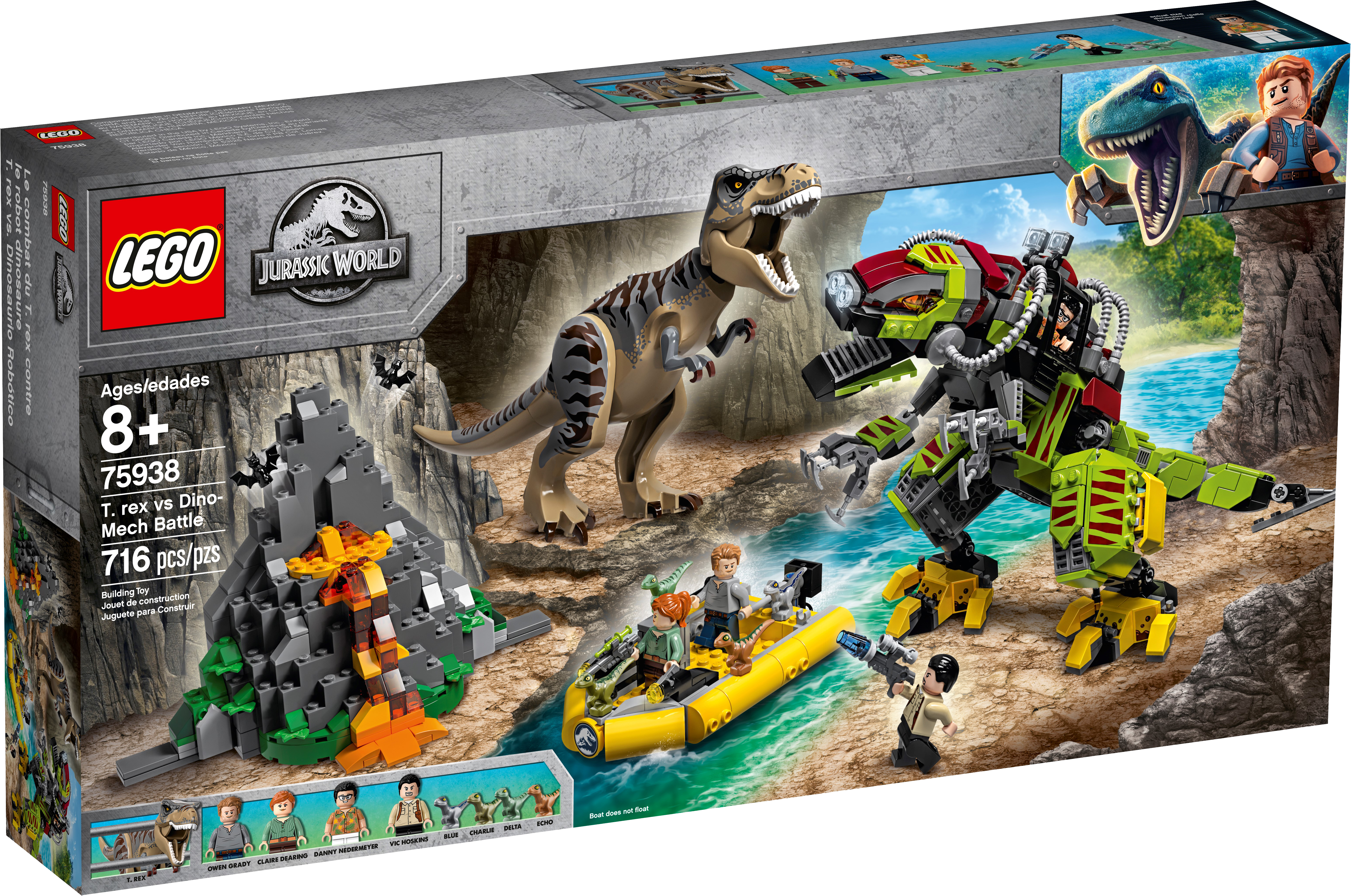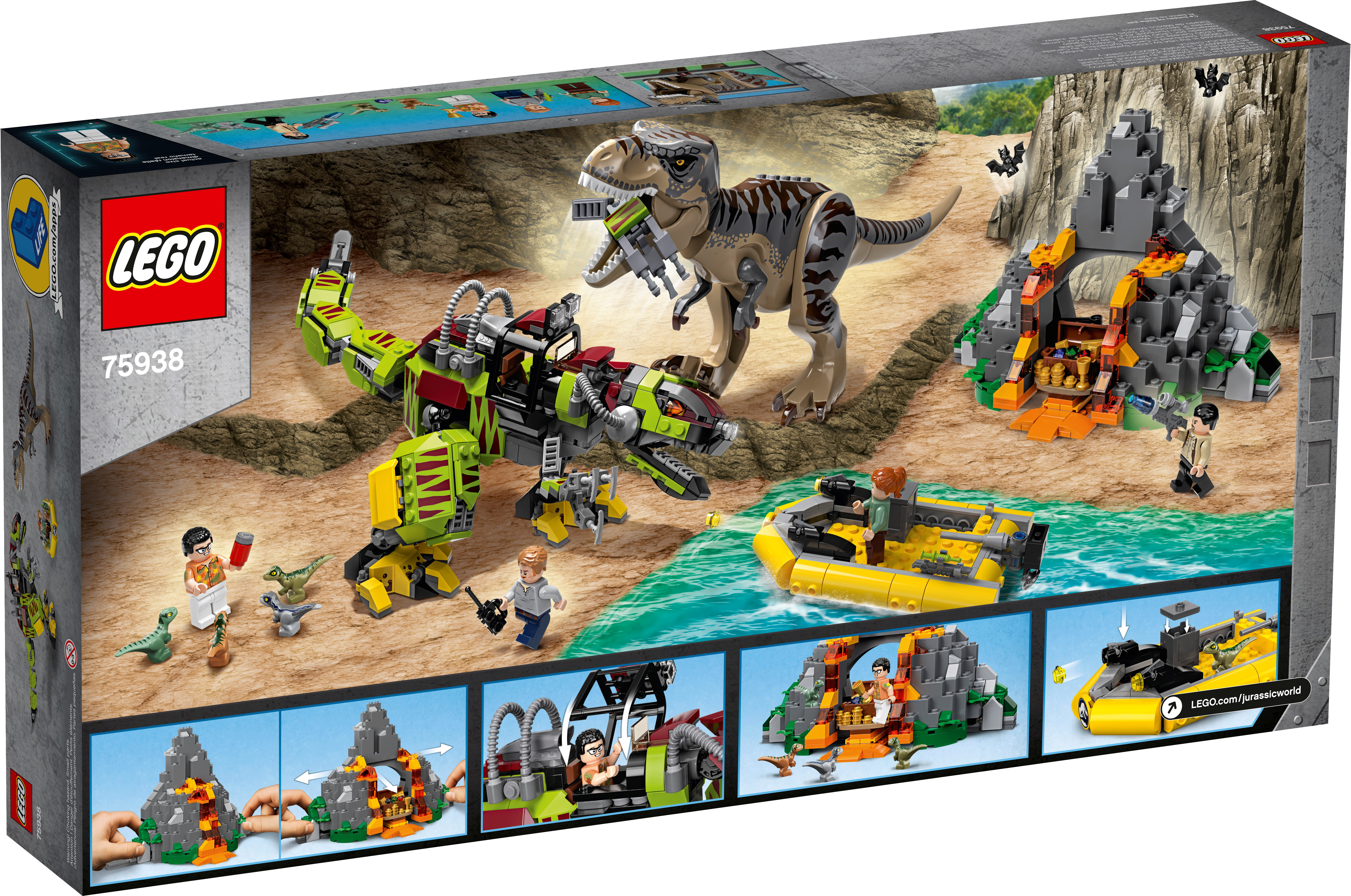 Action-packed dinosaur adventures are guaranteed as youngsters play out a LEGO® Jurassic World 75938 T. rex vs Dino-Mech Battle and seek hidden treasure in the Isla Nublar volcano. The buildable T. rex toy dinosaur figure and bad guy Danny Nedermeyer's Dino-Mech are both posable and have snapping jaws, while the buildable volcanic rock has an opening function to reveal a hidden treasure chest. This Jurassic World building toy also includes 4 minifigures, 4 baby velociraptor toy figures and a boat with 2 stud shooters and a tranquilizer gun to inspire kids to role-play Jurassic World scenes and create their own stories. This LEGO® Jurassic World dinosaur toy playset includes 4 new-for-June-2019 minifigures: Owen Grady, Claire Dearing, Vic Hoskins and Danny Nedermeyer, plus 4 baby velociraptor toy figures—Blue, Delta, Echo and Charlie—and 2 bat figures. Molded, buildable LEGO® Jurassic World T. rex toy dinosaur figure features new-for-June-2019 colors, snapping jaws and a posable head, arms and legs. Dino-Mech features an opening minifigure cockpit with detailed dashboard, snapping jaws, posable head, arms, claws, legs and a tail. LEGO® brick-built volcanic rock features lava elements, an opening function and a treasure chest with assorted treasure elements inside: 11 gold-colored coins, 4 gold-colored bars, 1 gold-colored cup and 4 gem elements. Toy boat features 2 stud shooters, a tranquilizer gun and ammo storage container with 4 ammo elements. (Please note: boat does not float in water.) This dinosaur toy playset for kids includes Vic Hoskins' tranquilizer gun. Accessory elements include Owen Grady’s walkie-talkie and Danny Nedermeyer’s soda can element. Kids can reimagine thrilling scenes from the LEGO® Jurassic World animated series with this collectible toy. This LEGO® Jurassic World toy construction set makes a great dinosaur gift for kids. Jurassic World T. rex dinosaur toy figure measures over 4” (11cm) high, 11” (28cm) long and 2” (6cm) wide. Dino-Mech measures over 5” (14cm) high, 12” (33cm) long and 5” (13cm) wide. Volcanic rock measures over 5” (14cm) high, 7” (20cm) wide and 5” (13cm) deep. Toy boat measures over 5” (13cm) long and 3” (8cm) wide.