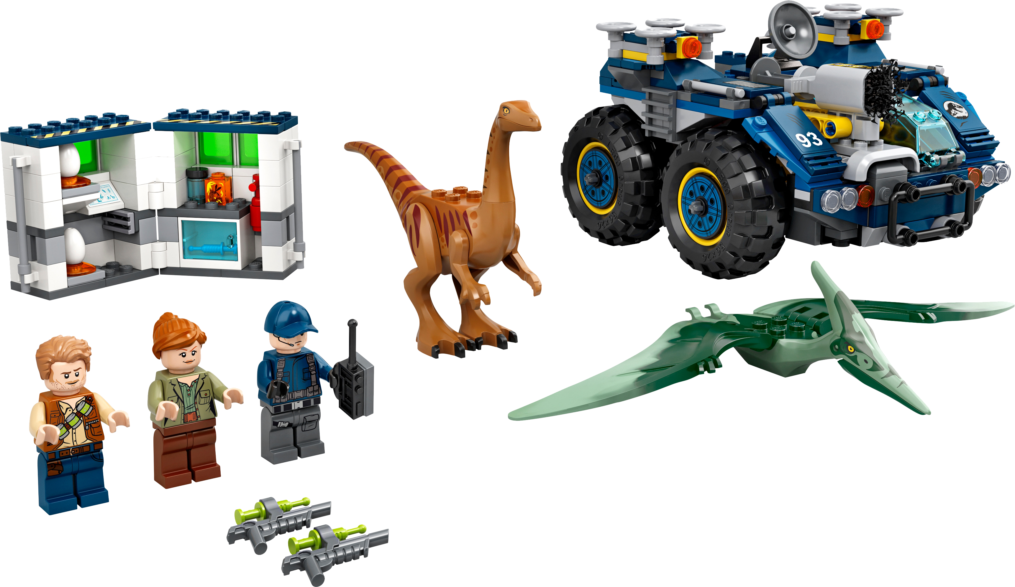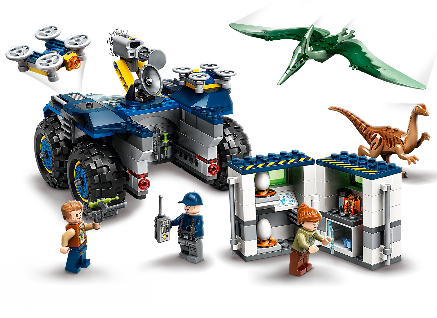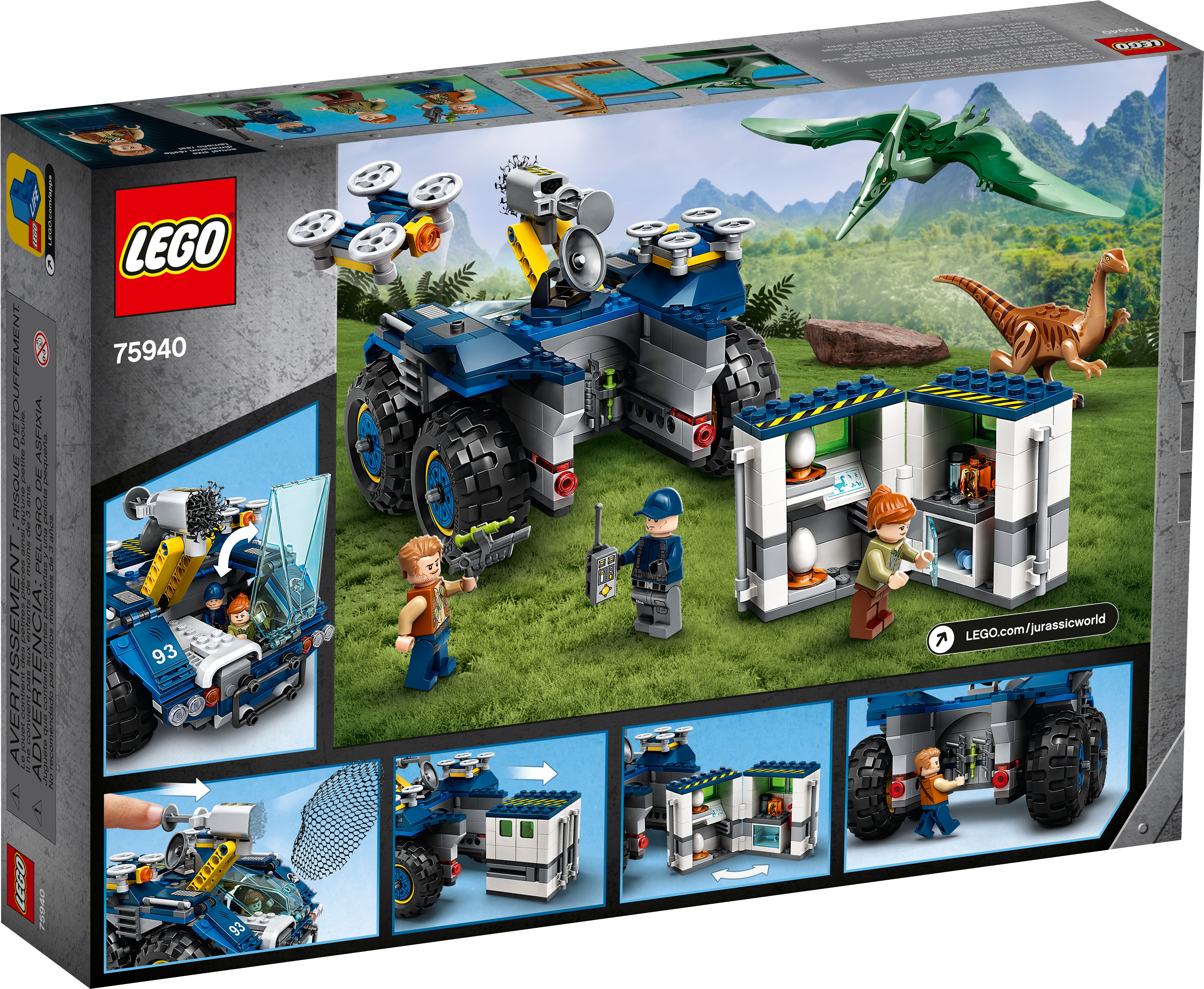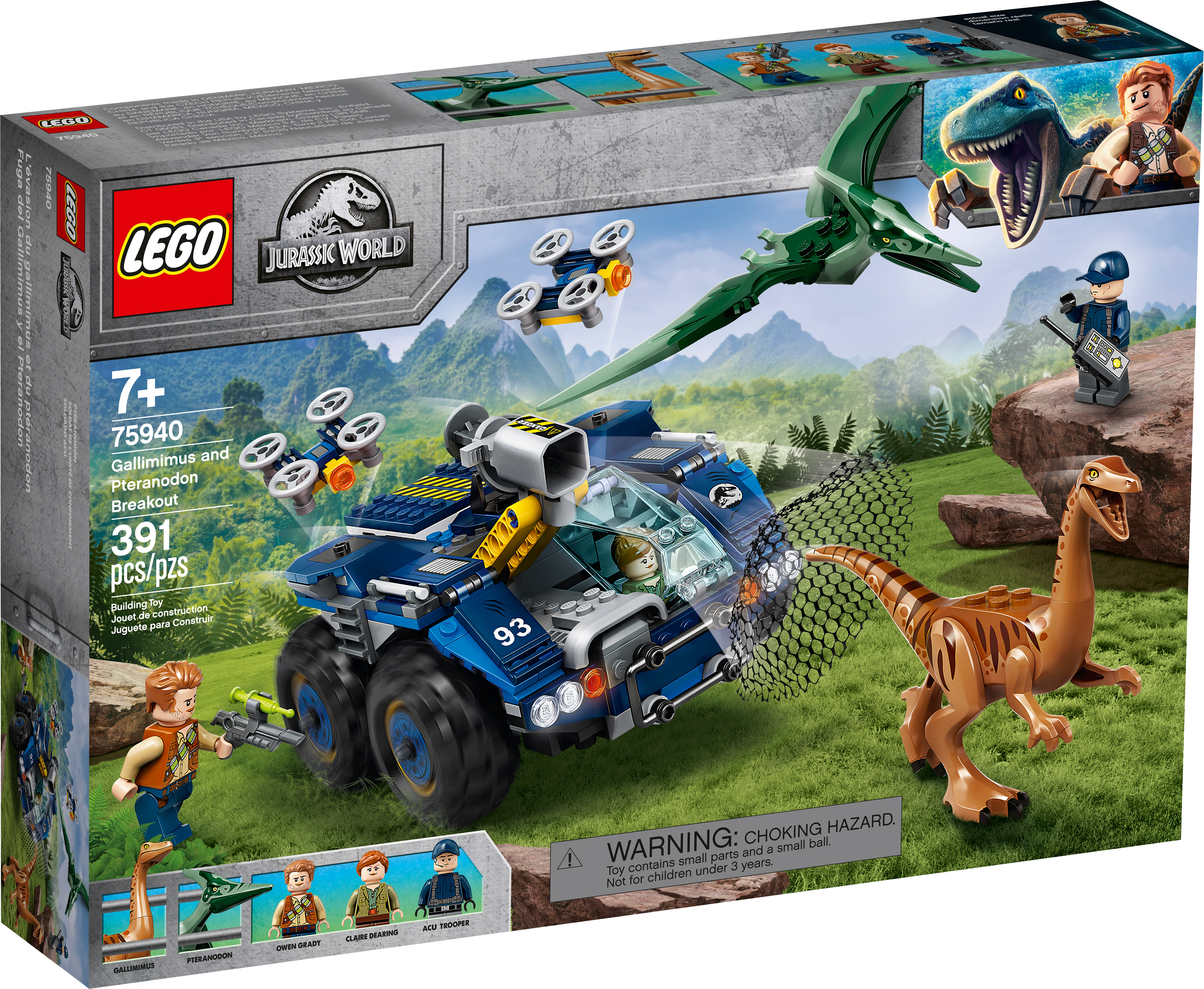 Kids can build their own LEGO® Jurassic World of dinosaur-chasing action with this Gallimimus and Pteranodon Breakout (75940) toy playset. It features a toy research vehicle with a dual minifigure cockpit, net shooter, 2 detachable drones, a removable mini lab and lots of accessory elements to inspire hours of creative solo or social play.Role-play adventuresThis building set for kids also includes 3 LEGO Jurassic World minifigures and an awesome Gallimimus dinosaur figure and Pteranodon toy figure to role-play exciting adventures. Clear, illustrated instructions mean that even if your youngster is new to LEGO toys, they can build with confidence right away.Dinosaur fun!Featuring molded, buildable dinosaur figures, minifigures, detailed vehicles and more, LEGO Jurassic World construction toys make awesome birthday presents for kids and fans of all ages. They can relive scenes from the animated series and movies, create new stories or just display the collectible models.Kids can pretend to be dinosaur experts tracking down escaped dinosaurs with this LEGO® Jurassic World Gallimimus and Pteranodon Breakout (75940) set, featuring a research vehicle with lots of fun features.This set includes 3 minifigures – Owen Grady, Claire Dearing and an ACU Trooper – plus new-for-June-2020, posable Gallimimus and Pteranodon toy figures, which children can catch with the research vehicle's net shooter.The research vehicle features a dual minifigure cockpit, 2 detachable drones, a removable, foldout lab and many elements, including 2 dinosaur eggs, tranquilizing gun and needle and a drone remote, to create new stories.This 391-piece LEGO® playset offers a fun and rewarding creative challenge for boys and girls aged 7 and up, and makes a super present for kids on birthdays, at Christmas or for any special occasion.The buildable toy vehicle measures over 3” (10cm) high, 6” (16cm) long and 5” (14cm) wide – and this action-packed playset can be combinedwith other LEGO® Jurassic World sets for even more creative play options.This fun LEGO® Jurassic World building toy is powered by creative kids’ free-thinking – no batteries required – so the dinosaur action adventures never stop!Is your youngster new to LEGO® sets? Don't worry. This Jurassic World dinosaur toy building kit for kids comes with easy-to-follow, illustrated instructions so they can open the box and build with confidence.LEGO® Jurassic World building sets are fabulous for kids and adult fans, letting them relive scenes from the animated series and movies, create new dinosaur adventures or just build and display the collectible figurines.Young builders don’t need dinosaur strength to connect or pull apart LEGO® bricks! Since 1958, LEGO bricks have met the highest industry standards and our own quality criteria to ensure consistency and robust building.LEGO® bricks and pieces are tested in almost every way you can imagine, ensuring that each playset meets the highest global safety and quality standards – and is possibly even dinosaur-proof!