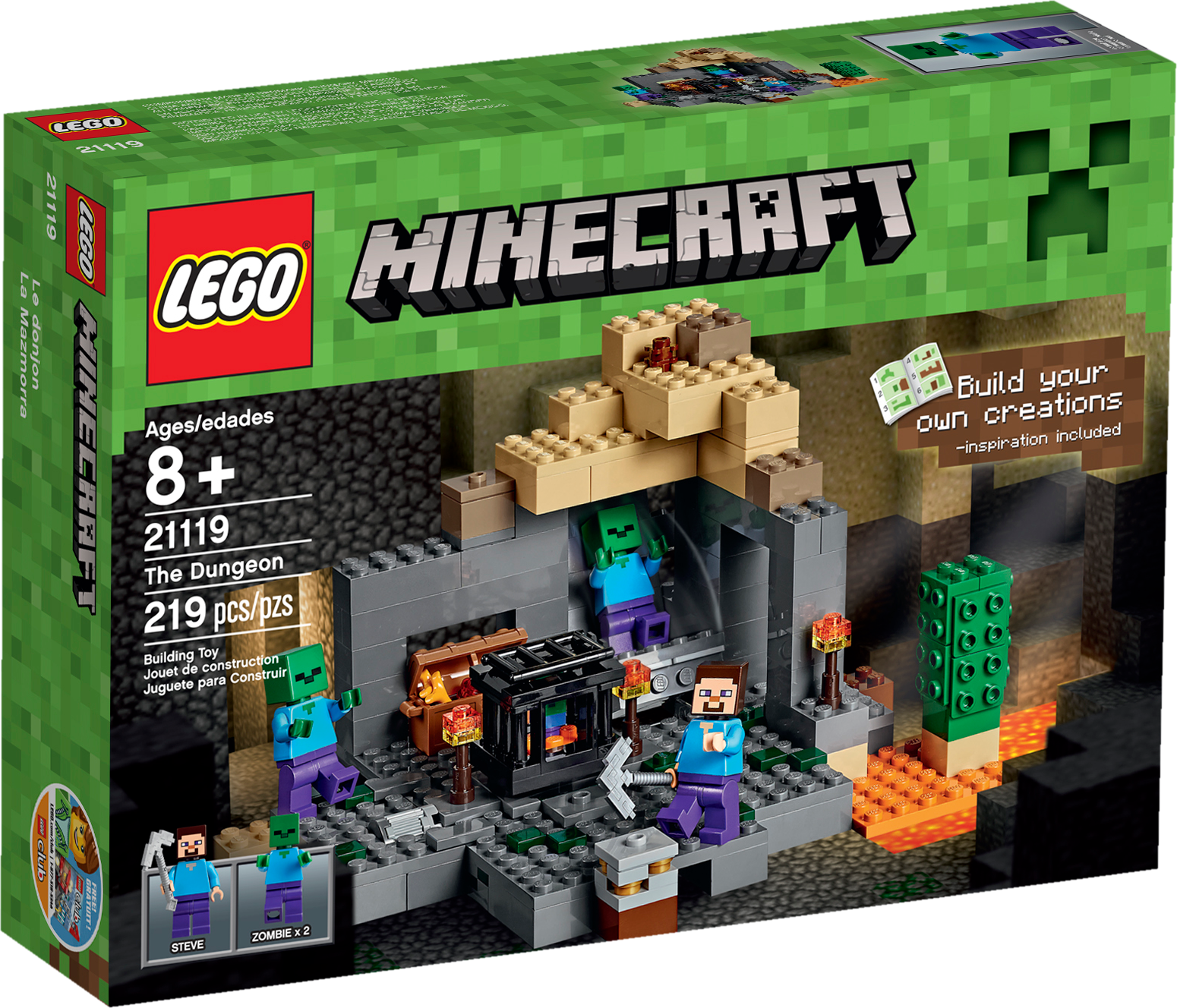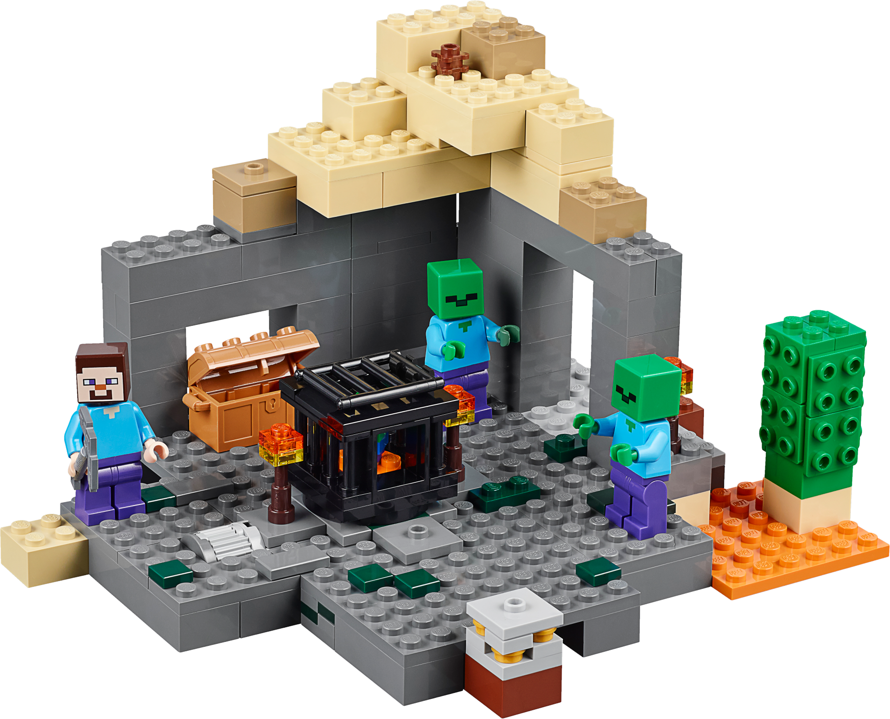 Enter the zombie-spawning dungeon at your peril! Venture into The Dungeon on a perilous quest for valuable ores! Craft torches from your resources to light your way and disable the mob spawner. Wield your iron pickaxe to defeat the roaming zombies, then mine the gold ore and grab the chest containing wheat and redstone. But watch out… zombies can spawn anywhere! Rebuild the set for more LEGO® Minecraft™ creations! Includes 3 minifigures with assorted accessories: Steve and 2 zombies. Includes 3 minifigures with assorted accessories: Steve and 2 zombies The Dungeon features a spawner with rotating function, secret opening wall where zombies can spring a surprise attack, chest with wheat and redstone elements, 3 buildable torches, brick-built cactus, moss stone block element and a gold ore element Sand-colored roof section can be removed and added to bottom section to enlarge the playing area or rebuilt into a set of stairs for exiting the dungeon Includes Steve’s pickaxe Includes 219 assorted LEGO® pieces Set your imagination free! Experience The Dungeon! Launch a surprise zombie attack! Rotate the spawner! The perfect gift for fans of LEGO® building and Minecraft™ Rebuild for more Minecraft™ creations Measures 3” (9cm) high, 7” (19cm) wide and 6” (17cm) deep Combine this biome with others in the series to create your own LEGO® Minecraft™ world