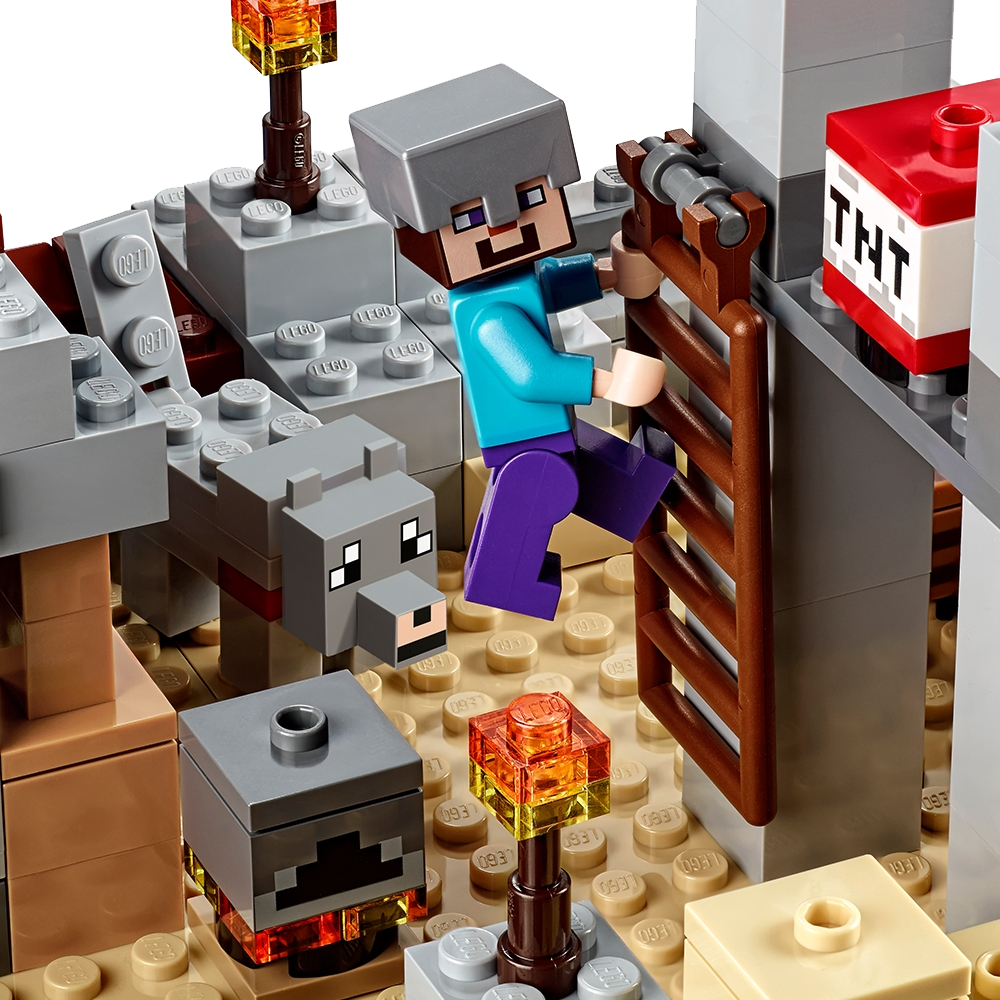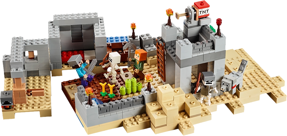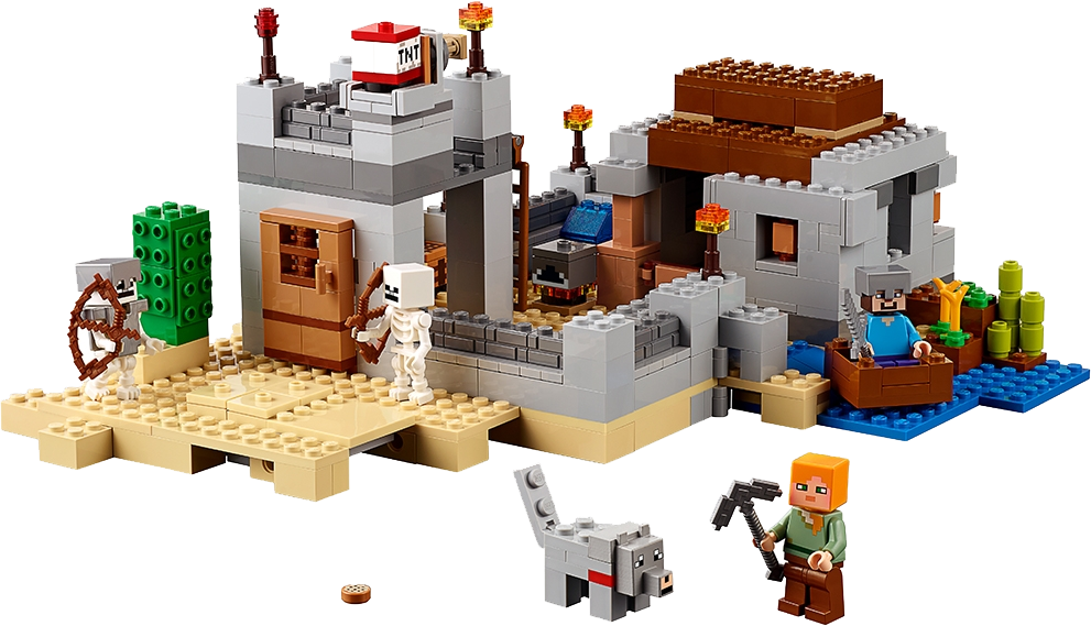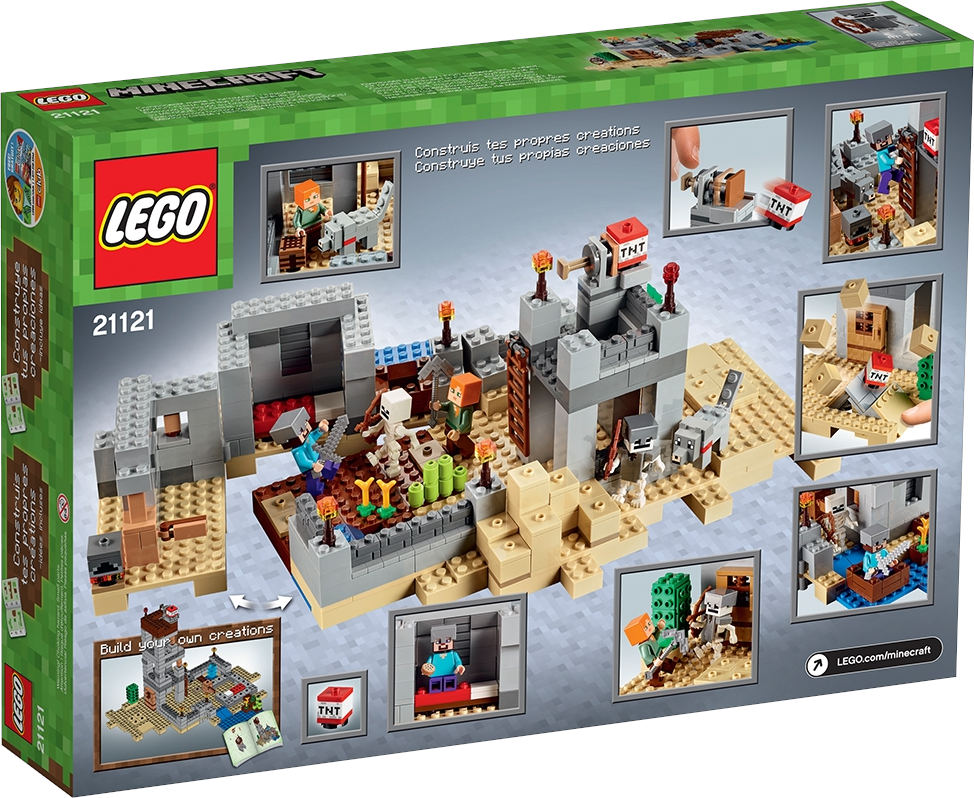 Prepare for battle at The Desert Outpost! Hostile mobs are spawning like never before, and the desert is becoming a very scary place to be… it’s time to build The Desert Outpost! Help Alex construct the house and lookout tower, build a protective wall and ring the fortress with burning torches. Have the tame wolf stand guard while you craft a bed, table, door, ladder and a boat, then sail out in search of crops to farm within the outpost walls. As darkness falls, silhouettes of approaching skeletons appear on the desert horizon. Grab your weapons, load up the TNT launcher, and prepare for battle! Rebuild the set for more LEGO® Minecraft™ creations! Includes 2 minifigures with assorted weapons and accessories: Steve and Alex, plus a wolf and 2 skeletons. Includes 2 minifigures with assorted weapons and accessories: Steve and Alex, plus a wolf and 2 skeletons Features a fortress with house and lookout tower, TNT launch and explode function, buildable boat, crafting table, door, ladder, 4 buildable torches, buildable redstone torch, buildable cactus and wheat and sugar cane elements House features an opening door and removable roof for access to the interior Weapon elements include a sword, 2 skeleton bows and a pickaxe Accessory elements include skeleton’s armor Includes 519 assorted LEGO® pieces Set your imagination free! Experience The Desert Outpost Sail out in search of supplies! Launch the TNT to defeat the skeleton army! The perfect gift for fans of LEGO® building and Minecraft™ Rebuild for more LEGO® Minecraft™ creations Measures 4” (11cm) high, 10” (27cm) wide and 13” (34cm) deep Combine this biome with others in the series to create your own LEGO® Minecraft™ world
