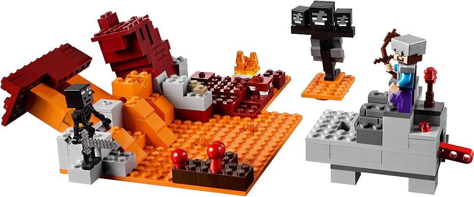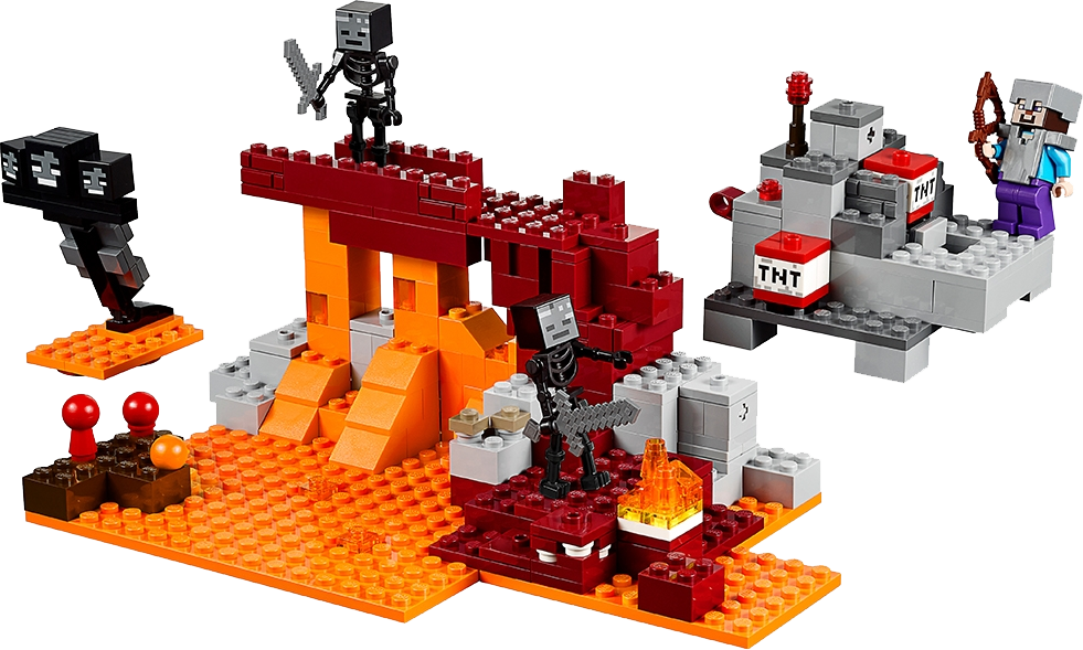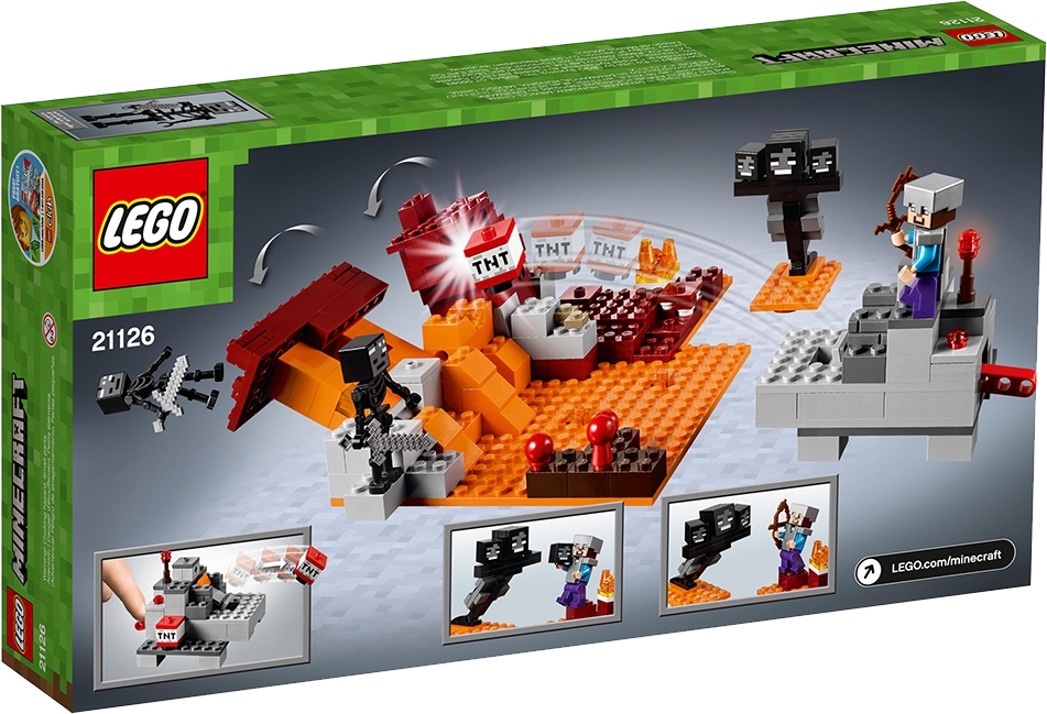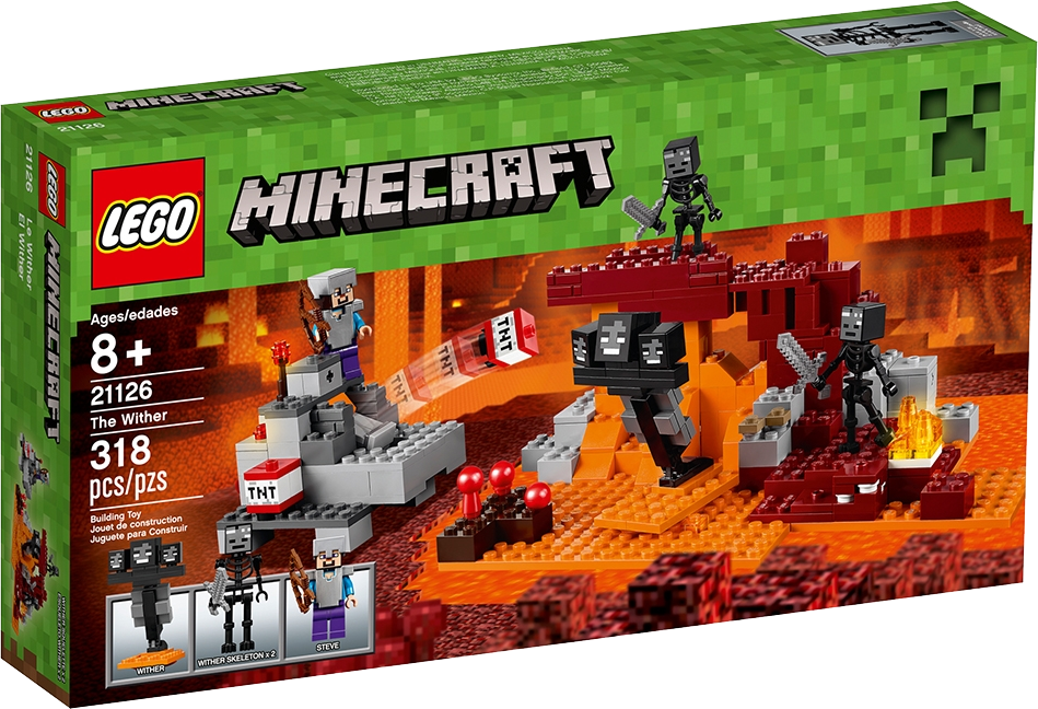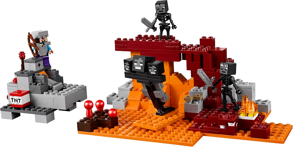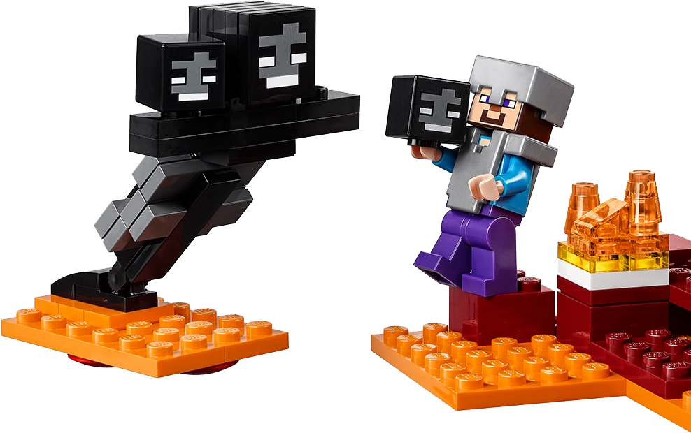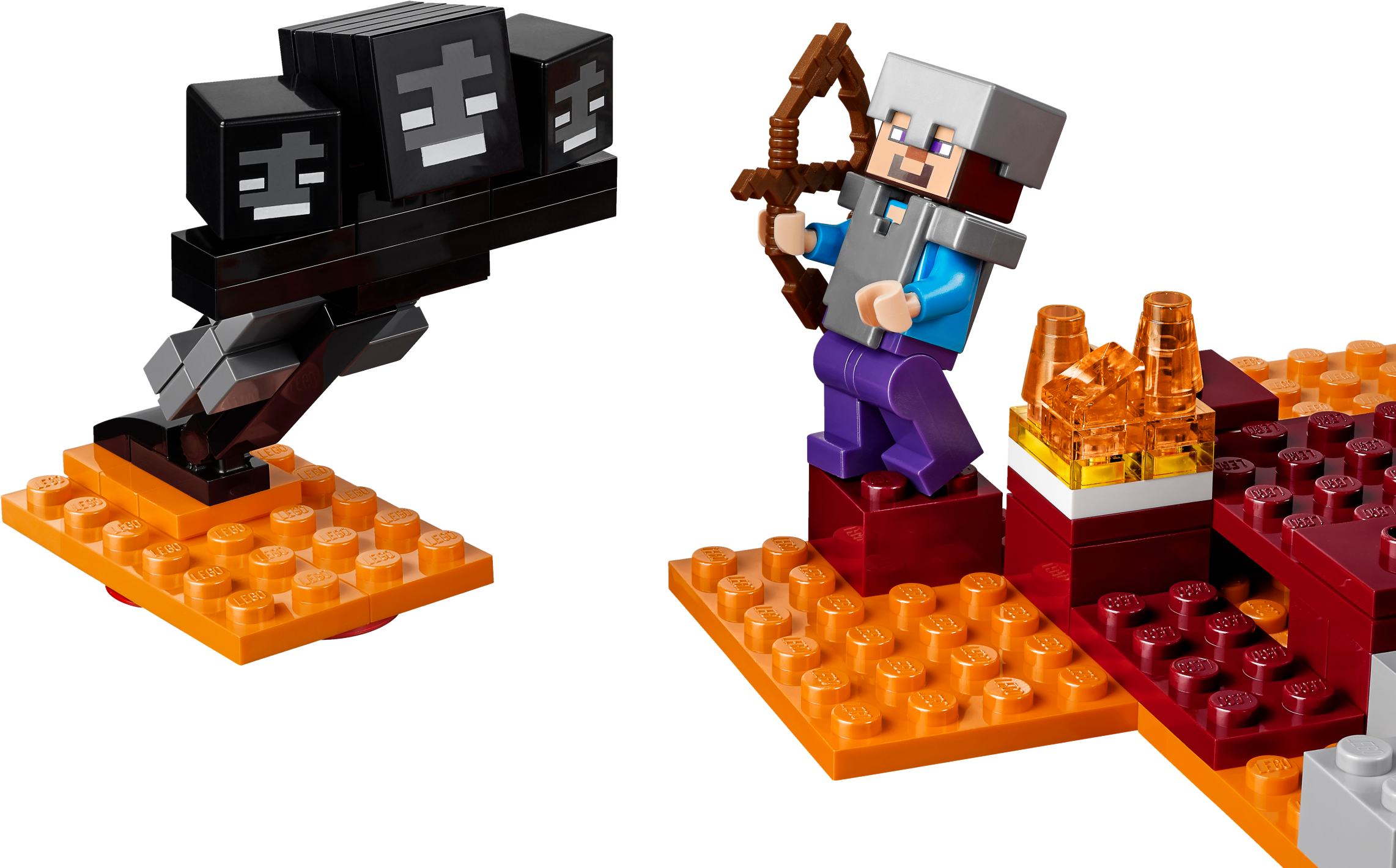 Prepare to battle the wither! You’ve discovered a fortress defended by the fearsome, 3-headed wither and 2 wither skeletons, deep within the Nether. The forbidding structure holds vital supplies, such as nether wart and mushrooms. Use your Minecraft™ know-how to build a TNT cannon. Then don your iron armor and helmet, grab your bow and launch a surprise attack! Fire the powerful cannon and bring the fortress walls crashing down! Then muster all your strength, reload and fight to survive! Includes a Steve minifigure, plus a wither and 2 wither skeletons. Put on your iron armor, grab your bow and prepare for battle. Look out for the wither skeletons with their stone swords. Build the TNT cannon and open fire on the nether fortress! The nether fortress includes a tumbling wall function. Accessory elements include Steve’s armor and helmet, 2 blocks of TNT, fire, nether quartz ore and nether wart. Weapons include Steve’s bow and 2 swords. Fold out the set to create more rooms. Set your imagination free—rebuild the set for more LEGO® Minecraft™ creations! Includes more than 300 LEGO® bricks. Measures over 3” (8cm) high, 7” (19cm) wide and 5” (15cm) deep.