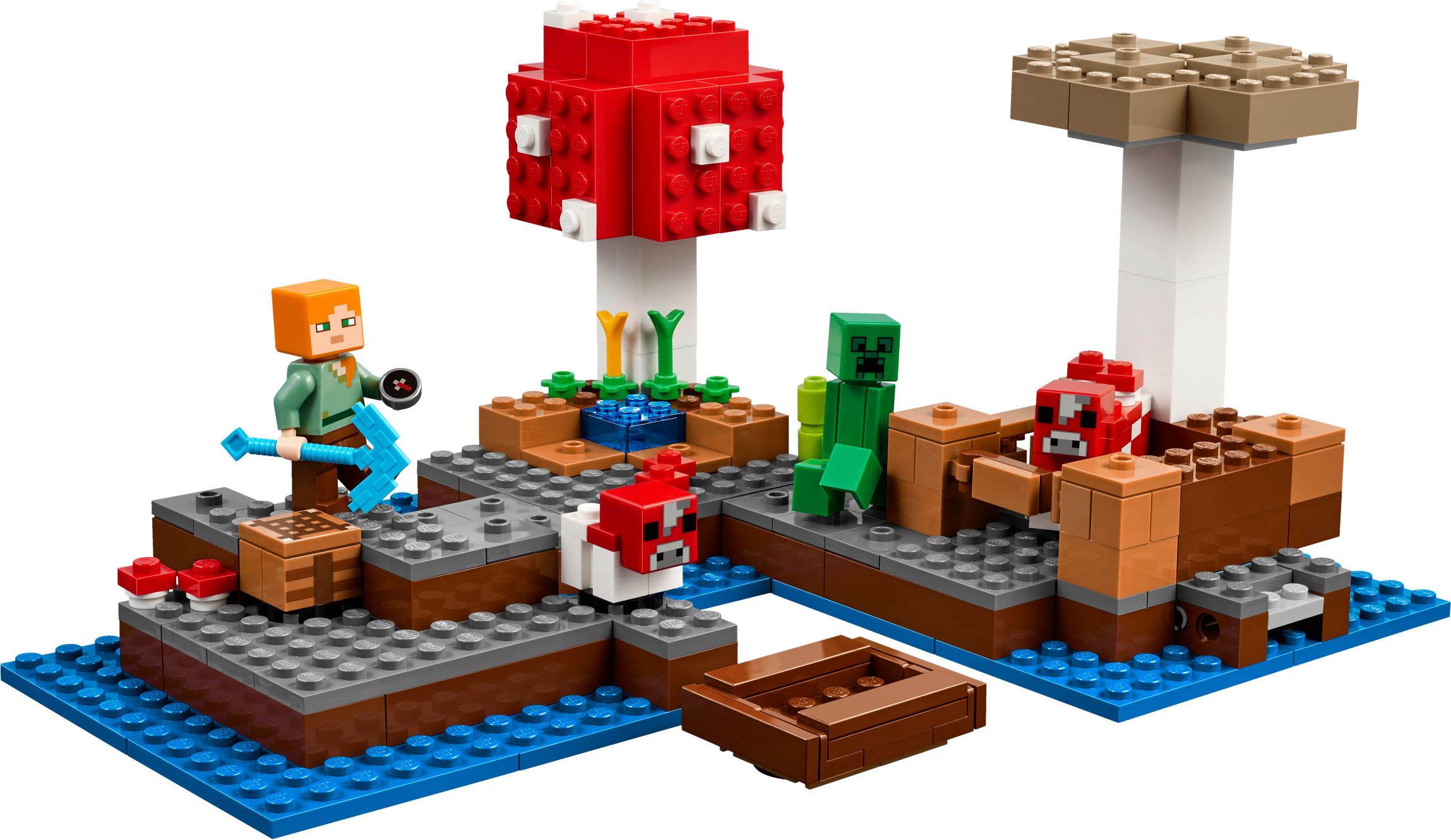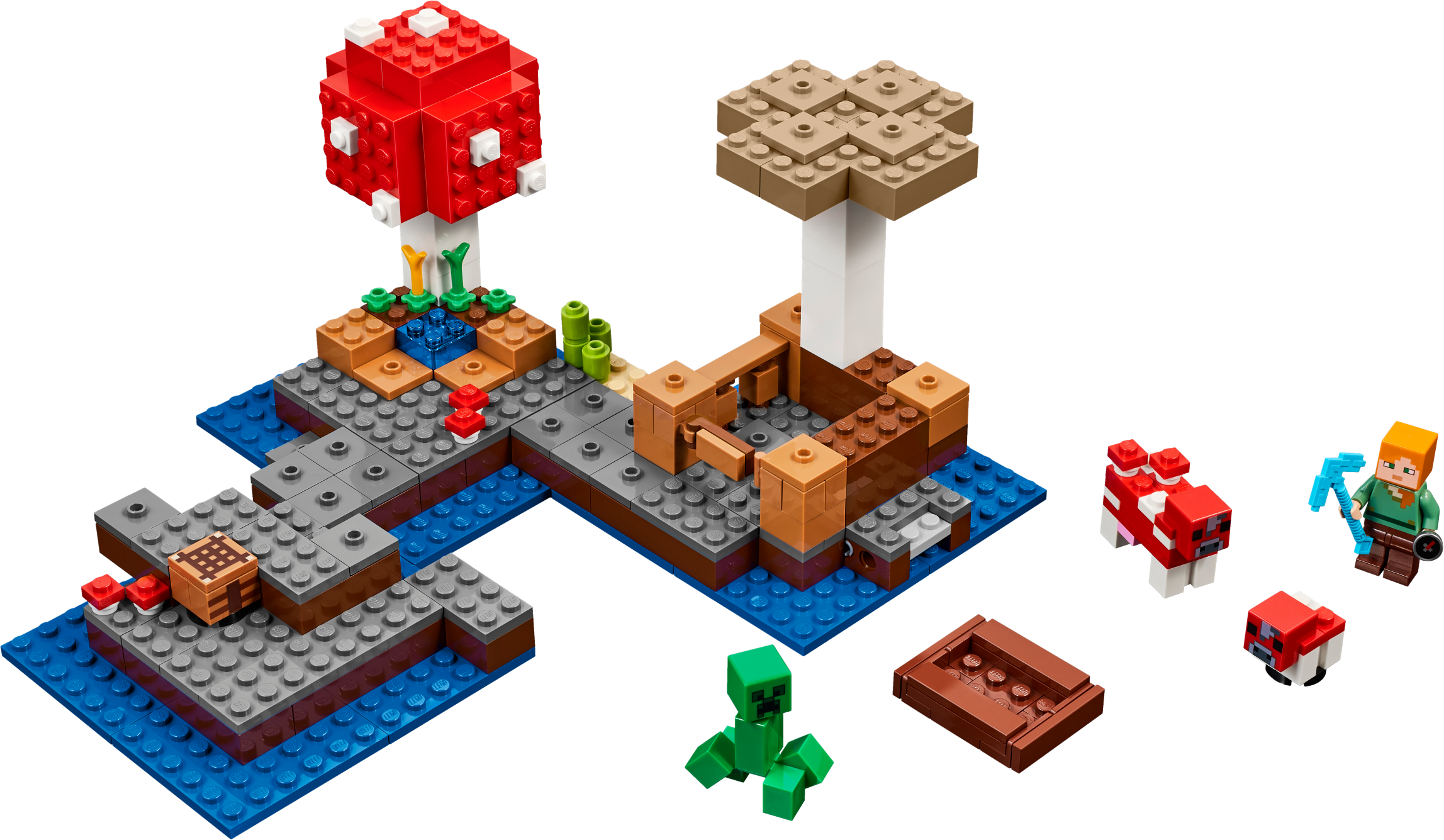 Sail out on a new Minecraft™ adventure to discover The Mushroom Island, mine vital supplies, grow crops and nurture the mooshroom and her baby. Enjoy hands-on Minecraft adventures featuring your favorite characters and objects with this easy-to-reconfigure, modular LEGO® Minecraft set, complete with explosion function—designed for young fans of the highly successful sandbox video game. Includes an Alex minifigure and a Creeper™.Includes an Alex minifigure, plus a mooshroom, baby mooshroom and a Creeper™.Features a Minecraft™ Mushroom Island with a huge red mushroom, huge brown mushroom, buildable boat and crafting table, and an animal pen with exploding fence function.Activate the exploding Creeper™ function to blast open the animal pen.Accessory elements include Alex’s pickaxe and a compass.Easy-to-reconfigure modular design with three alternative model configurations.Set your imagination free—rebuild the set for more LEGO® Minecraft™ creations!This set includes over 240 pieces and offers an age-appropriate build and play experience for ages 8+.Measures over 4” (11cm) high, 7” (20cm) wide and 7” (19cm) deep.