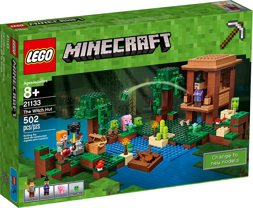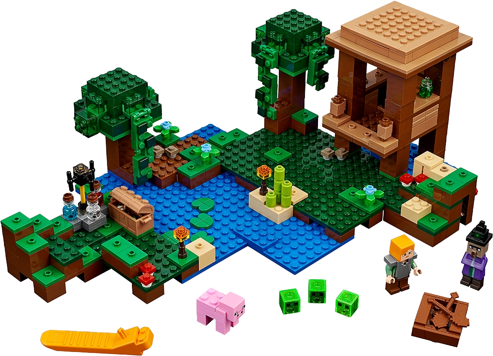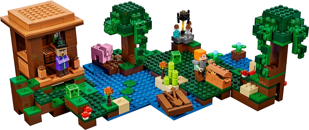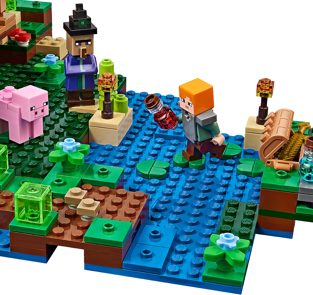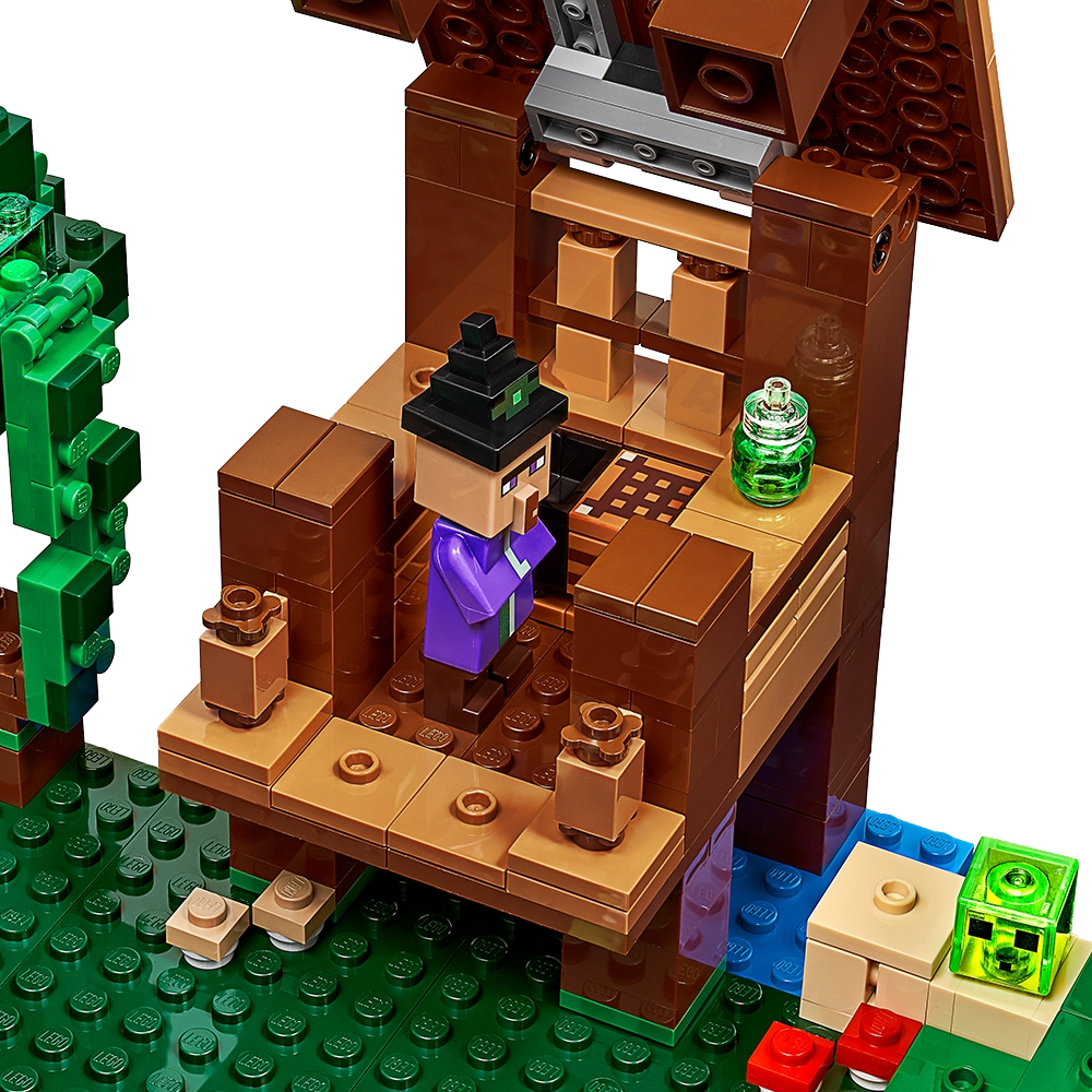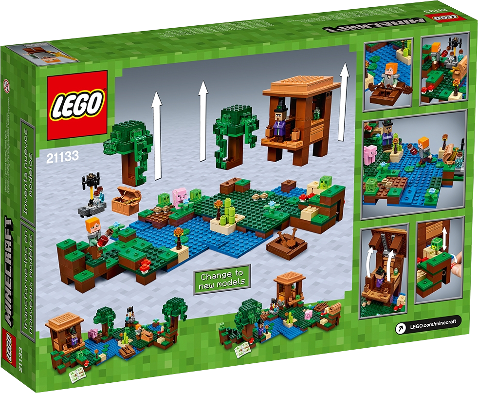 Navigate your boat through the Minecraft™ swamp to the witch’s hut. Create potions, activate the jumping slime function and defeat the dangerous witch! Enjoy hands-on Minecraft adventures featuring your favorite characters and objects with this easy-to-reconfigure, modular LEGO® Minecraft set—designed for young fans of the highly successful sandbox video game. Includes an Alex minifigure, plus a pig and three slimes.Includes an Alex minifigure, plus a witch, pig and three slimes.Features a swamp area with water trees, vines, lily pads and a witch hut with crafting table, cauldron, mushrooms, plus a brewing stand, potions and a boat with two oars.Press the lever to activate the jumping slime function!Lift the hinged roof to access the witch’s hut.Easy-to-reconfigure modular design with three alternative model configurations.Set your imagination free—rebuild the set for more LEGO® Minecraft™ creations!This set includes over 500 pieces and offers an age-appropriate build and play experience for ages 8+.Measures over 4” (12cm) high, 11” (29cm) wide and 9” (25cm) deep.