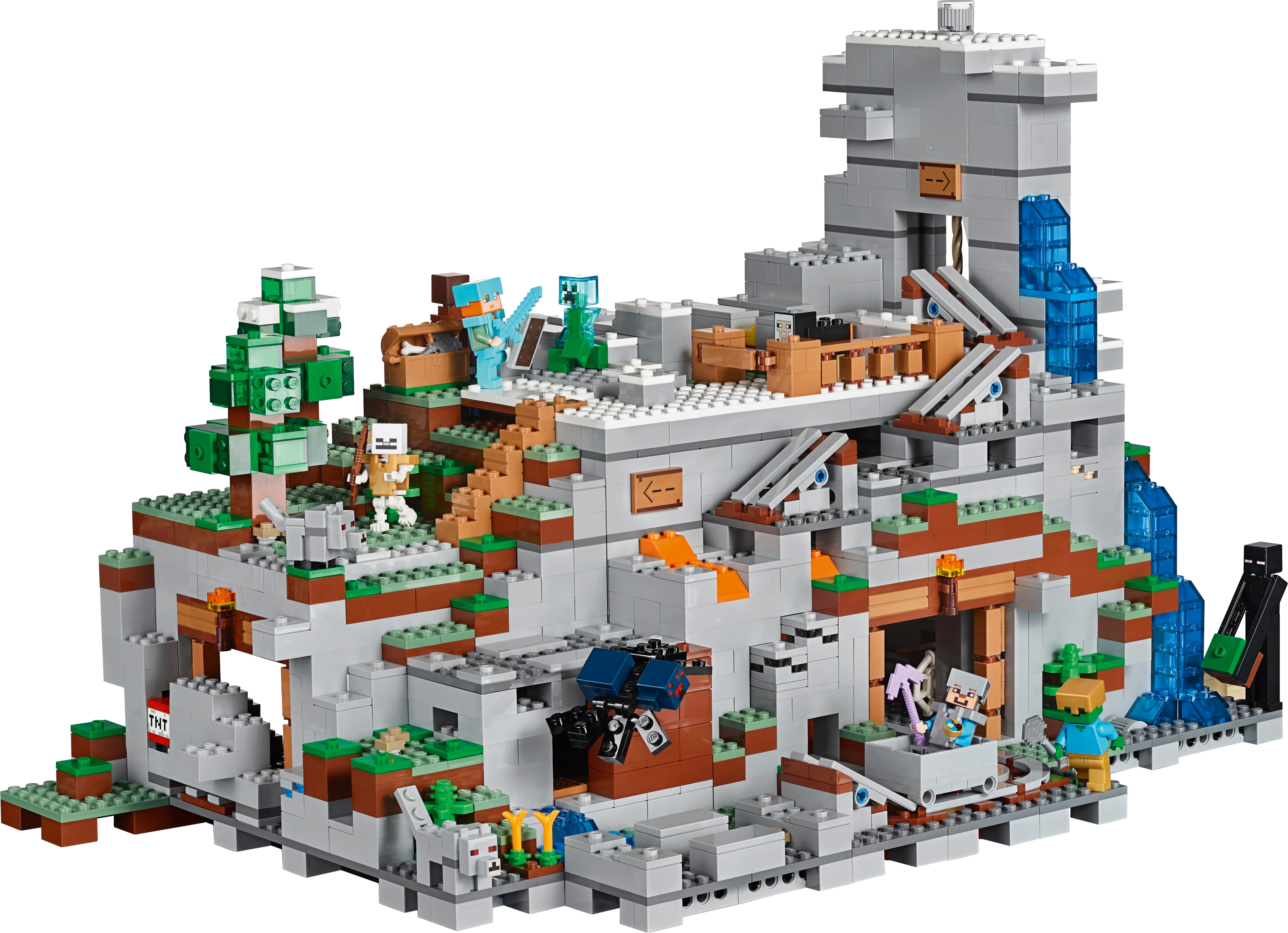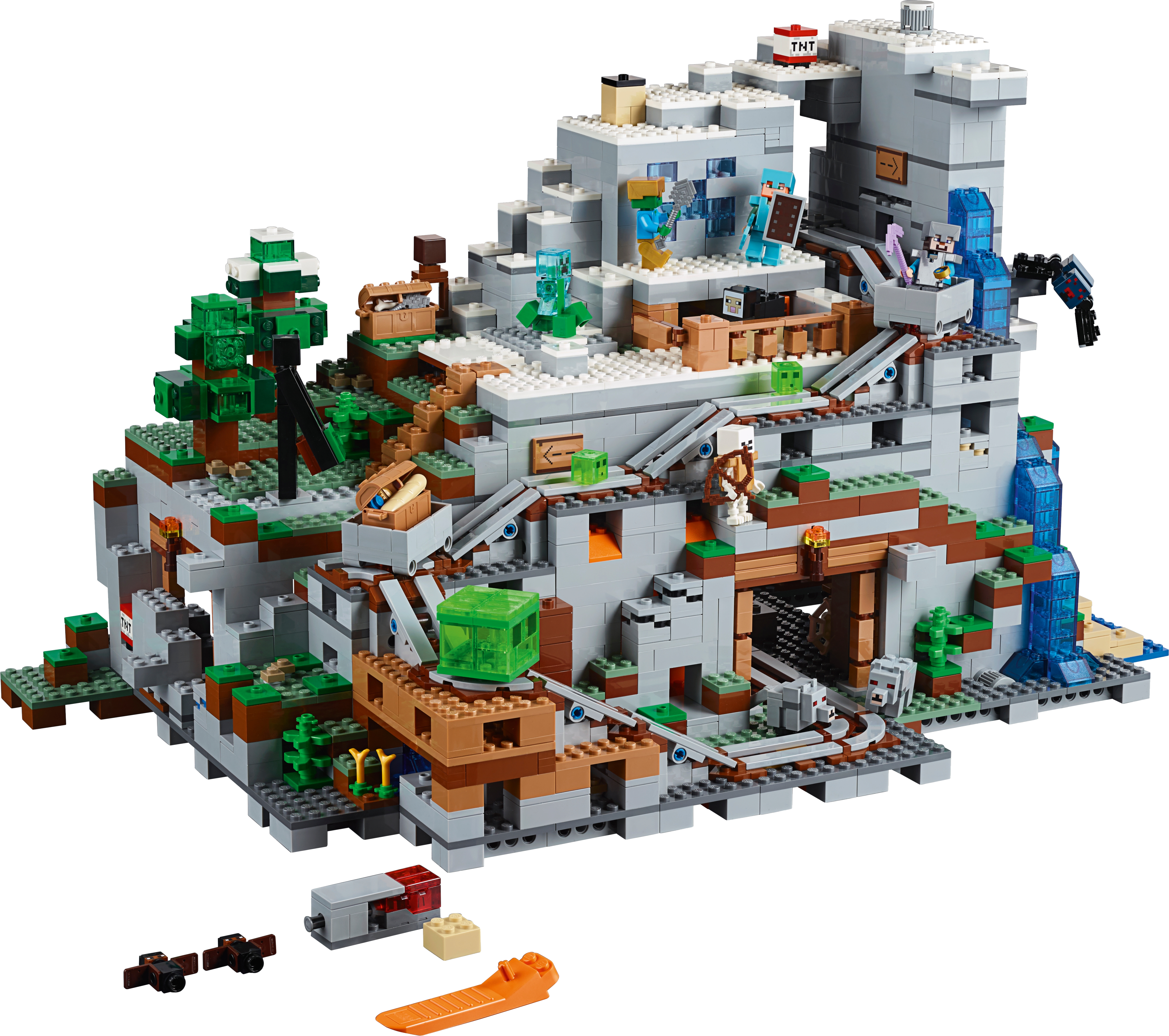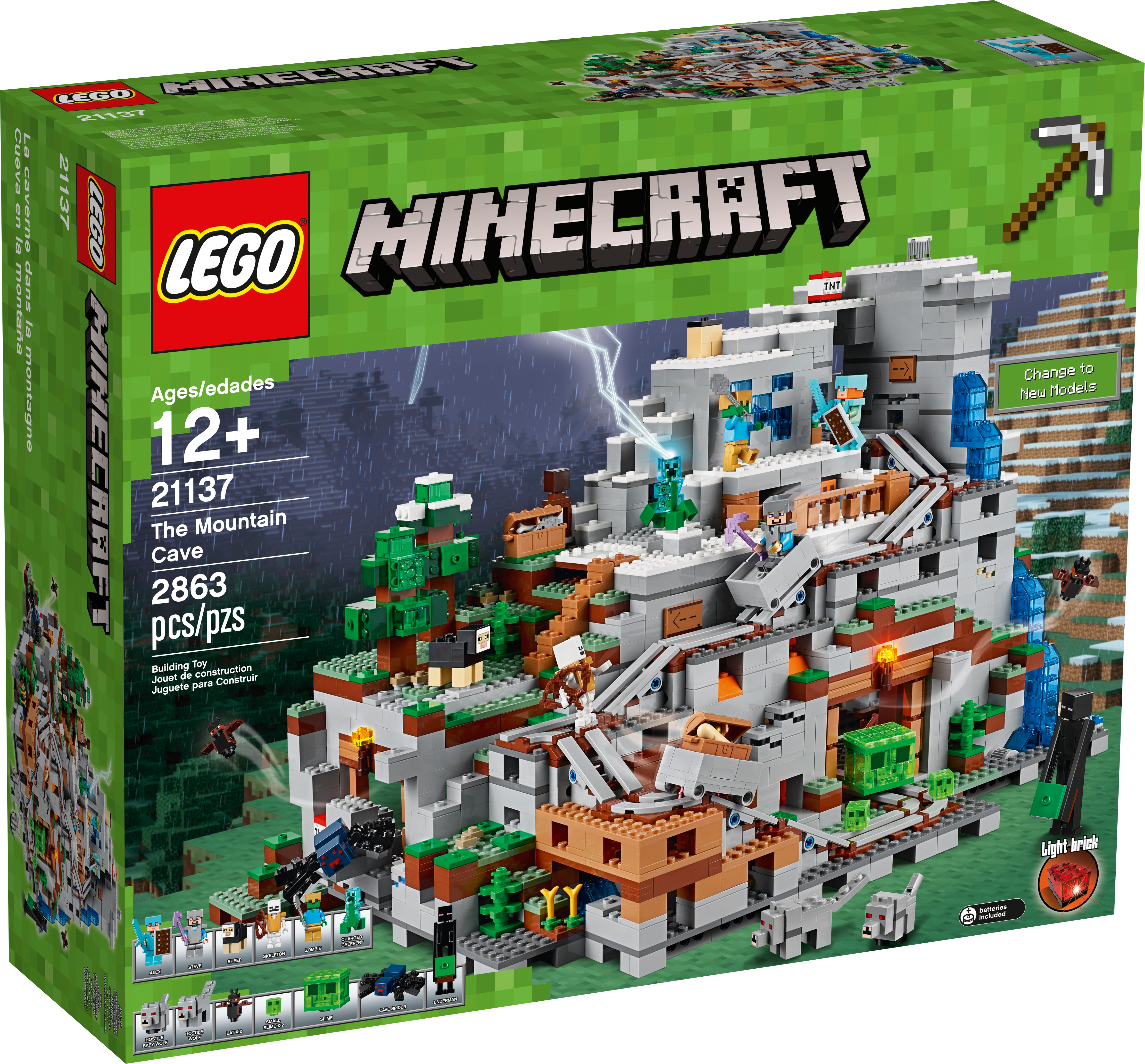 Build and experience the Mountain Cave, featuring an amazing minecart track with an integrated redstone-powered minecart elevator, and an array of other features and functions, including TNT blasting, rotating spider-spawner, charged Creeper™ explosion and a lava burst. Position the light brick to illuminate the rotating spider-spawner, wall of redstone, jack o’lantern, first-night shelter, furnace, lava or the torch above the cave entrance. Enjoy hands-on Minecraft™ adventures featuring your favorite characters and objects with this easy-to-reconfigure, modular LEGO® Minecraft set designed for young fans of the highly successful sandbox video game. Includes Steve and Alex minifigures, plus 13 mobs including a charged Creeper™. Includes 2 minifigures: Steve and Alex, plus a cave spider, wolf, baby wolf, slime, 2 small slimes, 2 bats, zombie, enderman, skeleton, sheep and a charged Creeper™. Features a minecart track with an integrated redstone-powered minecart elevator; 2 minecarts; first-night shelter with bed, crafting table and torch; a mountaintop shelter with bed, torch and furnace; plus a light brick, trees, waterfall, lava and extra torches. Open up the model to access the detailed interior and remodel with easy-to-connect modular sections. Remove the diamond ore elements and activate the lava burst function. Activate the revolving cave-spider spawner. Trigger the charged Creeper™ explosion function. Jump aboard the minecart and race around the track, and travel to the mountaintop aboard the redstone powered minecart elevator. Blast through the mountain with the TNT to extend the rail track. Position the light brick to illuminate the rotating spider-spawner, wall of redstone, jack o’lantern, first-night-shelter, furnace, lava or the torch above the cave entrance. Enjoy easy access to the detailed interior. Put on your golden armor, grab your diamond sword and shield, and prepare for battle! Weapons include a sword and a bow. Accessory elements include a Minecraft™ clock, spider eyes, signs, map, golden armor, shield, TNT and 8 ore style elements, including diamond, lapis lazuli, emerald, redstone, golden, iron and 2 coal ores. Easy-to-reconfigure, modular design—choose from 3 different model configurations. Set your imagination free—rebuild the set for more LEGO® Minecraft™ creations! This set includes over 2,860 pieces. Measures over 12” (31cm) high, 20” (53cm) wide and 11” (29cm) deep.