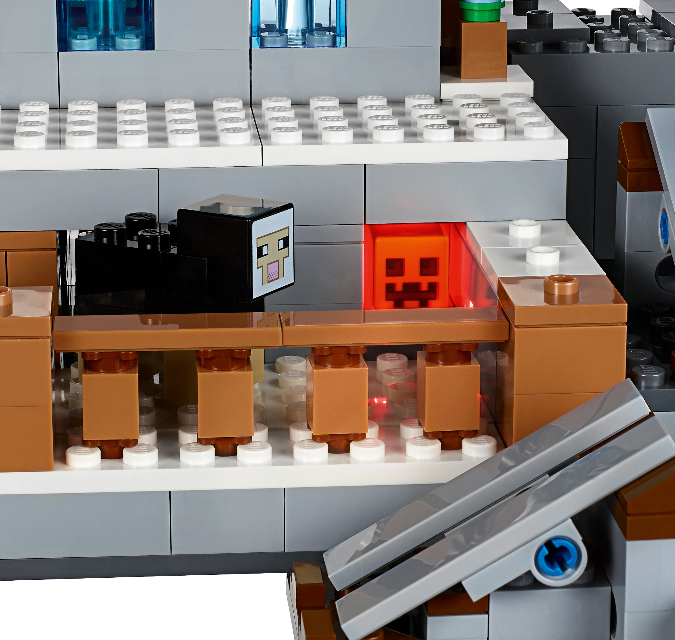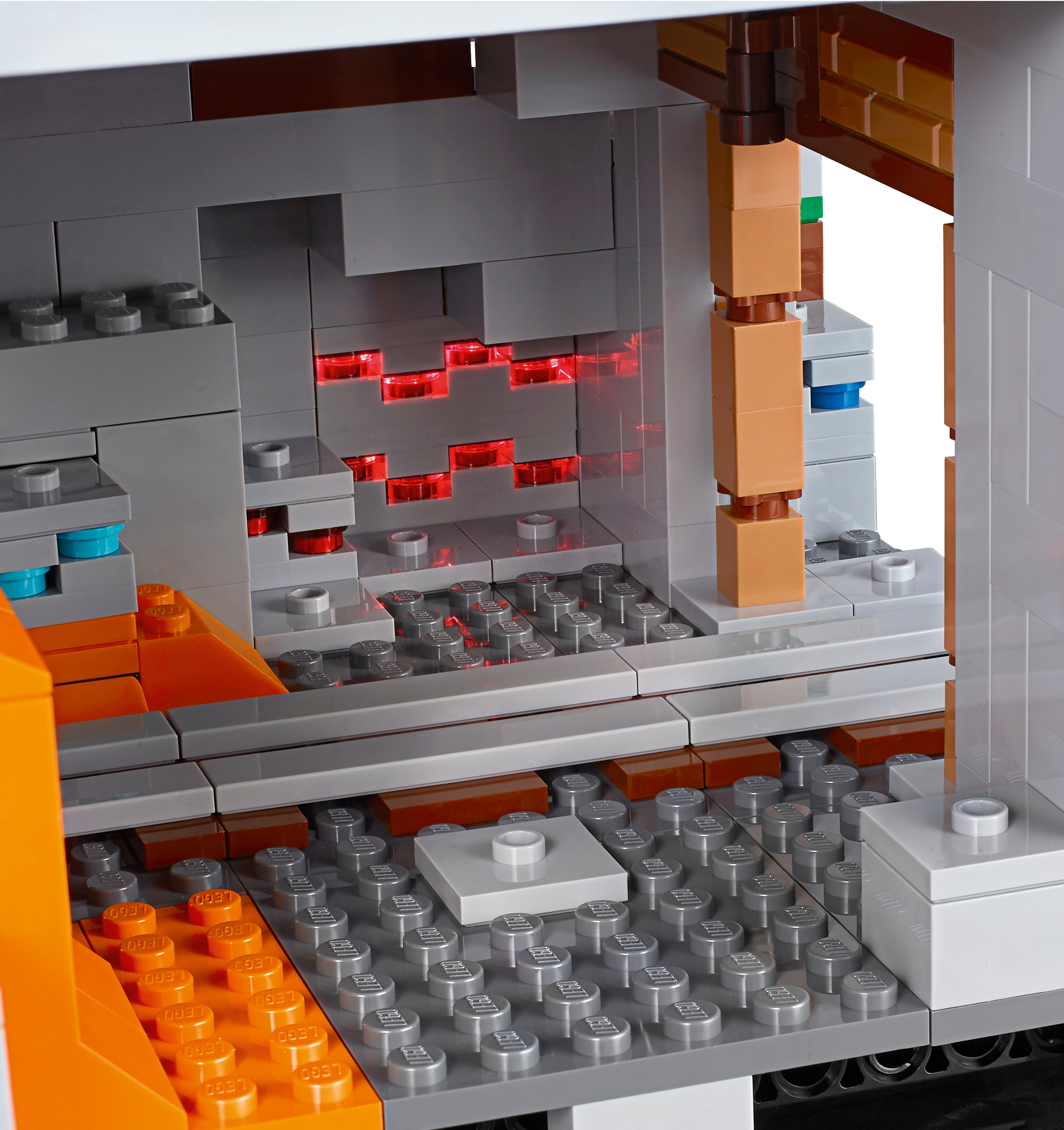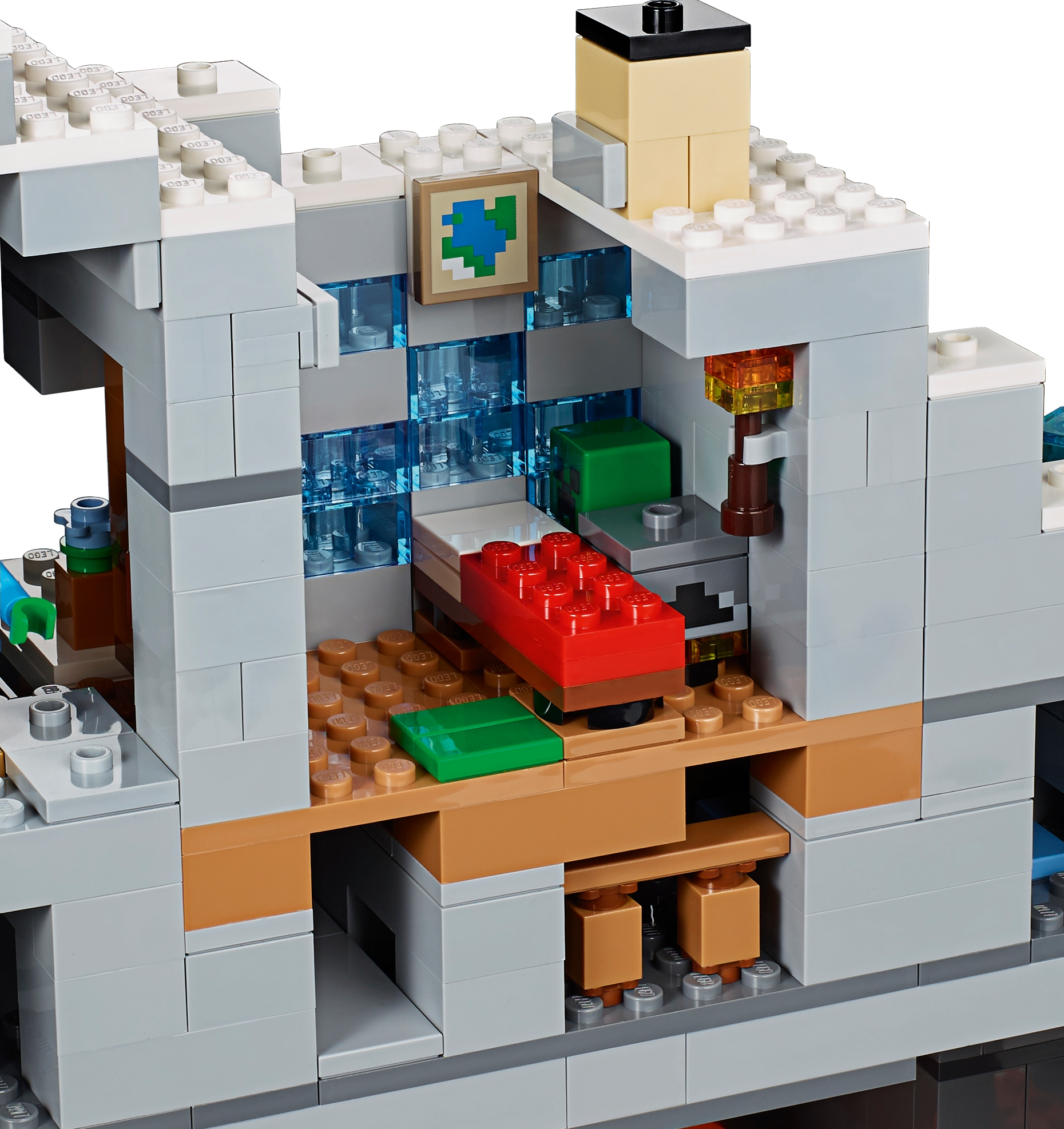 Build and experience the Mountain Cave, featuring an amazing minecart track with an integrated redstone-powered minecart elevator, and an array of other features and functions, including TNT blasting, rotating spider-spawner, charged Creeper™ explosion and a lava burst. Position the light brick to illuminate the rotating spider-spawner, wall of redstone, jack o’lantern, first-night shelter, furnace, lava or the torch above the cave entrance. Enjoy hands-on Minecraft™ adventures featuring your favorite characters and objects with this easy-to-reconfigure, modular LEGO® Minecraft set designed for young fans of the highly successful sandbox video game. Includes Steve and Alex minifigures, plus 13 mobs including a charged Creeper™. Includes 2 minifigures: Steve and Alex, plus a cave spider, wolf, baby wolf, slime, 2 small slimes, 2 bats, zombie, enderman, skeleton, sheep and a charged Creeper™. Features a minecart track with an integrated redstone-powered minecart elevator; 2 minecarts; first-night shelter with bed, crafting table and torch; a mountaintop shelter with bed, torch and furnace; plus a light brick, trees, waterfall, lava and extra torches. Open up the model to access the detailed interior and remodel with easy-to-connect modular sections. Remove the diamond ore elements and activate the lava burst function. Activate the revolving cave-spider spawner. Trigger the charged Creeper™ explosion function. Jump aboard the minecart and race around the track, and travel to the mountaintop aboard the redstone powered minecart elevator. Blast through the mountain with the TNT to extend the rail track. Position the light brick to illuminate the rotating spider-spawner, wall of redstone, jack o’lantern, first-night-shelter, furnace, lava or the torch above the cave entrance. Enjoy easy access to the detailed interior. Put on your golden armor, grab your diamond sword and shield, and prepare for battle! Weapons include a sword and a bow. Accessory elements include a Minecraft™ clock, spider eyes, signs, map, golden armor, shield, TNT and 8 ore style elements, including diamond, lapis lazuli, emerald, redstone, golden, iron and 2 coal ores. Easy-to-reconfigure, modular design—choose from 3 different model configurations. Set your imagination free—rebuild the set for more LEGO® Minecraft™ creations! This set includes over 2,860 pieces. Measures over 12” (31cm) high, 20” (53cm) wide and 11” (29cm) deep.