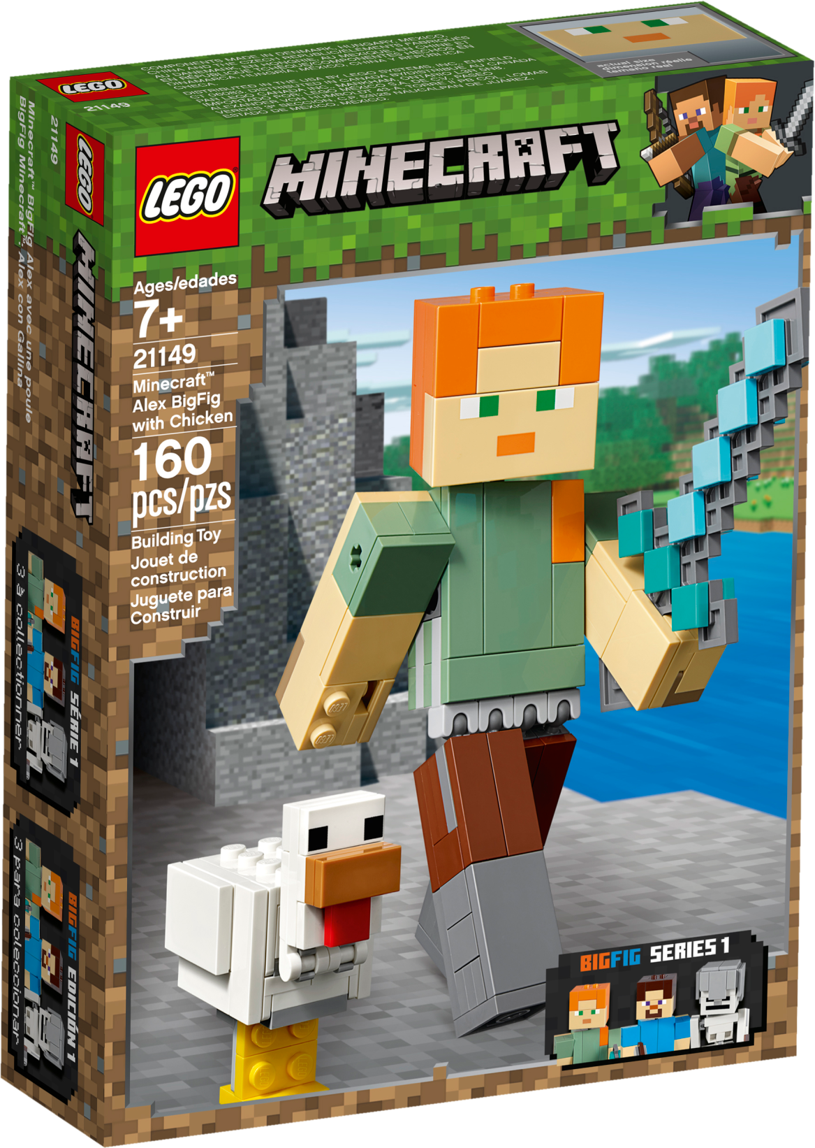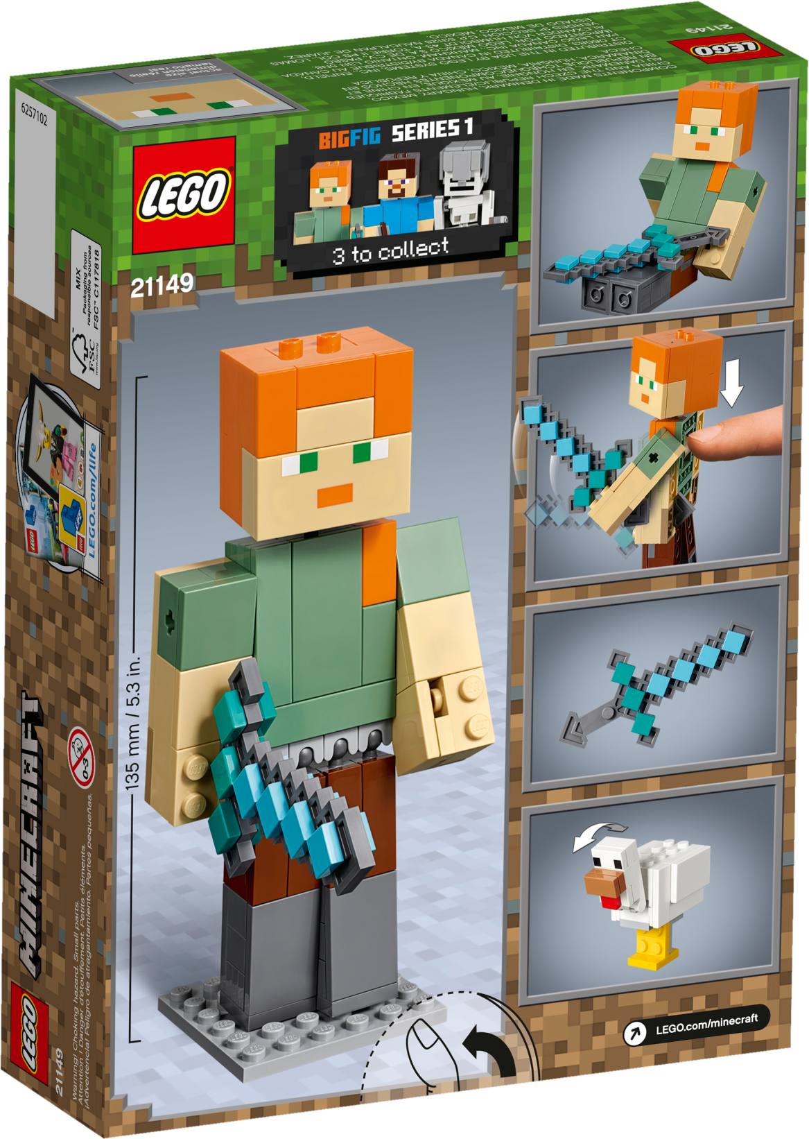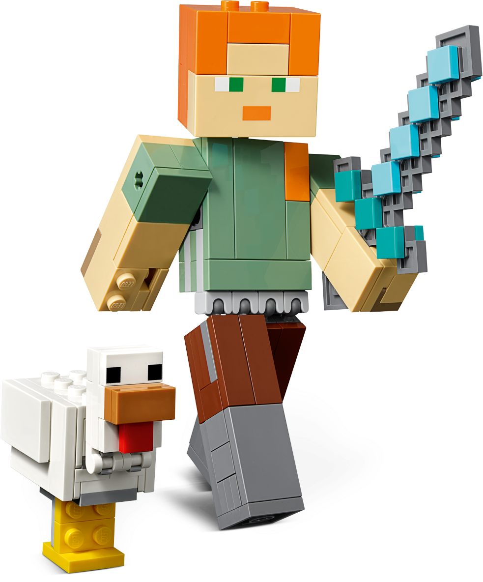Make and meet a monumental Minecraft™ hero with this easy-to-build Alex BigFig, complete with buildable chicken and diamond Minecraft sword! Use the lever on Alex’s back to raise and lower her left arm and position her limbs to create dynamic poses. Then place her on the display baseplate to bring Minecraft magic to your home, office or anywhere that needs an air of high adventure! Combine it with the LEGO® Minecraft playsets 21148 Steve BigFig with Parrot and 21150 Skeleton BigFig with Magma Cube for more awesome play and display combinations.