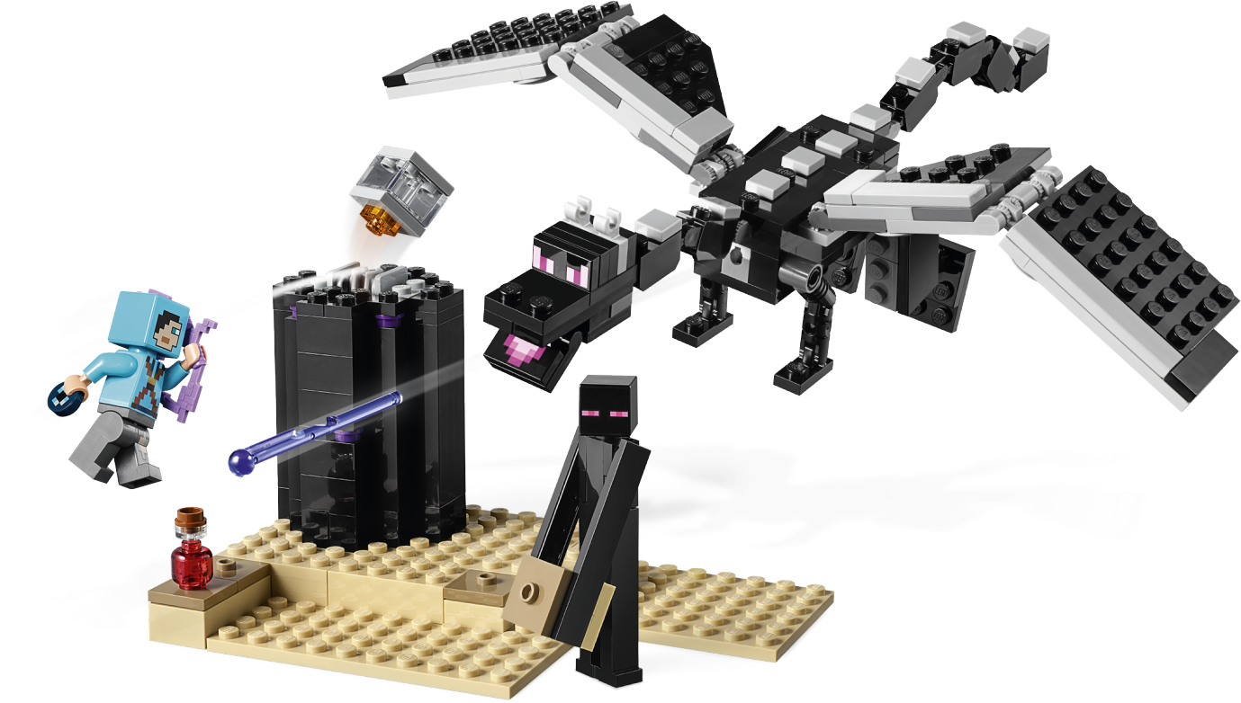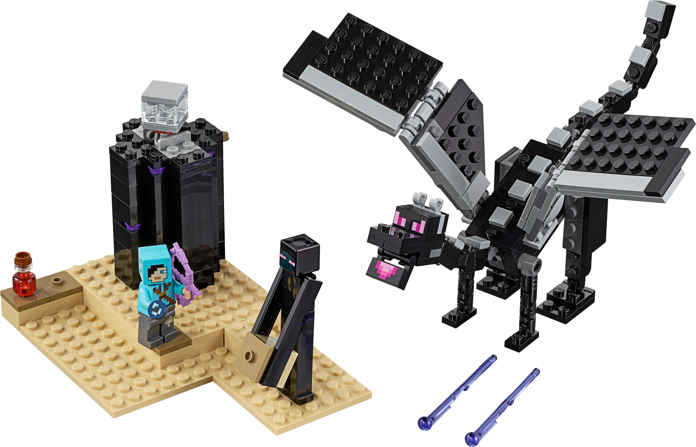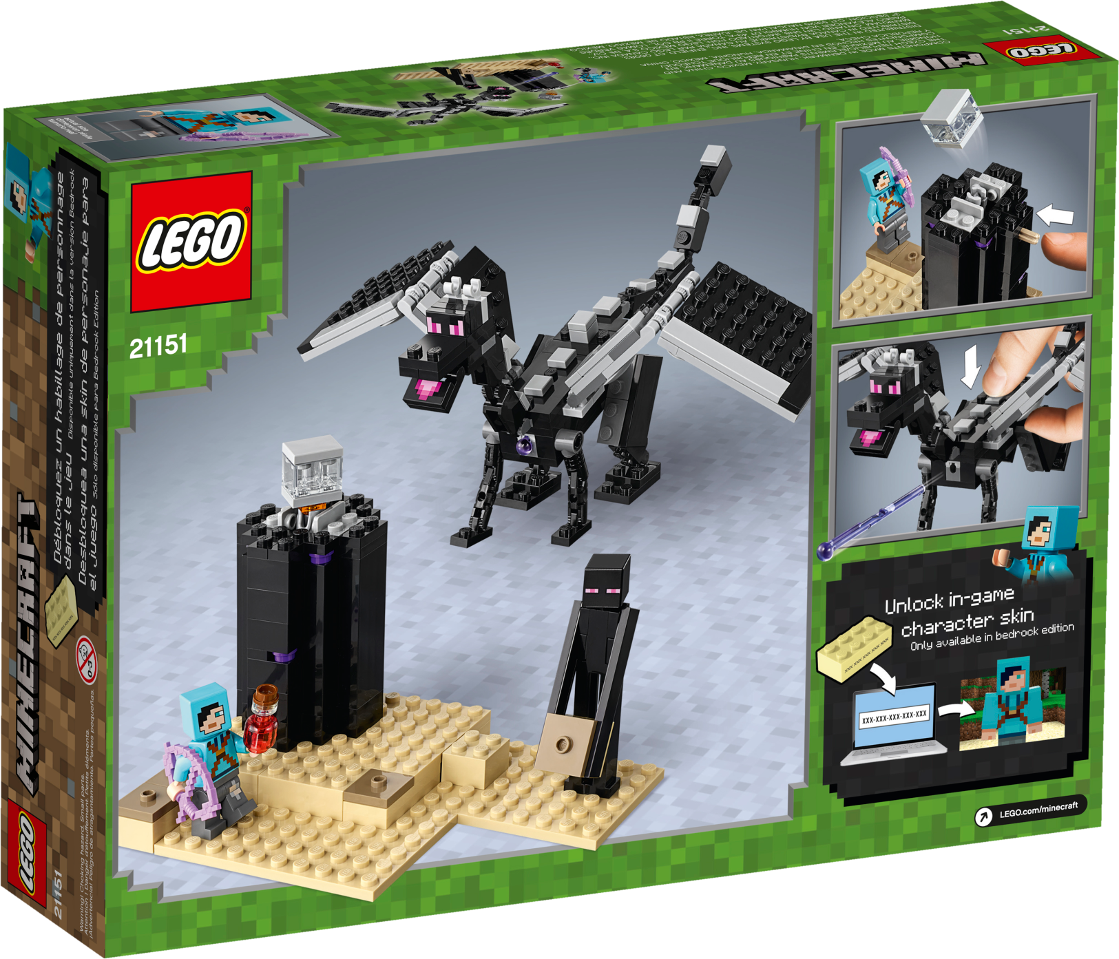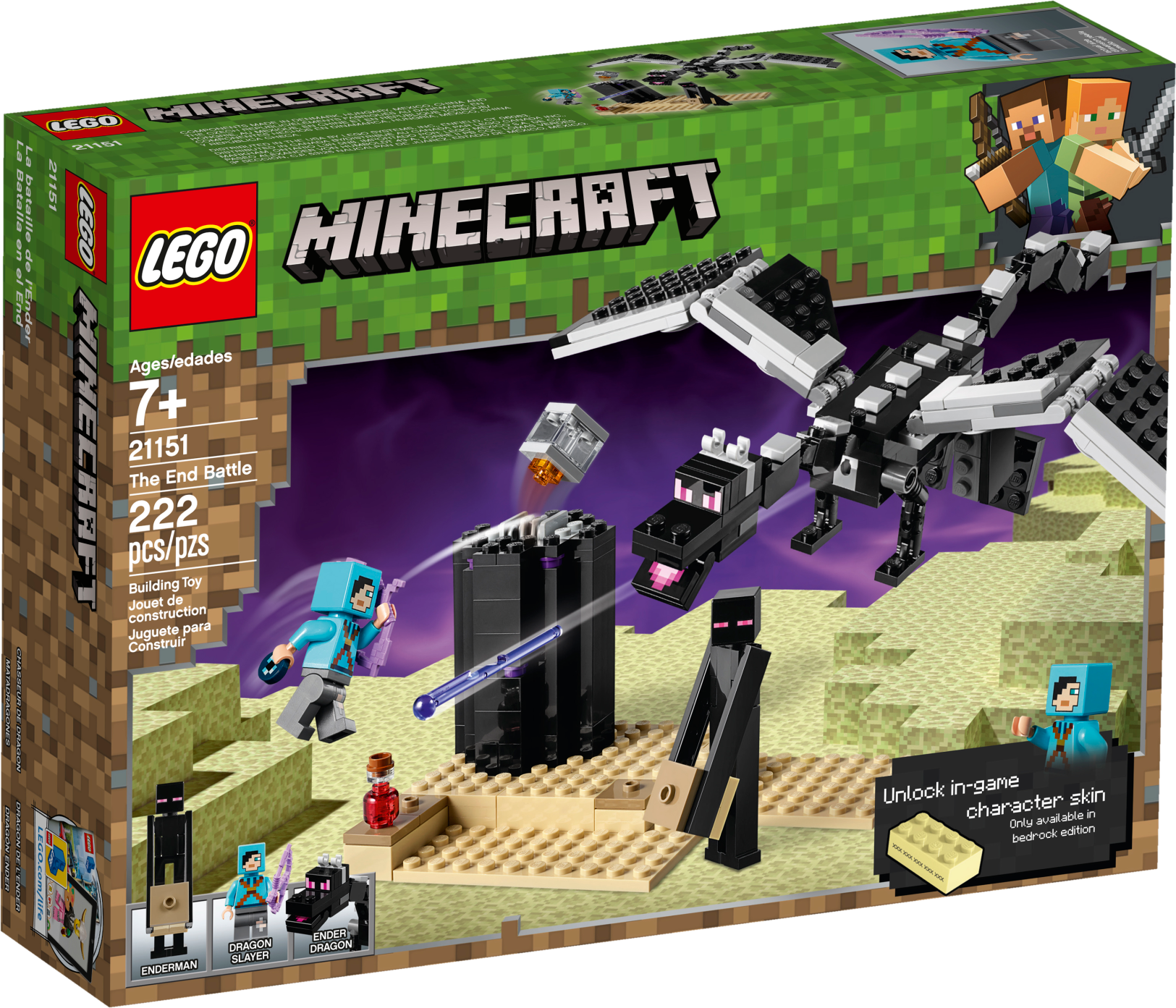 Grab your potion, ender pearl and enchanted bow, and prepare for the ultimate Minecraft™ encounter. Destroy the end crystal, defeat the enderman and slay the fireball-shooting ender dragon to win The End Battle! Enjoy hands-on Minecraft adventures with this LEGO® Minecraft set. Combine this model with other sets to create your own unique LEGO Minecraft universe. This set also includes a new-for-January-2019 dragon slayer minifigure and a code to redeem the skin in the Minecraft Bedrock Edition online game.