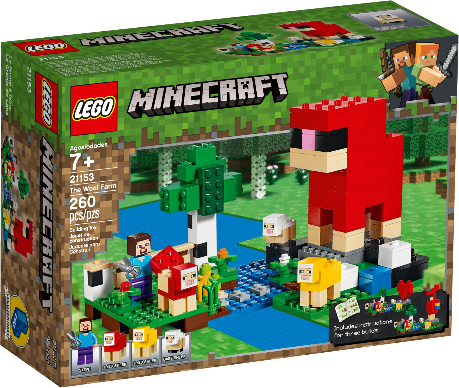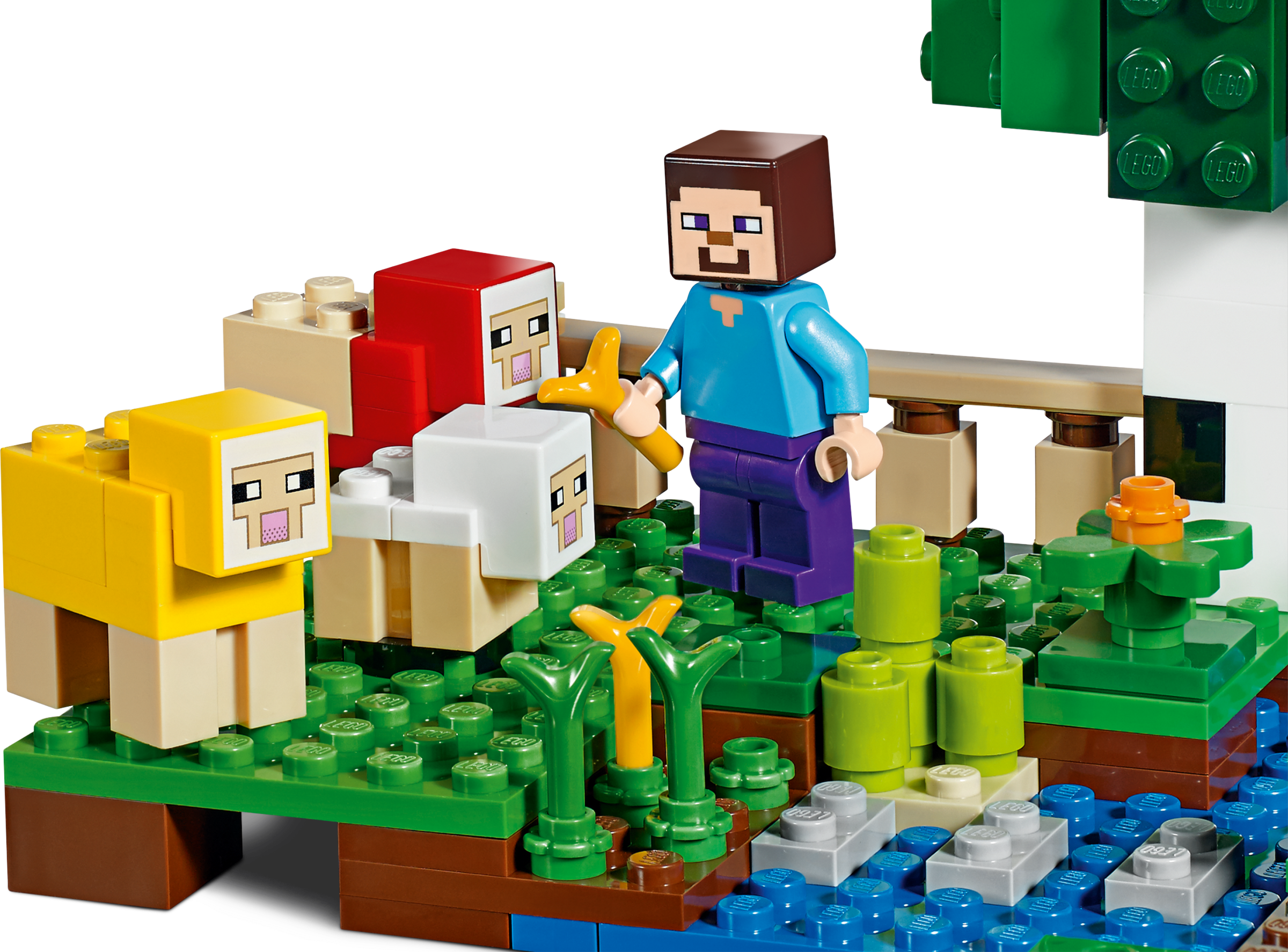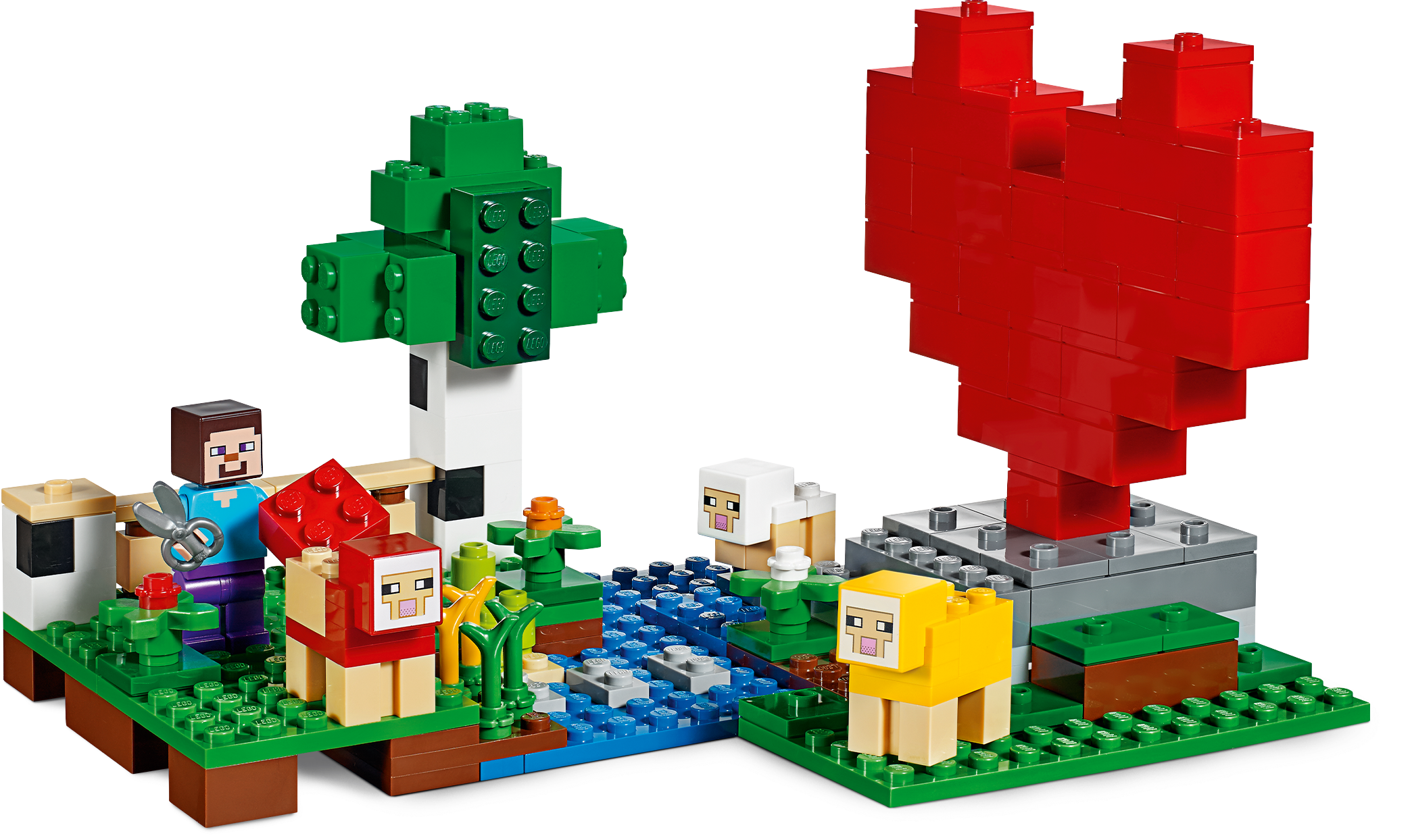 Features a Minecraft™ farm setting with a birch tree, fence, stream, stepping-stones, crops, flowers, 2 dyed Minecraft sheep and a baby sheep, plus colored LEGO® bricks for building 1 of 3 fun structures to decorate the farm.
